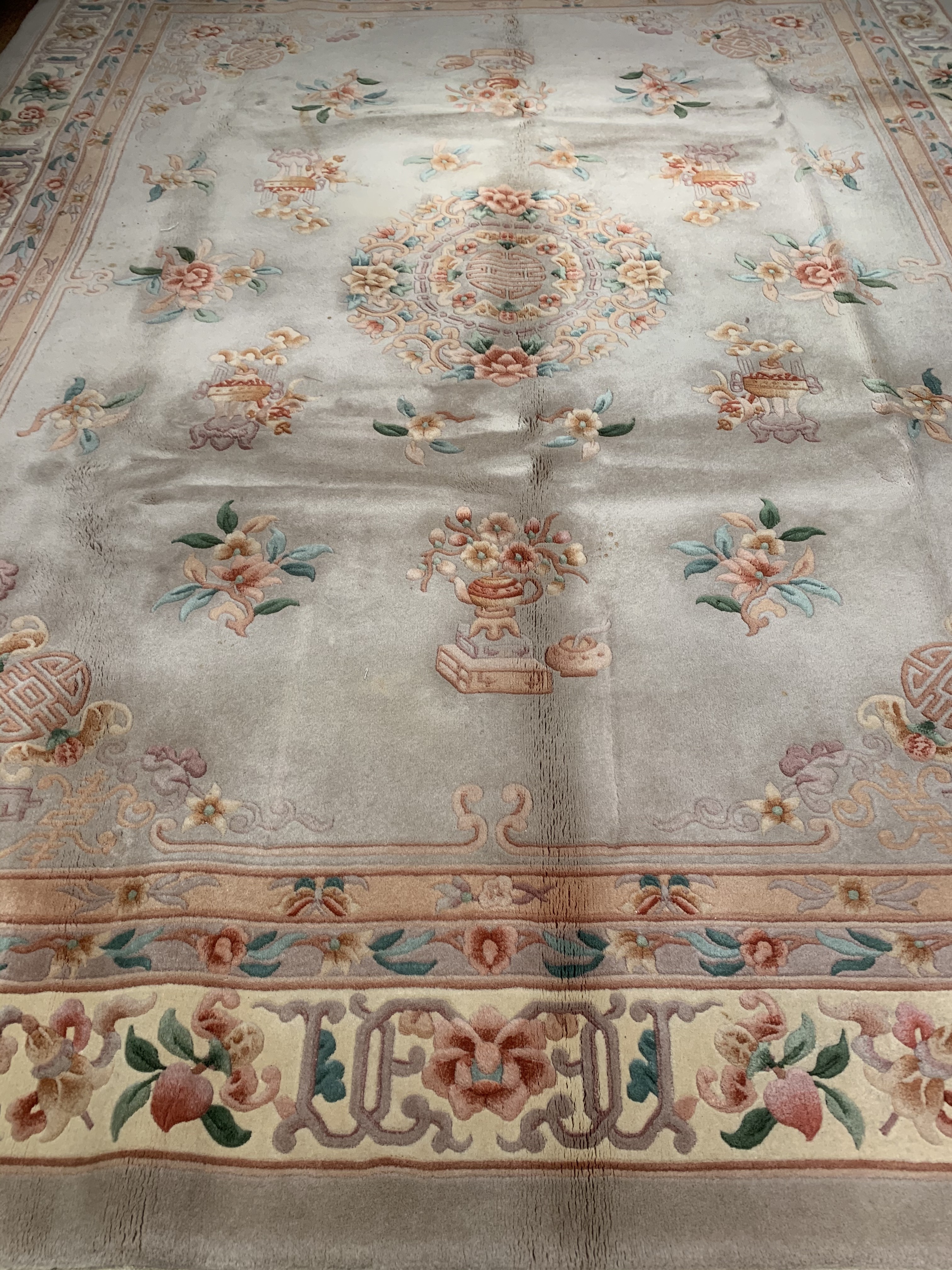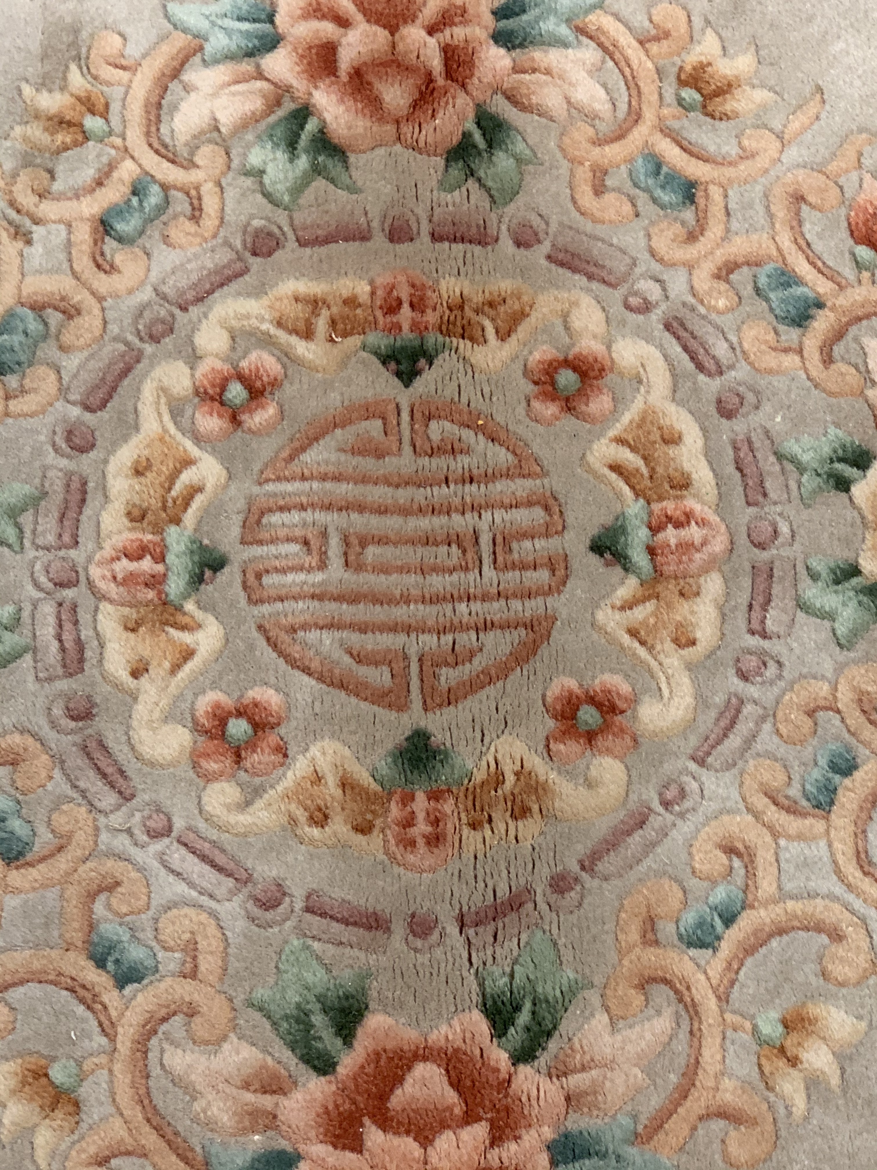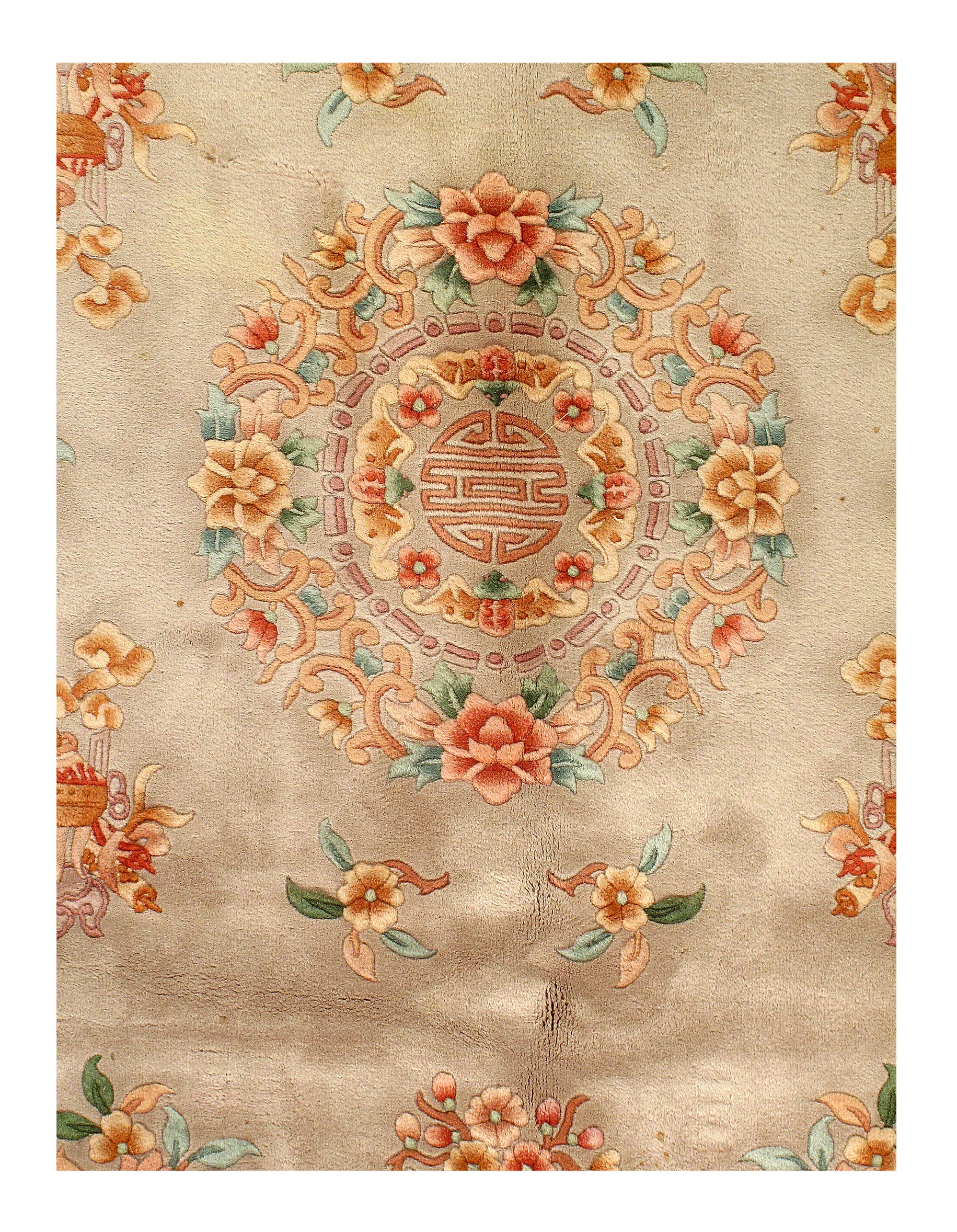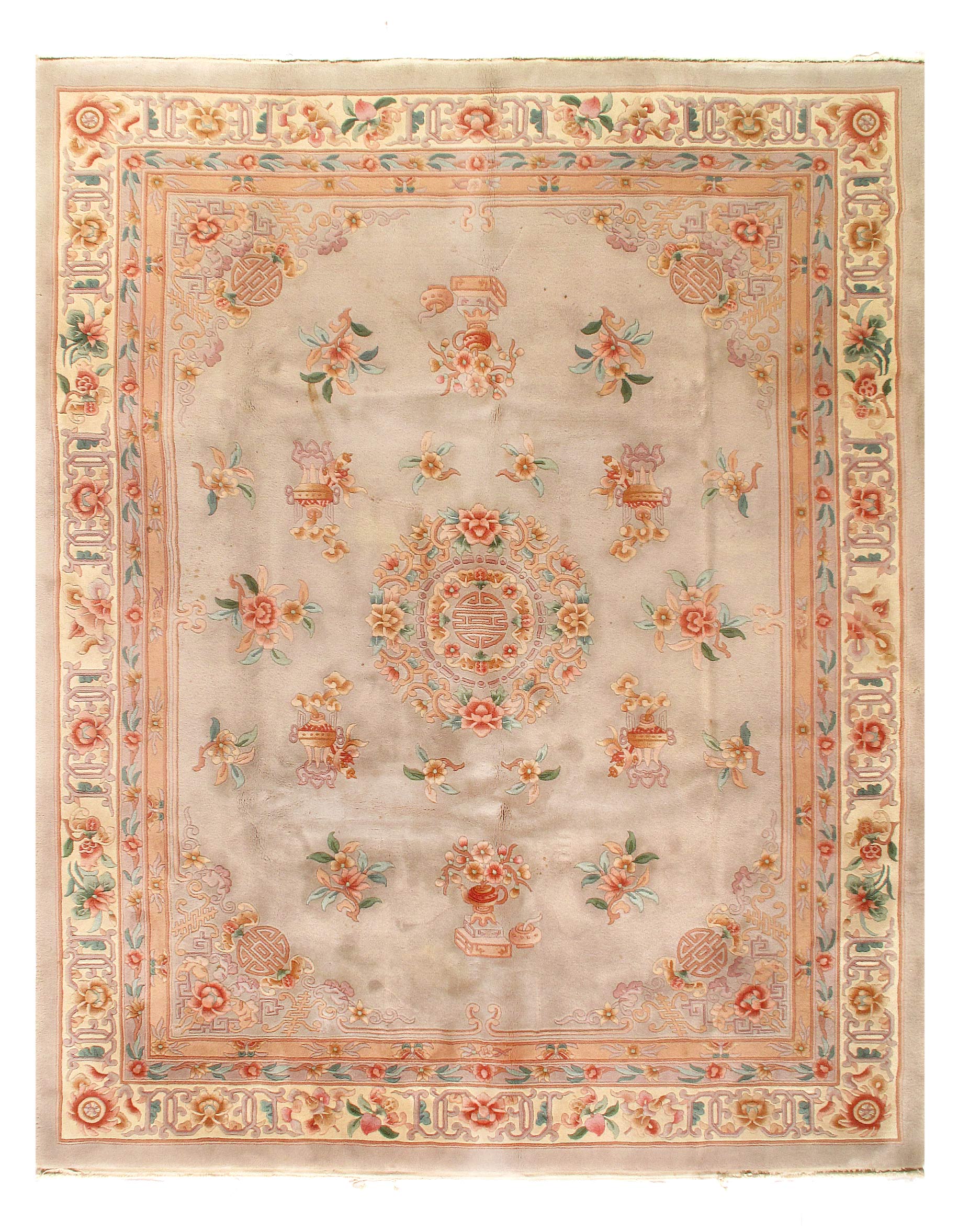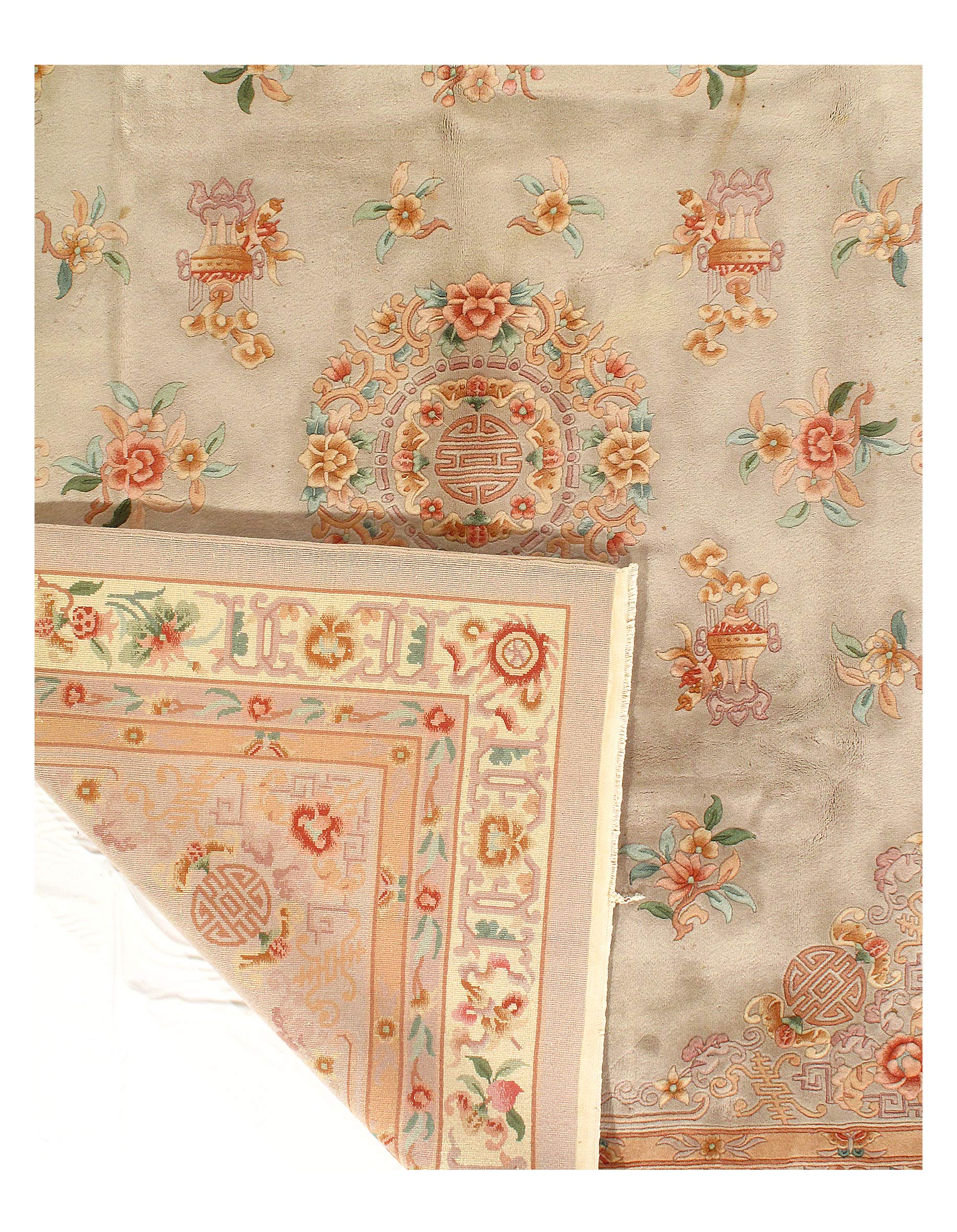 This beautiful Antique Peking is so unique with it’s lighter color palette. If you look closely, you can see Beige around the border. The centuries-old Chinese textile industry is rich in history. Chinese carpets were first woven centuries ago by nomadic tribes in the Sinkiang and Ninghsia regions of western China; but it wasn’t until sometime towards the end of the 19th century that the making of rugs for export to the west began in earnest in China as the quality and fineness of the rugs became the beauties they are today.