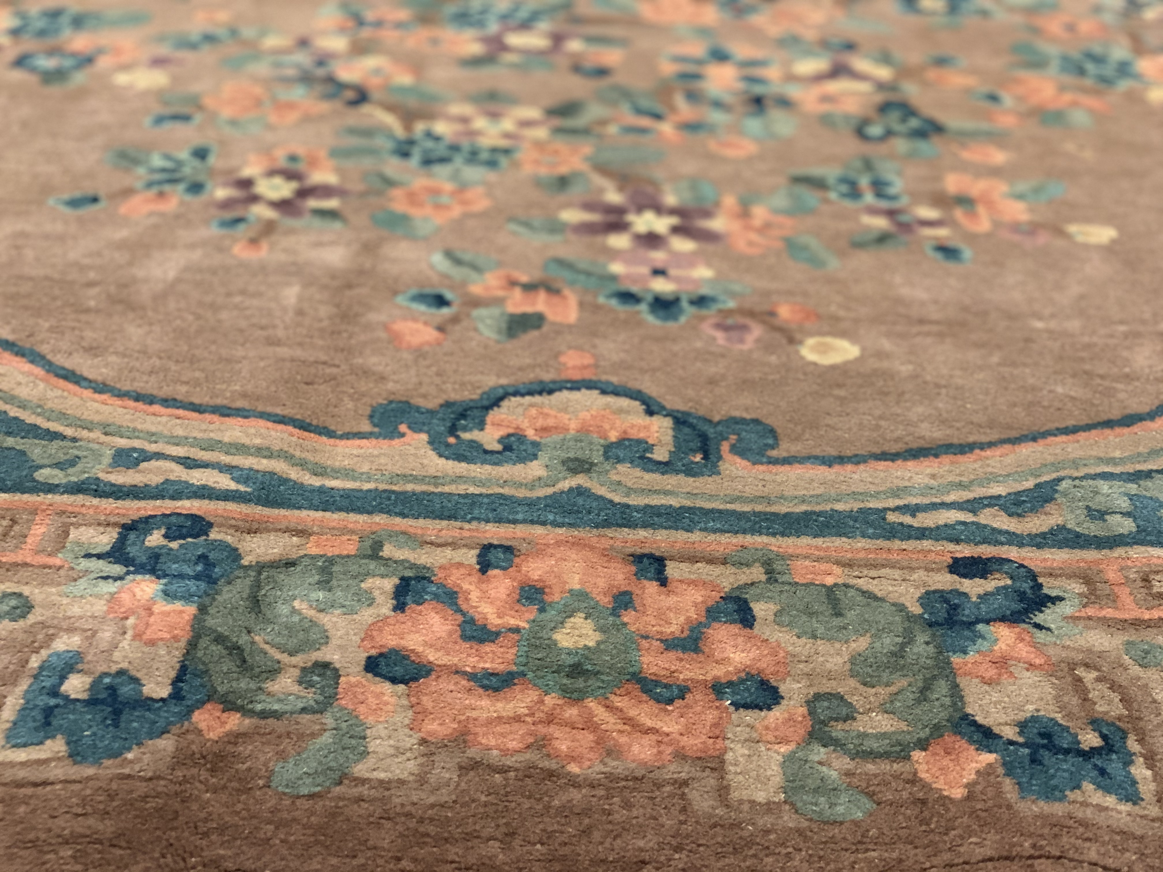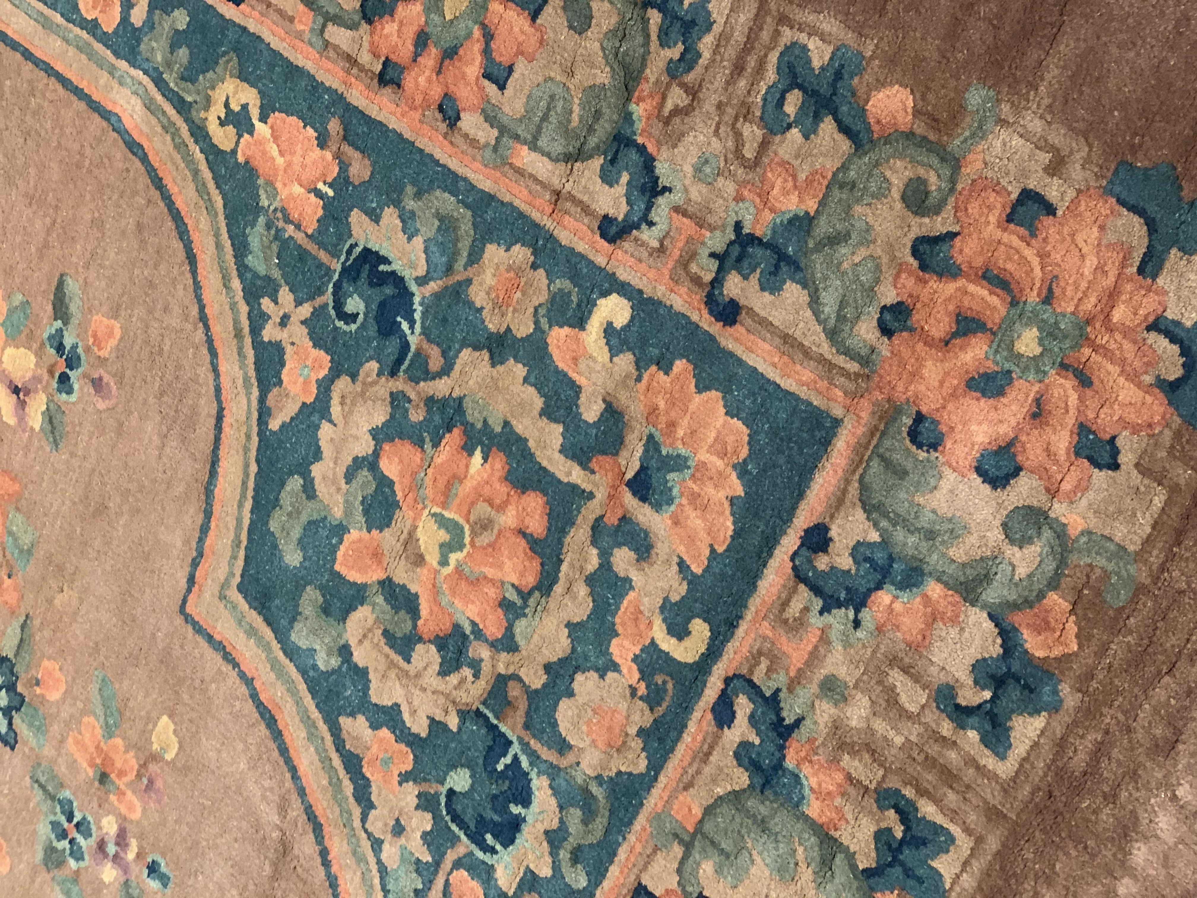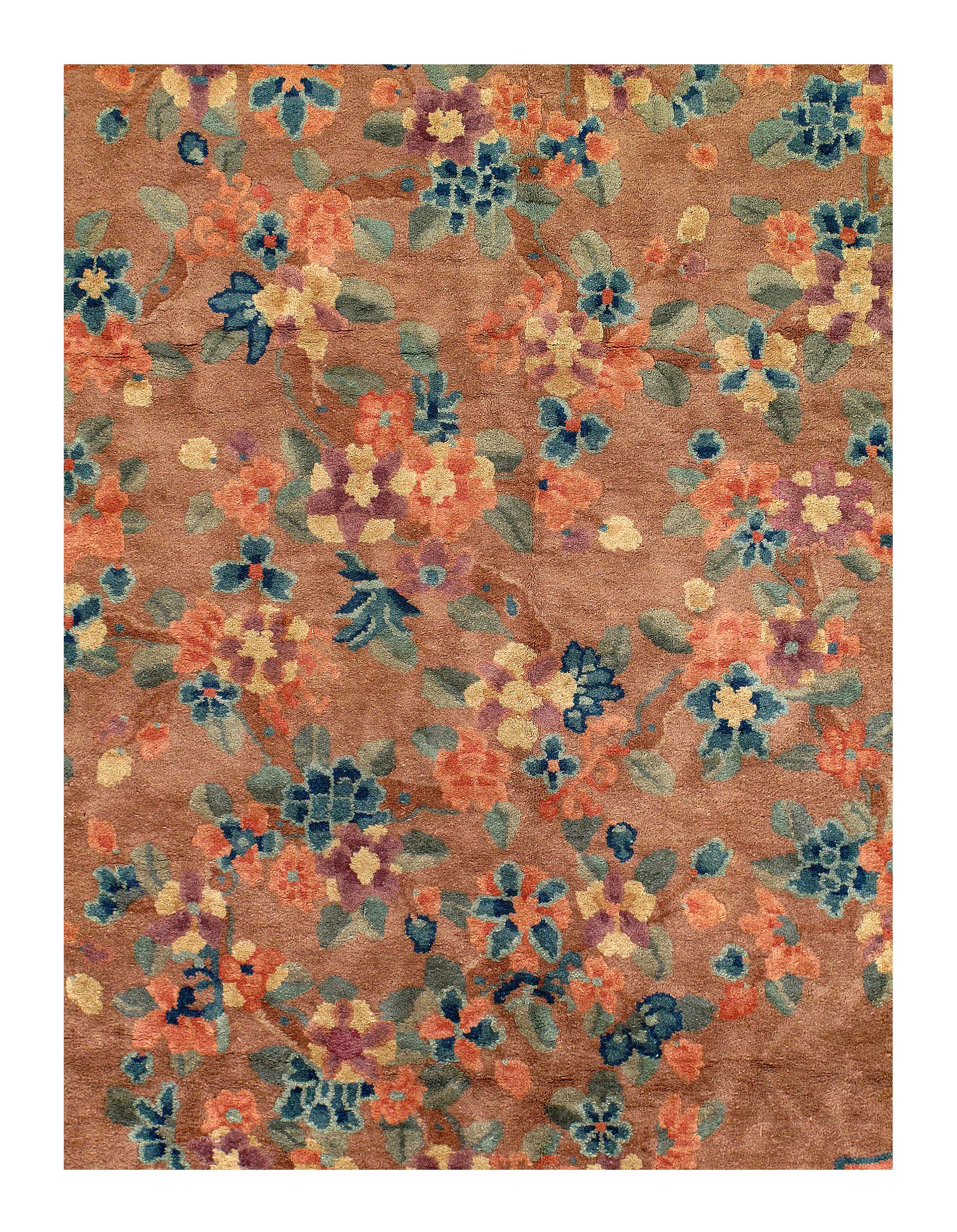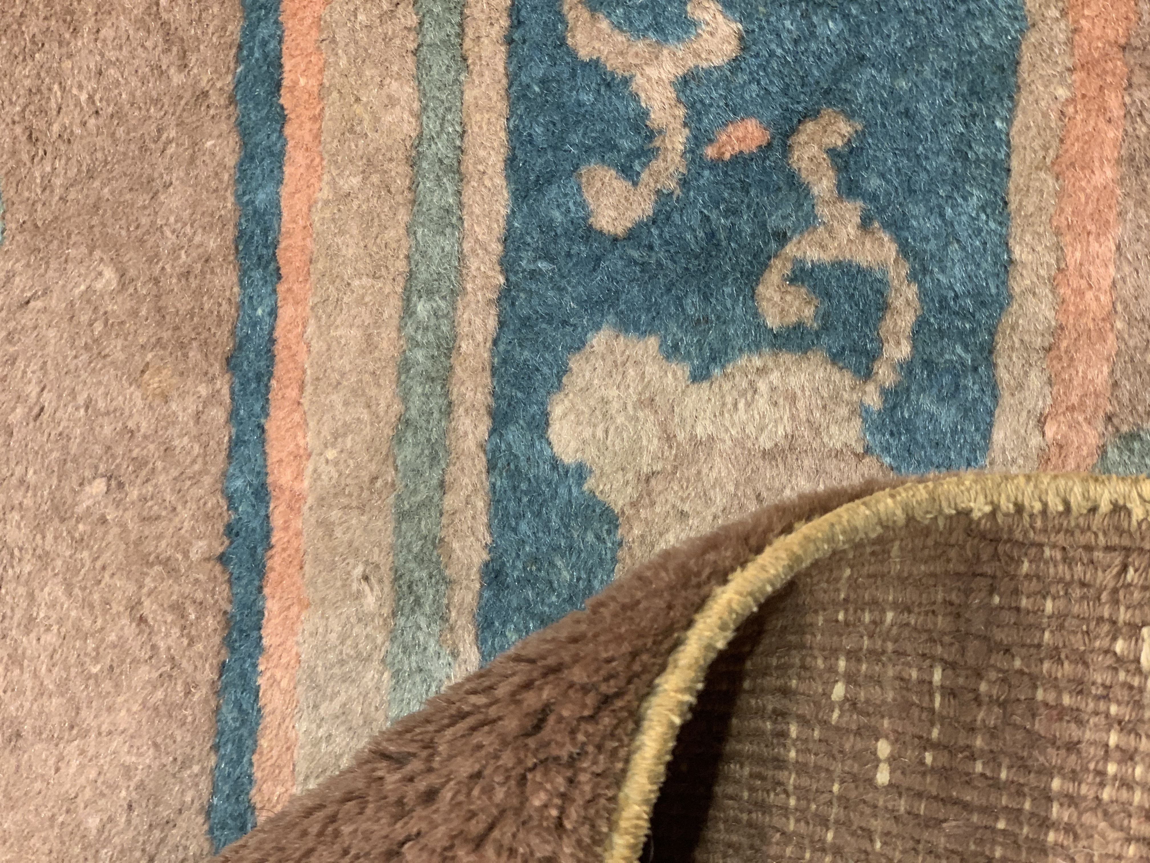 Vintage Chinese Deco Rug, Origin: China, Circa: Early 20th Century – Here is an exciting and appealing antique Oriental carpet – an antique Art Deco rug that was designed and woven in China during the early years of the twentieth century. Heavily informed by the aesthetic inclinations of the Art Deco period, this unique carpet is a compelling and thought-provoking example. A scalloped Brown encloses sand field on this exquisitely subtle and restrained antique Chinese Art Deco. At first the field appears empty or open, but it is actually covered by a tone-on-tone design of emanating inward from the outer edges. In their sinuous rhythms they echo the scalloped forms of the border and continue its effects across the carpet in a more subdued manner. This carpet testifies to the masterful design sensibilities of Chinese weavers as they made the transition into the modern world. The Art Deco movement had an outside influence on the world of art and design, and some of the most important qualities and characteristics of that movement may be found in this fine rug.