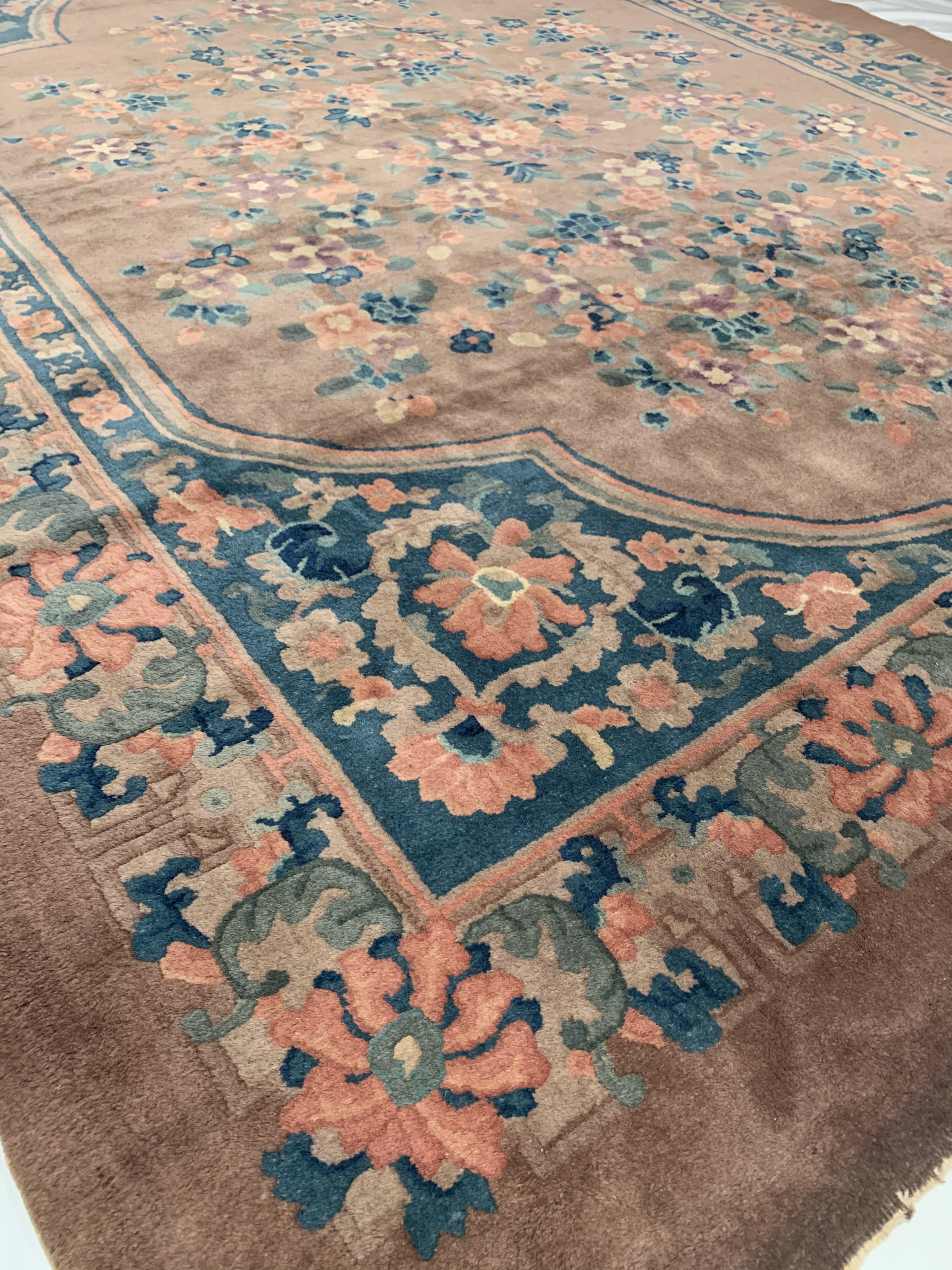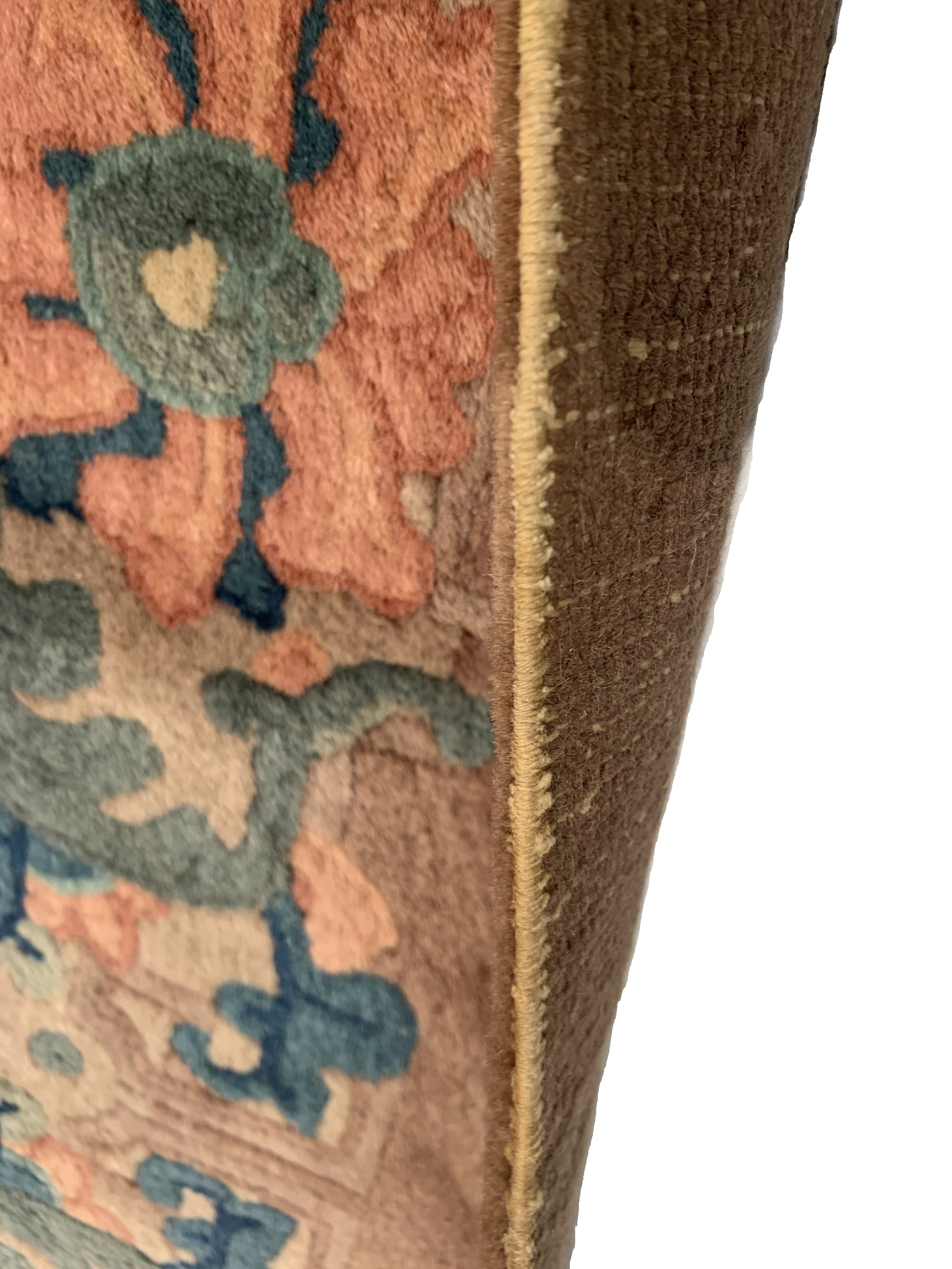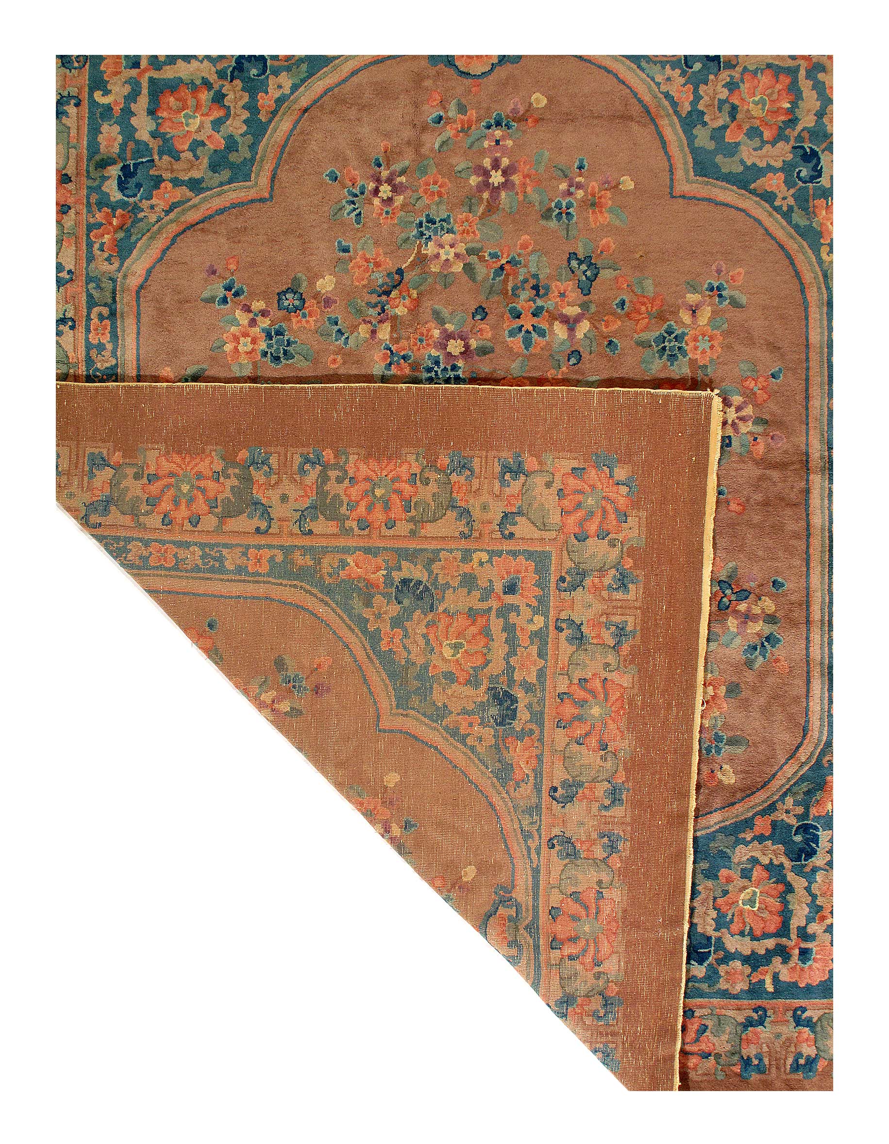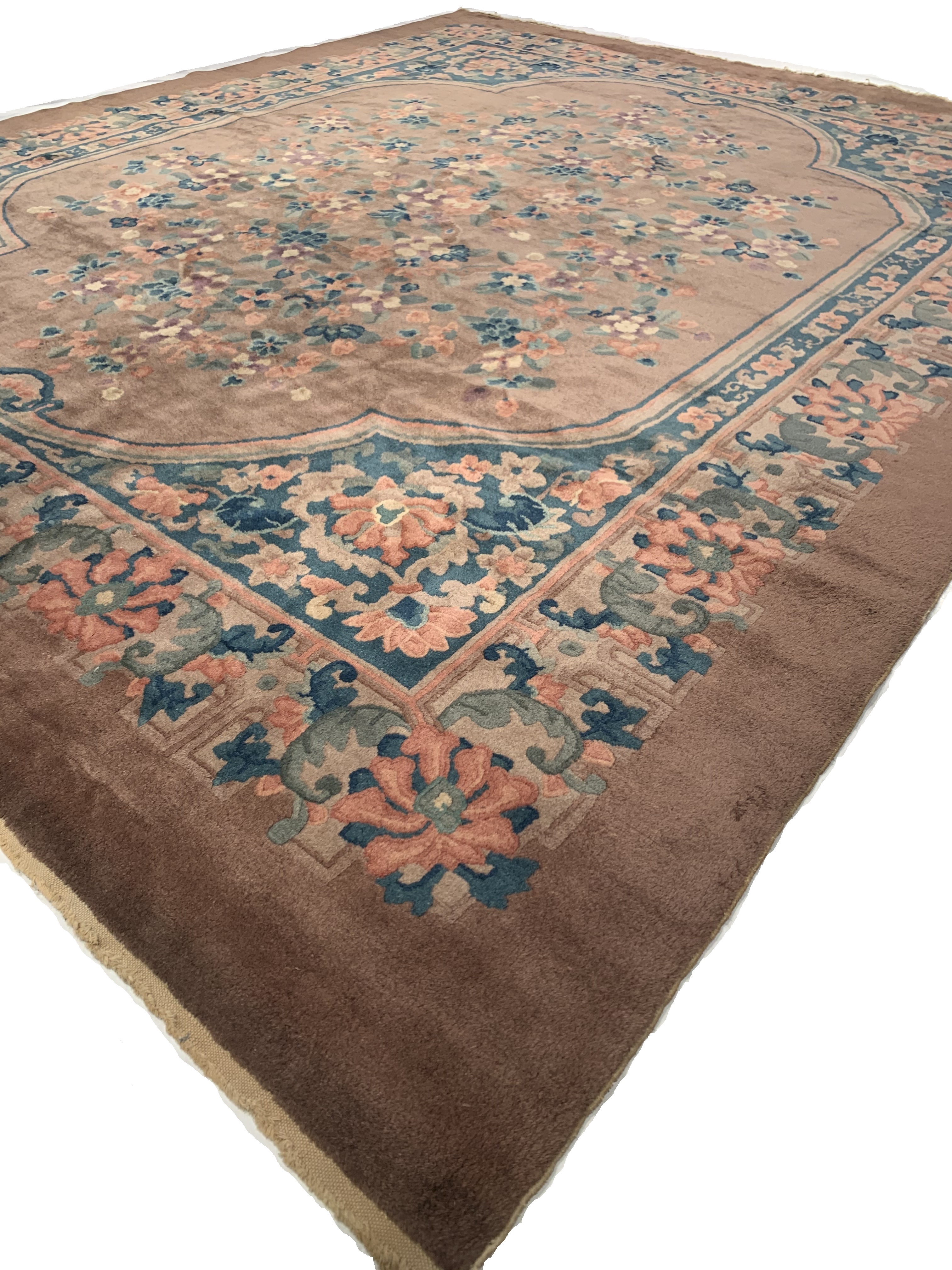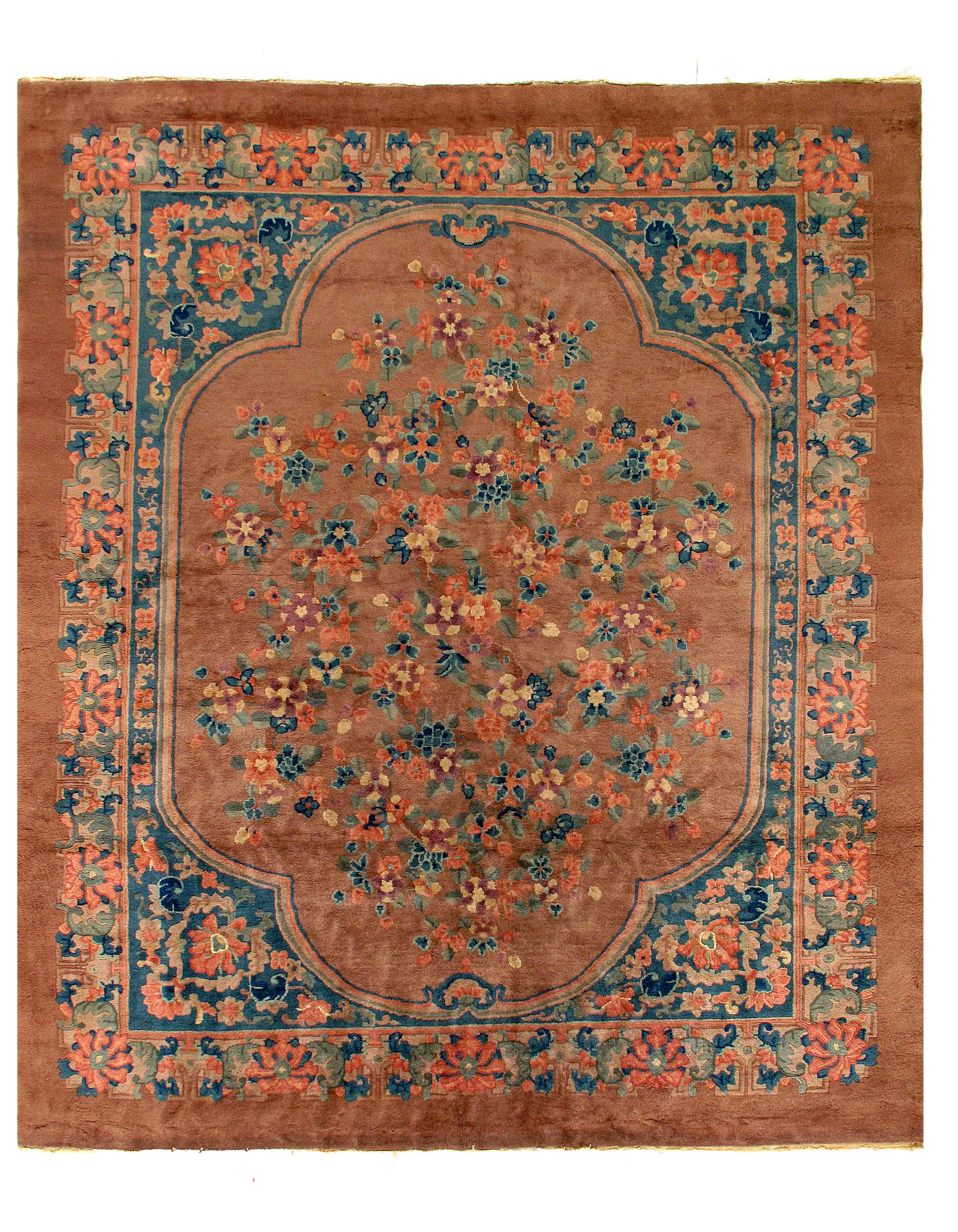 Vintage Chinese Deco Rug, Origin: China, Circa: Early 20th Century – Here is an exciting and appealing antique Oriental carpet – an antique Art Deco rug that was designed and woven in China during the early years of the twentieth century. Heavily informed by the aesthetic inclinations of the Art Deco period, this unique carpet is a compelling and thought-provoking example. A scalloped Brown encloses sand field on this exquisitely subtle and restrained antique Chinese Art Deco. At first the field appears empty or open, but it is actually covered by a tone-on-tone design of emanating inward from the outer edges. In their sinuous rhythms they echo the scalloped forms of the border and continue its effects across the carpet in a more subdued manner. This carpet testifies to the masterful design sensibilities of Chinese weavers as they made the transition into the modern world. The Art Deco movement had an outside influence on the world of art and design, and some of the most important qualities and characteristics of that movement may be found in this fine rug.