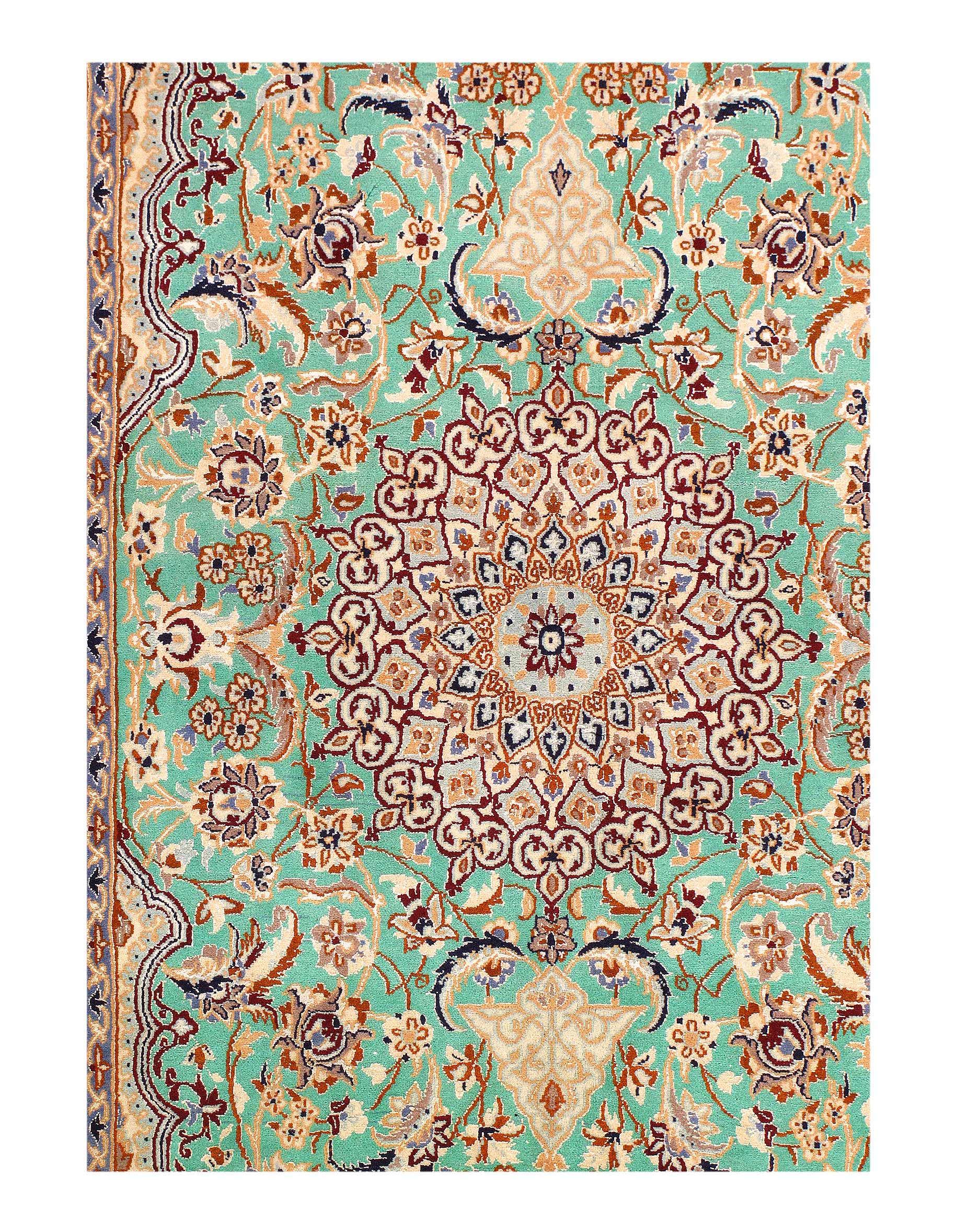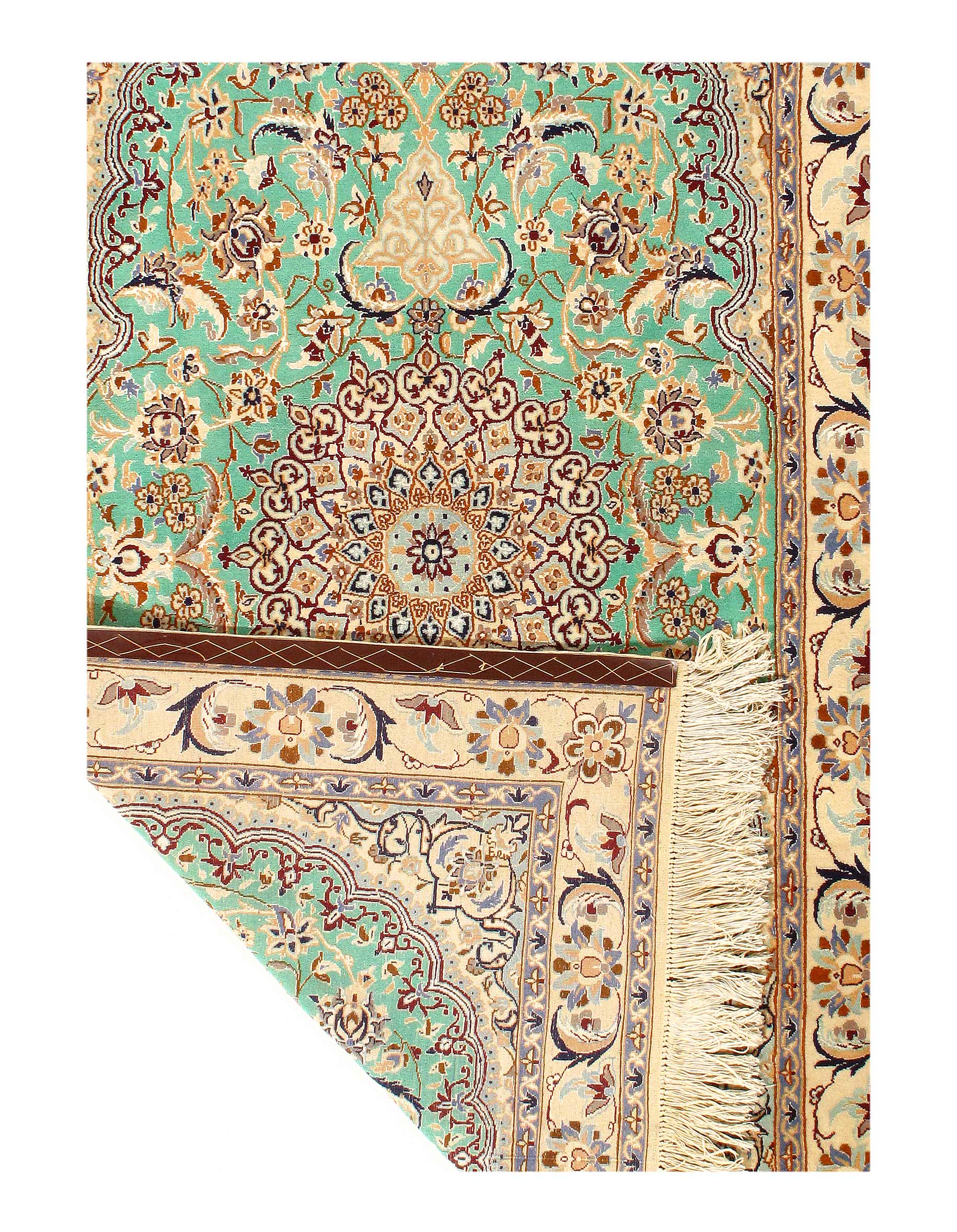 Beautiful hand knotted Nain rug made from wool and silk. Nain is a small village located in central Iran that has relatively recently become a renowned center for carpet weaving. Production began here in the 1930’s. Although Nain rugs are not as old as many of the traditional Persian rugs, they retain their value in terms of construction. They are also exquisite in design due to their use of silk in weaving both the foundation and fine pile of many rugs from the area. From Persia.