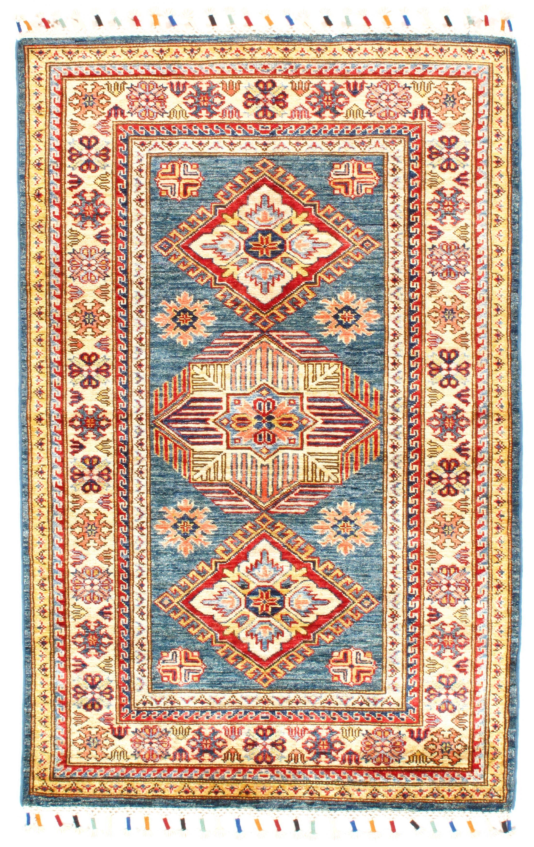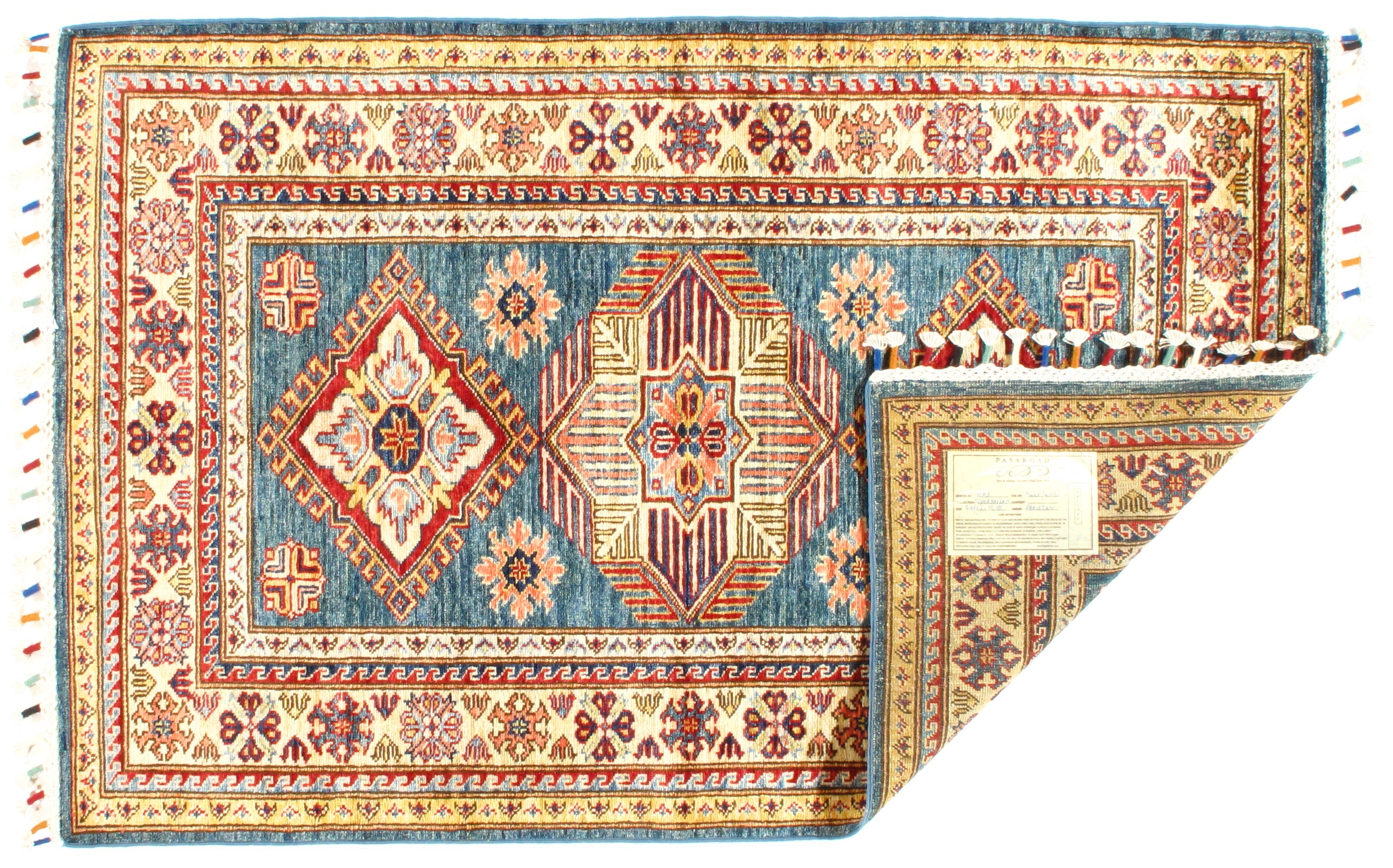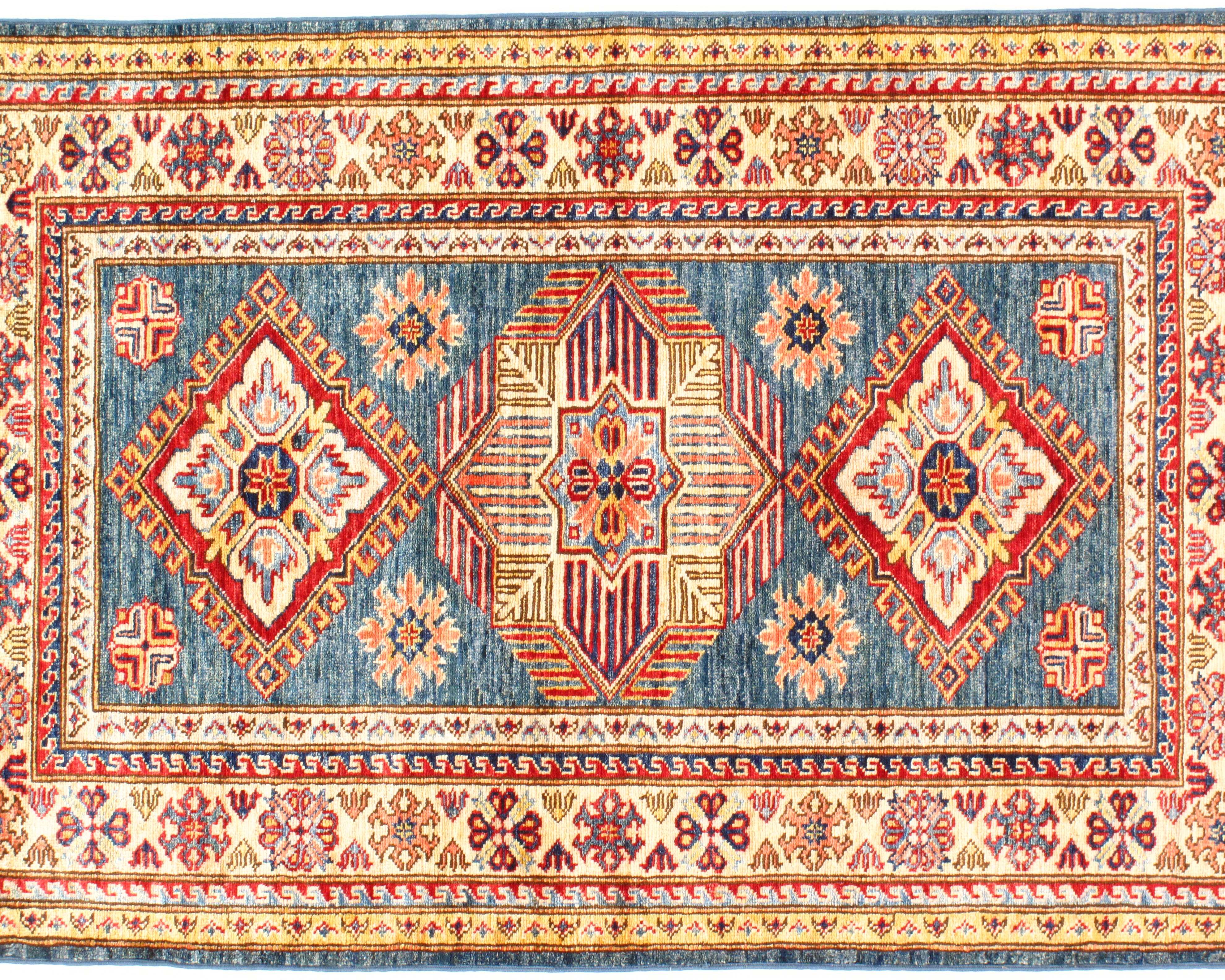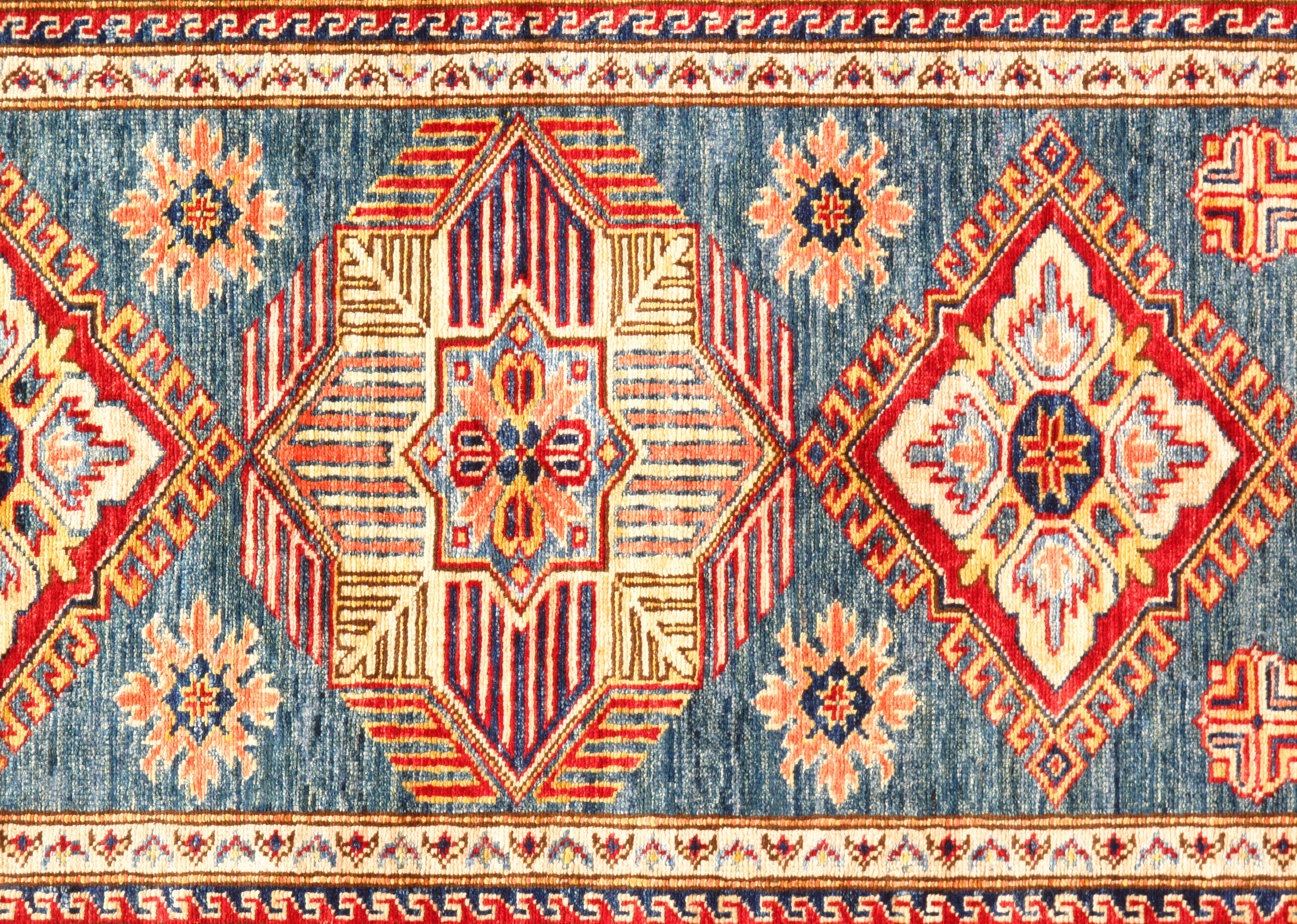 Kazak is a modern shape of old Caucasian rugs which strictly adheres to traditional design elements of the Caucasus. It has elements such as the stepped hooked polygons, geometrical medallions and rosettes, presented in more stylized manner and with a new dimension. Natural dyes produce soft luminous shades and abrashes causing a beautiful sheen. Handspun wool yarn is normally used in the variety of vibrant warm colors. Kazaks rugs in our collection are all fine quality pieces from Pakistan made with Ghazni handspun wool and natural dyes.