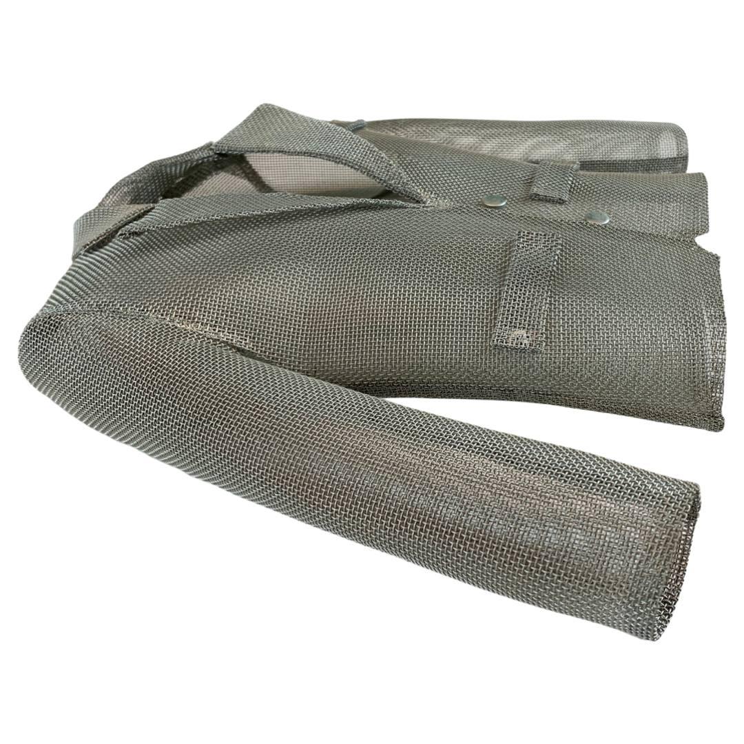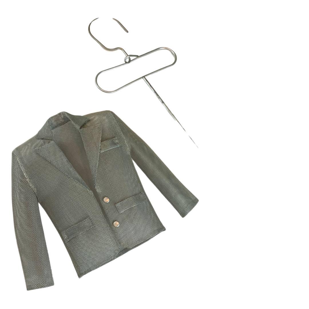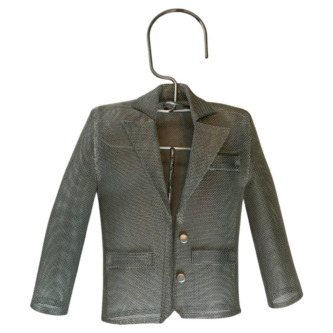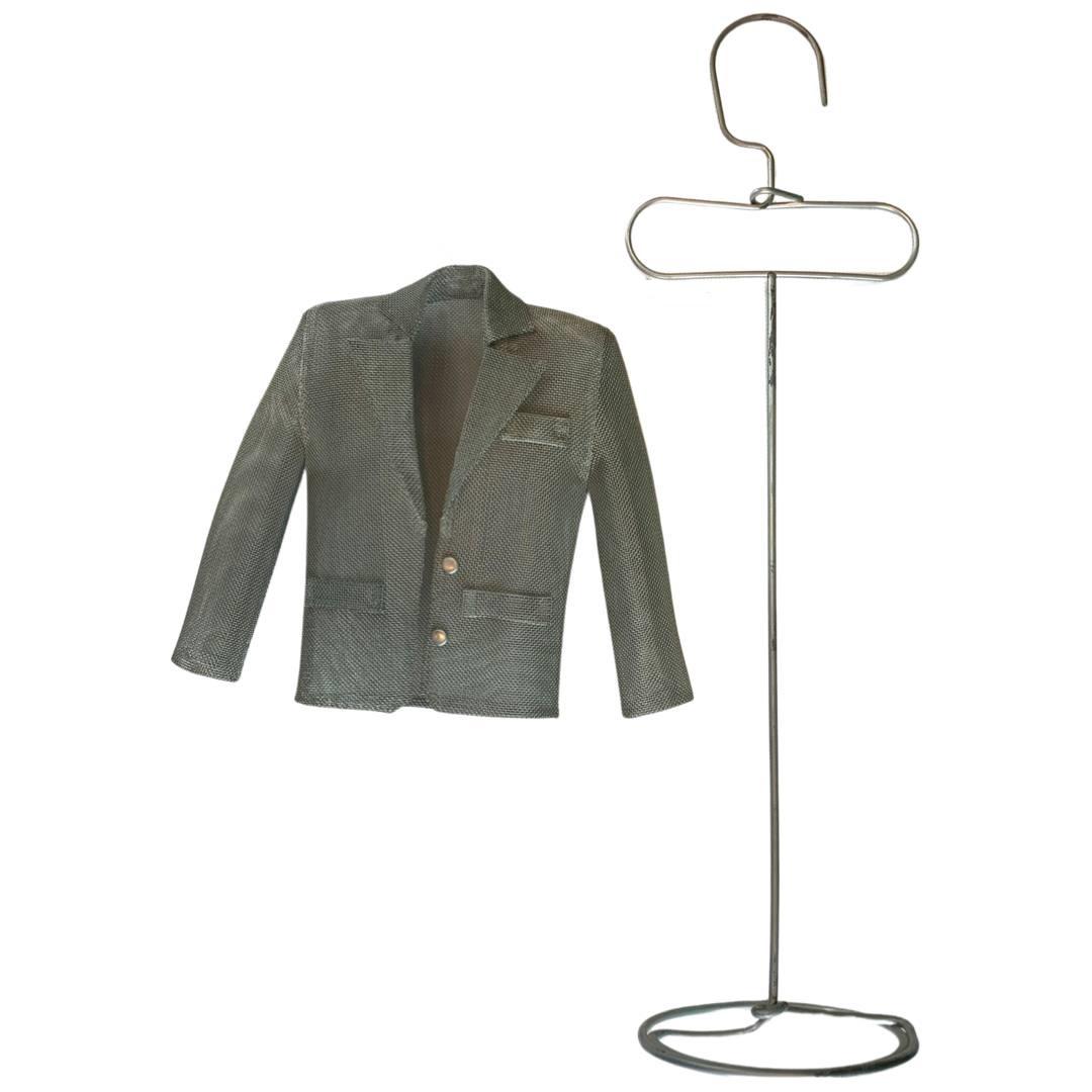 Miniature men's tuxedo jacket made from wire mesh on a metal stand. This unusual metal sculpture could have been used as a store display, but it makes a unique art object for your home or office.