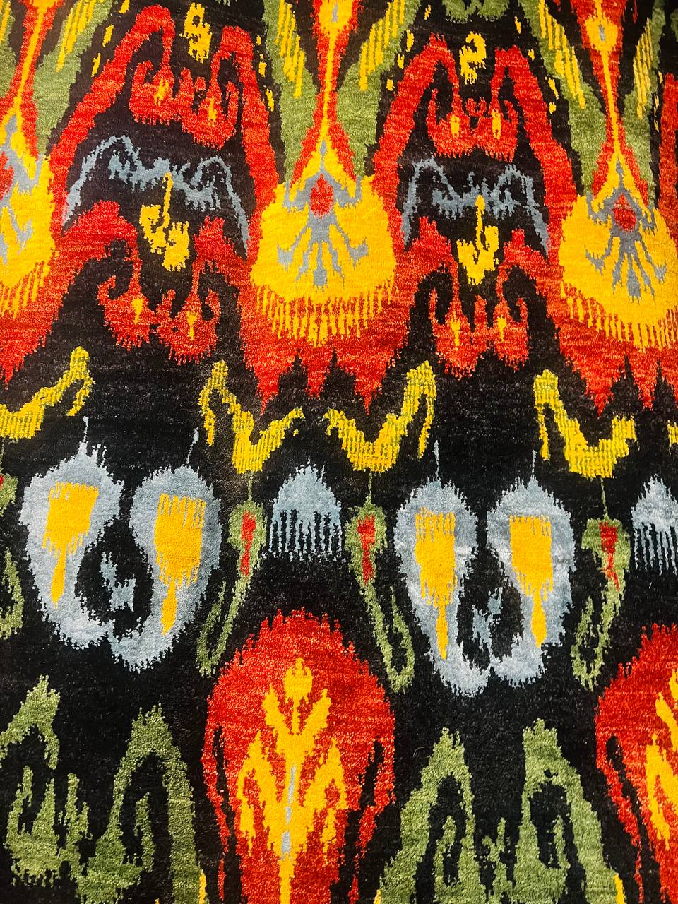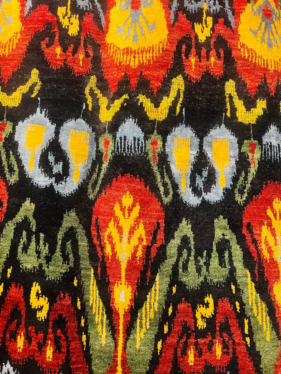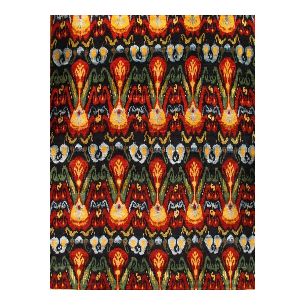 Modern Ikat Design rug. Handmade Hand-knotted Very Practical for High Traffic Hand-Spun Lamb's Wool and Silk on a Cotton Foundation Vegetable Dyed This rug is handmade from 100-percent premium, hand-spun wool, and employ ancient pot-dying techniques to give them their authentic look.