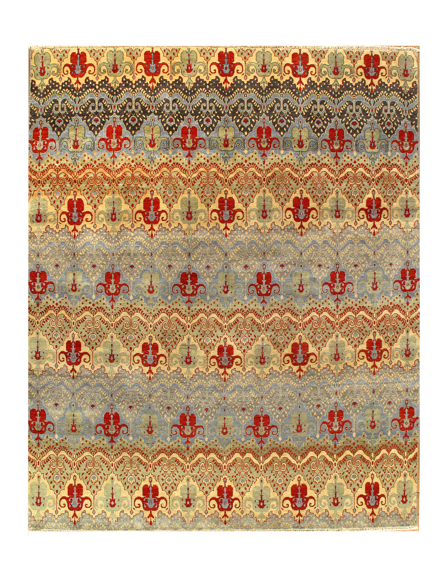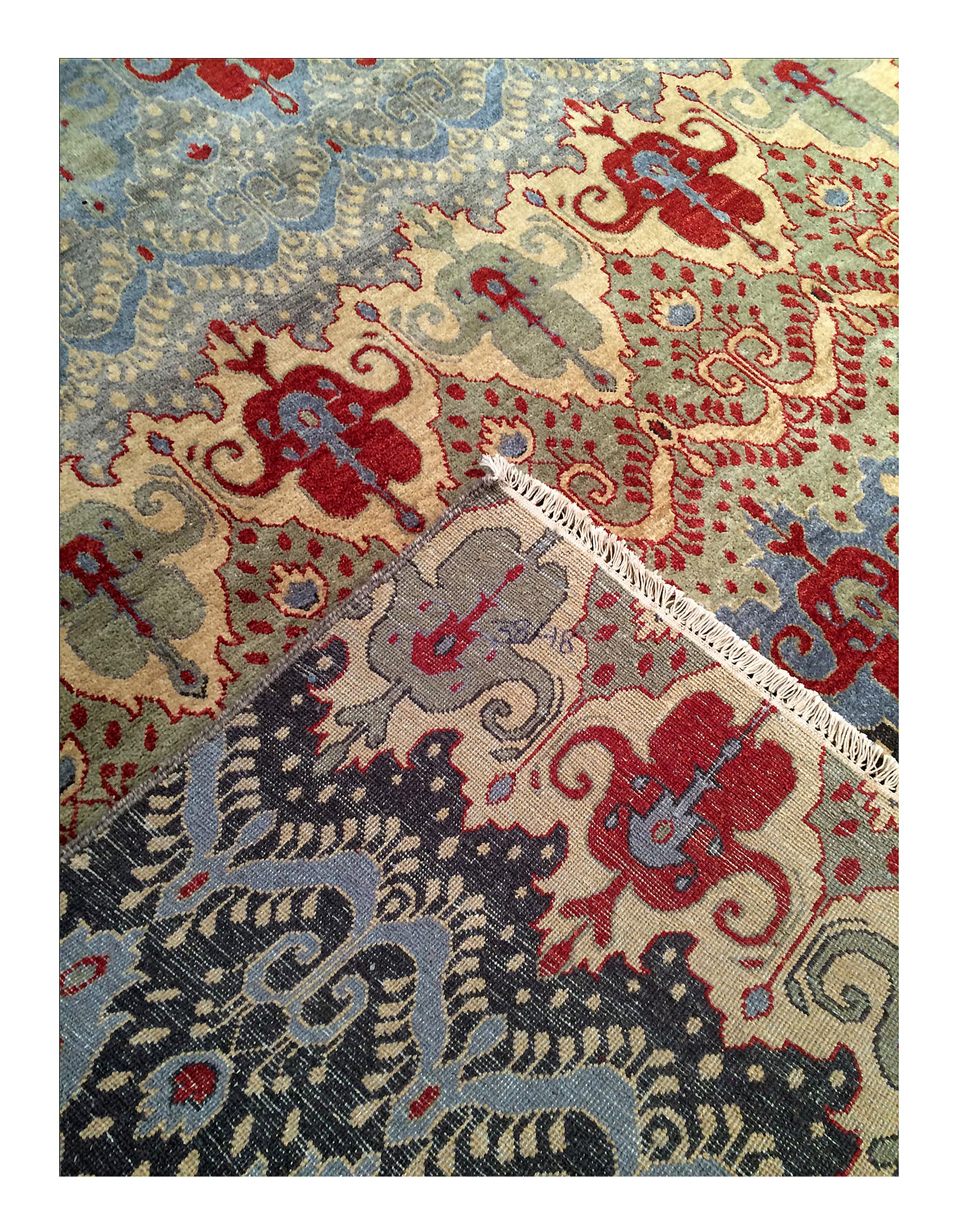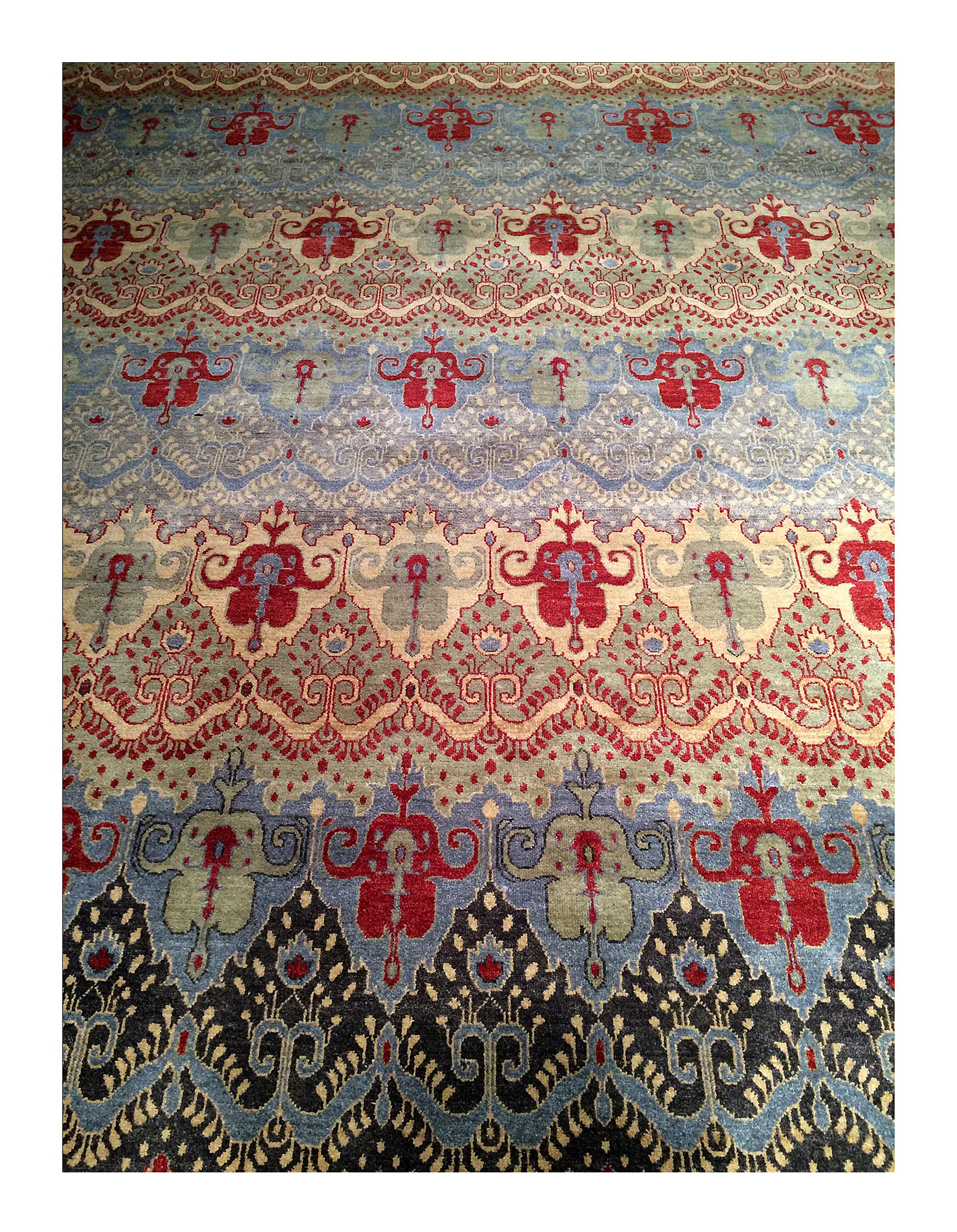Ikat design. Hand knotted. Vegetable dye. Fine lamb's wool. From India.