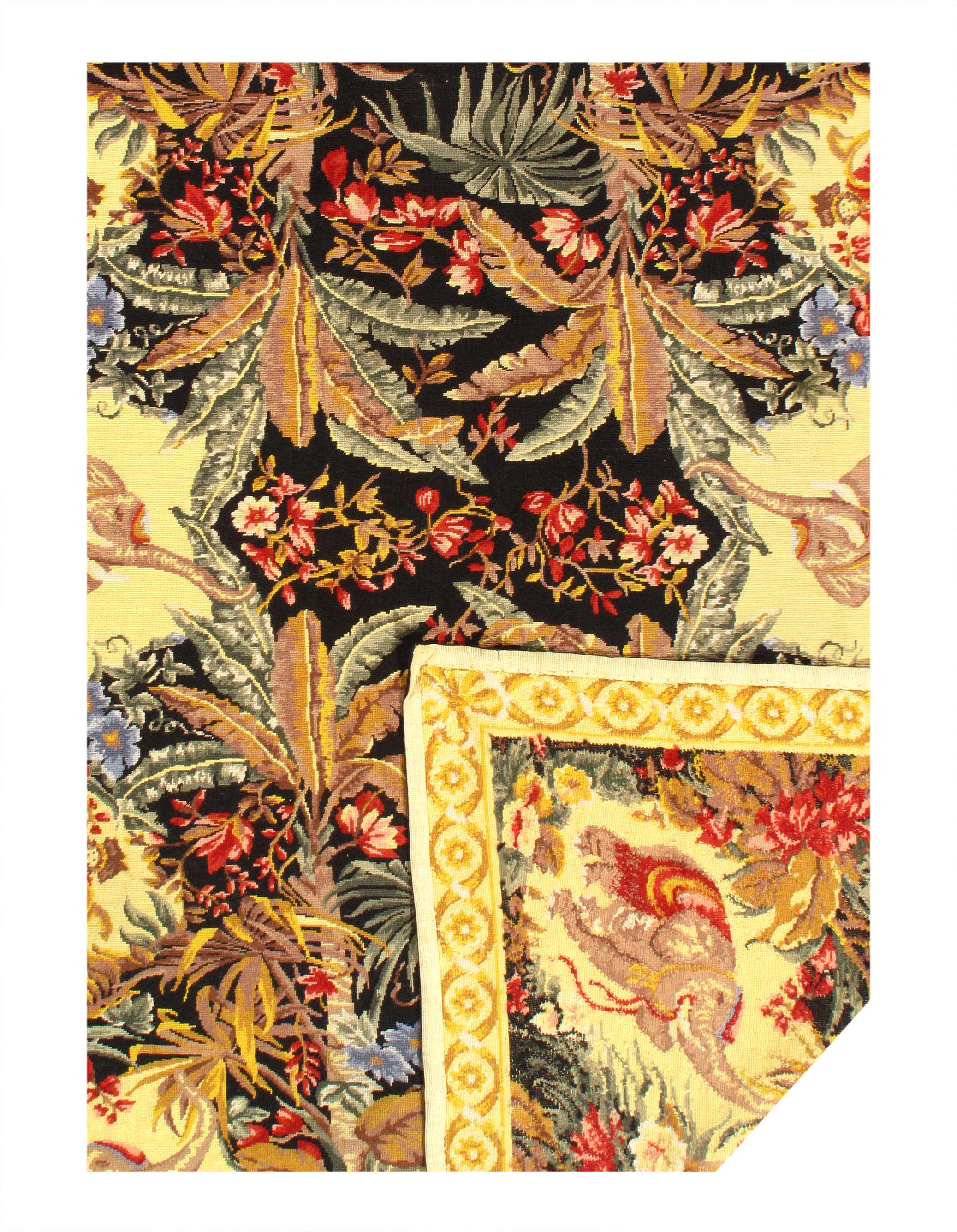 This is a beautiful reproduction Aubusson flat weave rug. Handcrafted using 100% New Zealand wool. It was done exactly as it was centuries ago in France. Use with a thick pad on the floor in any room, or display on a wall. Patterns may vary according to shape and dimension