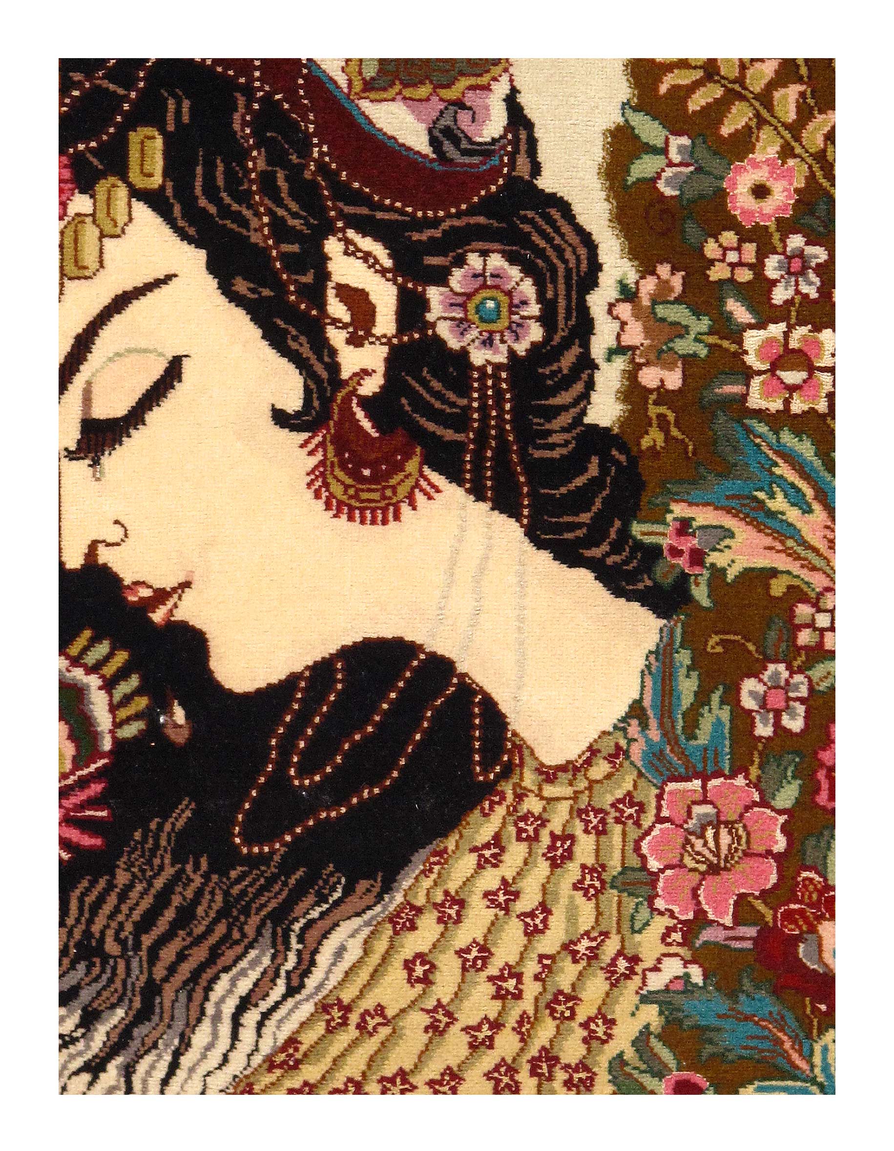 Handmade Persian Tabriz wall hanging rug, the romantic time for the king and his mistress. 100% wool pile on silk foundation with high and low effect, size 1'9'' X 2'9''Price is unframed.