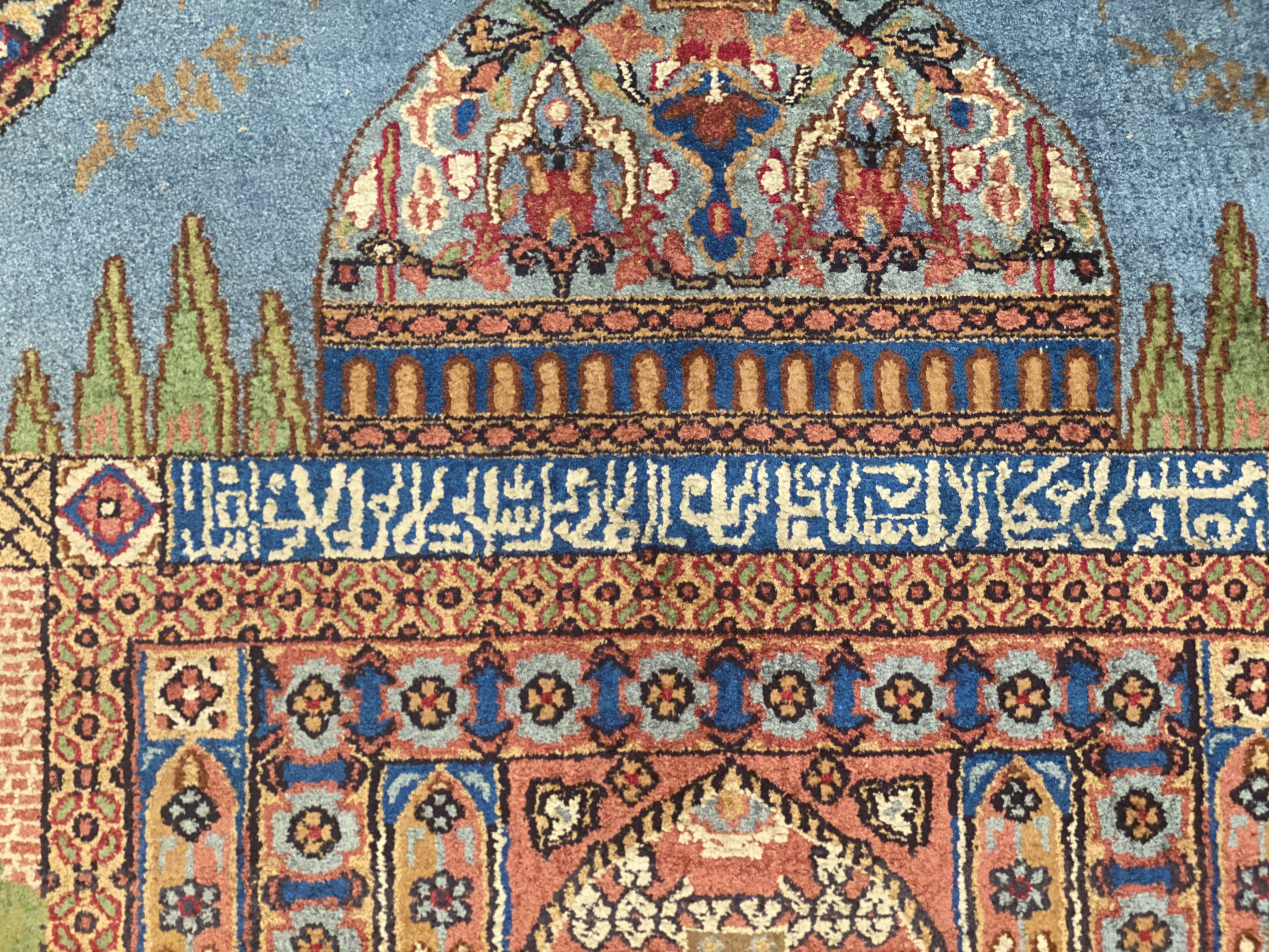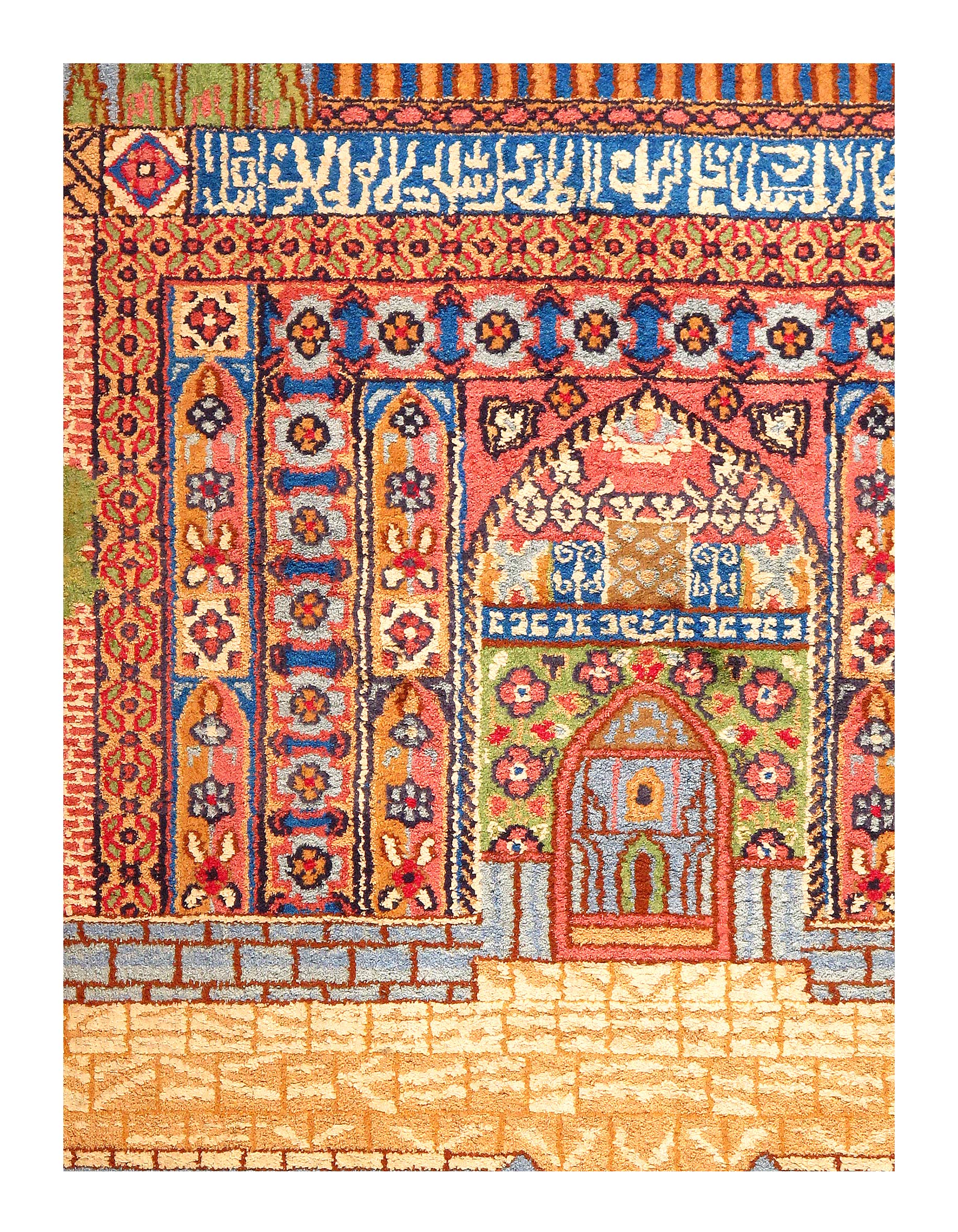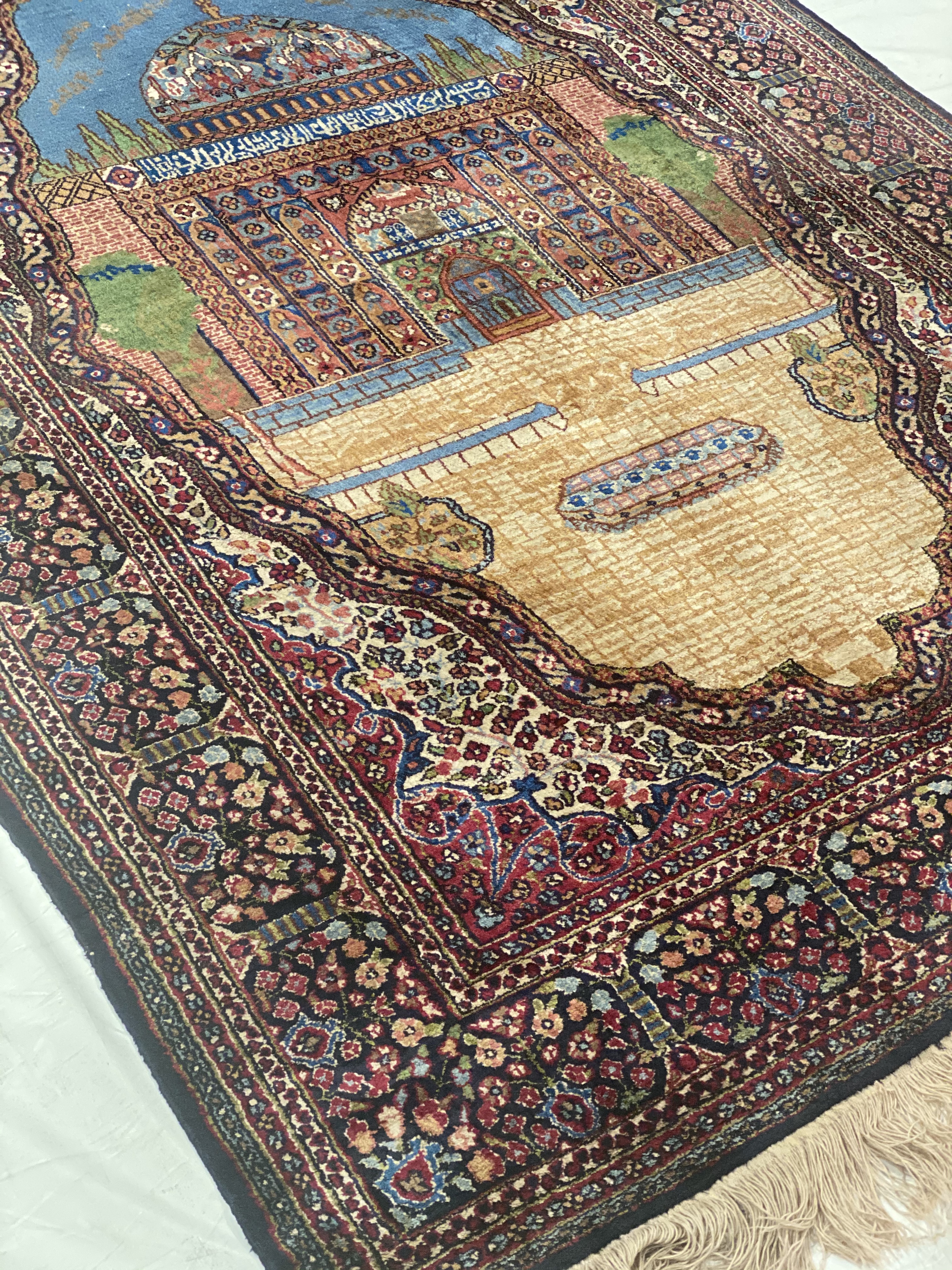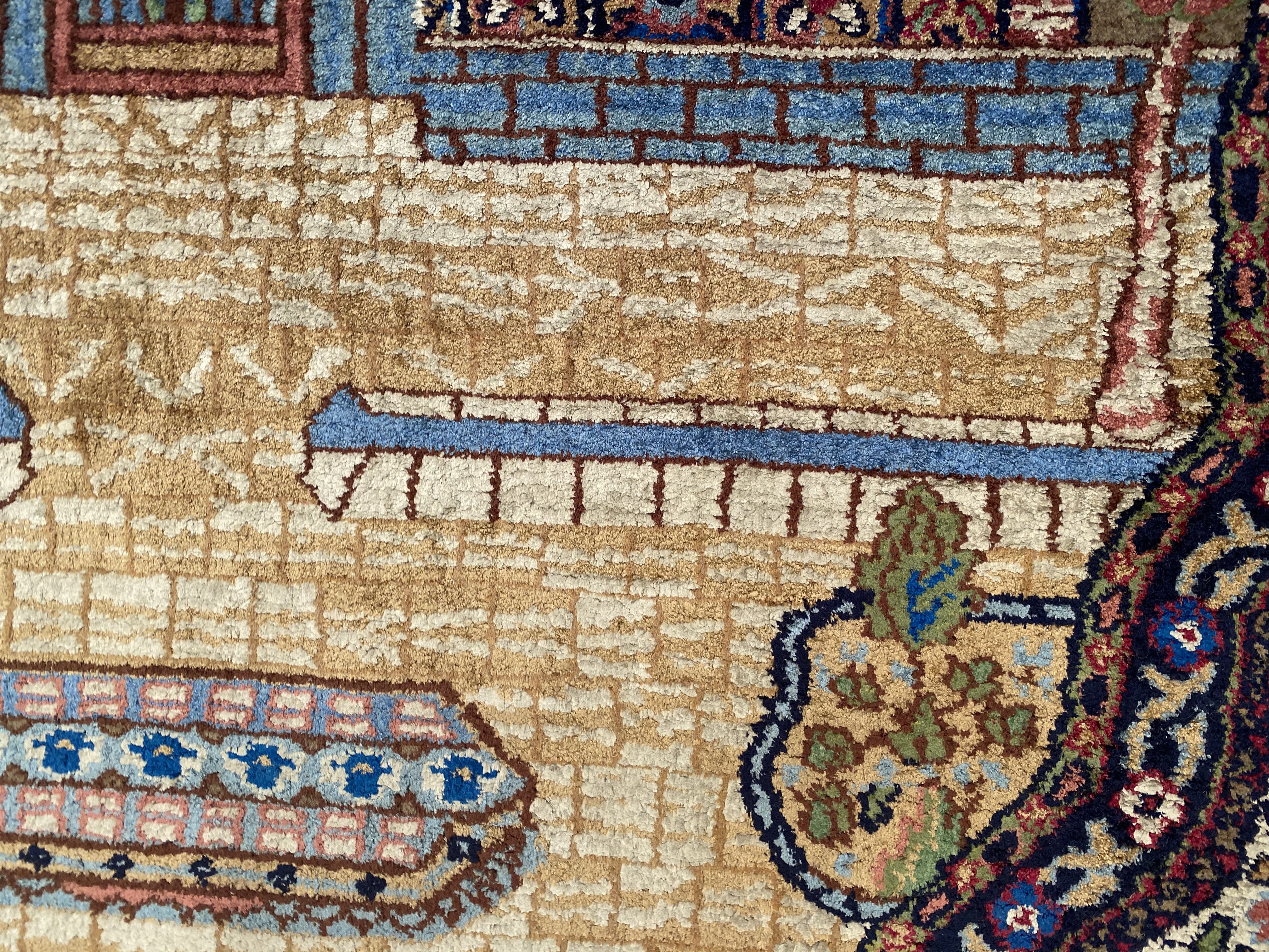 This rug is a unique piece of world art that will enhance your living space. These pure silk design rugs is truly beautiful high quality pieces that have known to last just as long as the Persian rugs. The Kashmiri people migrated from Great Persia in the 16th Century to India during the Persian Empire, and brought the tradition of rug weaving with them to Kashmir. This rug is 100-percent silk. The pile height is 0.25 inches. The knot count for this rug is 350. This rug has a pattern in shades of navy, rust, tan, ivory, light blue, gold and beige.