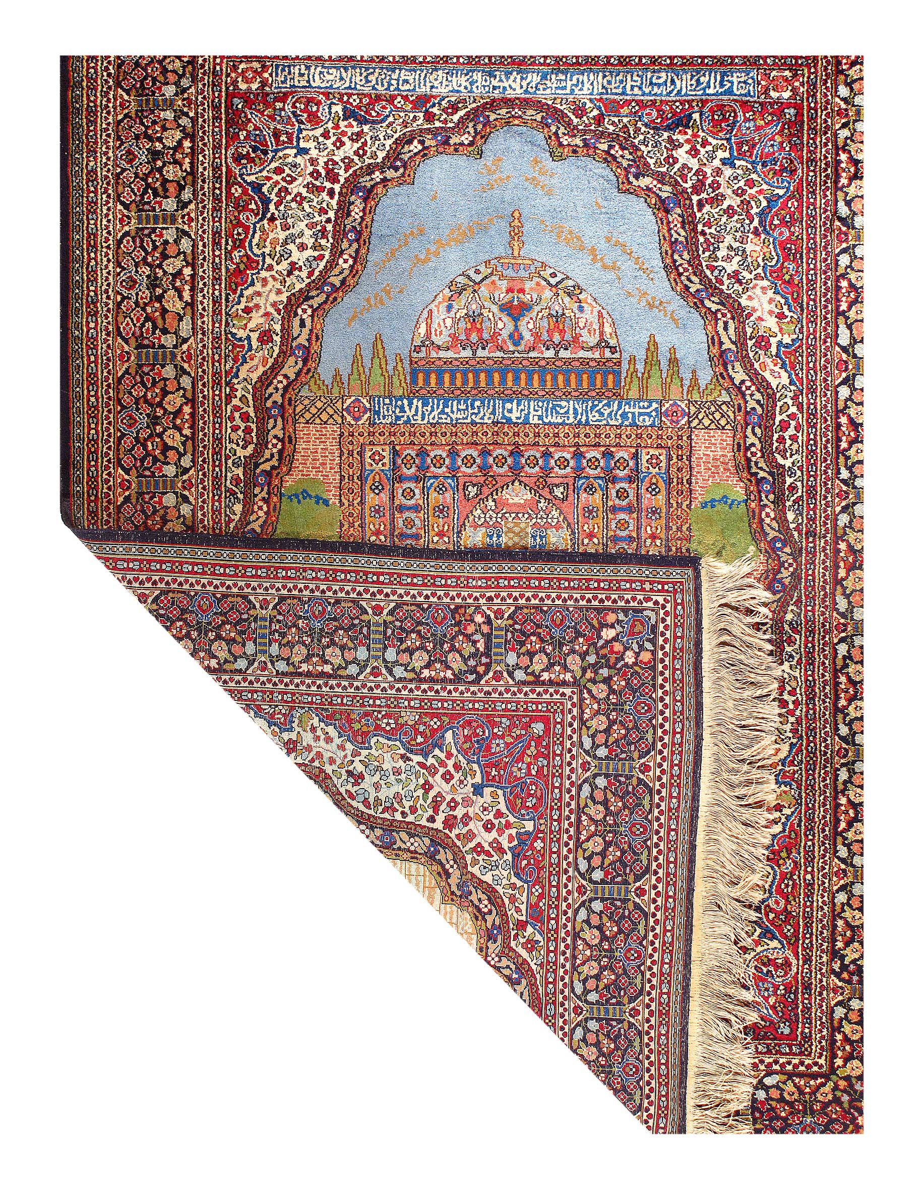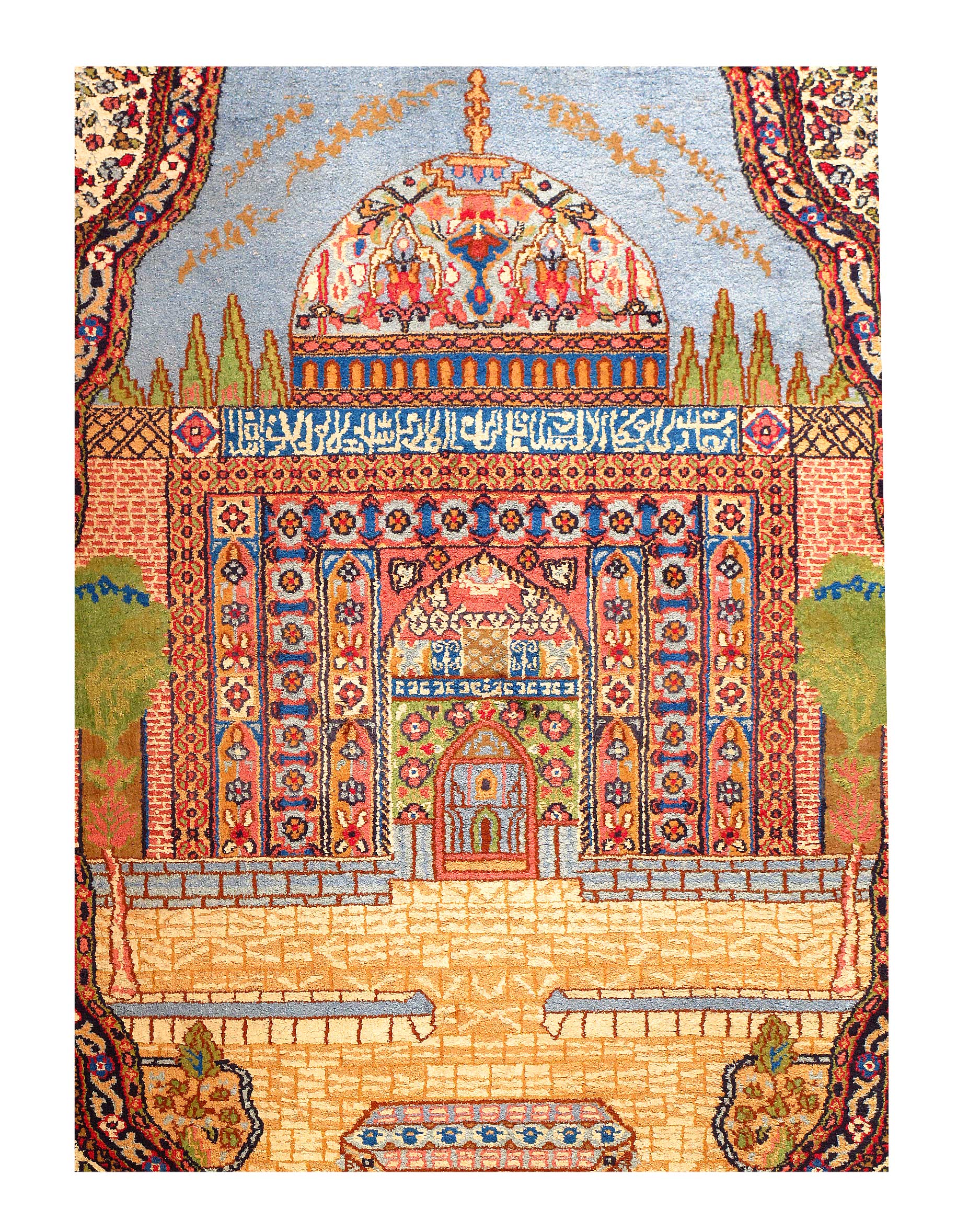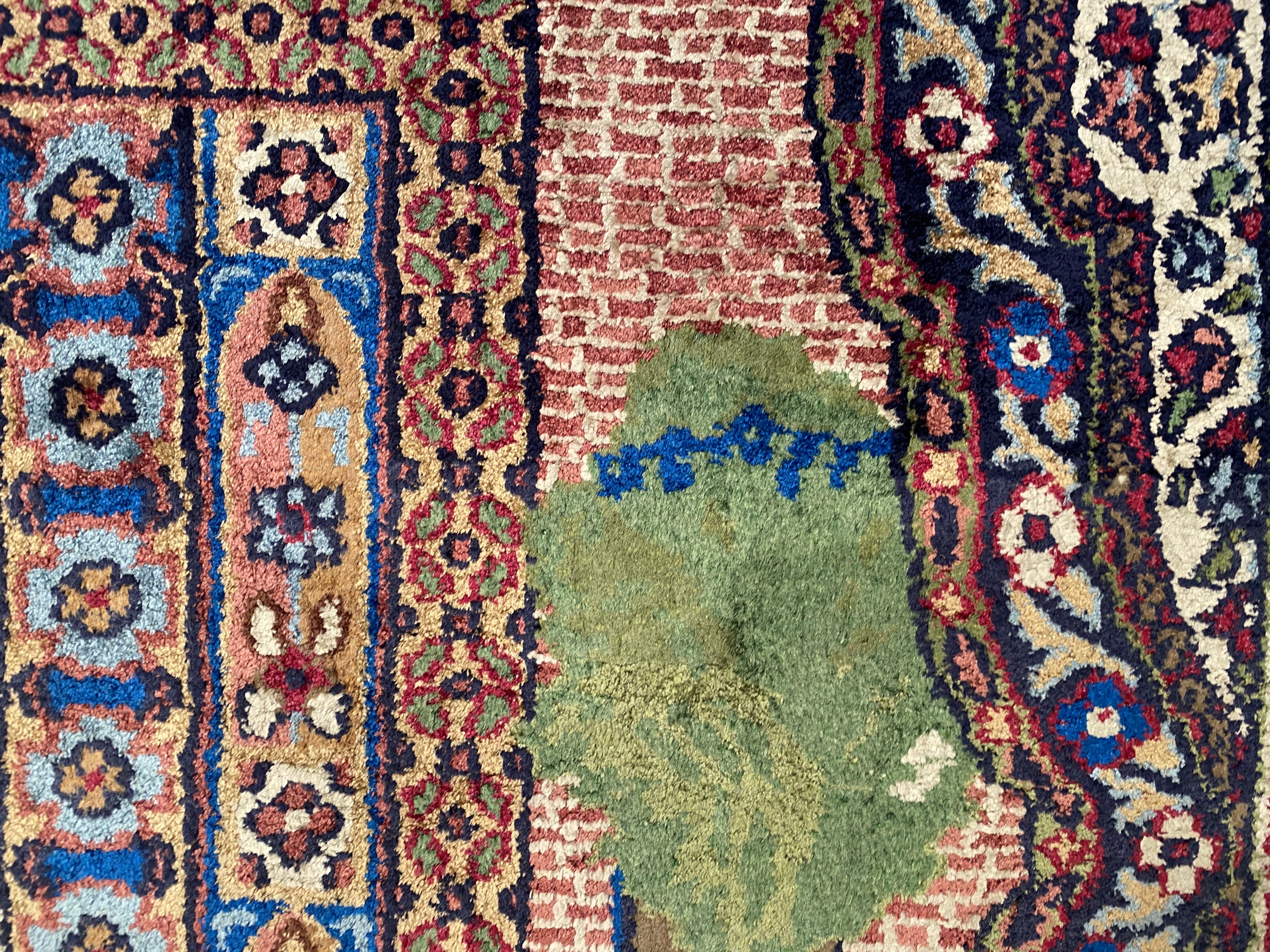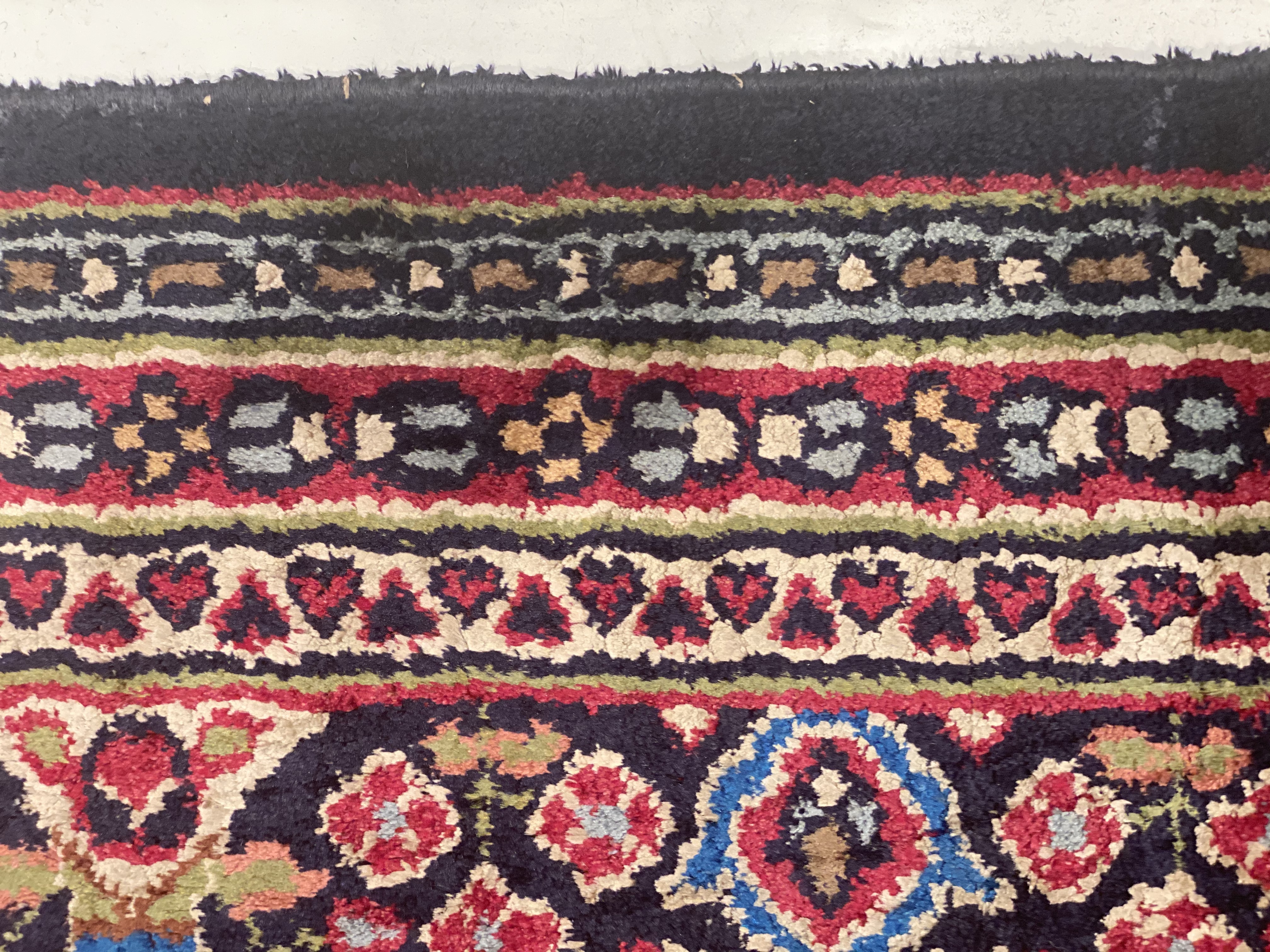 This rug is a unique piece of world art that will enhance your living space. These pure silk design rugs is truly beautiful high quality pieces that have known to last just as long as the Persian rugs. The Kashmiri people migrated from Great Persia in the 16th Century to India during the Persian Empire, and brought the tradition of rug weaving with them to Kashmir. This rug is 100-percent silk. The pile height is 0.25 inches. The knot count for this rug is 350. This rug has a pattern in shades of navy, rust, tan, ivory, light blue, gold and beige.