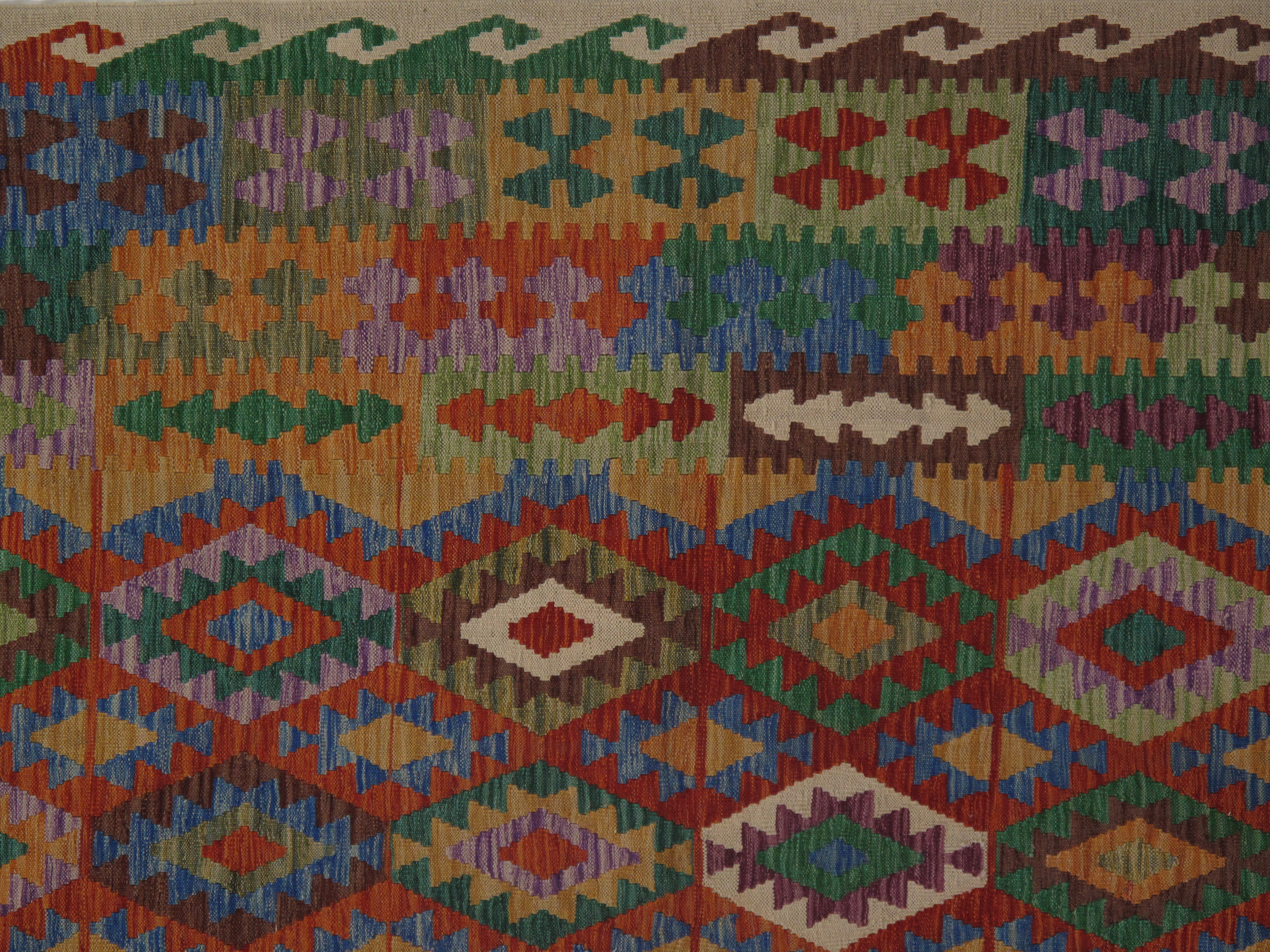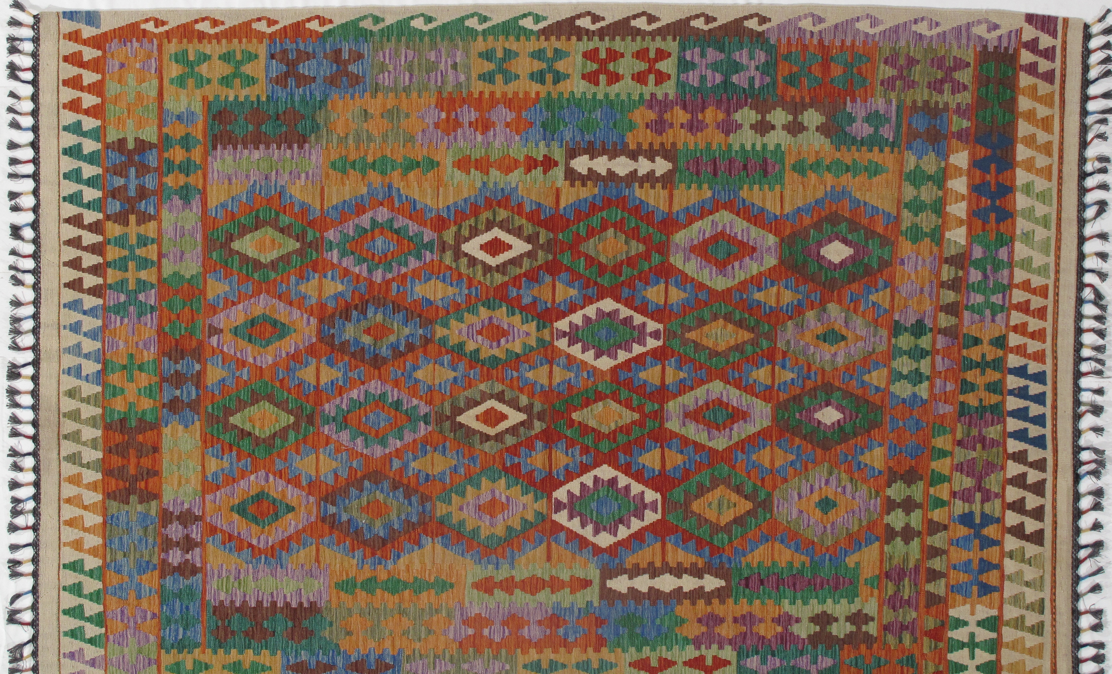 Add a touch of elegance to your home with this casual chic hand woven Kilim wool rug. Constructed on a loom by Nomad turkman people with hand spun wool and 100% natural Vegetable dyes this beautiful rug is known for its beautiful repetitive geometric pattern with naturalistic floral and traditional patterns. The contemporary fashion palette produces bold, sharp patterns that are ingeniously versatile as the pattern is same on the front and back. This double-sided rug is designed to be used both ways being one side has a light shade of color, rather the other side has brighter colors and can be used to preference. This beautiful rug is made by individual short strands of different color being knotted onto the warps and held together by pressing the wefts tightly. The design is made by interweaving the variously colored wefts and warps. Kilims are known to be one of a kind rug due to its durability and versatility.