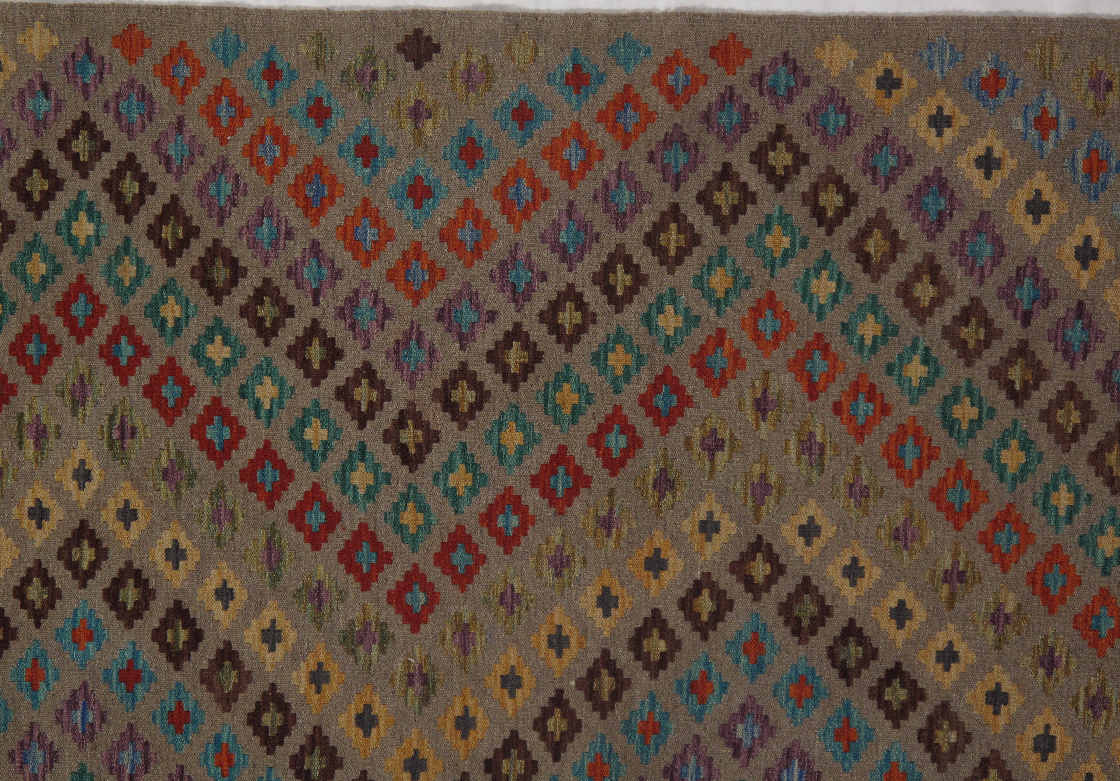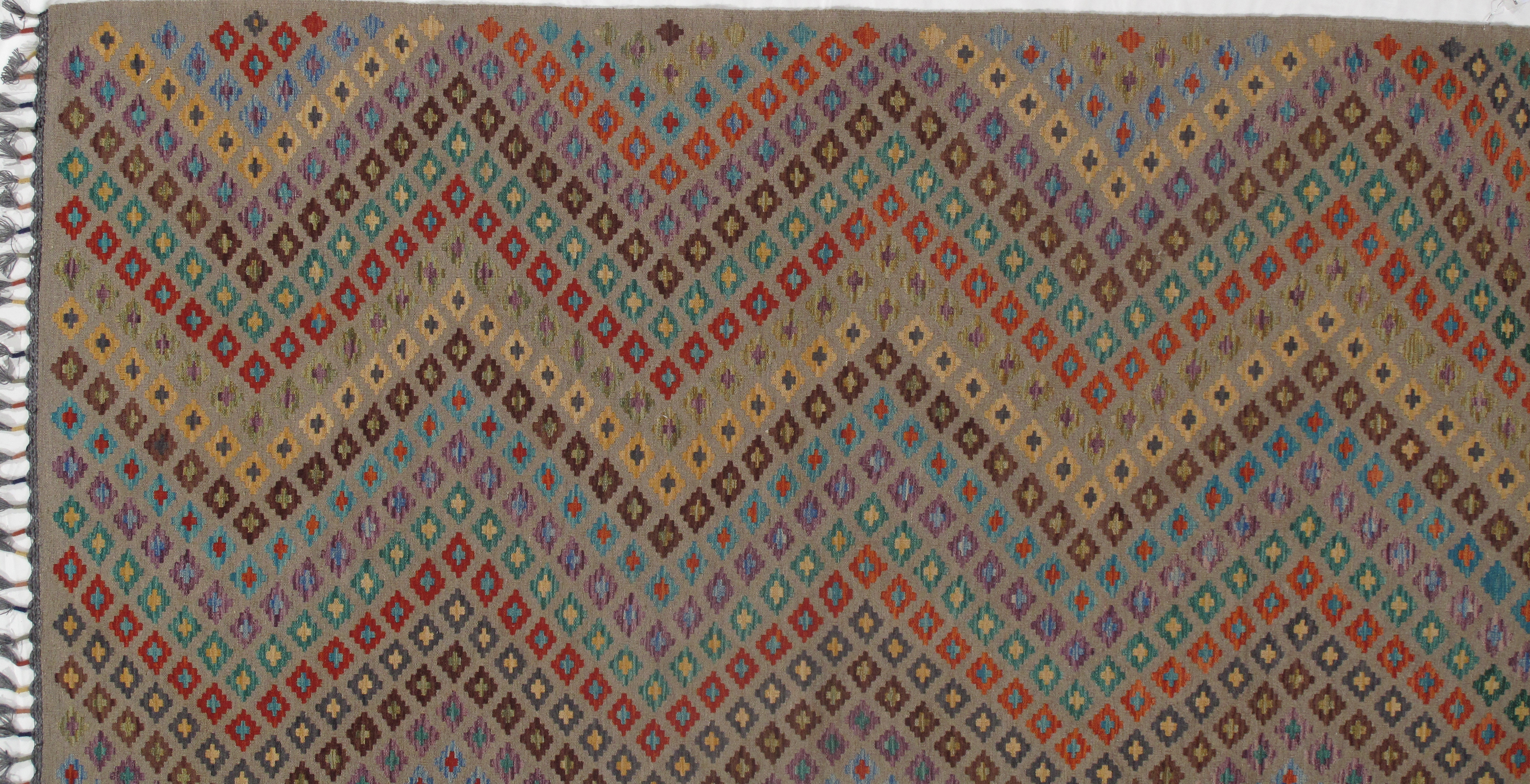 Add a touch of elegance to your home with this casual chic hand woven Kilim wool rug. Constructed on a loom by Nomad turkman people with hand spun wool and 100% natural Vegetable dyes this beautiful rug is known for its beautiful repetitive geometric pattern with naturalistic floral and traditional patterns. The contemporary fashion palette produces bold, sharp patterns that are ingeniously versatile as the pattern is same on the front and back. This double-sided rug is designed to be used both ways being one side has a light shade of color, rather the other side has brighter colors and can be used to preference. This beautiful rug is made by individual short strands of different color being knotted onto the warps and held together by pressing the wefts tightly. The design is made by interweaving the variously colored wefts and warps. Kilims are known to be one of a kind rug due to its durability and versatility.