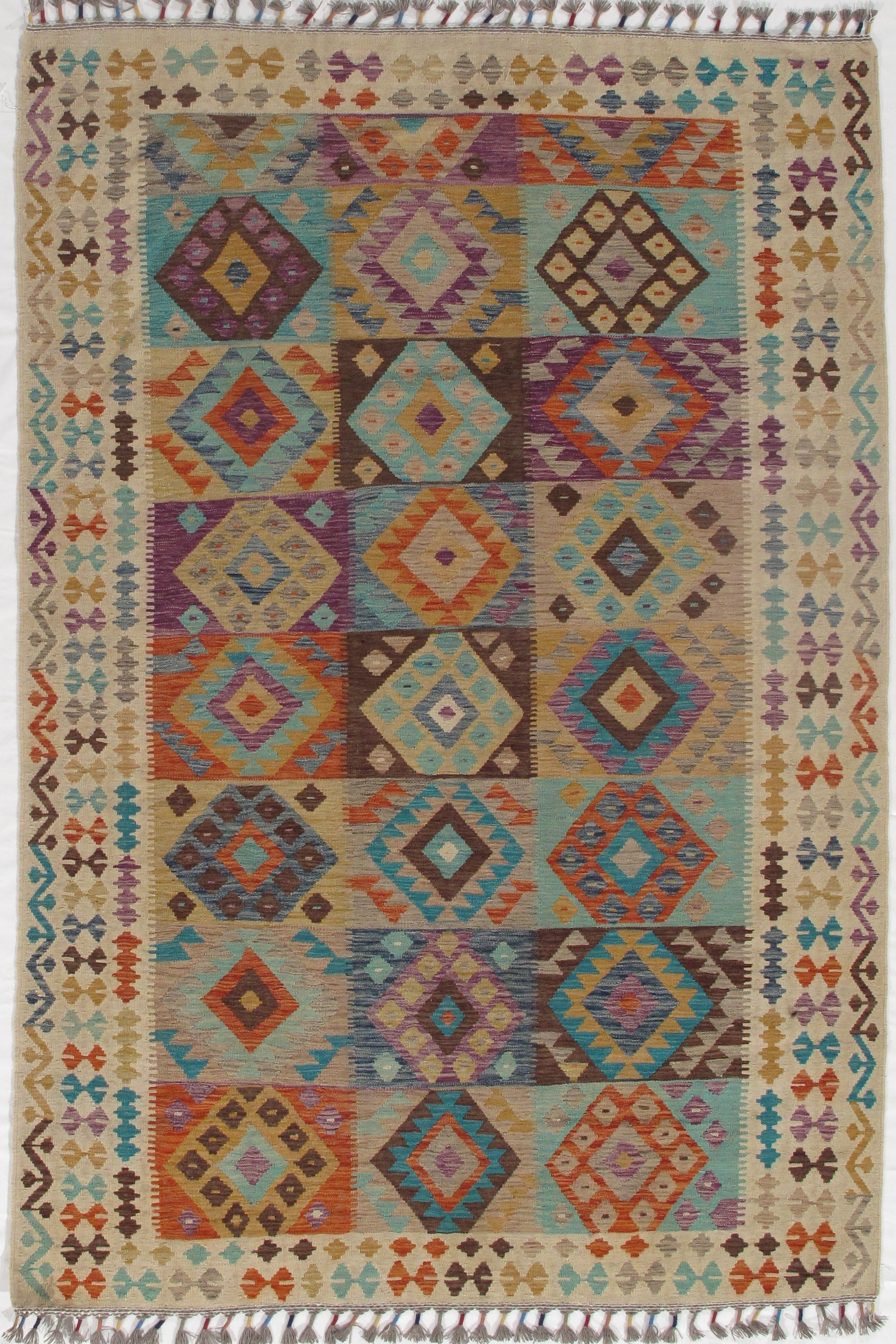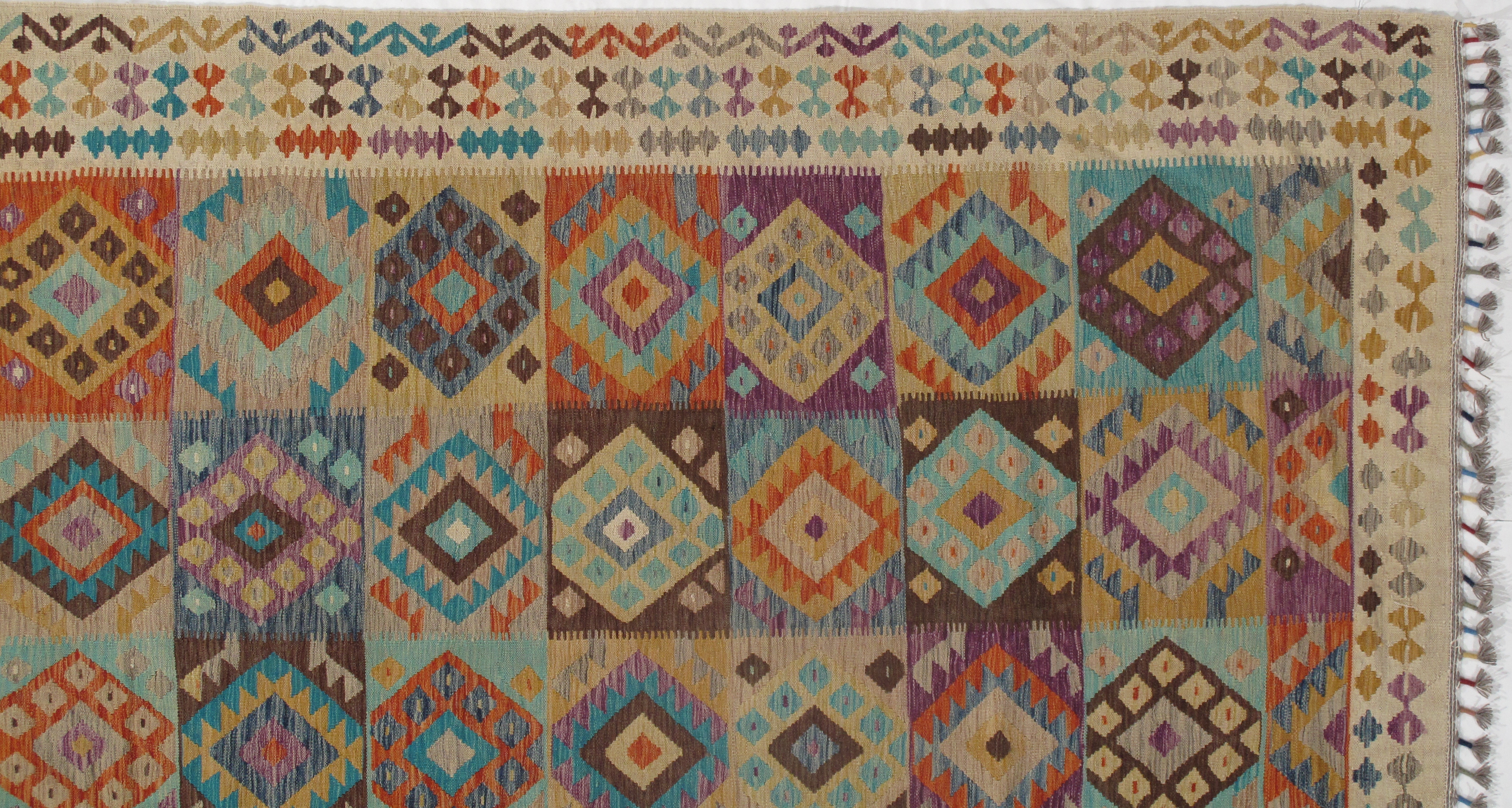 Add a touch of elegance to your home with this casual chic hand woven Kilim wool rug. Constructed on a loom by Nomad turkman people with hand spun wool and 100% natural Vegetable dyes this beautiful rug is known for its beautiful repetitive geometric pattern with naturalistic floral and traditional patterns. The contemporary fashion palette produces bold, sharp patterns that are ingeniously versatile as the pattern is same on the front and back. This double-sided rug is designed to be used both ways being one side has a light shade of color, rather the other side has brighter colors and can be used to preference. This beautiful rug is made by individual short strands of different color being knotted onto the warps and held together by pressing the wefts tightly. The design is made by interweaving the variously colored wefts and warps. Kilims are known to be one of a kind rug due to its durability and versatility.