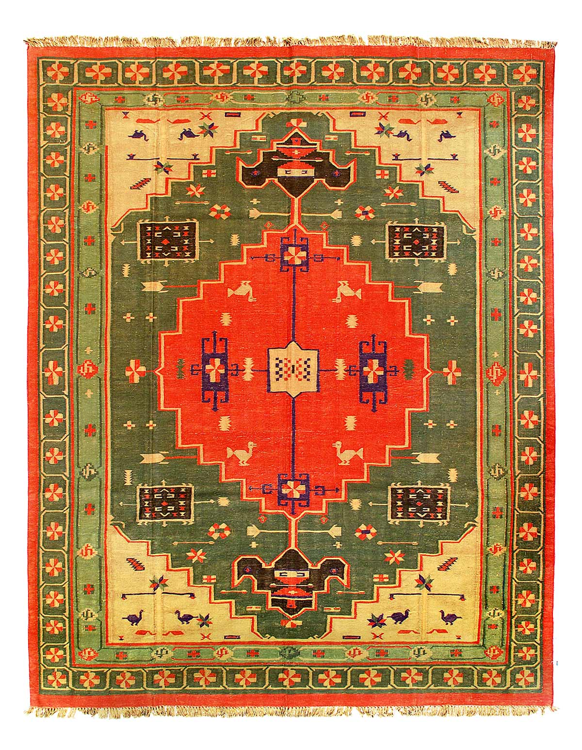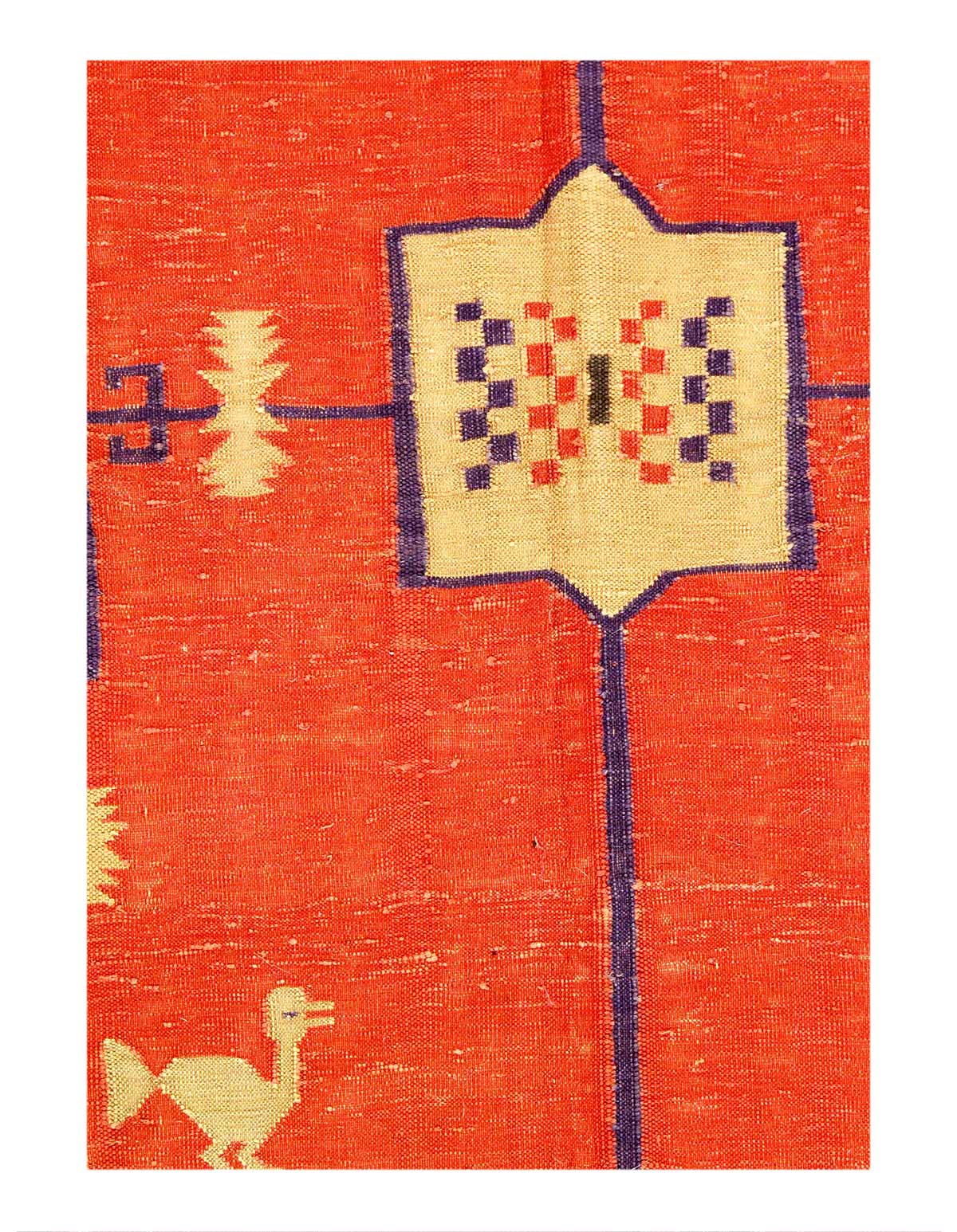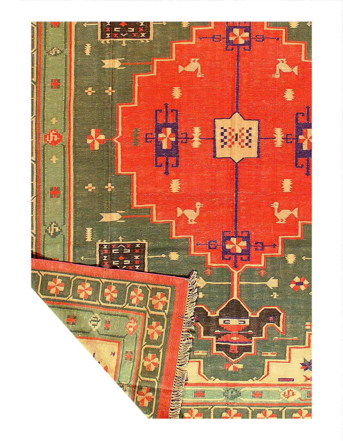 Add a touch of elegance to your home with this casual chic hand woven Kilim cotton rug. Constructed on a loom by Nomad people with 100% natural Vegetable dyes this beautiful rug is known for its beautiful repetitive geometric pattern with naturalistic floral and traditional patterns. The contemporary fashion palette produces bold, sharp patterns that are ingeniously versatile as the pattern is same on the front and back. This double-sided rug is designed to be used both ways being one side has a light shade of color, rather the other side has brighter colors and can be used to preference. This beautiful rug is made by individual short strands of different color being knotted onto the warps and held together by pressing the wefts tightly. The design is made by interweaving the variously colored wefts and warps. Kilims are known to be one of a kind rug due to its durability and versatility.