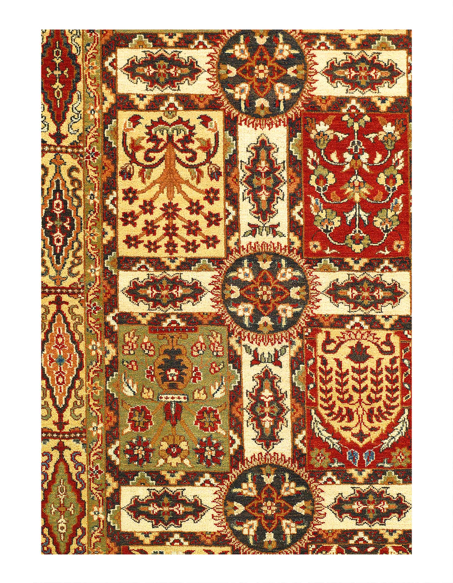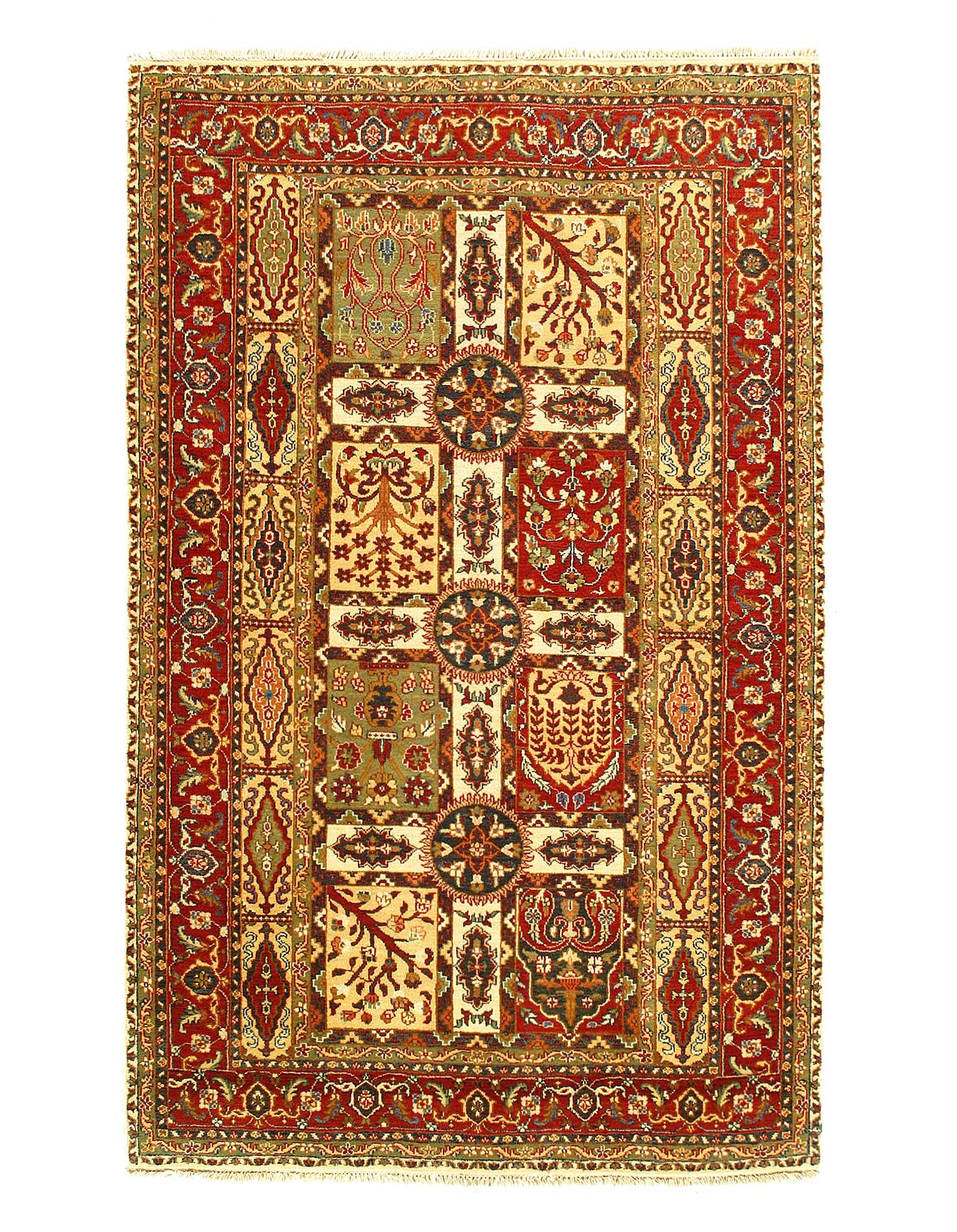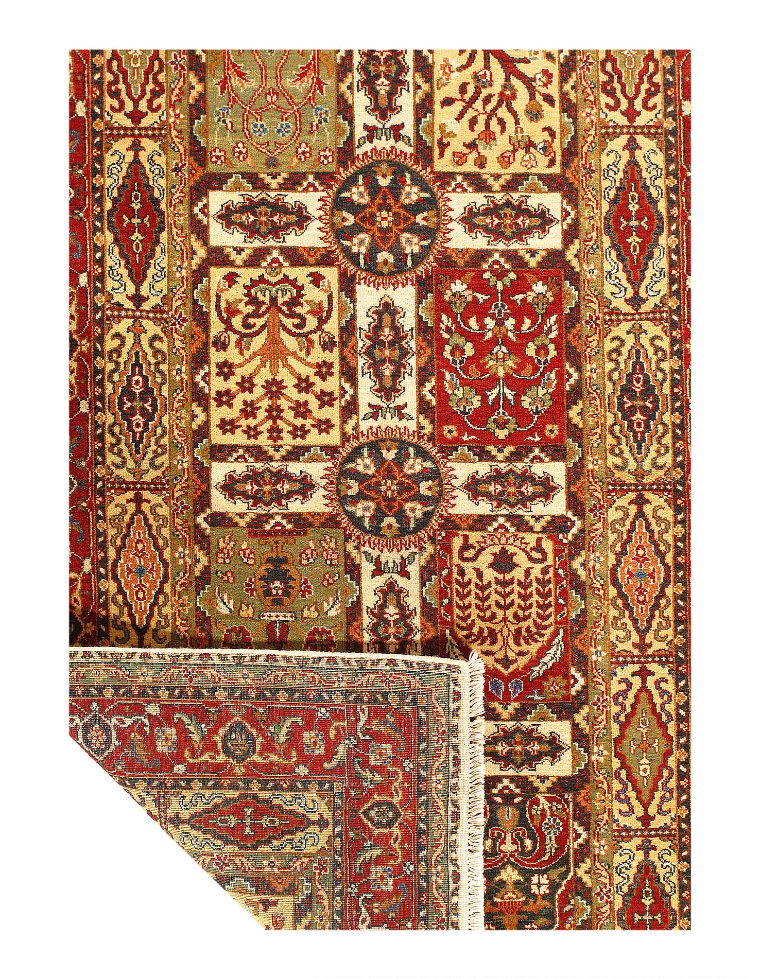Garden carpet, floor covering designed as a Persian garden seen from directly above. The design consists of a central watercourse, with tributary canals of various sizes, interrupted by islands or by ponds containing waterfowl and fishes, lined by avenues of stylized small trees and shrubs that surround flower plots, and often shaded by great plane trees. Different size are available......