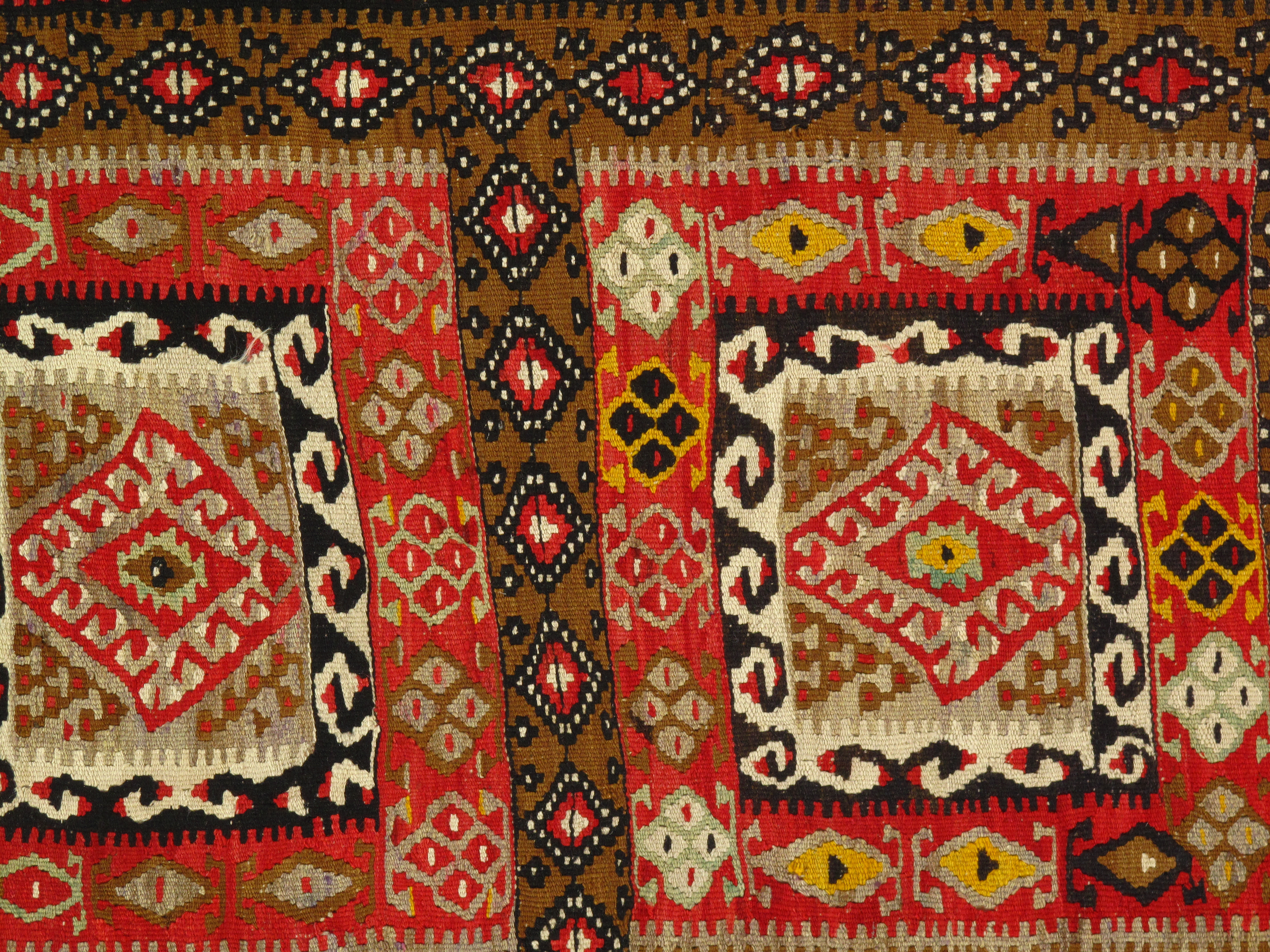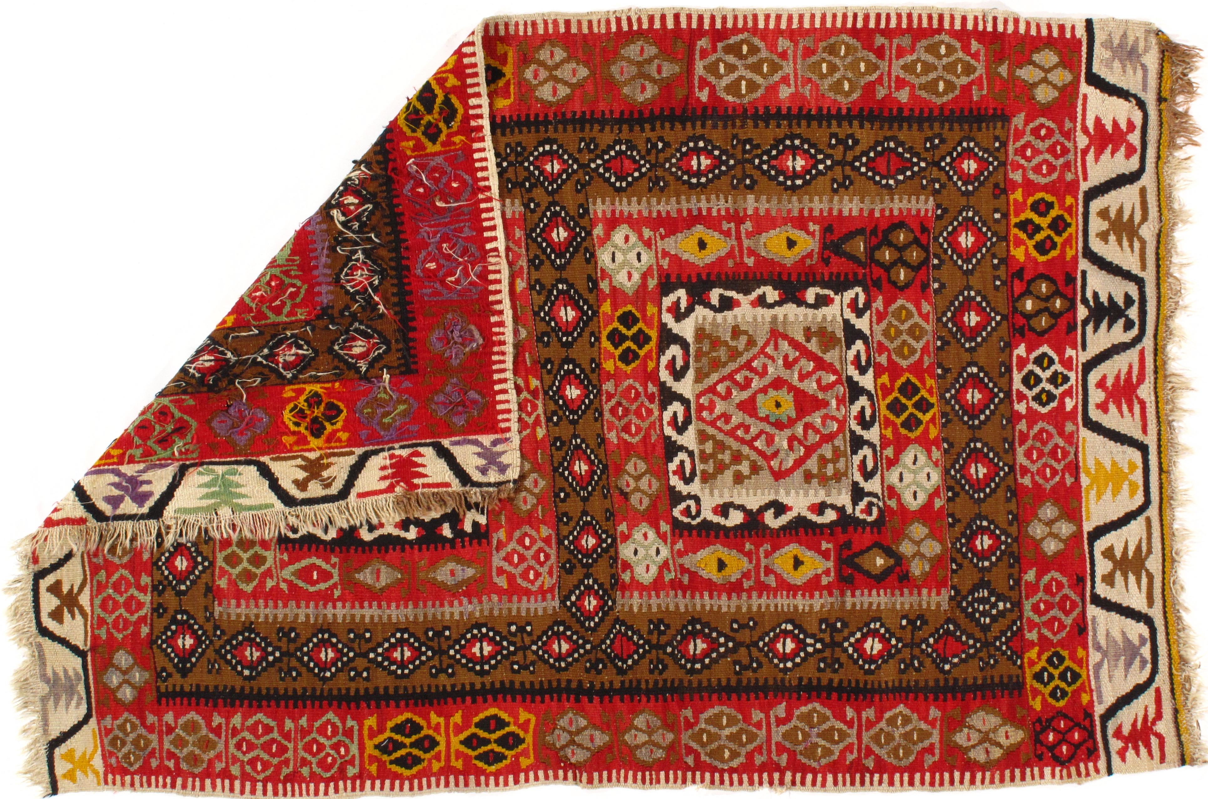 Add a touch of elegance to your home with this casual chic hand woven Kilim wool rug. Constructed on a loom by Nomad turkman people with hand spun wool and 100% natural Vegetable dyes this beautiful rug is known for its beautiful repetitive geometric pattern with naturalistic floral and traditional patterns. The contemporary fashion palette produces bold, sharp patterns that are ingeniously versatile as the pattern is same on the front and back. This double-sided rug is designed to be used both ways being one side has a light shade of color, rather the other side has brighter colors and can be used to preference. This beautiful rug is made by individual short strands of different color being knotted onto the warps and held together by pressing the wefts tightly. The design is made by interweaving the variously colored wefts and warps. Kilims are known to be one of a kind rug due to its durability and versatility.