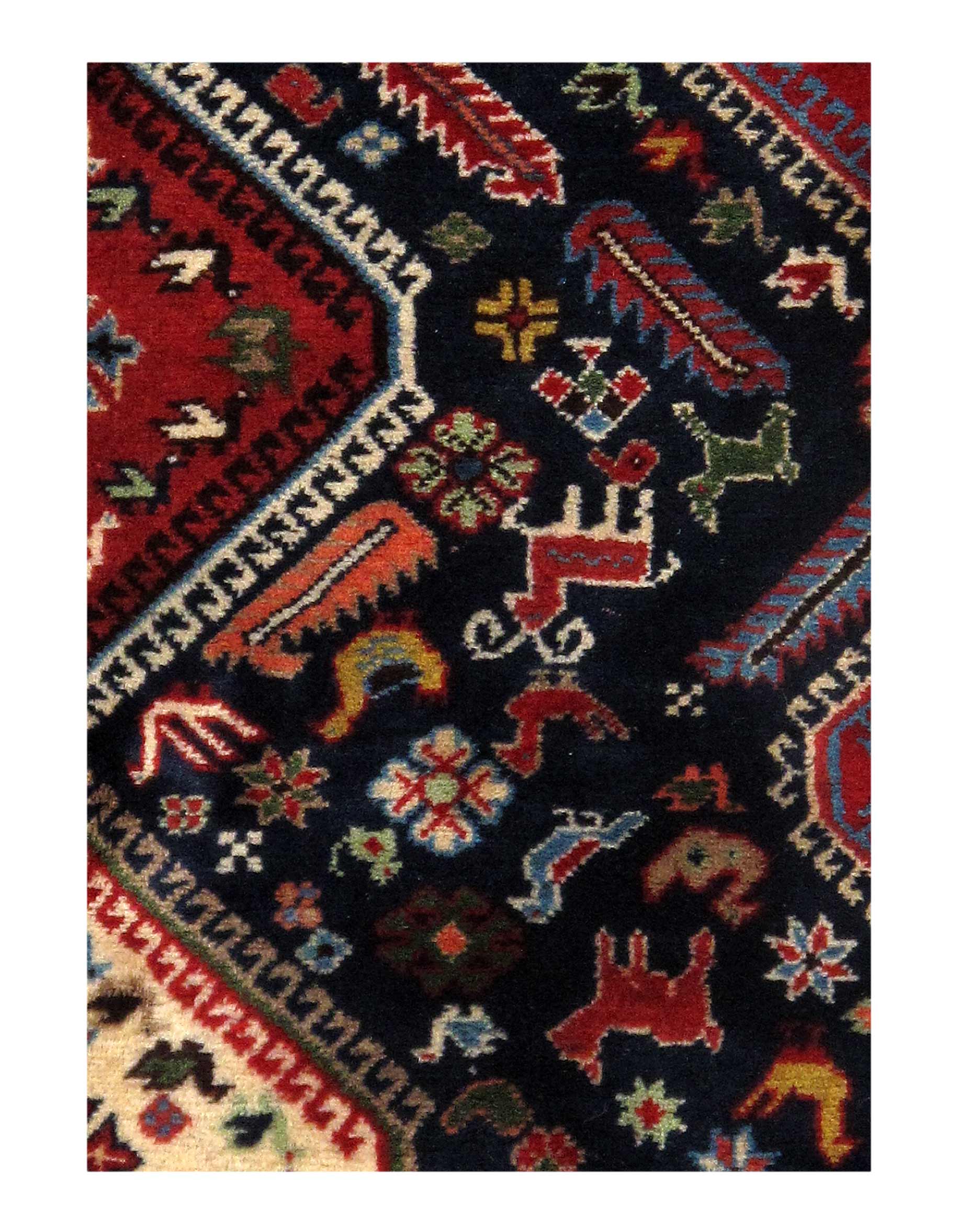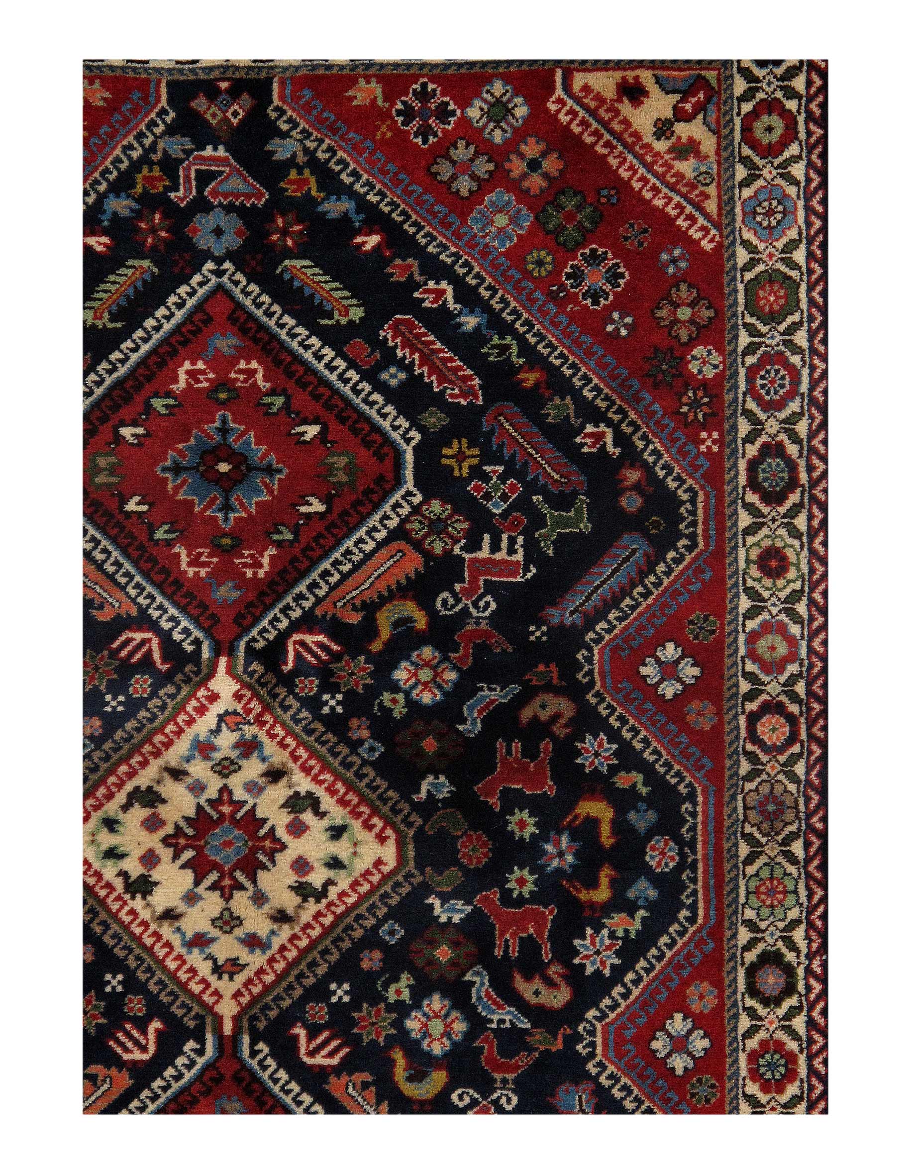 The pile used in Yalameh rugs is very fine, particularly in comparison to other tribal designs, using soft wool based on a Wool foundation. The pattern is distinctive with large repeated diamonds in a straight line down the carpet, often with geometrical animal or human prints scattered across the field. Dark red or light brown on a blue or orange background is most common for Yalameh, similar to Shiraz rugs, the rugs compliment modern or minimalist furniture beautifully, giving the living space an aura of luxurious style and warm.