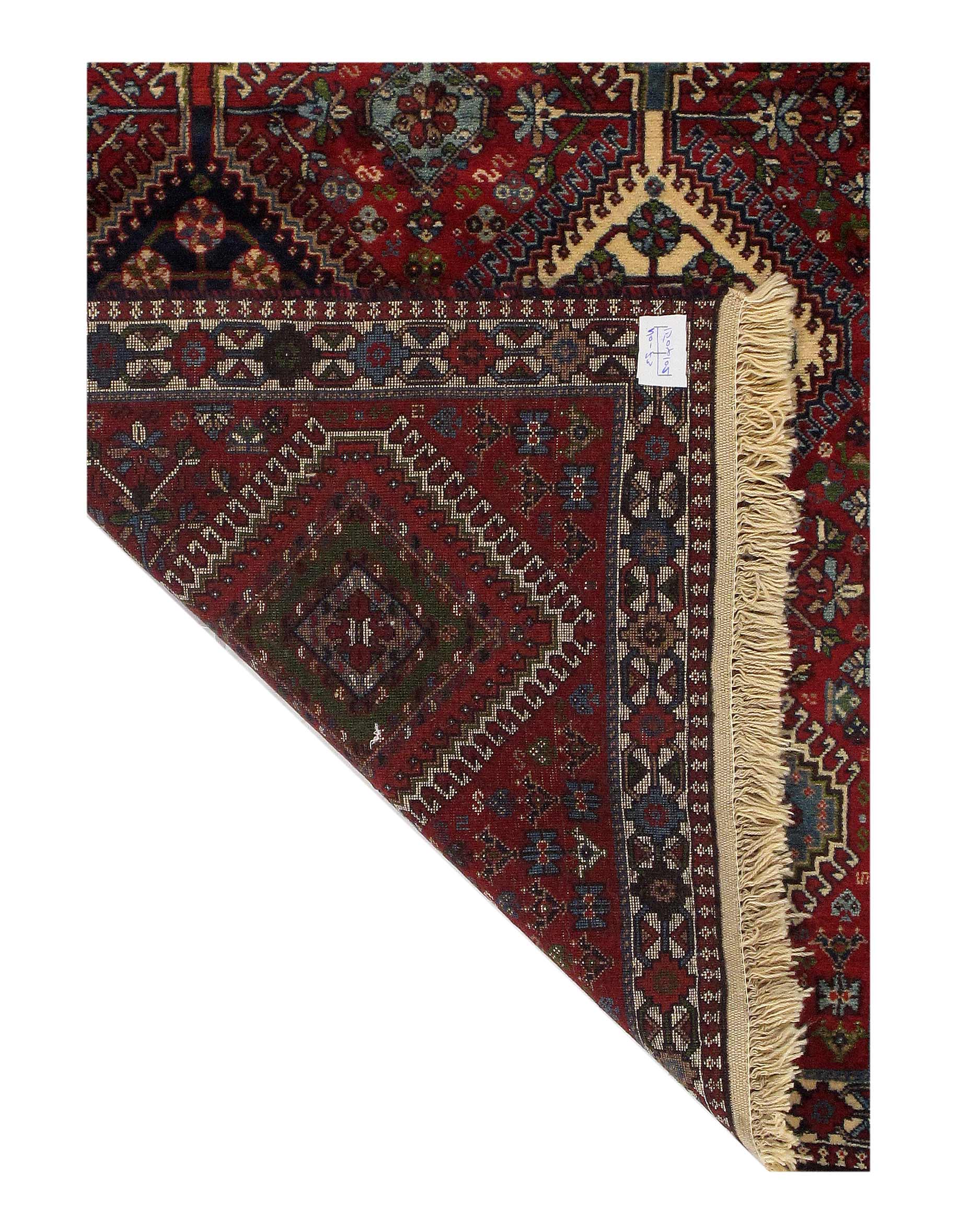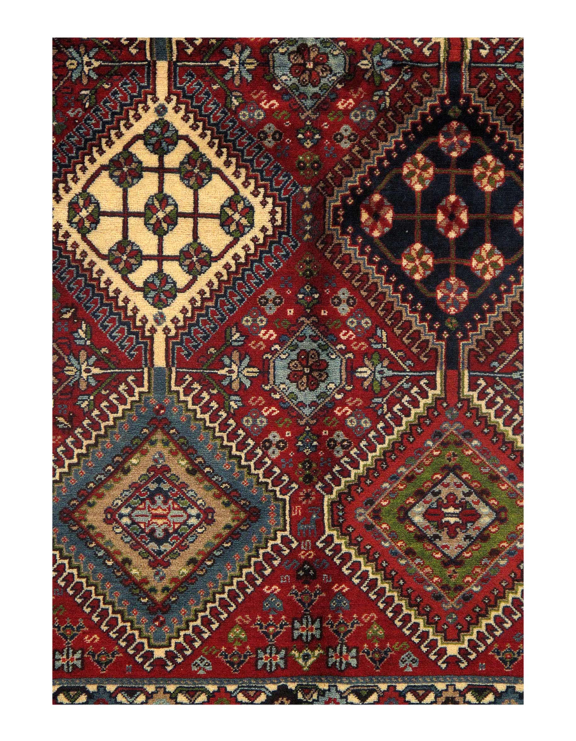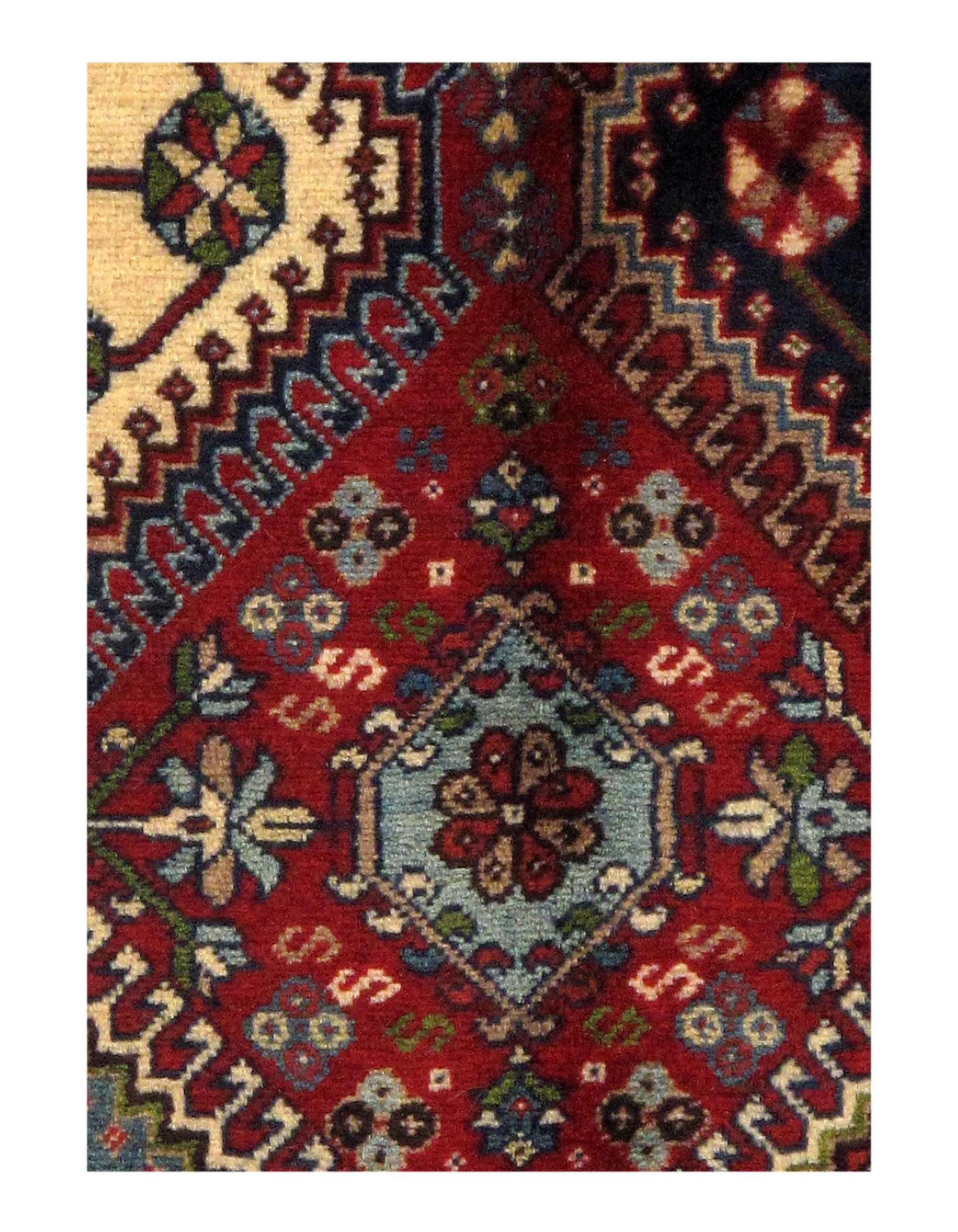 The pile used in Yalameh rugs is very fine, particularly in comparison to other tribal designs, using soft wool based on a Wool foundation. The pattern is distinctive with large repeated diamonds in a straight line down the carpet, often with geometrical animal or human prints scattered across the field. Dark red or light brown on a blue or orange background is most common for Yalameh, similar to Shiraz rugs, the rugs compliment modern or minimalist furniture beautifully, giving the living space an aura of luxurious style and warm.