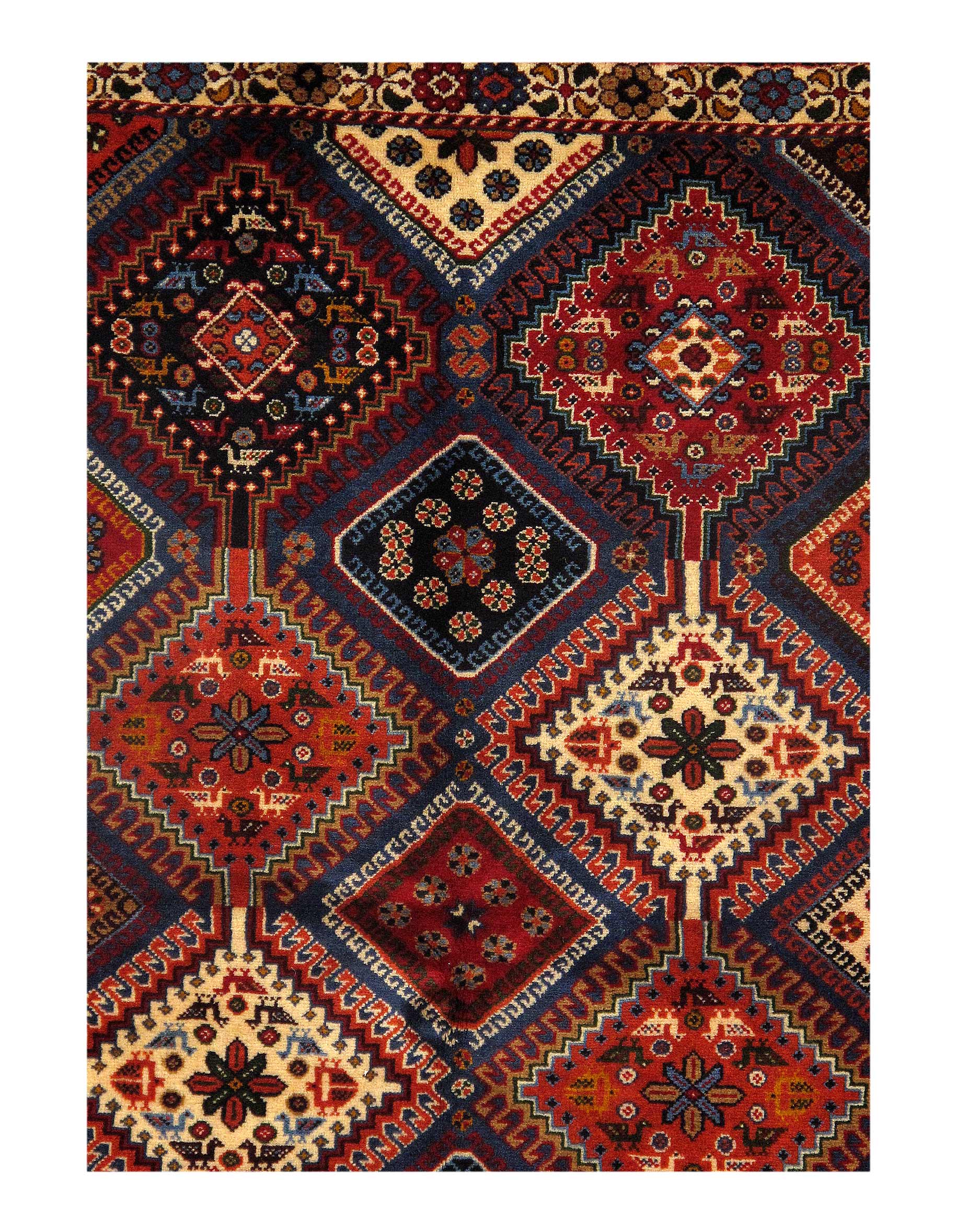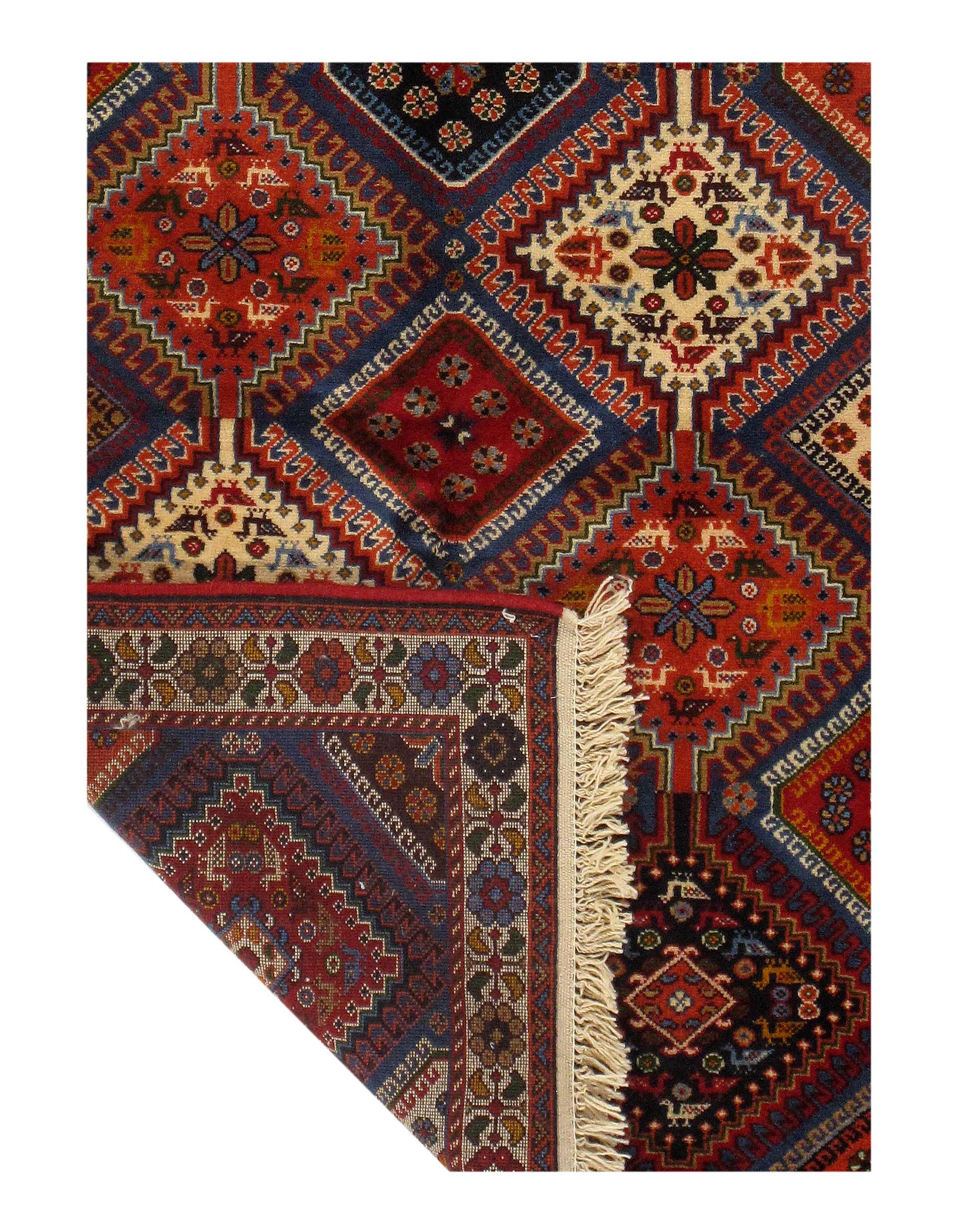 The pile used in Yalameh rugs is very fine, particularly in comparison to other tribal designs, using soft wool based on a Wool foundation. The pattern is distinctive with large repeated diamonds in a straight line down the carpet, often with geometrical animal or human prints scattered across the field. Dark red or light brown on a blue or orange background is most common for Yalameh, similar to Shiraz rugs, the rugs compliment modern or minimalist furniture beautifully, giving the living space an aura of luxurious style and warm.