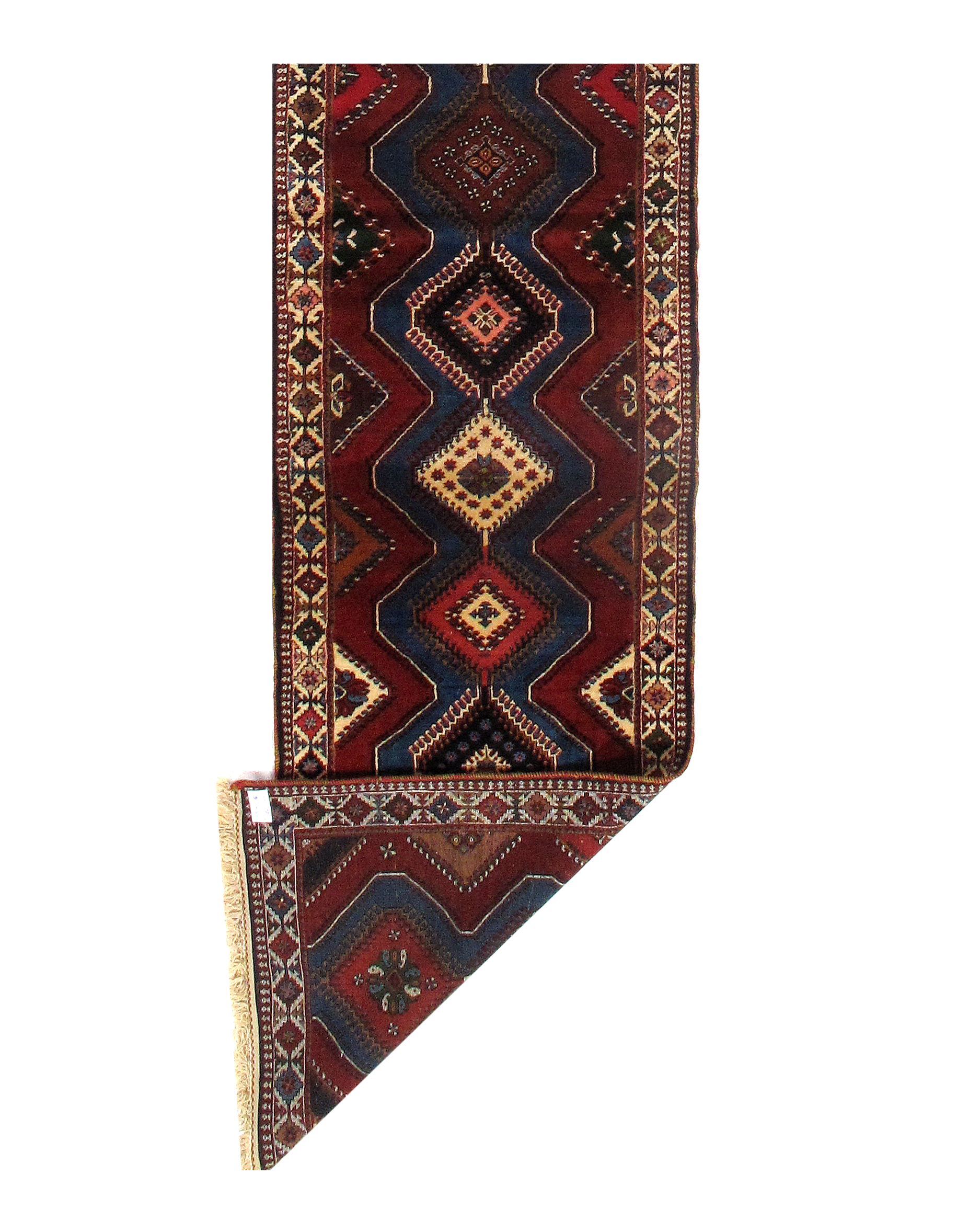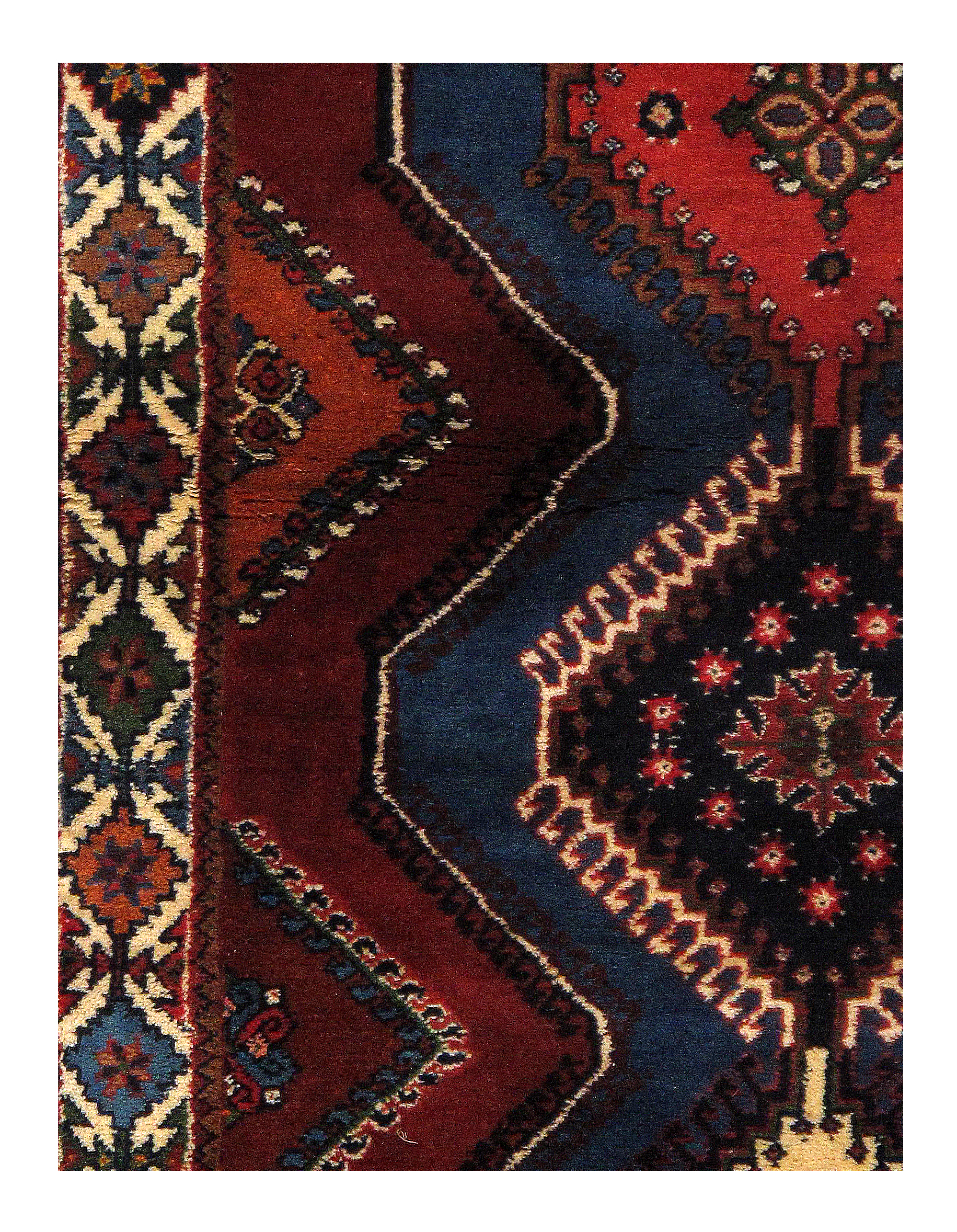 The pile used in Yalameh rugs is very fine, particularly in comparison to other tribal designs, using soft wool based on a Wool foundation. The pattern is distinctive with large repeated diamonds in a straight line down the carpet, often with geometrical animal or human prints scattered across the field. Dark red or light brown on a blue or orange background is most common for Yalameh, similar to Shiraz rugs, the rugs compliment modern or minimalist furniture beautifully, giving the living space an aura of luxurious style and warm.