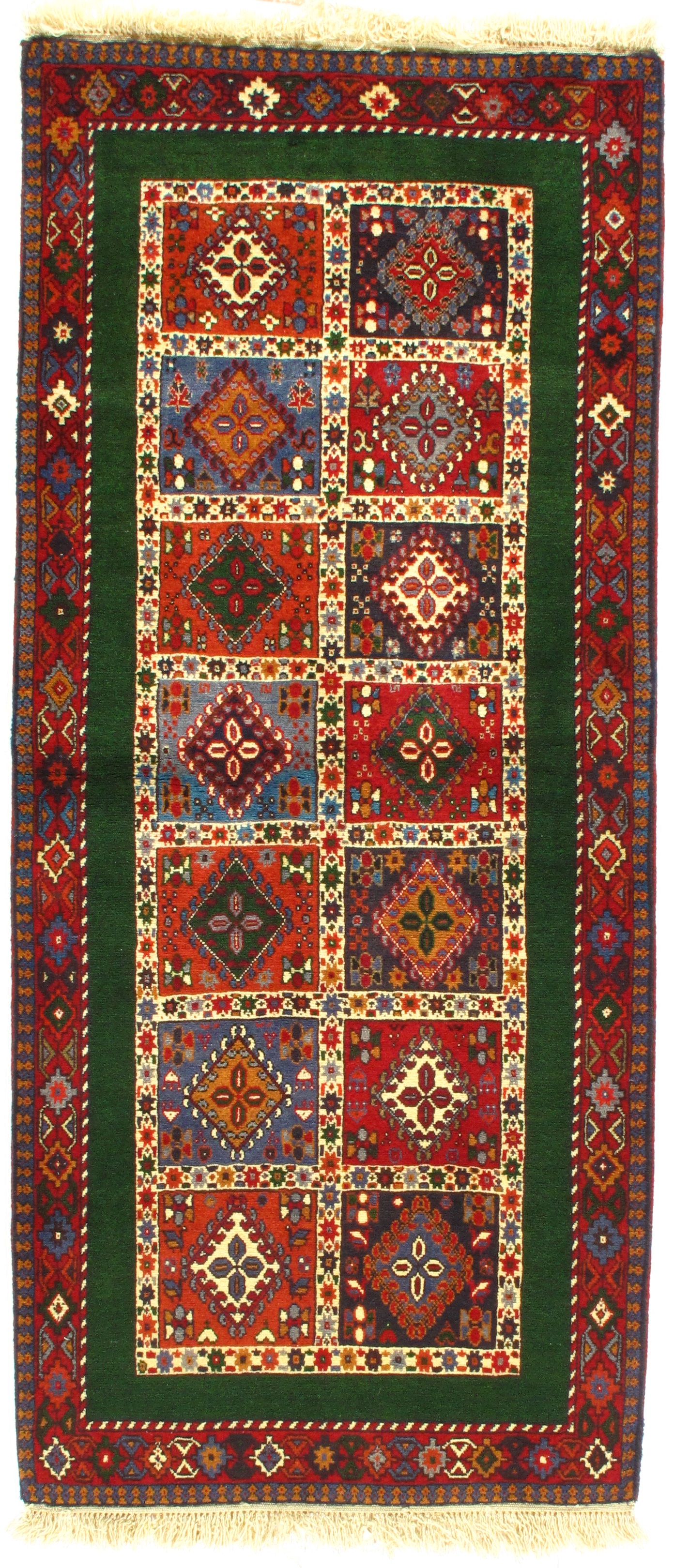 The pile used in Yalameh rugs is very fine, particularly in comparison to other tribal designs, using soft wool based on a Wool foundation. The pattern is distinctive with large repeated diamonds in a straight line down the carpet, often with geometrical animal or human prints scattered across the field. Dark red or light brown on a blue or orange background is most common for Yalameh, similar to Shiraz rugs, the rugs compliment modern or minimalist furniture beautifully, giving the living space an aura of luxurious style and warm.