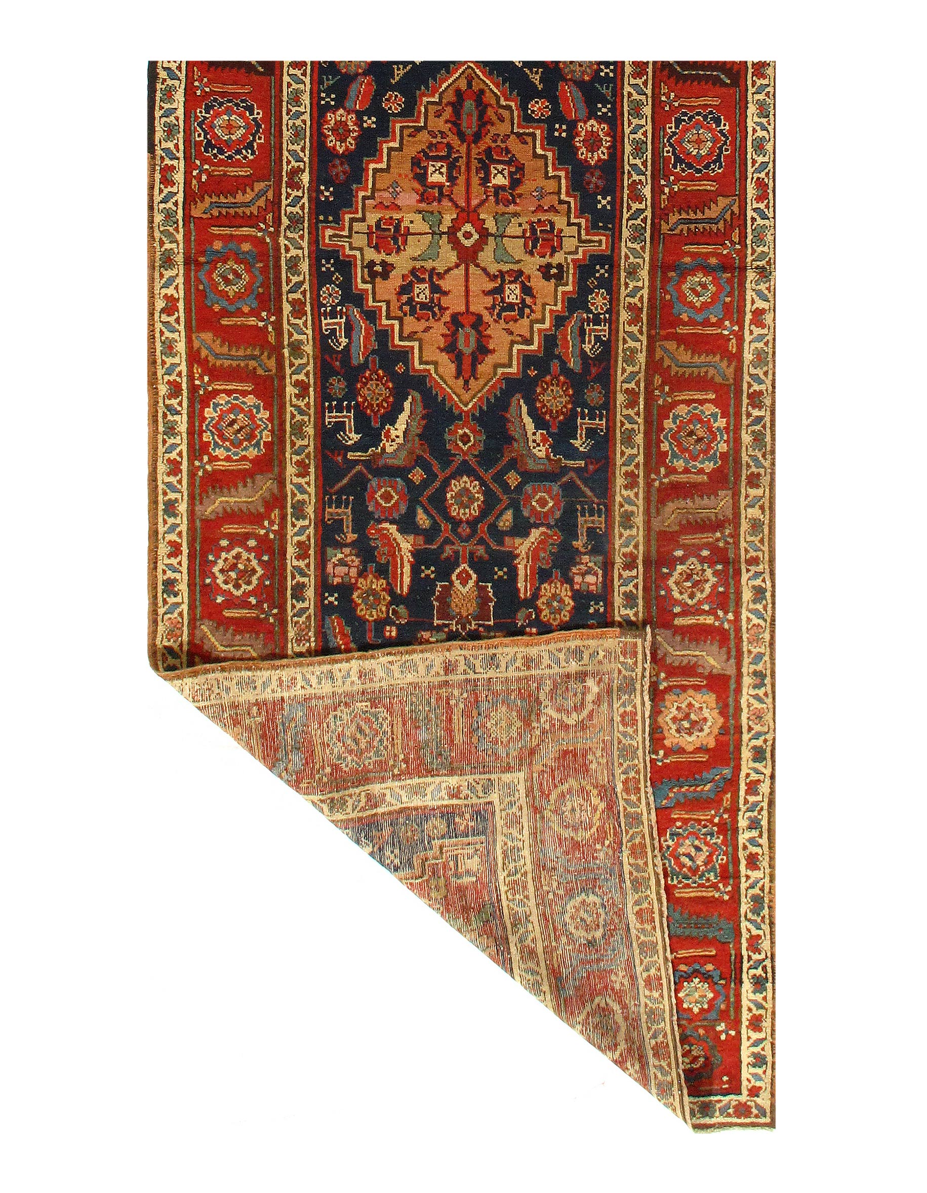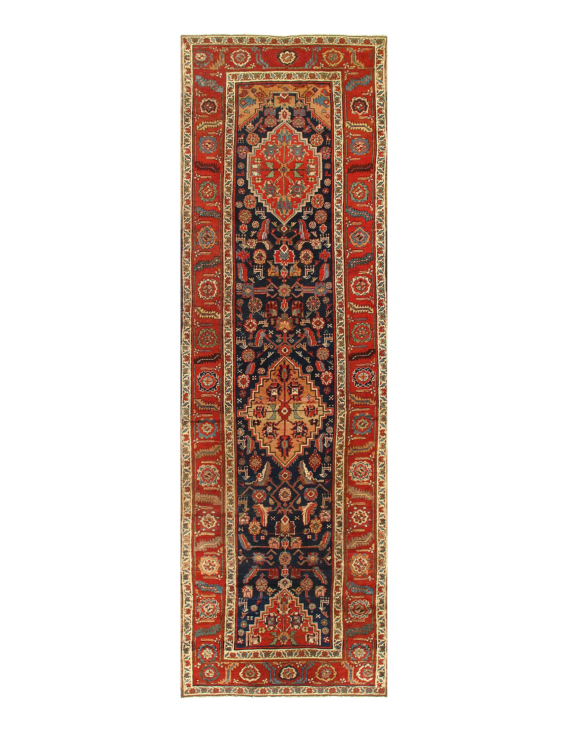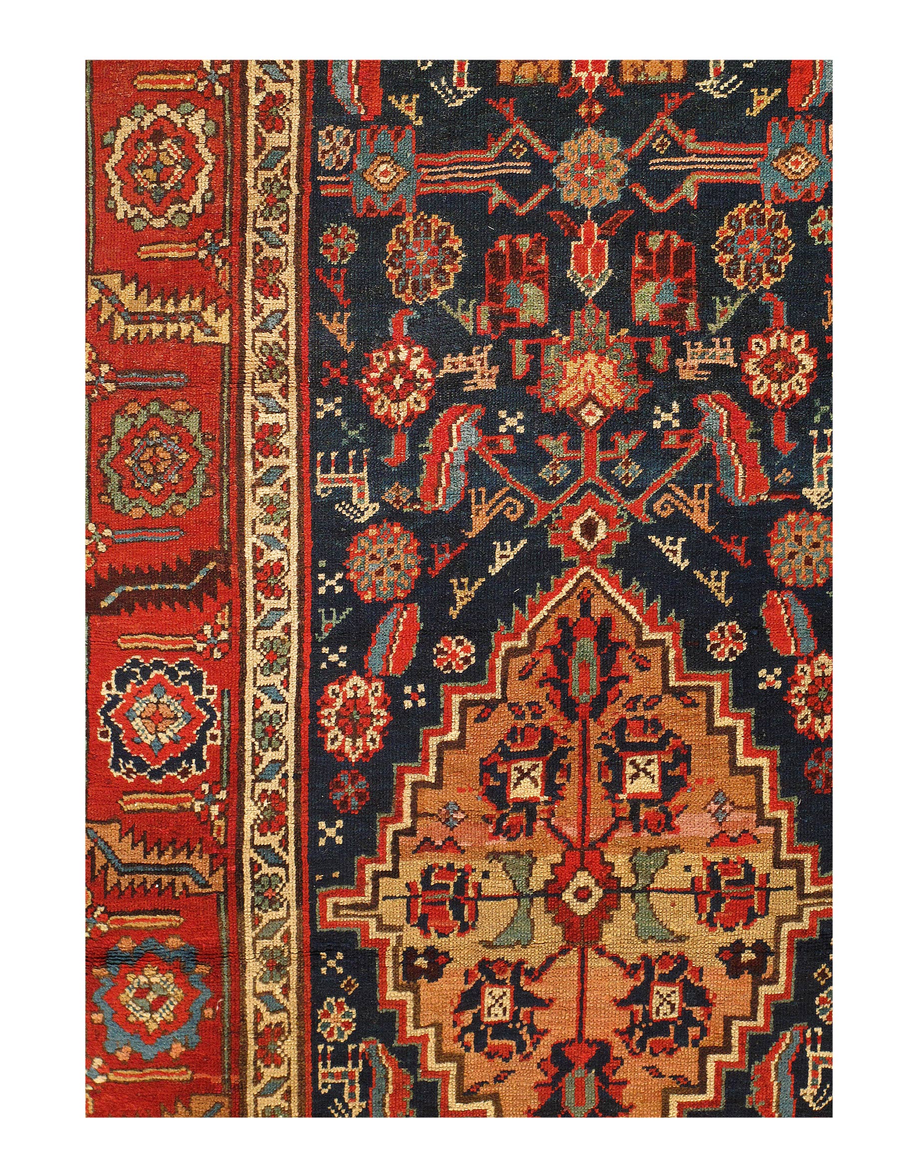 Magnificent Large Blue Garous Design Antique Persian Bidjar Rug D07441, Country of Origin: Persia, Circa Date: 1900’s – The magnificent pattern of this exquisite Persian rug begins with a narrow border resting against a — depiction of elegant and delicately rendered blooms. The flowers and their pale backdrop then give way to deep green overlaid with a deep red and gold, the form of which recall swirling flame. A second display of artful flowers cedes to a thin inner border breathtaking in its fine detail. This border frames the stunning array that forms the heart of this piece. The complexity of the pattern, the strict geometry and flawless structure, becomes increasingly apparent, ever more breathtaking, the longer one studies it. Depictions of flowers, trees, and other forms are captivating in their delicateness. Yet these soft, flowing, seemingly whimsical designs are deceptive, for they form the core of a masterful structure that boasts perfect symmetry. This superb antique Persian Bidjar rug is a sophisticated work of art.