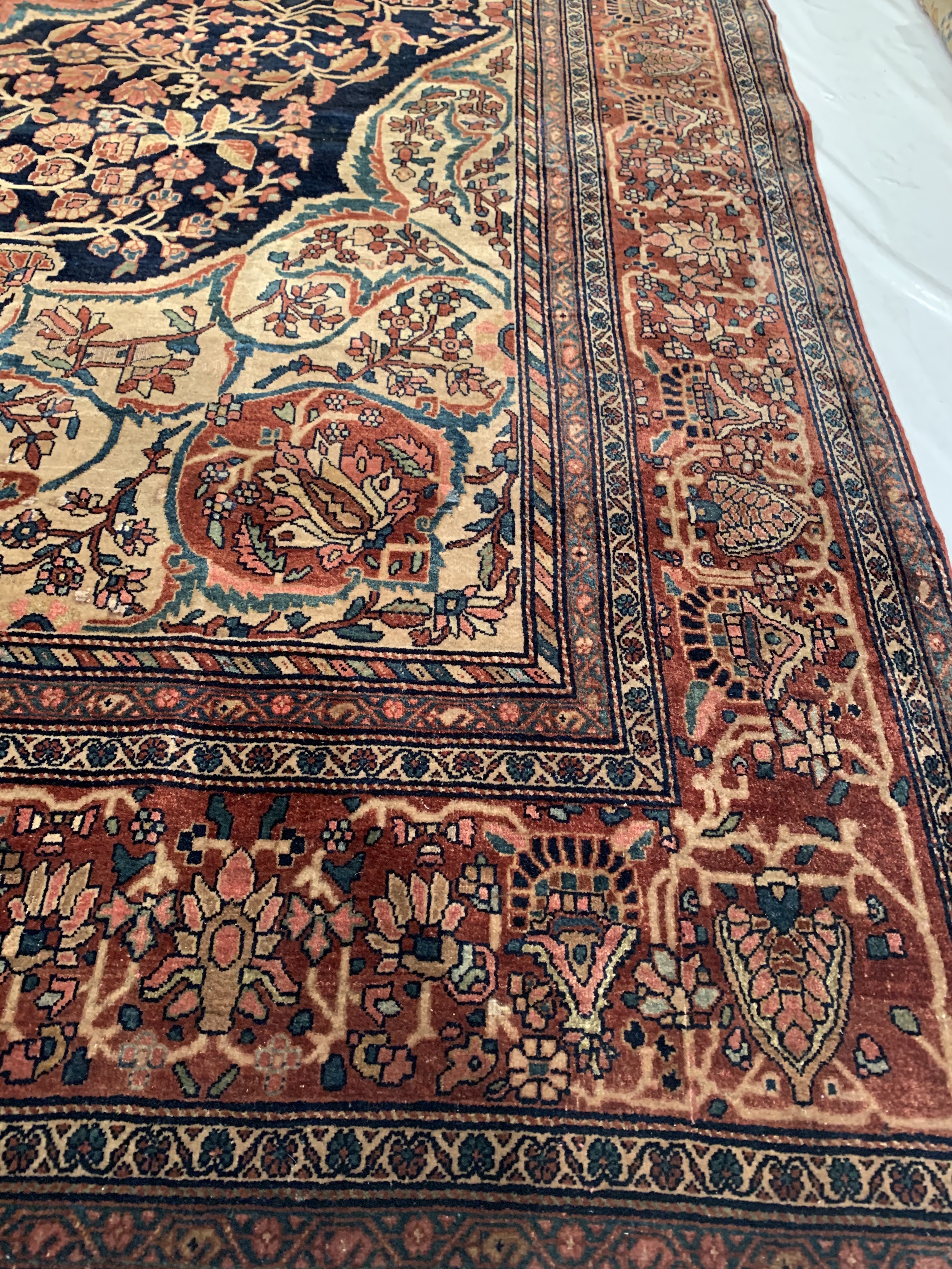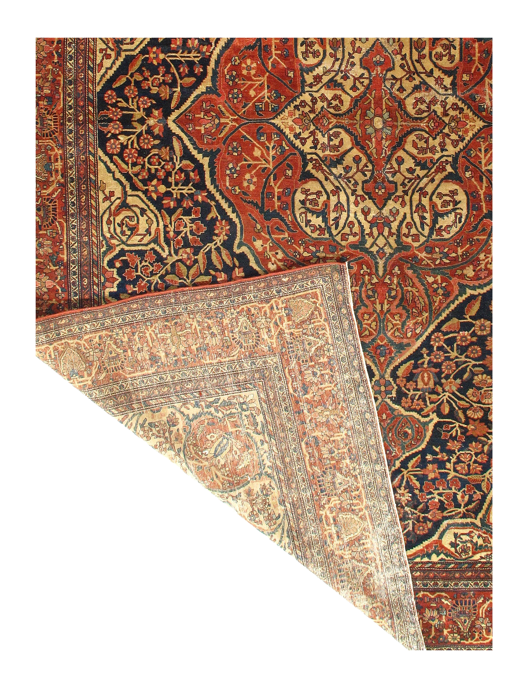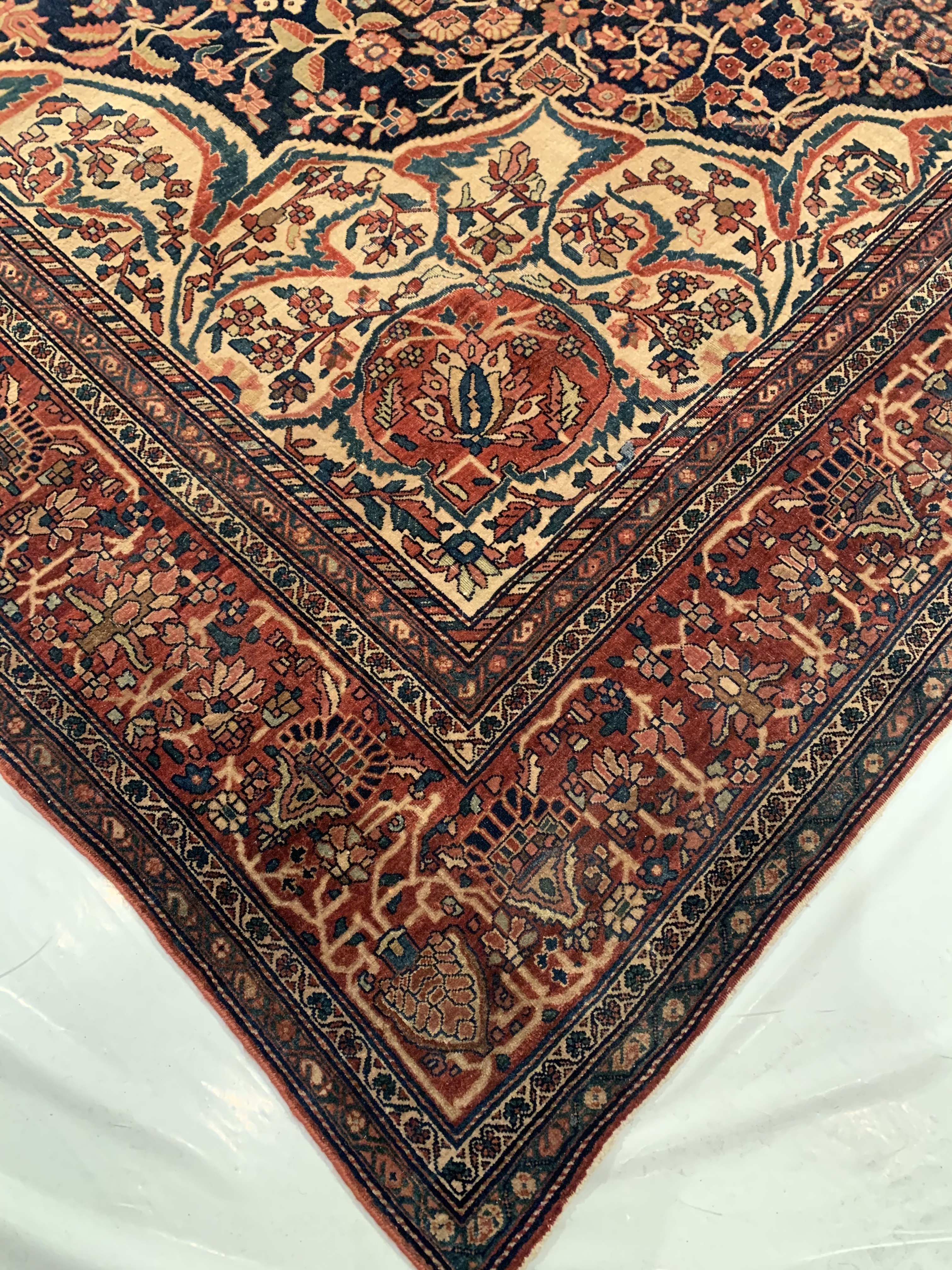 beautiful antique Persian Sarouk Farahan rugs, this masterpiece rug uses bold colors and minute details to provide the viewer with a veritable feast for the eyes. Floral shapes and dancing petals abound in this antique area rug, elegantly leading the viewer from one section of the antique oriental rug to the next in a graceful dance of activity. Several smaller borders frame around the largest one, resulting in an outlining effect that adds intrigue to the motifs present at the foreground. At the central field of the Persian rug, the bordering effect is made all the more noticeable and visually pleasing through a diagonal presentation of lines that stands out against the rectangular borders.