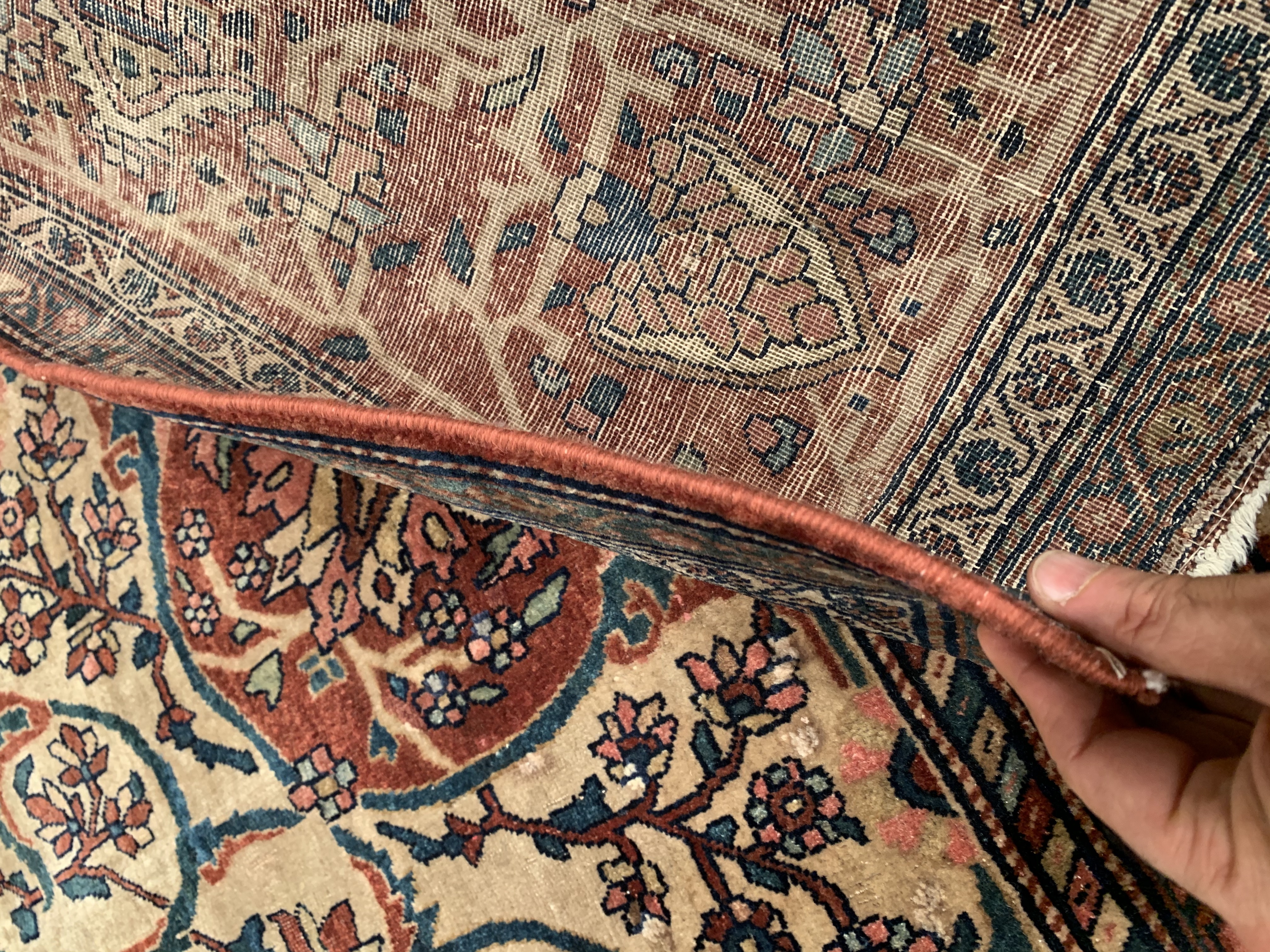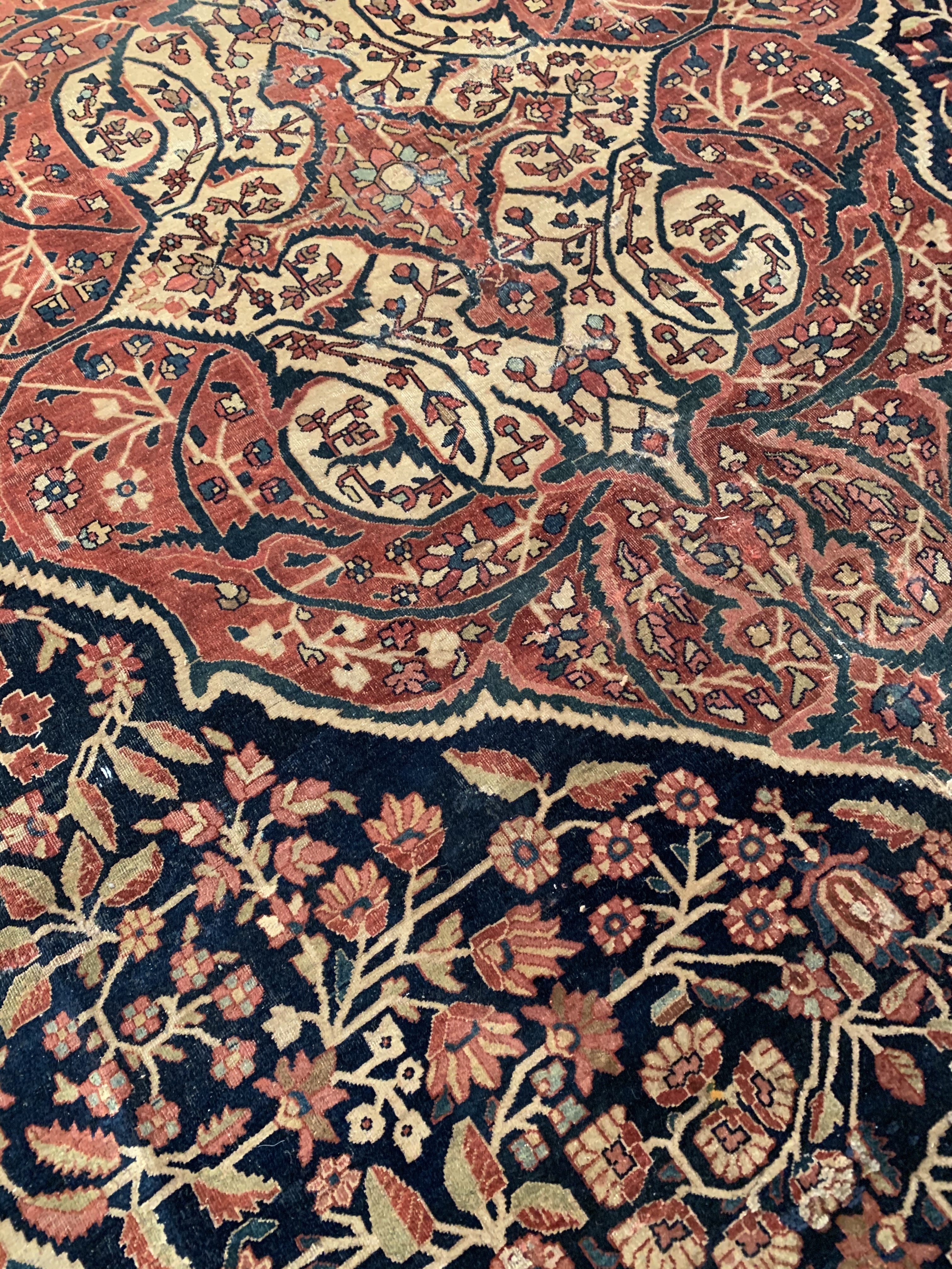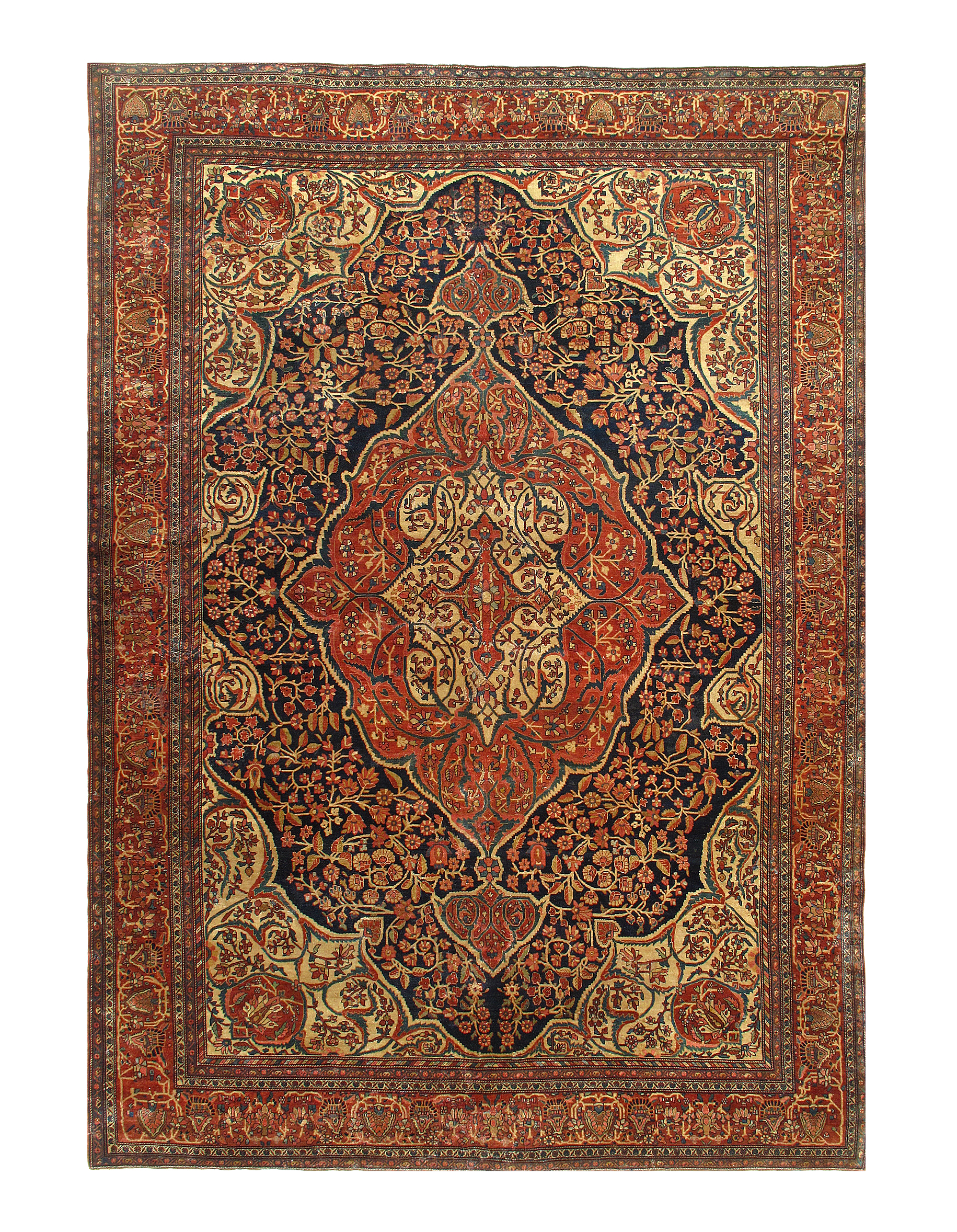 beautiful antique Persian Sarouk Farahan rugs, this masterpiece rug uses bold colors and minute details to provide the viewer with a veritable feast for the eyes. Floral shapes and dancing petals abound in this antique area rug, elegantly leading the viewer from one section of the antique oriental rug to the next in a graceful dance of activity. Several smaller borders frame around the largest one, resulting in an outlining effect that adds intrigue to the motifs present at the foreground. At the central field of the Persian rug, the bordering effect is made all the more noticeable and visually pleasing through a diagonal presentation of lines that stands out against the rectangular borders.