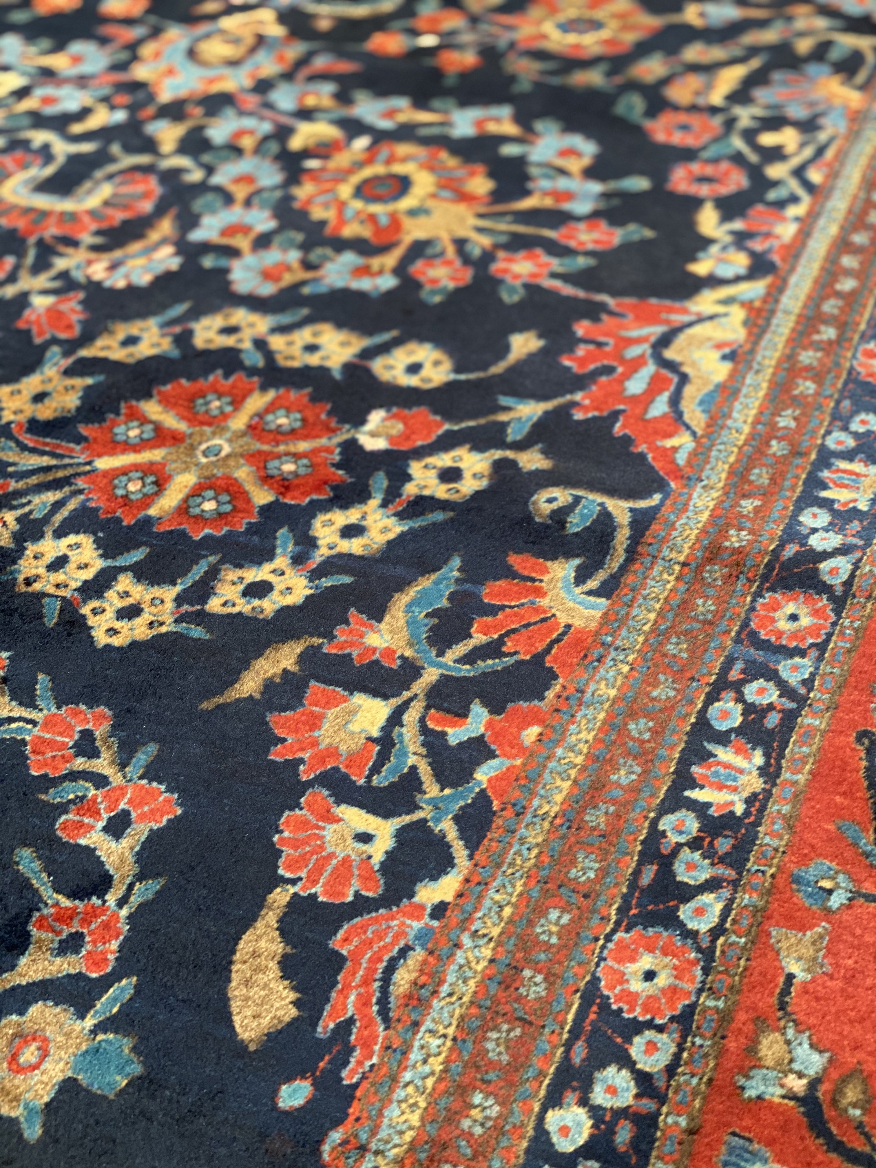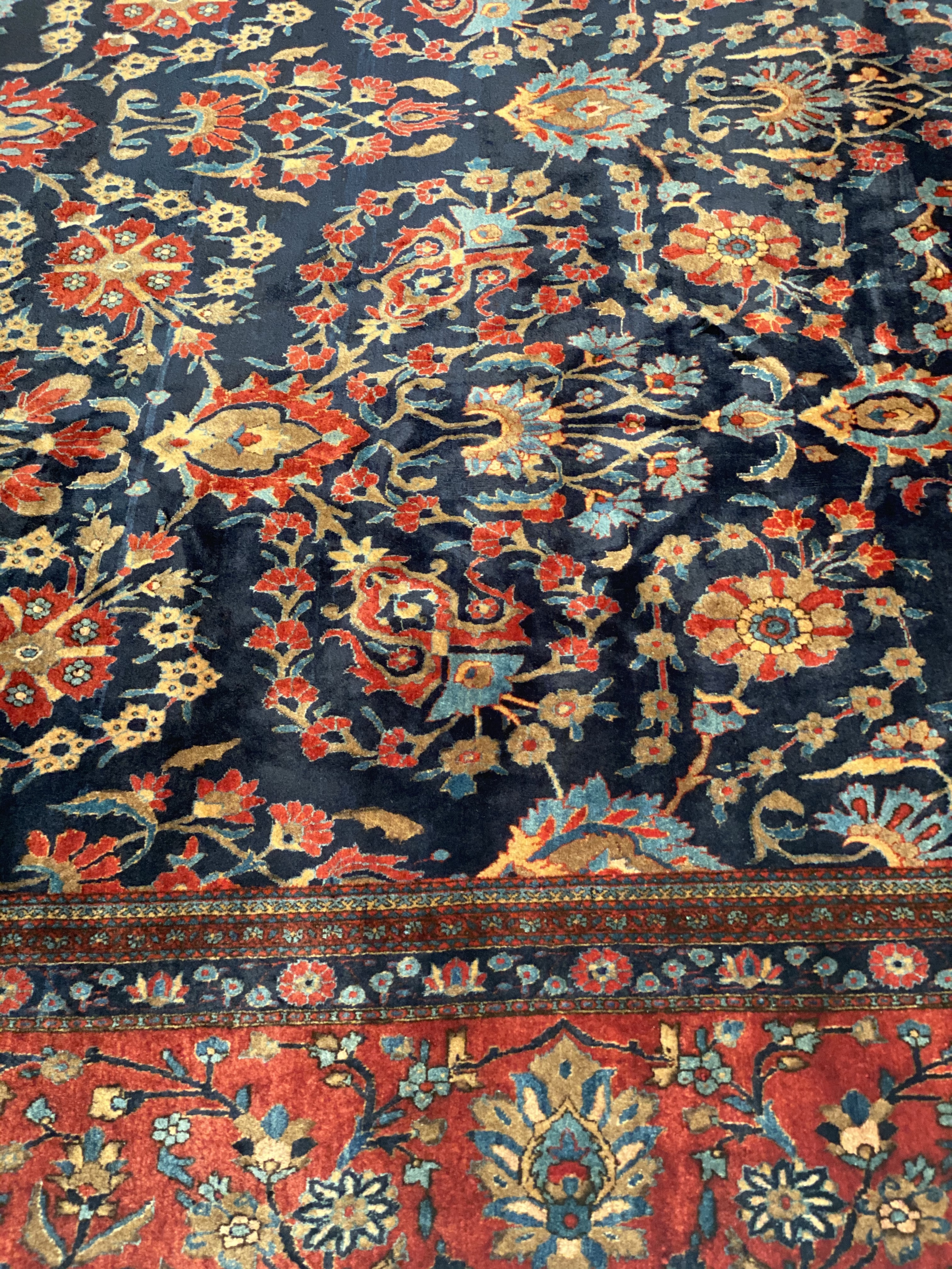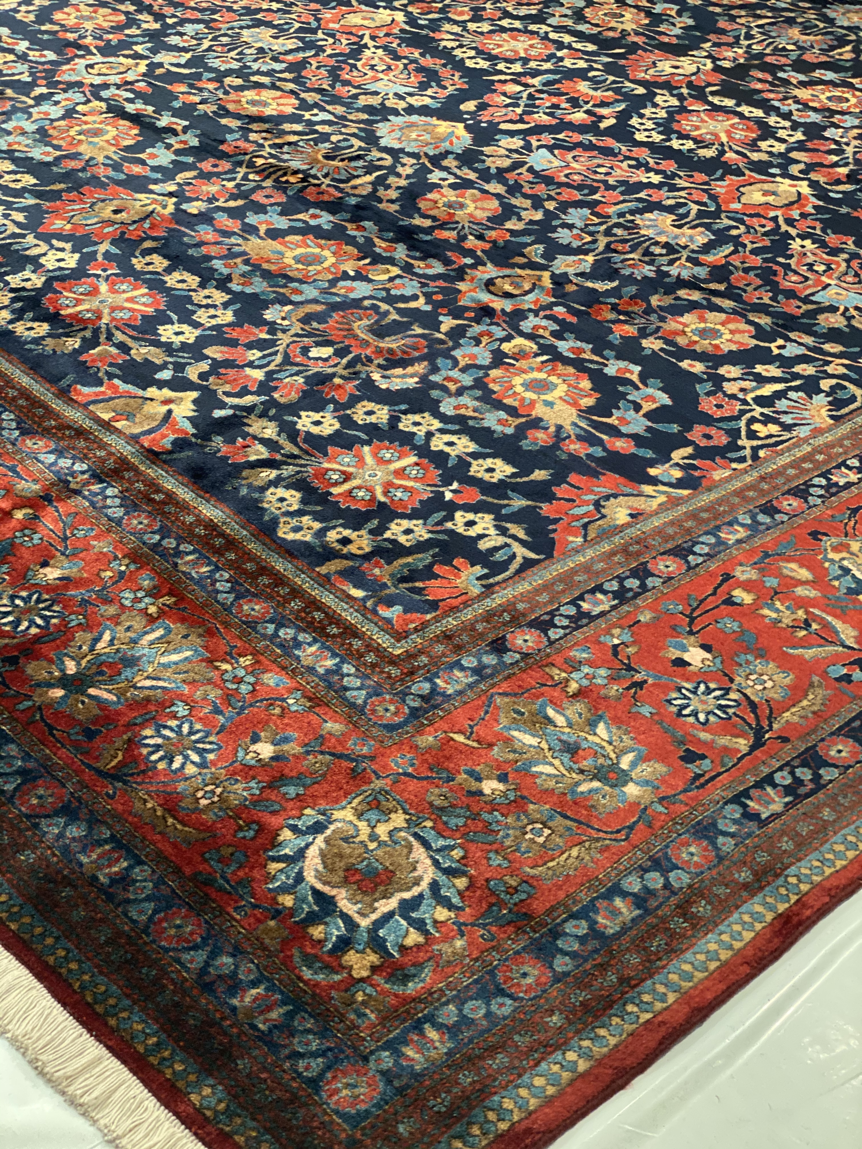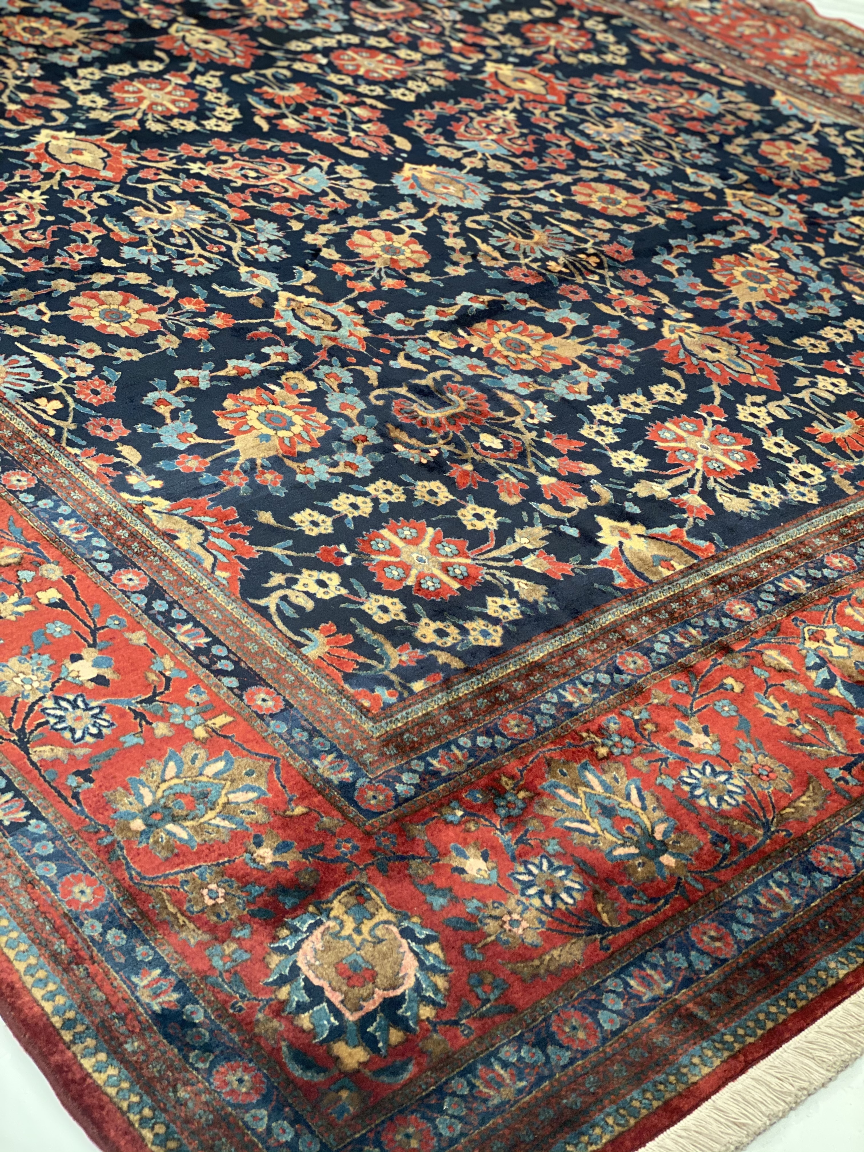 This magnificent antique Persian Kashan has a striking allover design of spiraled vinescrolls. The patterning is cleverly arranged so that the vines seem to suggest a latent circular or crown-shaped medallions. A palmette vinescroll makes up the main border, set against a red ground that contrasts with the deep navy ground of the field, reinforcing a framing of effect for the entire composition. The saturated brilliance of the color is matched by the lustrous velvety quality of the wool pile in the classic Kashan tradition.