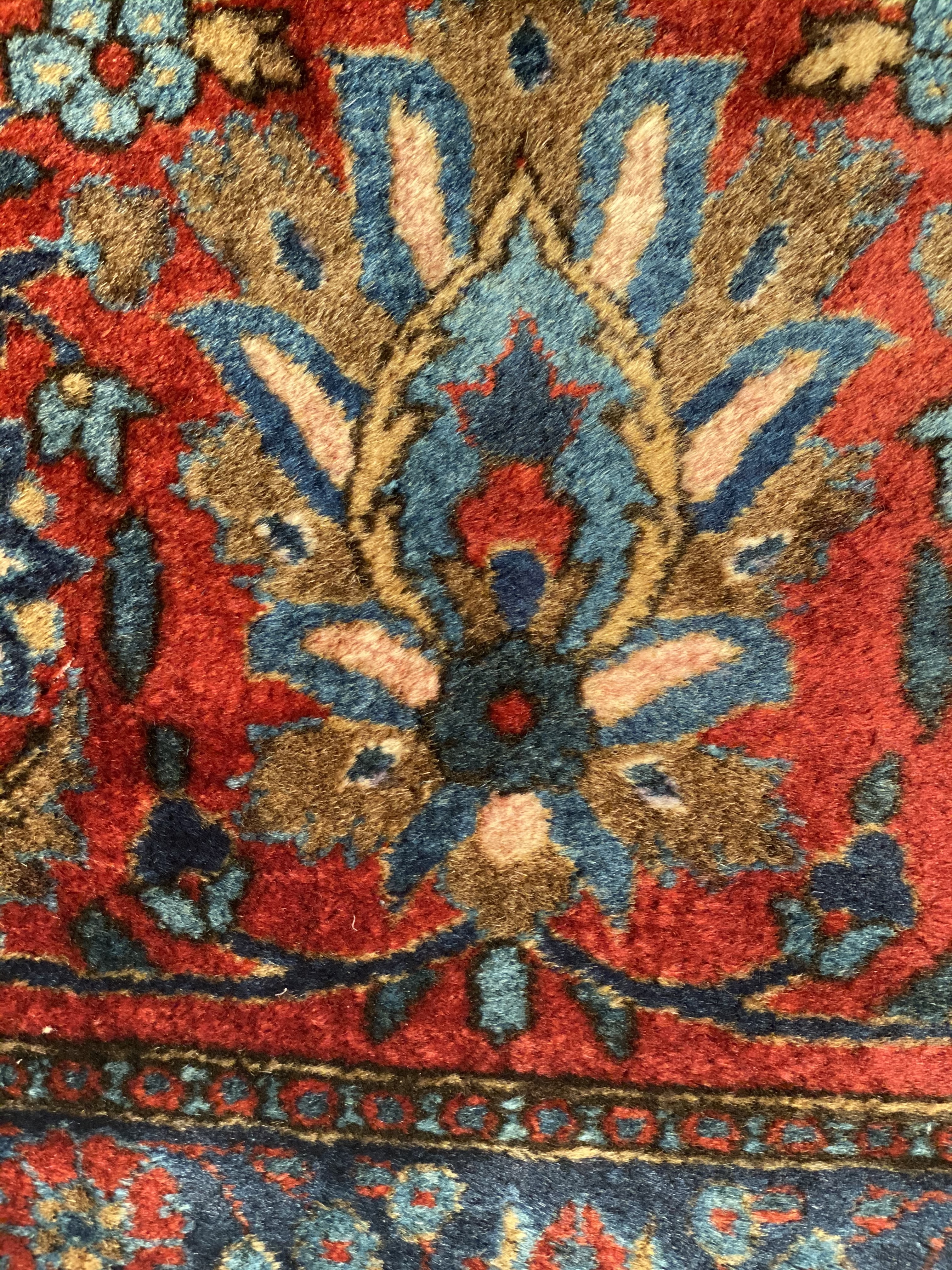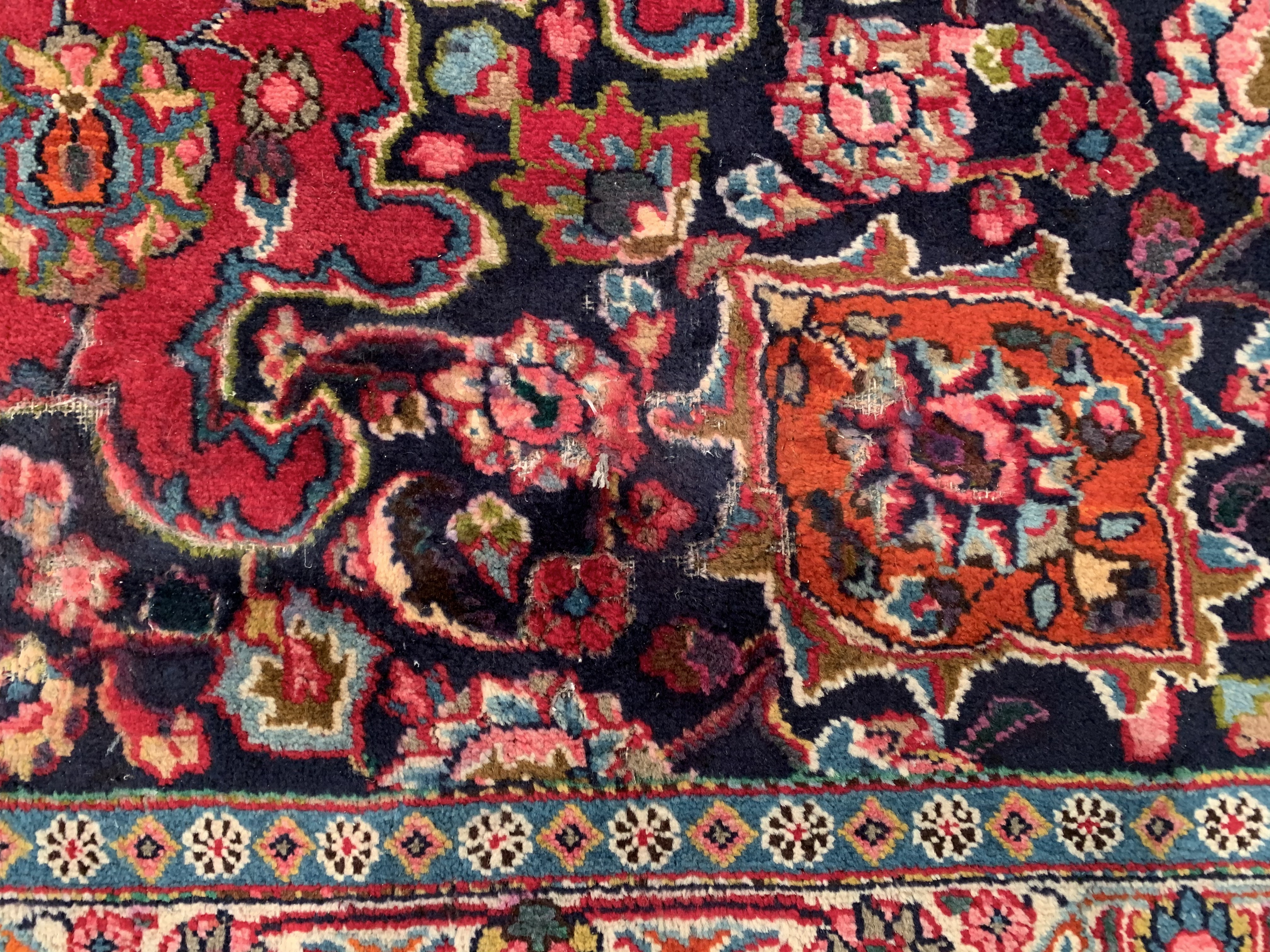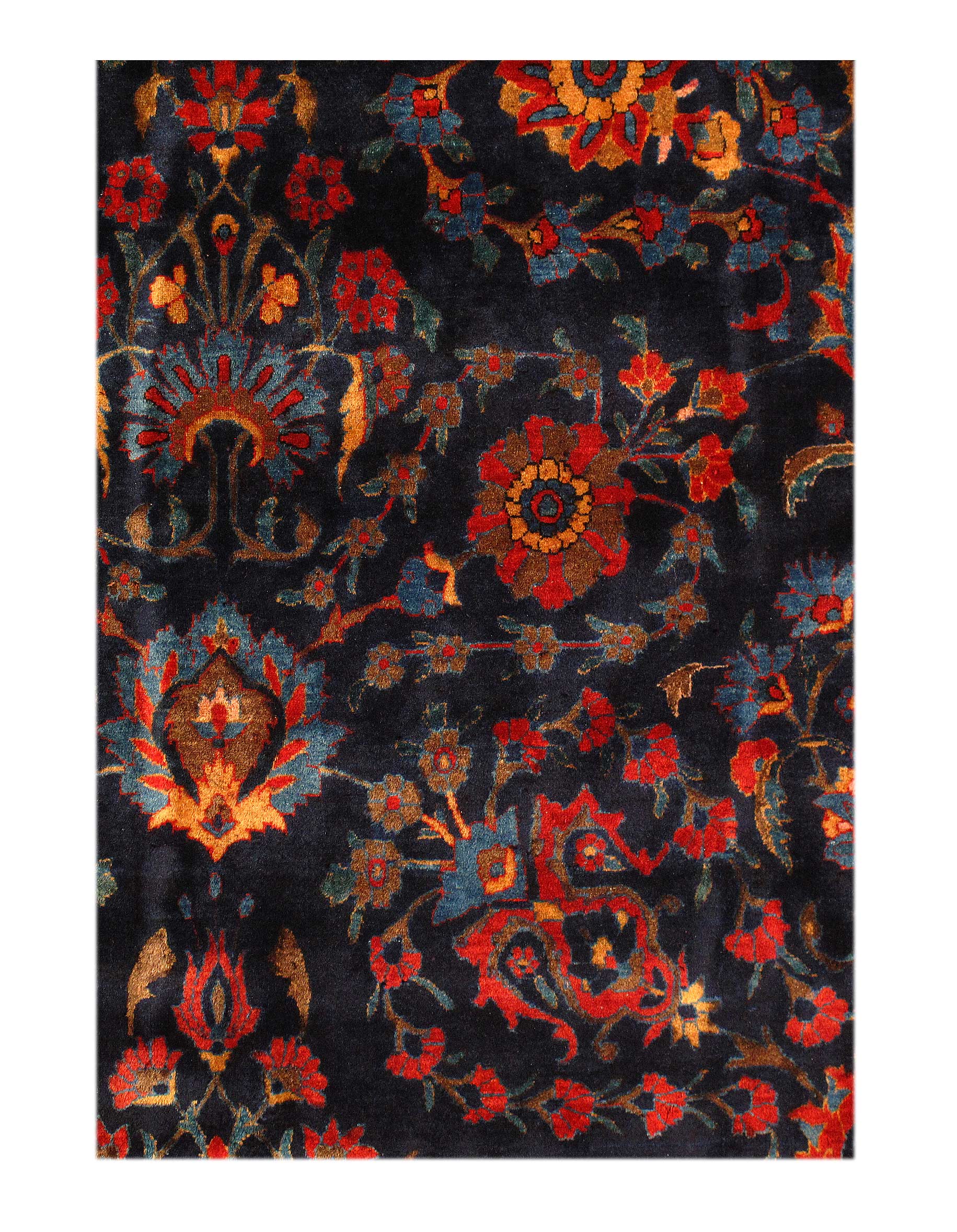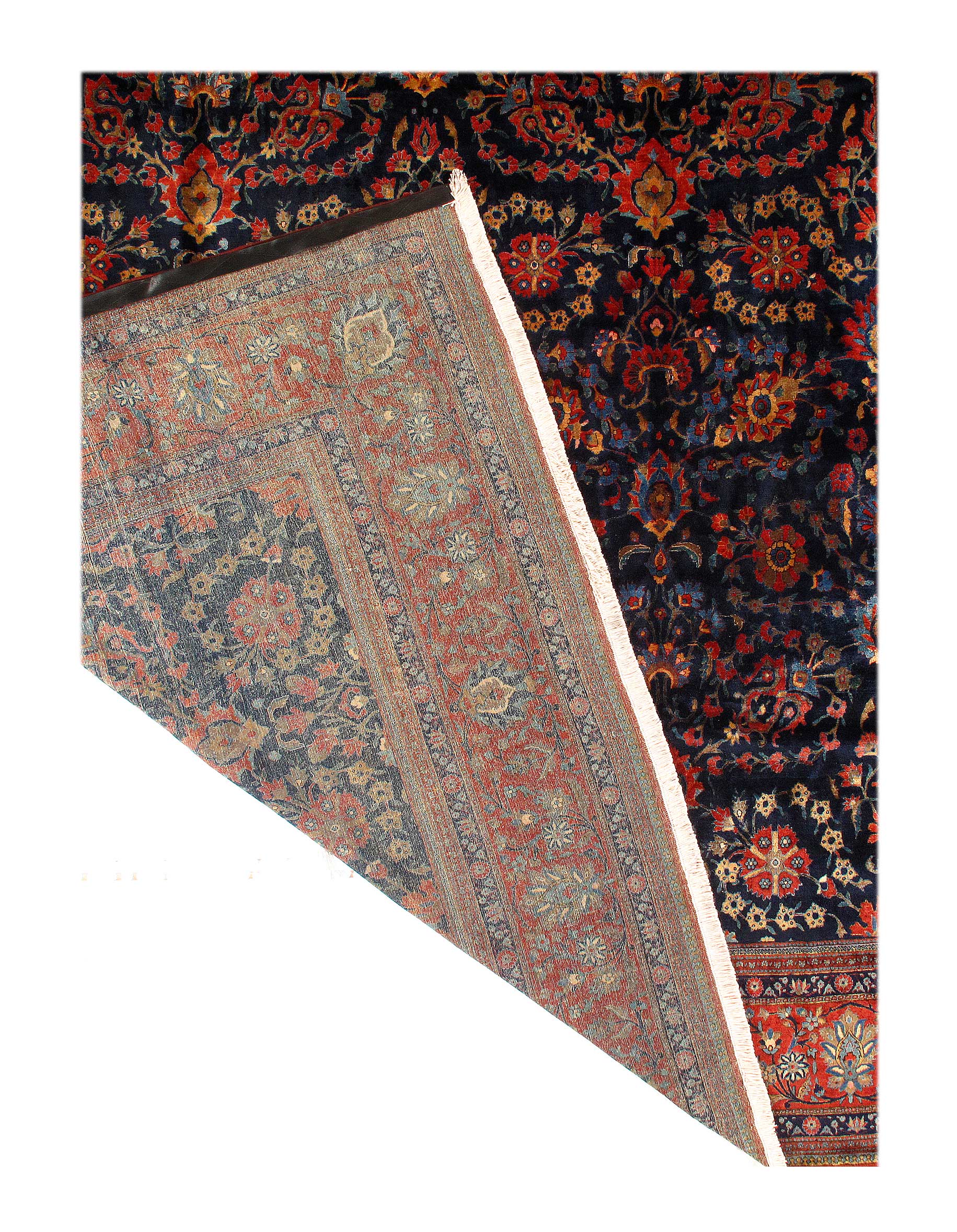 This magnificent antique Persian Kashan has a striking allover design of spiraled vinescrolls. The patterning is cleverly arranged so that the vines seem to suggest a latent circular or crown-shaped medallions. A palmette vinescroll makes up the main border, set against a red ground that contrasts with the deep navy ground of the field, reinforcing a framing of effect for the entire composition. The saturated brilliance of the color is matched by the lustrous velvety quality of the wool pile in the classic Kashan tradition.
