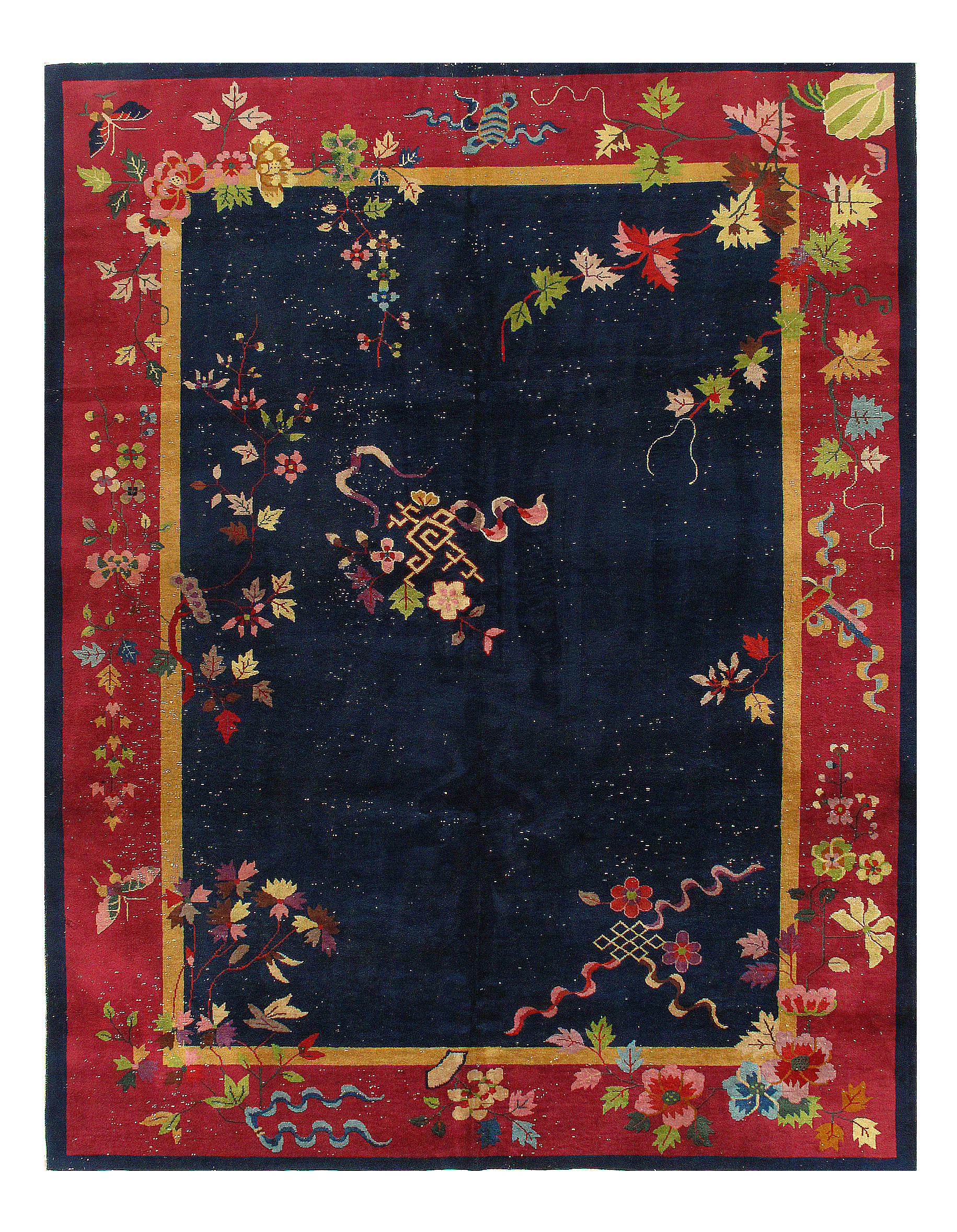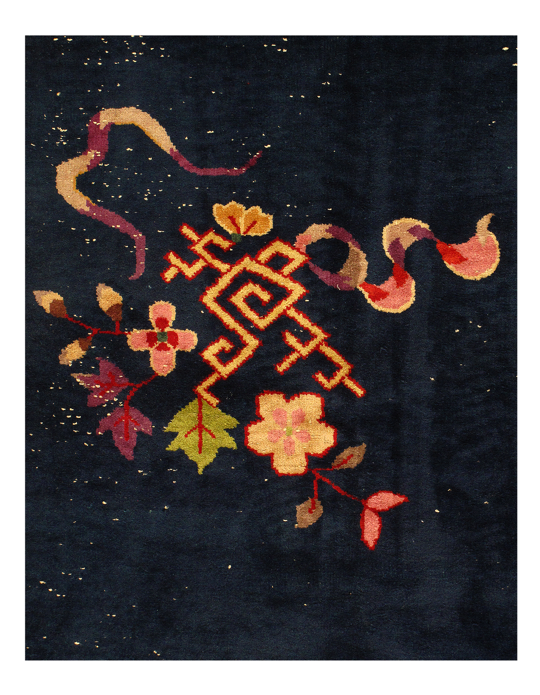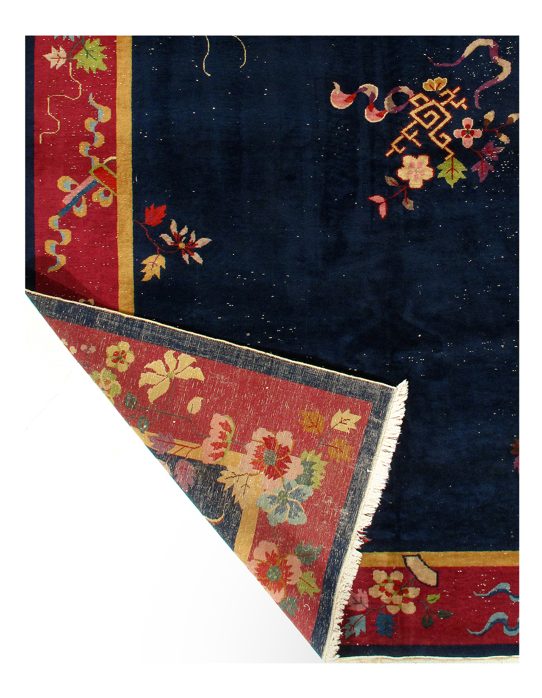 Chinese Deco Rug, Origin: China, Circa: Early 20th Century β Here is an exciting and appealing antique Oriental carpet β an antique Art Deco rug that was designed and woven in China during the early years of the twentieth century. Heavily informed by the aesthetic inclinations of the Art Deco period, this unique carpet is a compelling and thought-provoking example. A scalloped border of Rust encloses a Blue sand field on this exquisitely subtle and restrained antique Chinese Art Deco. At first the field appears empty or open, but it is actually covered by a tone-on-tone design of scrolls and cloud-bands emanating inward from the outer edges. In their sinuous rhythms they echo the scalloped forms of the border and continue its visual effects across the carpet in a more subdued manner. This carpet testifies to the masterful design sensibilities of Chinese weavers as they made the transition into the modern world. The Art Deco movement had an outside influence on the world of art and design, and some of the most important qualities and characteristics of that movement may be found in this fine rug.