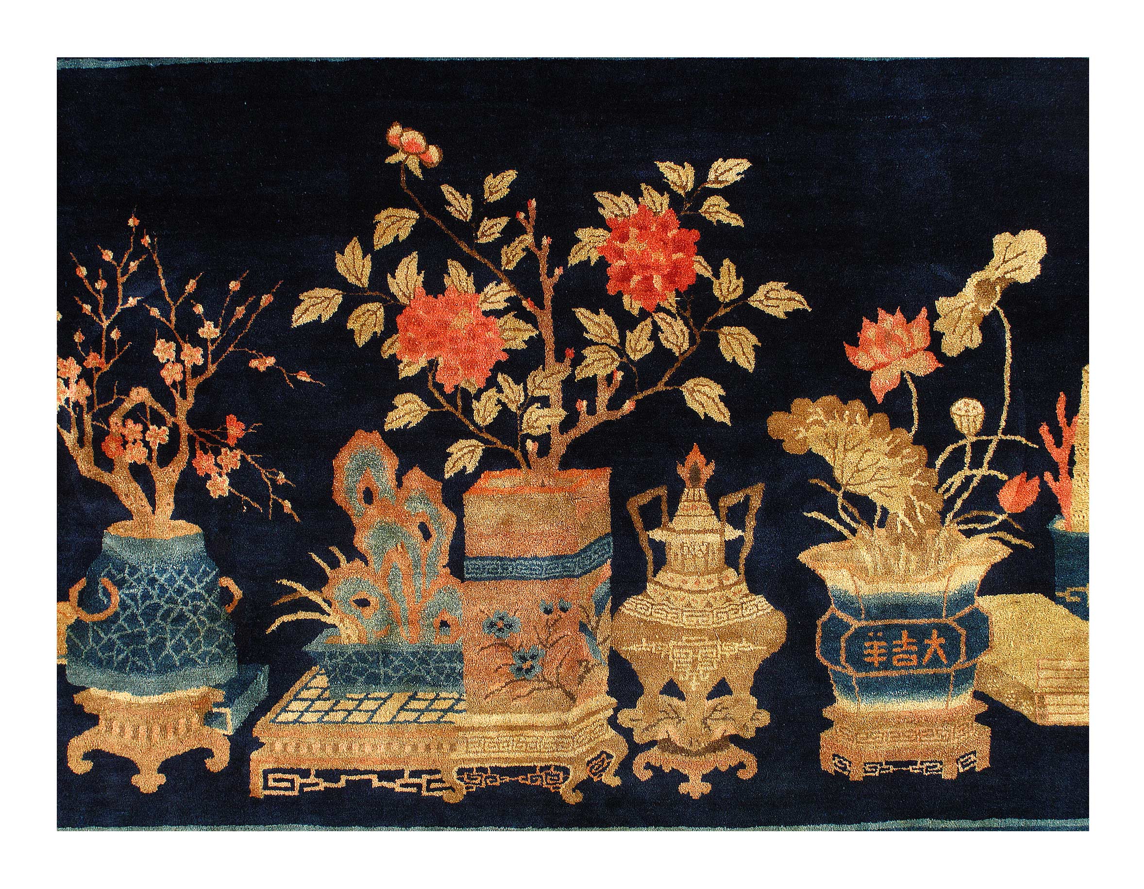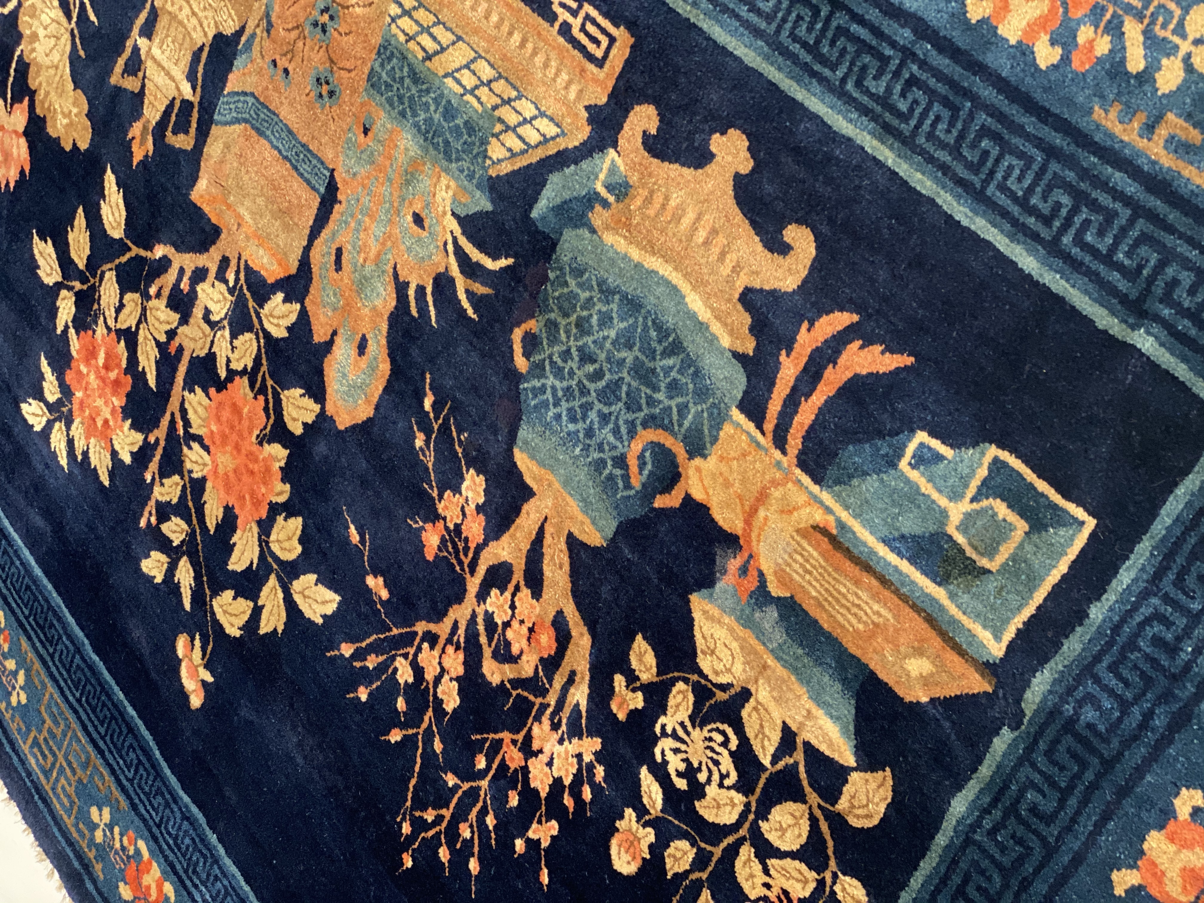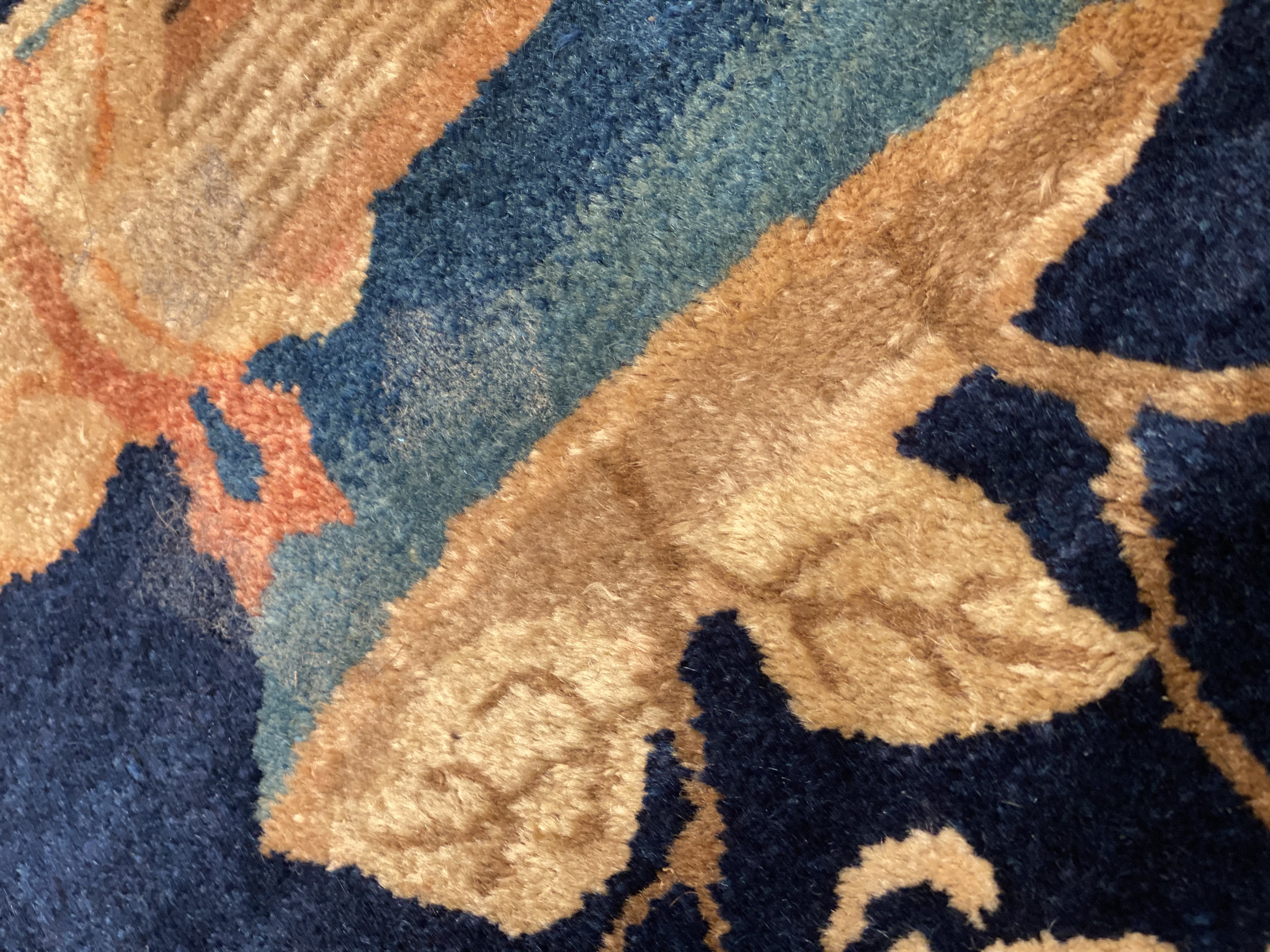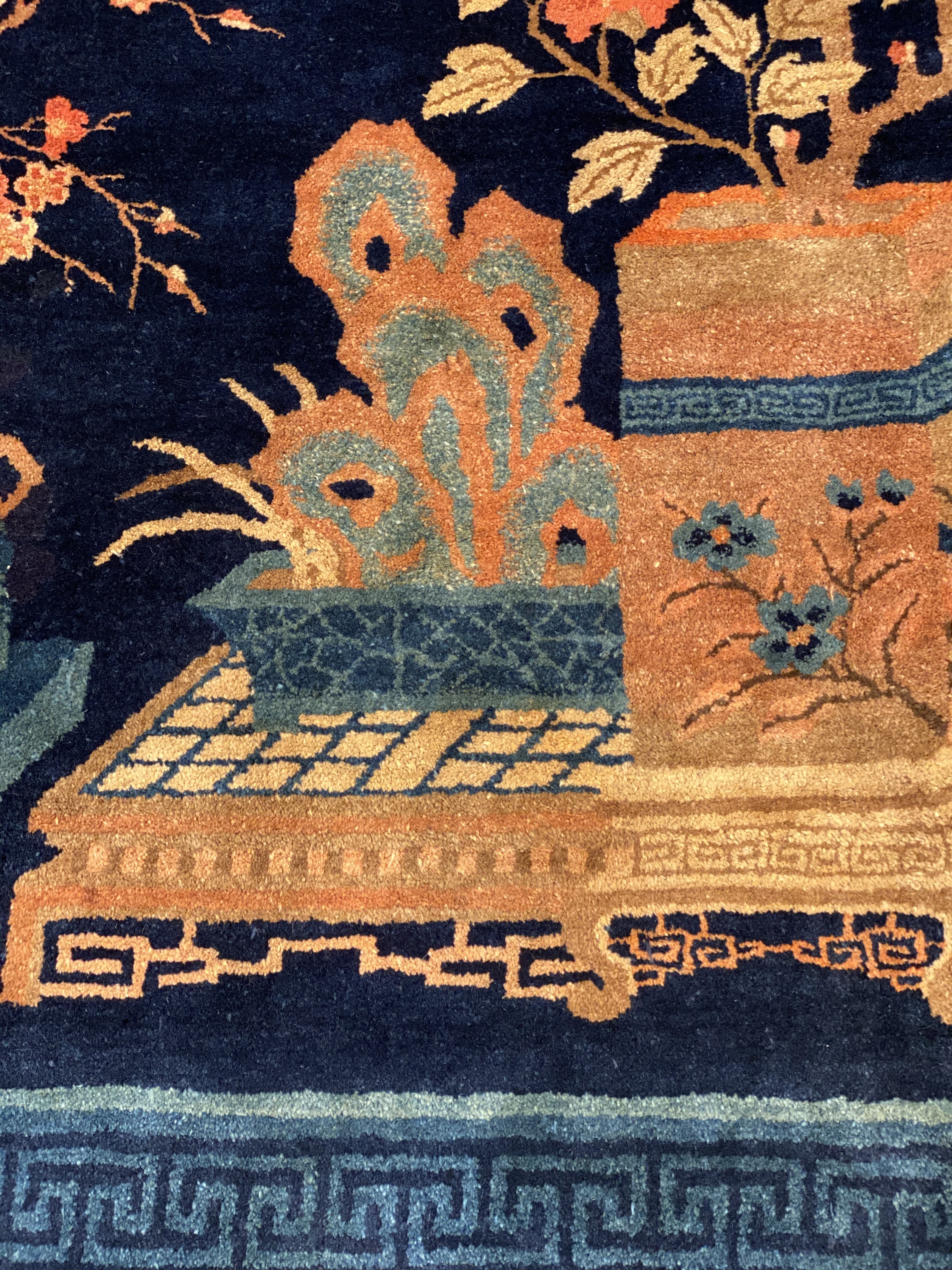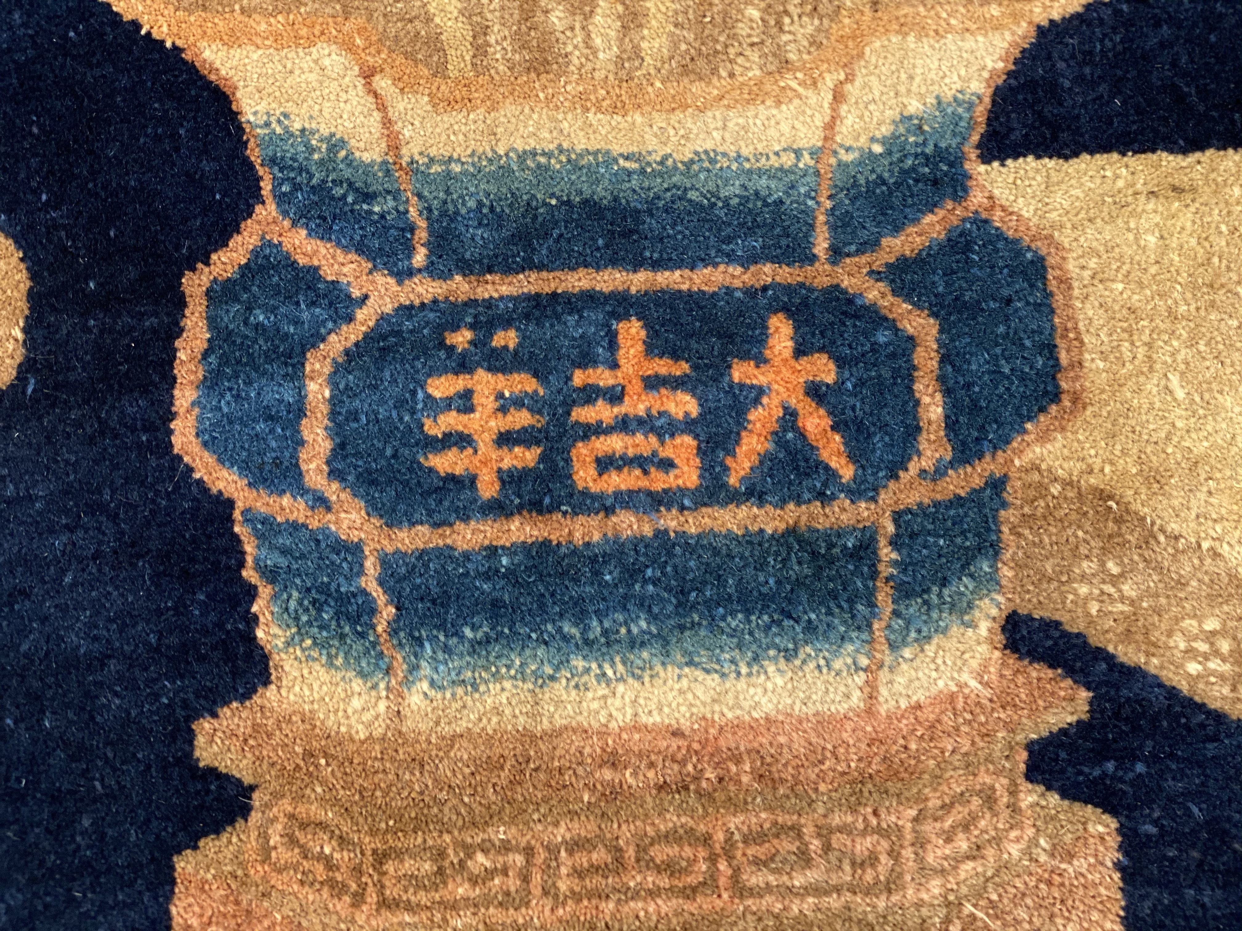 Antique Chinese Deco Rug, Origin: China, Circa: Early 20th Century – Here is an exciting and appealing antique Oriental carpet – an antique Art Deco rug that was designed and woven in China during the early years of the twentieth century. Heavily informed by the aesthetic inclinations of the Art Deco period, this unique carpet is a compelling and thought-provoking example. A scalloped Purple encloses a Light Green sand field on this exquisitely subtle and restrained antique Chinese Art Deco. At first the field appears empty or open, but it is actually covered by a tone-on-tone design of scrolls and cloud-bands emanating inward from the outer edges. In their sinuous rhythms they echo the scalloped forms of the border and continue its visual effects across the carpet in a more subdued manner. This carpet testifies to the masterful design sensibilities of Chinese weavers as they made the transition into the modern world. The Art Deco movement had an outside influence on the world of art and design, and some of the most important qualities and characteristics of that movement may be found in this fine small rug.