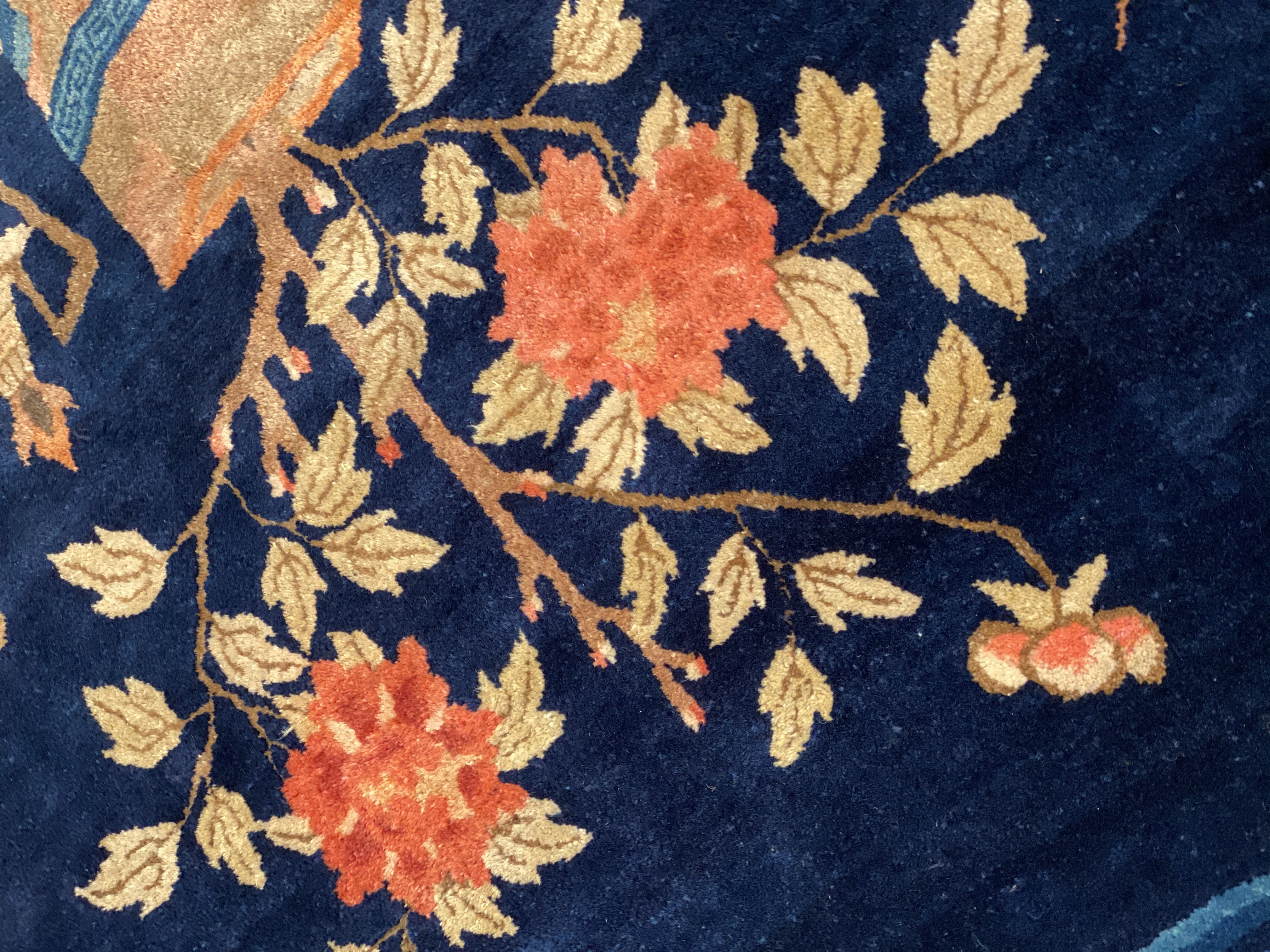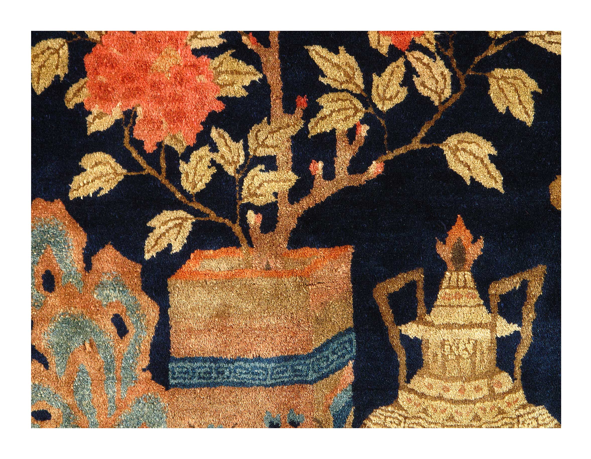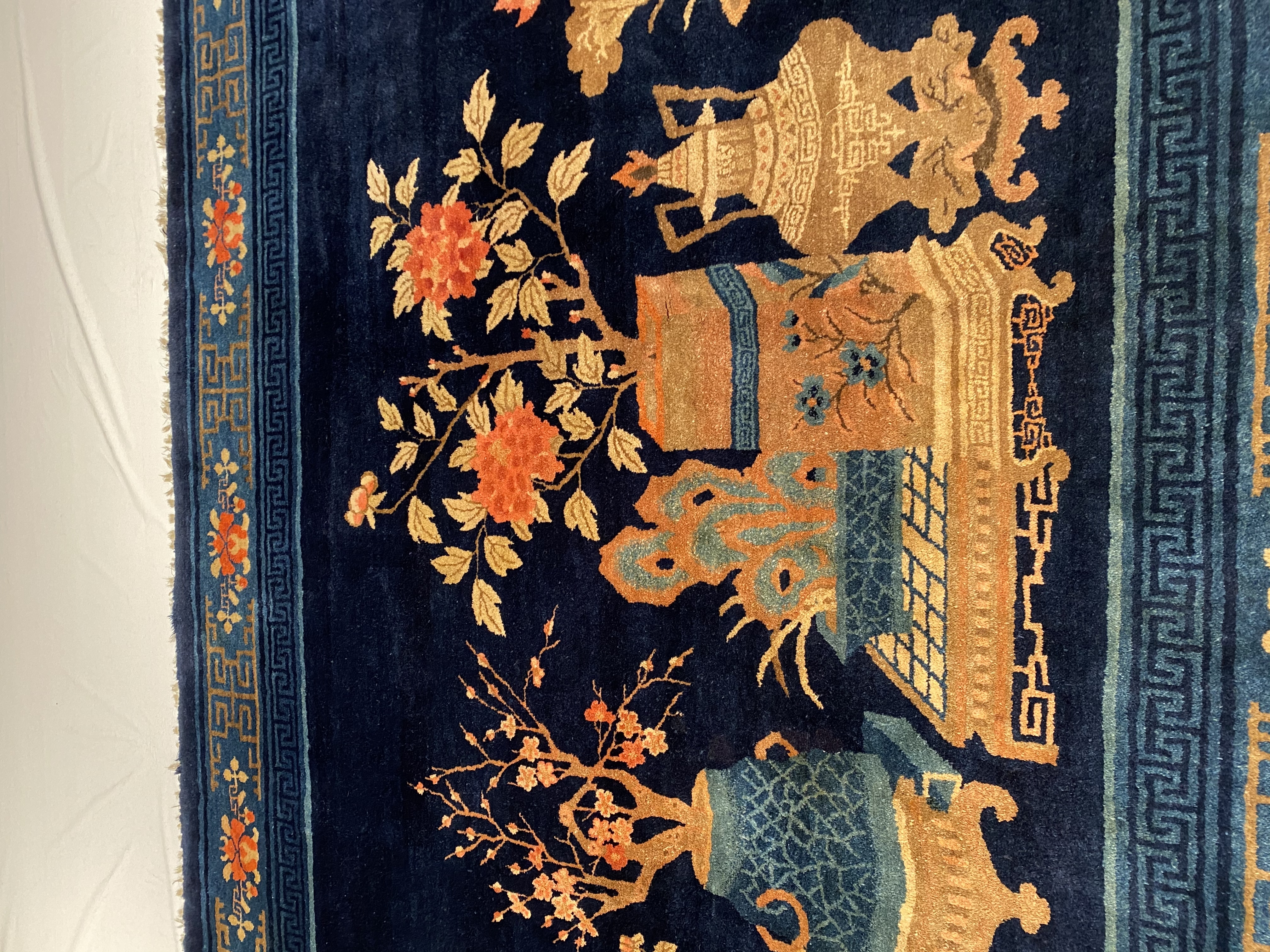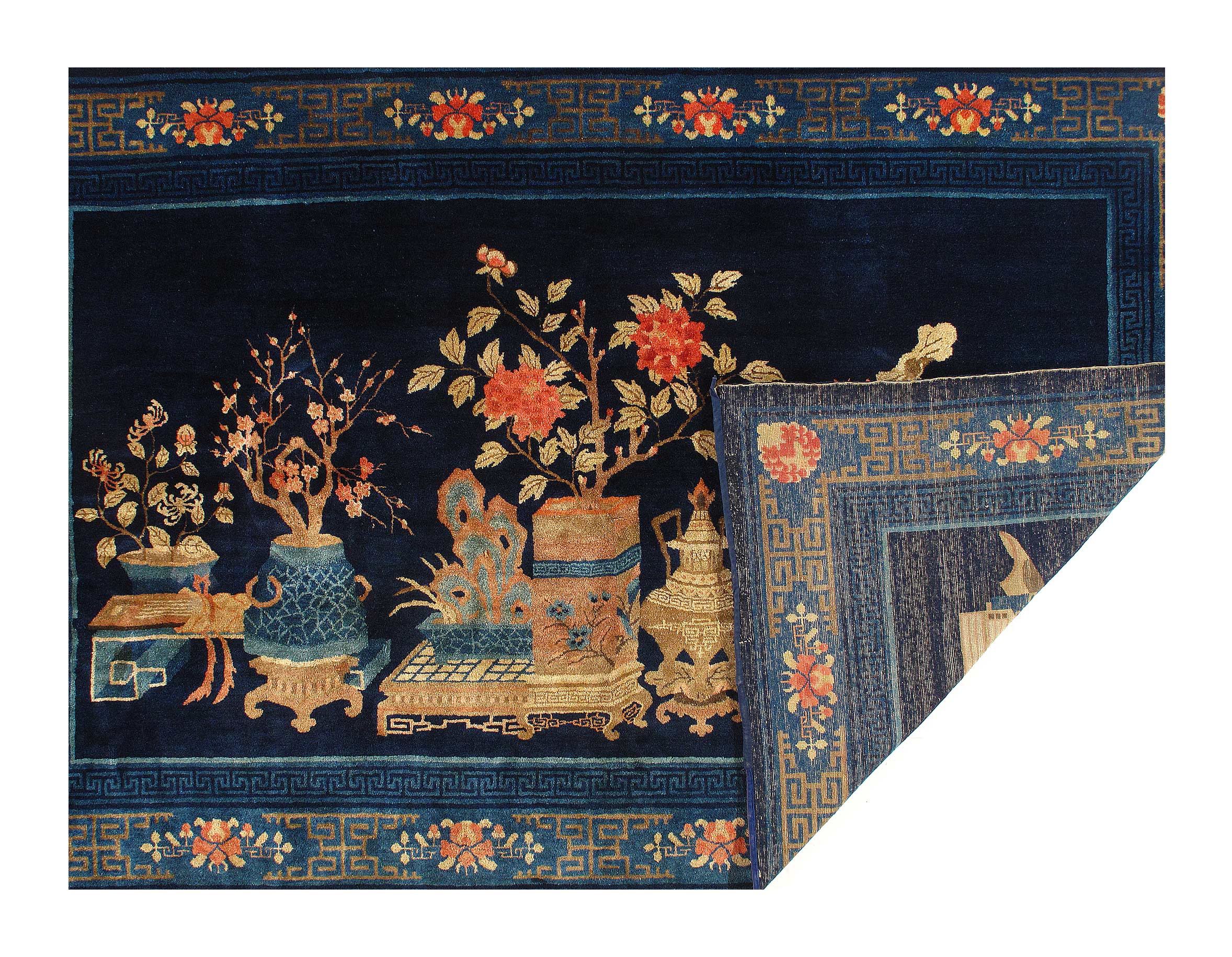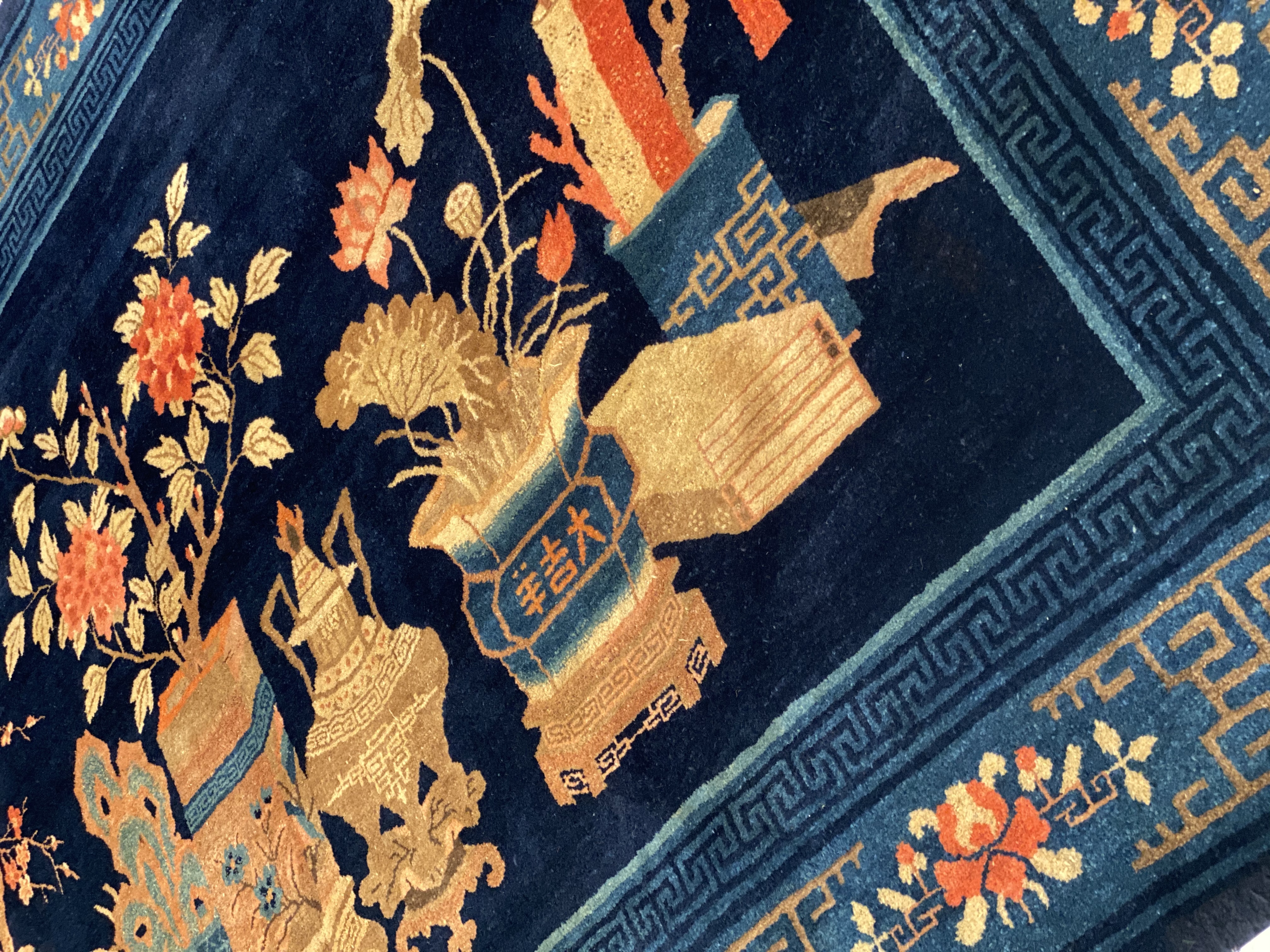 Antique Chinese Deco Rug, Origin: China, Circa: Early 20th Century – Here is an exciting and appealing antique Oriental carpet – an antique Art Deco rug that was designed and woven in China during the early years of the twentieth century. Heavily informed by the aesthetic inclinations of the Art Deco period, this unique carpet is a compelling and thought-provoking example. A scalloped Purple encloses a Light Green sand field on this exquisitely subtle and restrained antique Chinese Art Deco. At first the field appears empty or open, but it is actually covered by a tone-on-tone design of scrolls and cloud-bands emanating inward from the outer edges. In their sinuous rhythms they echo the scalloped forms of the border and continue its visual effects across the carpet in a more subdued manner. This carpet testifies to the masterful design sensibilities of Chinese weavers as they made the transition into the modern world. The Art Deco movement had an outside influence on the world of art and design, and some of the most important qualities and characteristics of that movement may be found in this fine small rug.