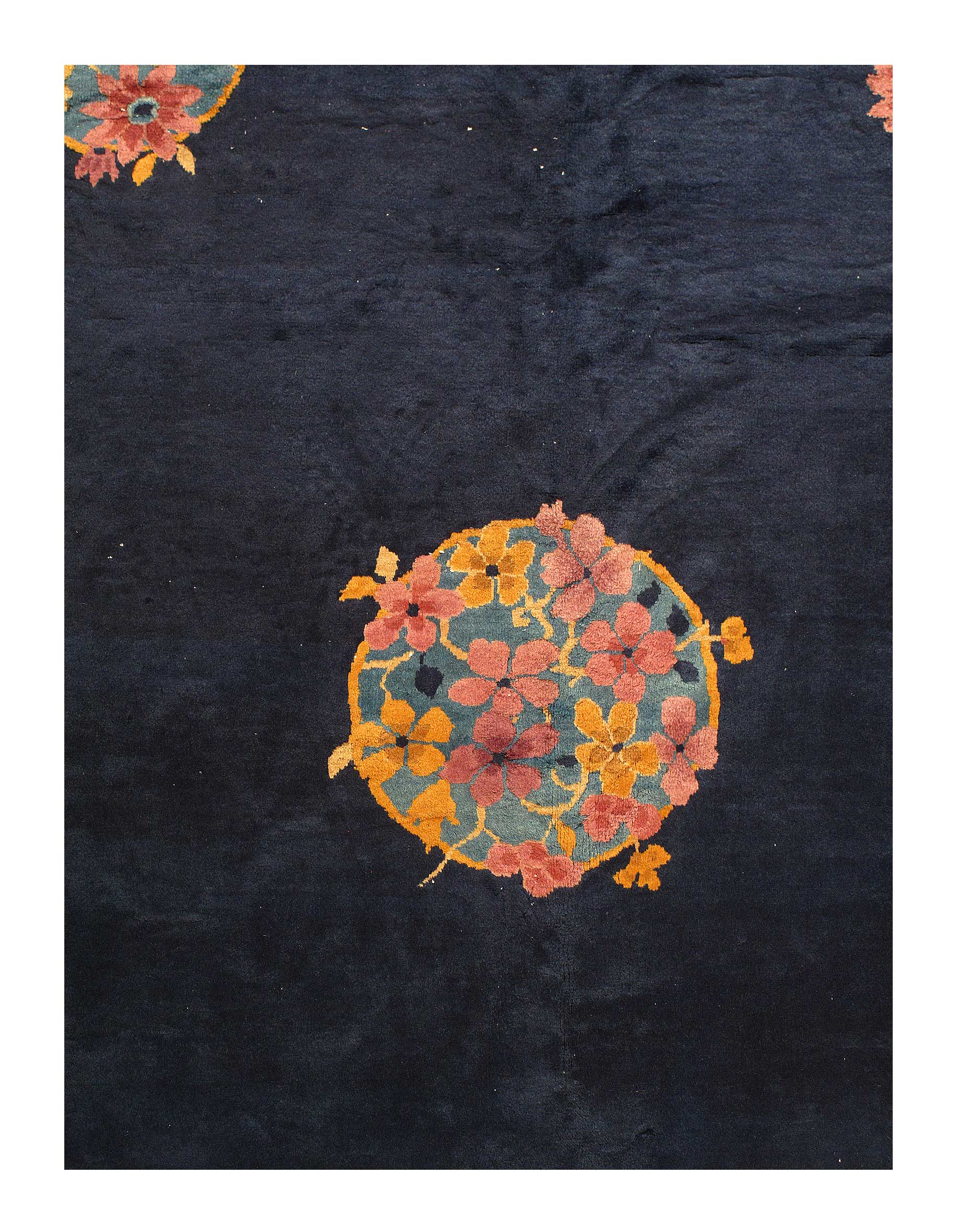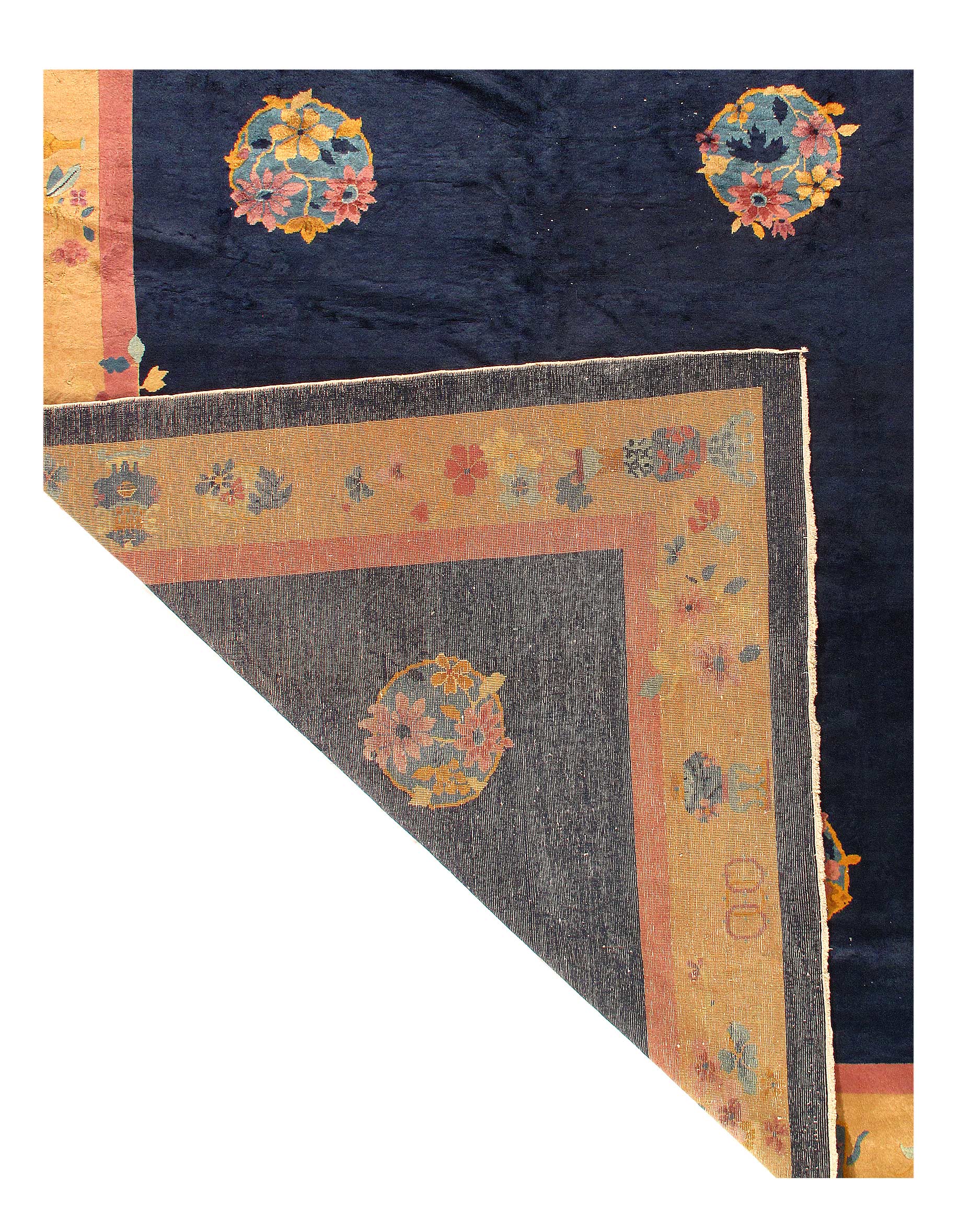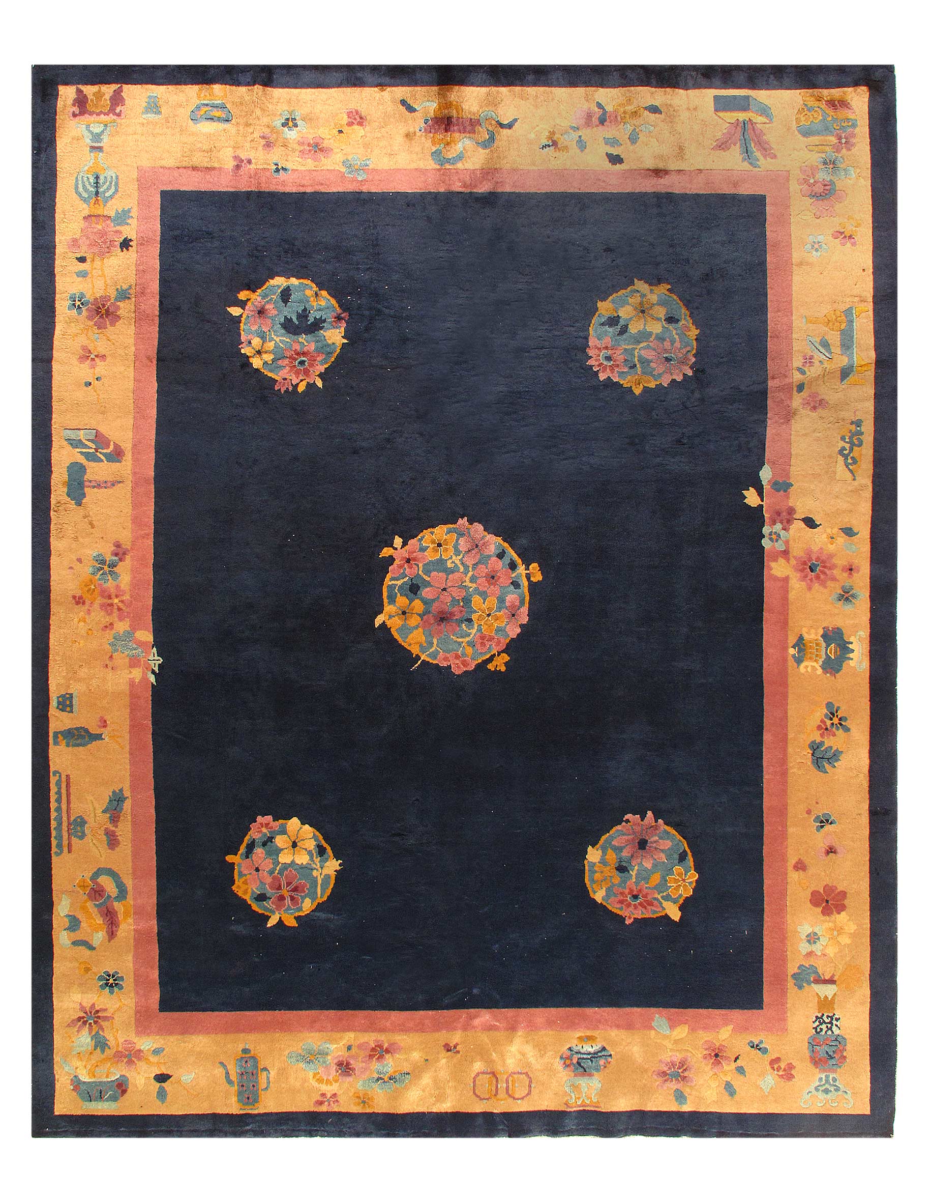 Chinese Deco Rug, Origin: China, Circa: Early 20th Century – Here is an exciting and appealing antique Oriental carpet – an antique Art Deco rug that was designed and woven in China during the early years of the twentieth century. Heavily informed by the aesthetic inclinations of the Art Deco period, this unique carpet is a compelling and thought-provoking example. A scalloped border of Rust encloses a Blue sand field on this exquisitely subtle and restrained antique Chinese Art Deco. At first the field appears empty or open, but it is actually covered by a tone-on-tone design of scrolls and cloud-bands emanating inward from the outer edges. In their sinuous rhythms they echo the scalloped forms of the border and continue its visual effects across the carpet in a more subdued manner. This carpet testifies to the masterful design sensibilities of Chinese weavers as they made the transition into the modern world. The Art Deco movement had an outside influence on the world of art and design, and some of the most important qualities and characteristics of that movement may be found in this fine rug.