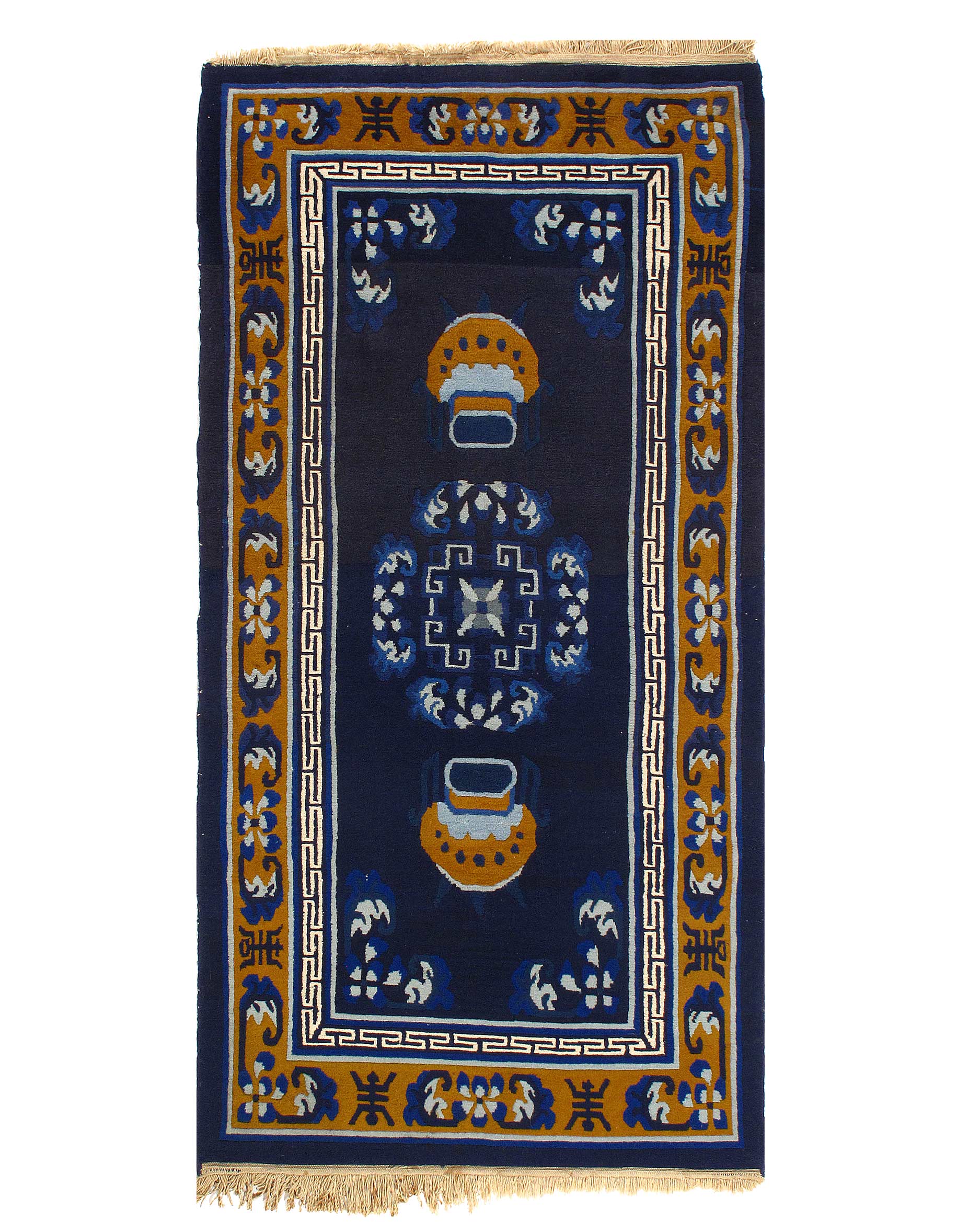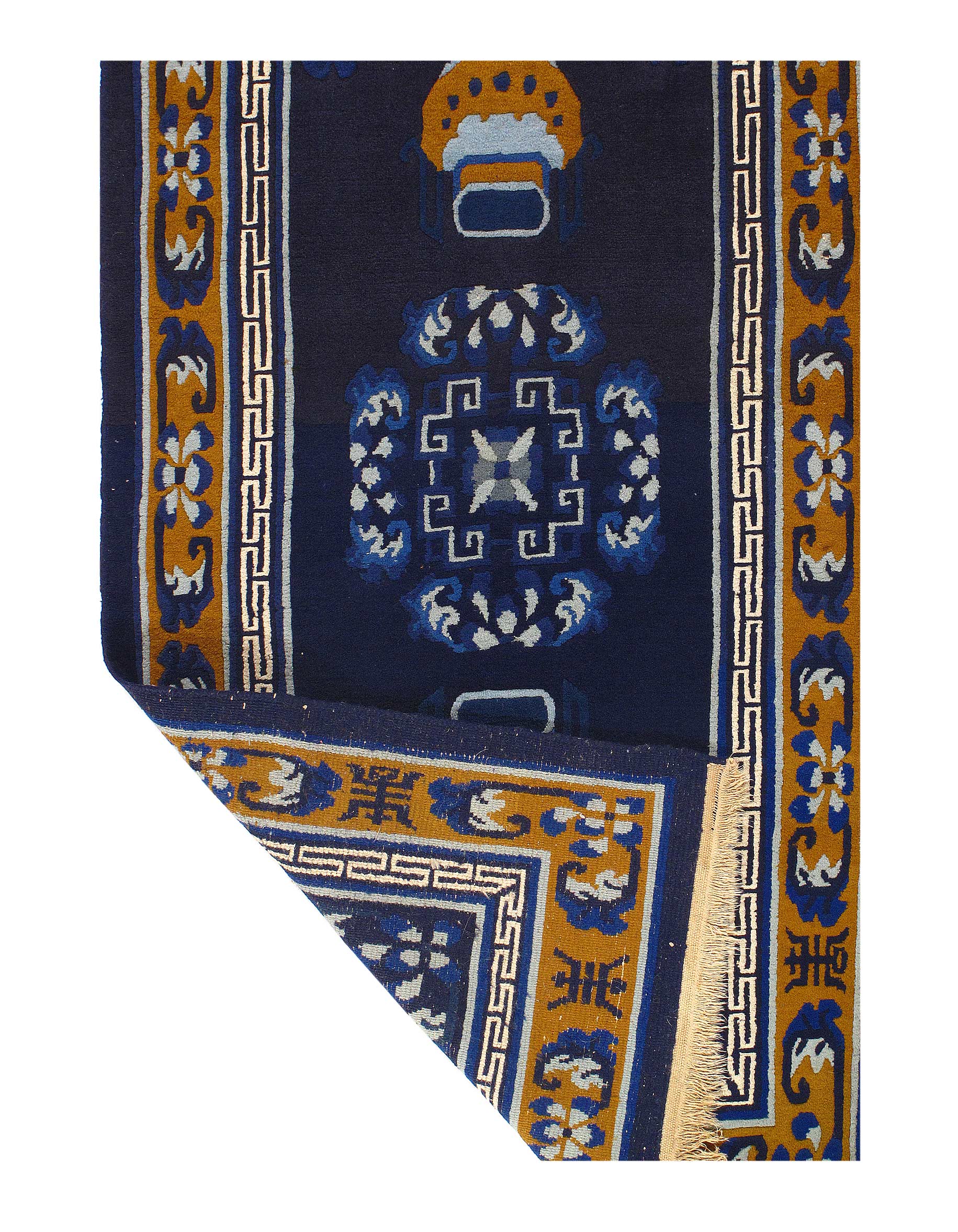 Antique Chinese Deco Rug, Origin: China, Circa: Early 20th Century – Here is an exciting and appealing antique Oriental carpet – an antique Art Deco rug that was designed and woven in China during the early years of the twentieth century. Heavily informed by the aesthetic inclinations of the Art Deco period, this unique carpet is a compelling and thought-provoking example. A scalloped Purple encloses a Light Green sand field on this exquisitely subtle and restrained antique Chinese Art Deco. At first the field appears empty or open, but it is actually covered by a tone-on-tone design of scrolls and cloud-bands emanating inward from the outer edges. In their sinuous rhythms they echo the scalloped forms of the border and continue its visual effects across the carpet in a more subdued manner. This carpet testifies to the masterful design sensibilities of Chinese weavers as they made the transition into the modern world. The Art Deco movement had an outside influence on the world of art and design, and some of the most important qualities and characteristics of that movement may be found in this fine small rug.