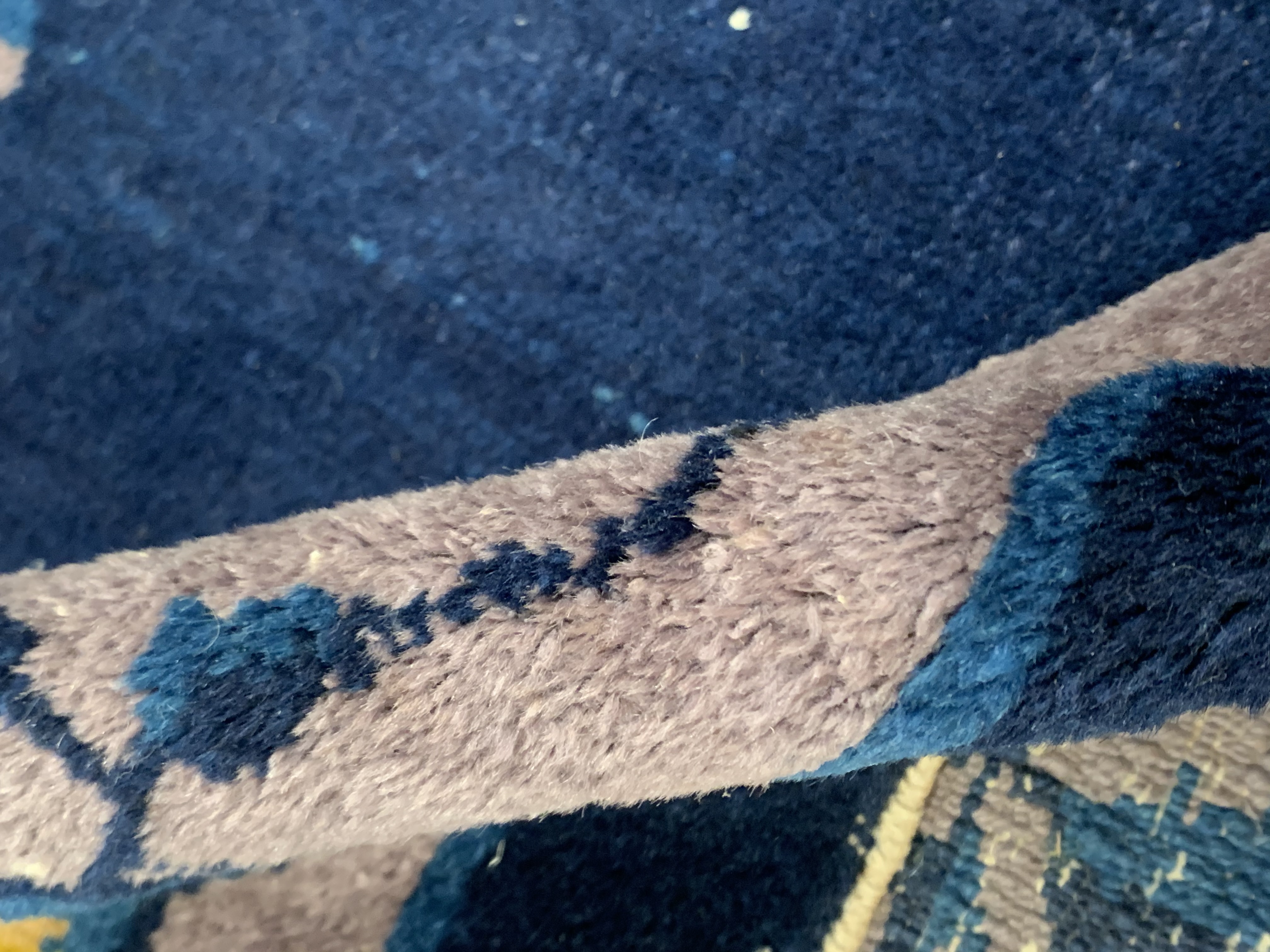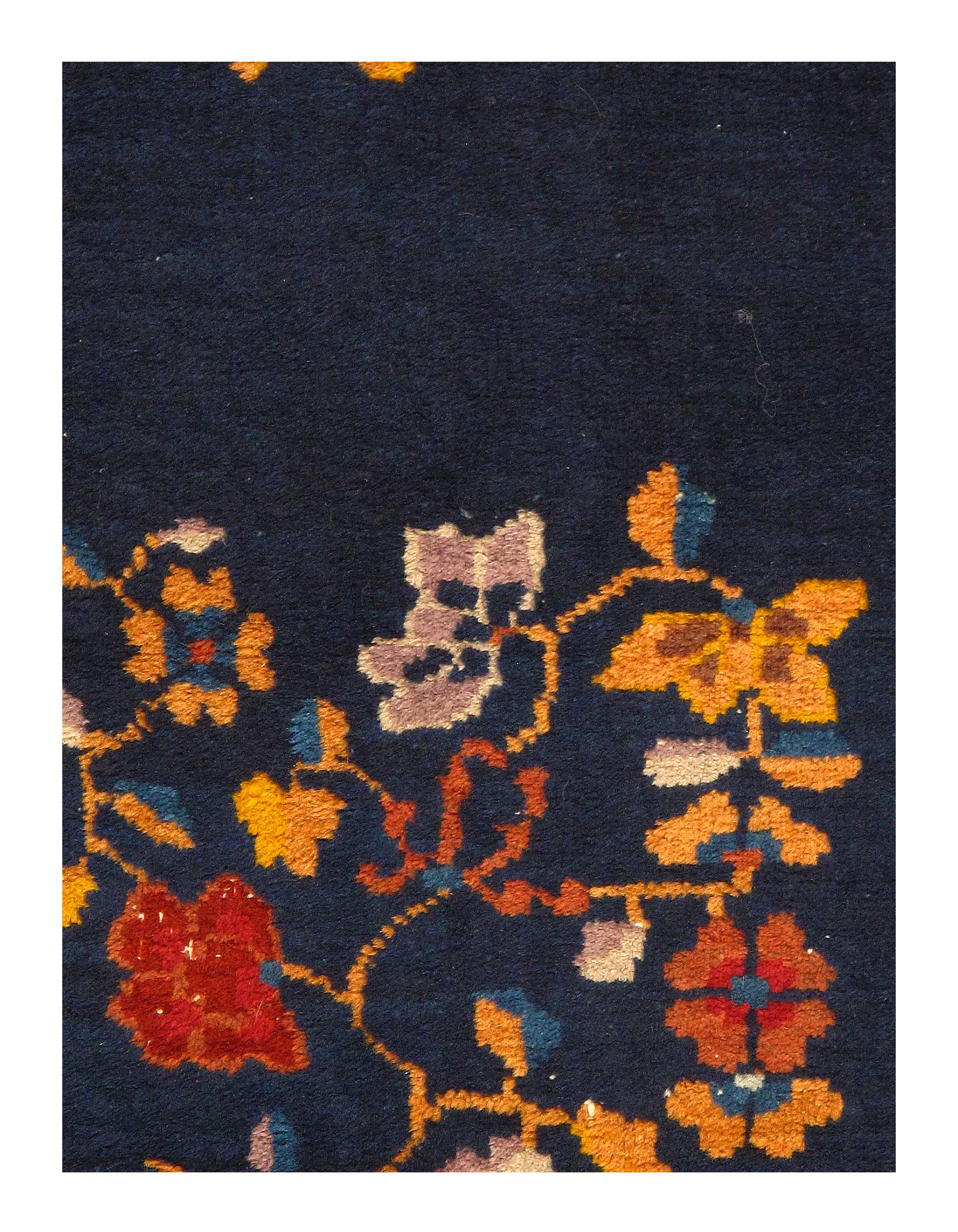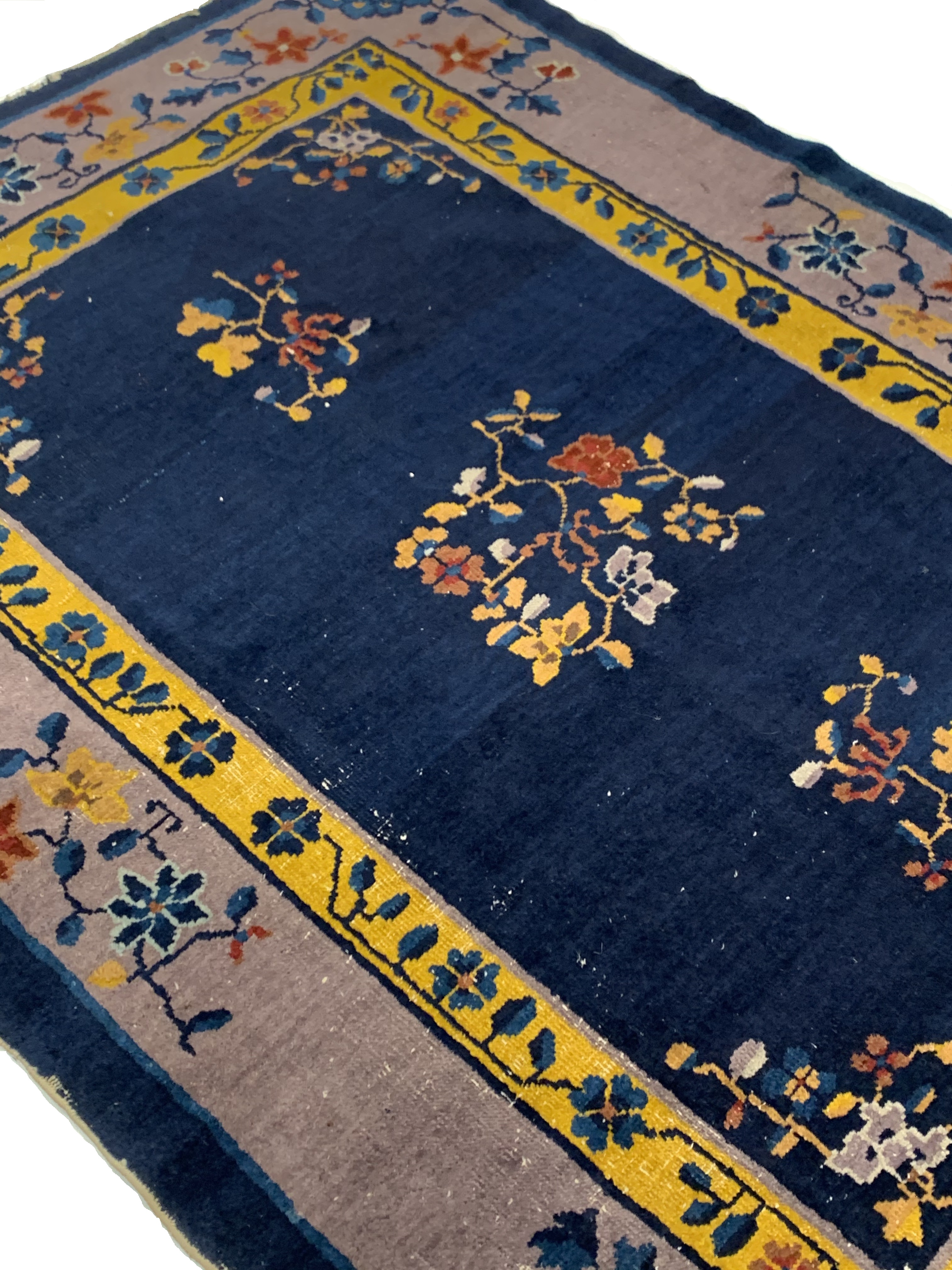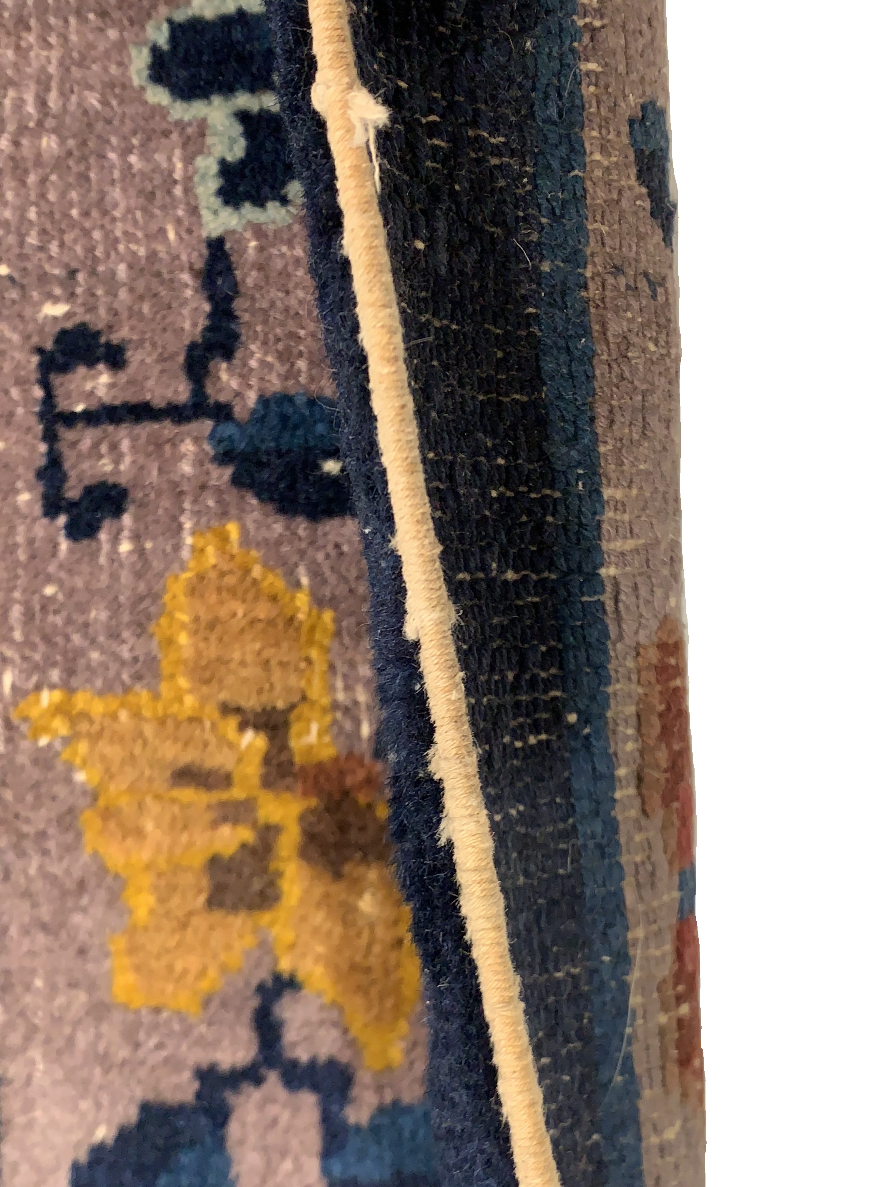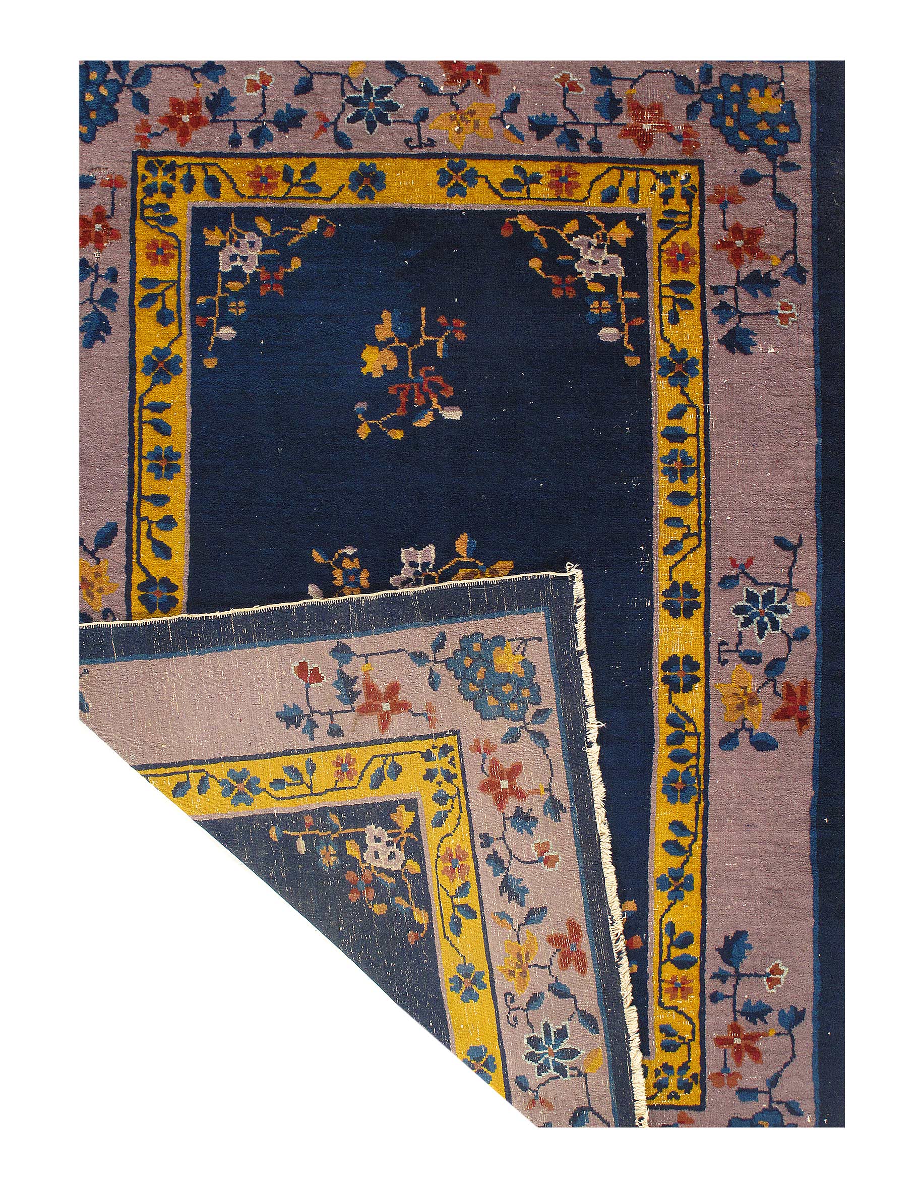 Antique Chinese Deco Rug, Origin: China, Circa: Early 20th Century – Here is an exciting and appealing antique Oriental carpet – an antique Art Deco rug that was designed and woven in China during the early years of the twentieth century. Heavily informed by the aesthetic inclinations of the Art Deco period, this unique carpet is a compelling and thought-provoking example. A scalloped Purple encloses a Light Green sand field on this exquisitely subtle and restrained antique Chinese Art Deco. At first the field appears empty or open, but it is actually covered by a tone-on-tone design of scrolls and cloud-bands emanating inward from the outer edges. In their sinuous rhythms they echo the scalloped forms of the border and continue its visual effects across the carpet in a more subdued manner. This carpet testifies to the masterful design sensibilities of Chinese weavers as they made the transition into the modern world. The Art Deco movement had an outside influence on the world of art and design, and some of the most important qualities and characteristics of that movement may be found in this fine rug.