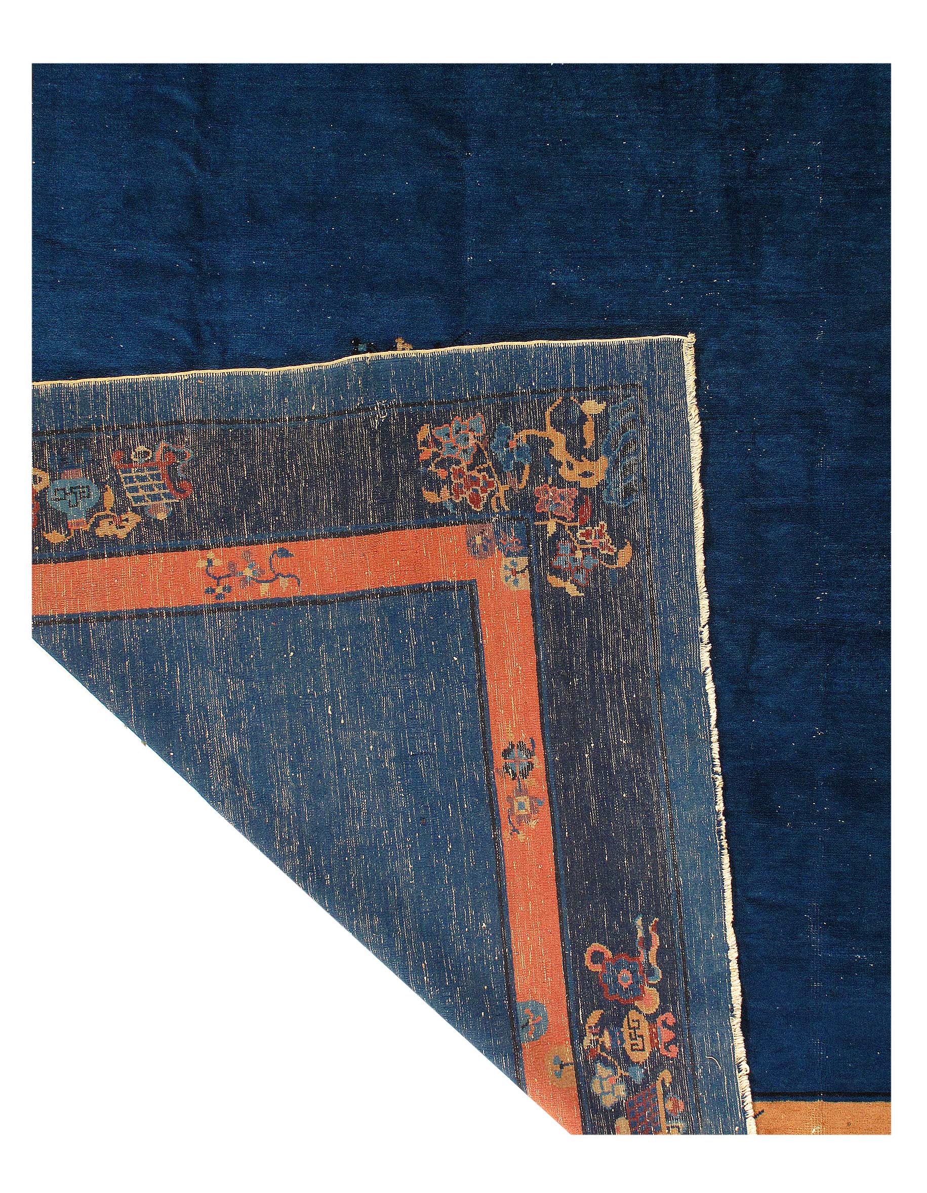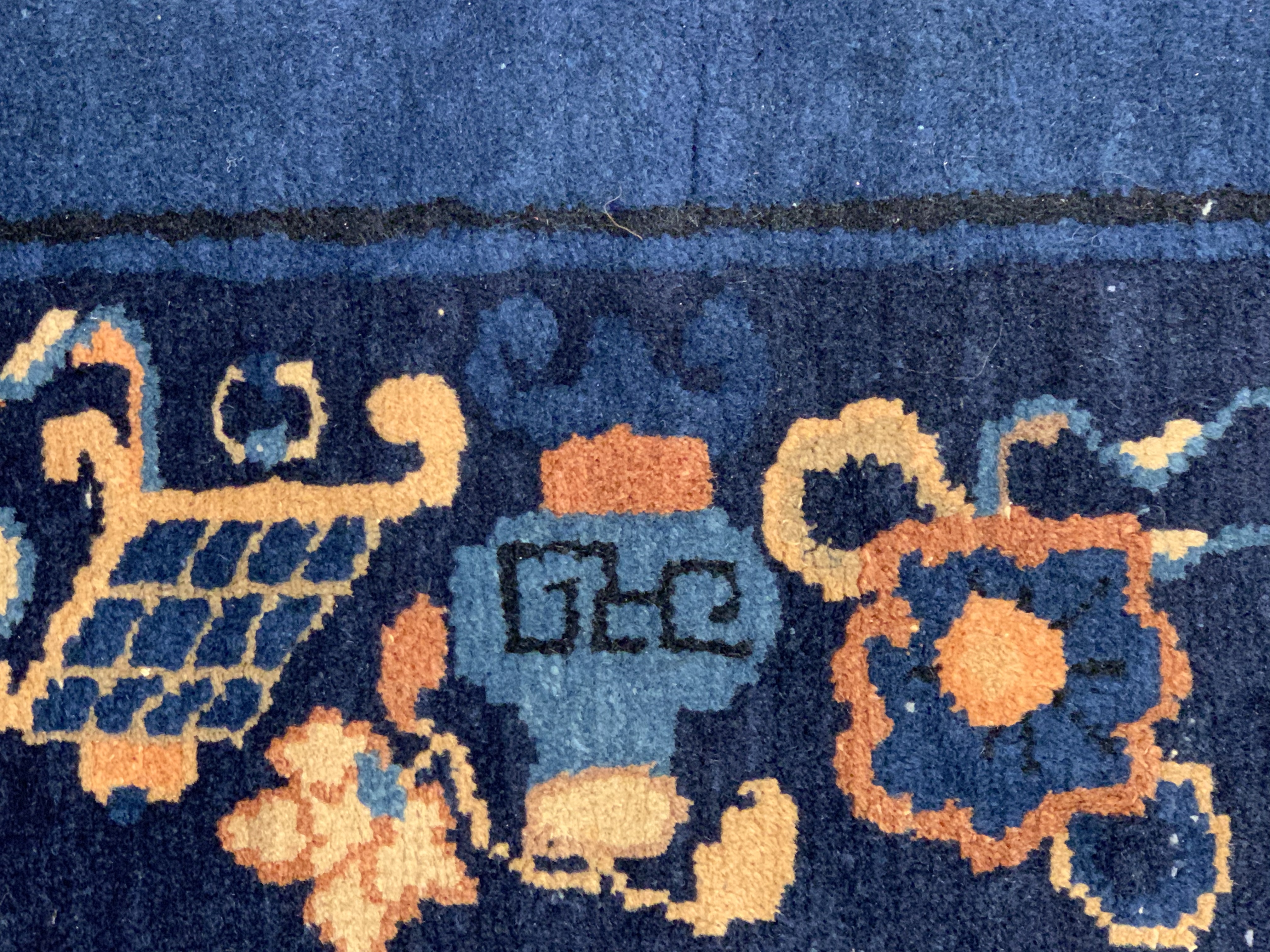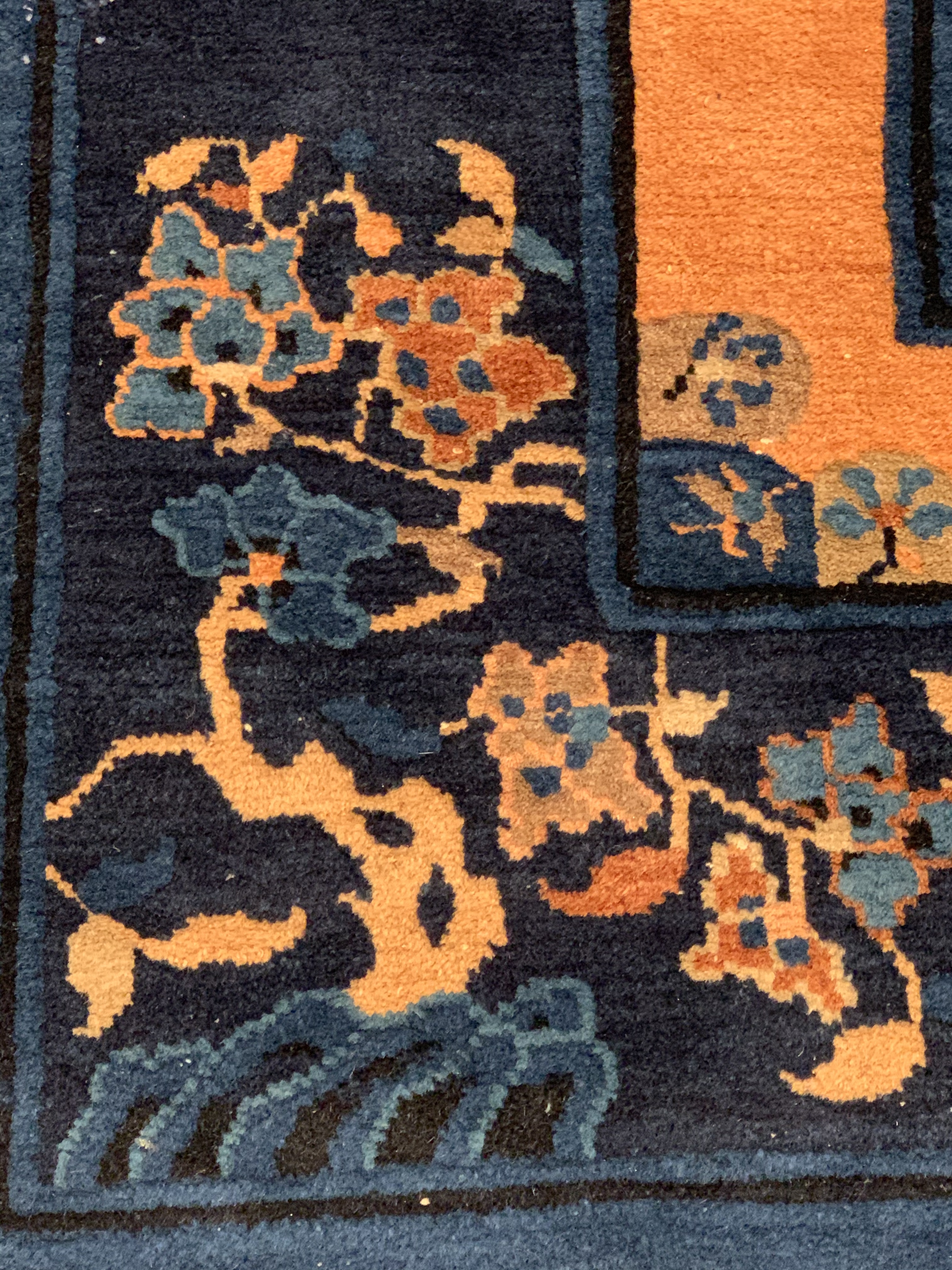 Antique Chinese Deco Rug, Origin: China, Circa: Early 20th Century – Here is an exciting and appealing antique Oriental carpet – an antique Art Deco rug that was designed and woven in China during the early years of the twentieth century. Heavily informed by the aesthetic inclinations of the Art Deco period, this unique carpet is a compelling and thought-provoking example. A scalloped Purple encloses a Light Green sand field on this exquisitely subtle and restrained antique Chinese Art Deco. At first the field appears empty or open, but it is actually covered by a tone-on-tone design of scrolls and cloud-bands emanating inward from the outer edges. In their sinuous rhythms they echo the scalloped forms of the border and continue its visual effects across the carpet in a more subdued manner. This carpet testifies to the masterful design sensibilities of Chinese weavers as they made the transition into the modern world. The Art Deco movement had an outside influence on the world of art and design, and some of the most important qualities and characteristics of that movement may be found in this fine rug.