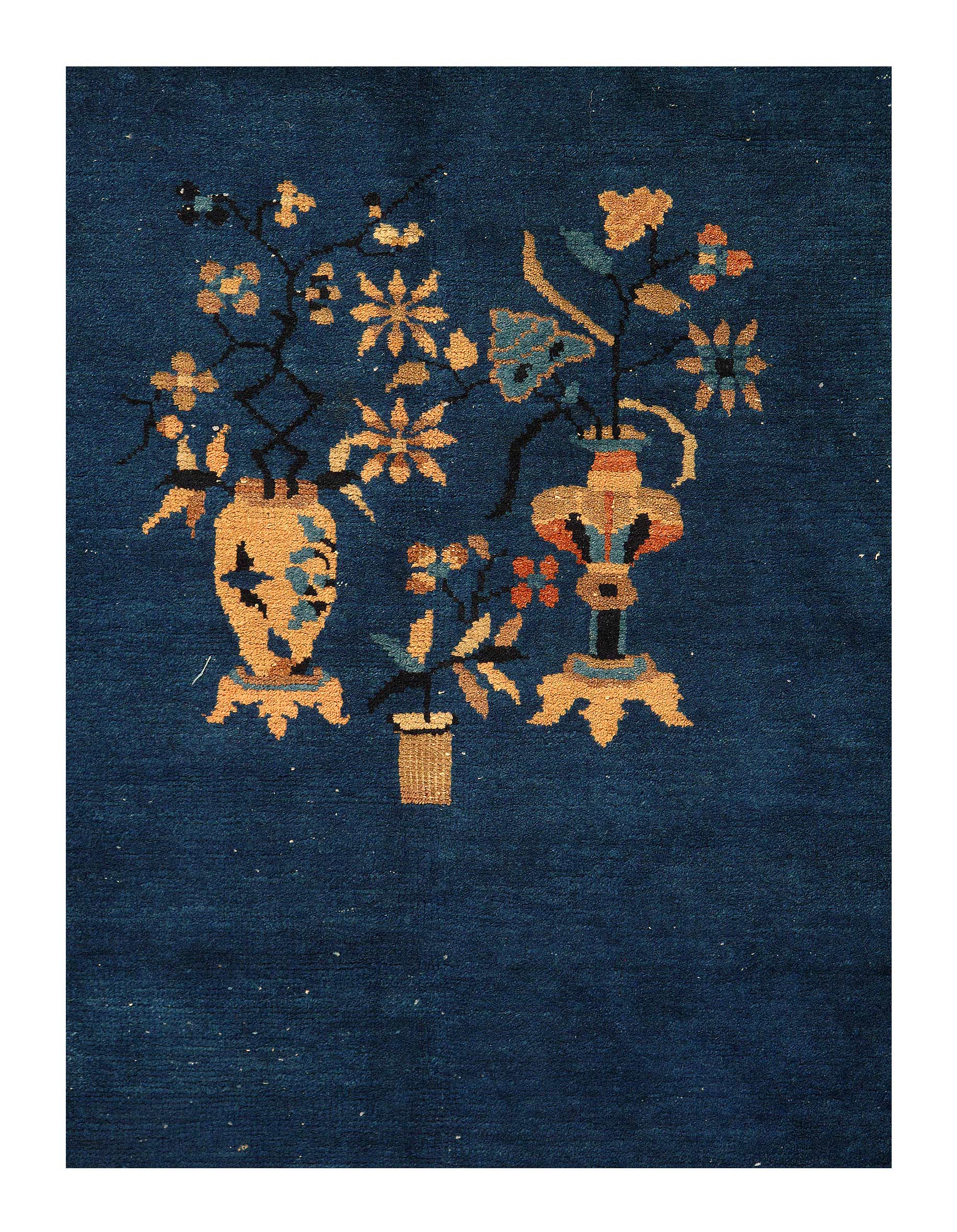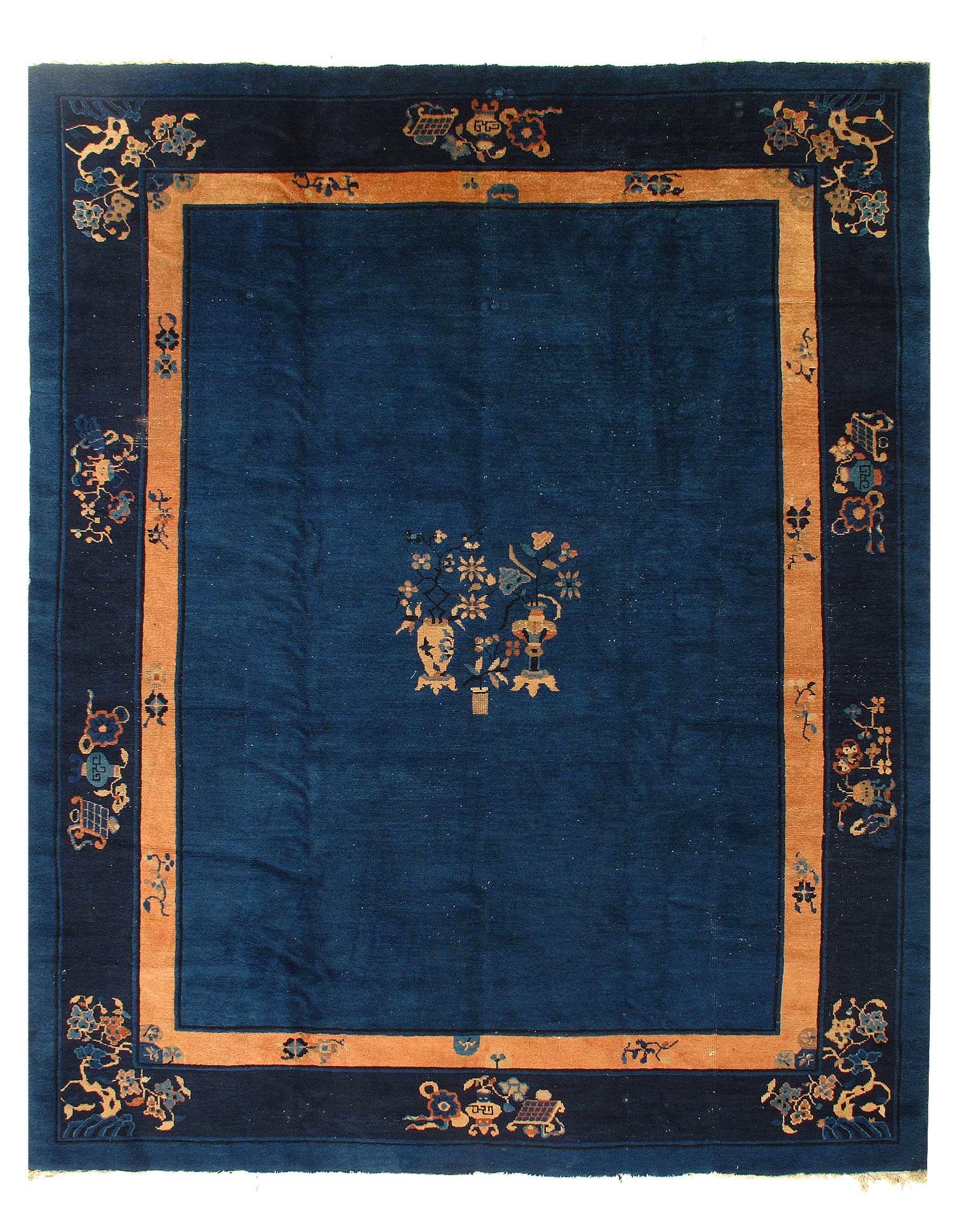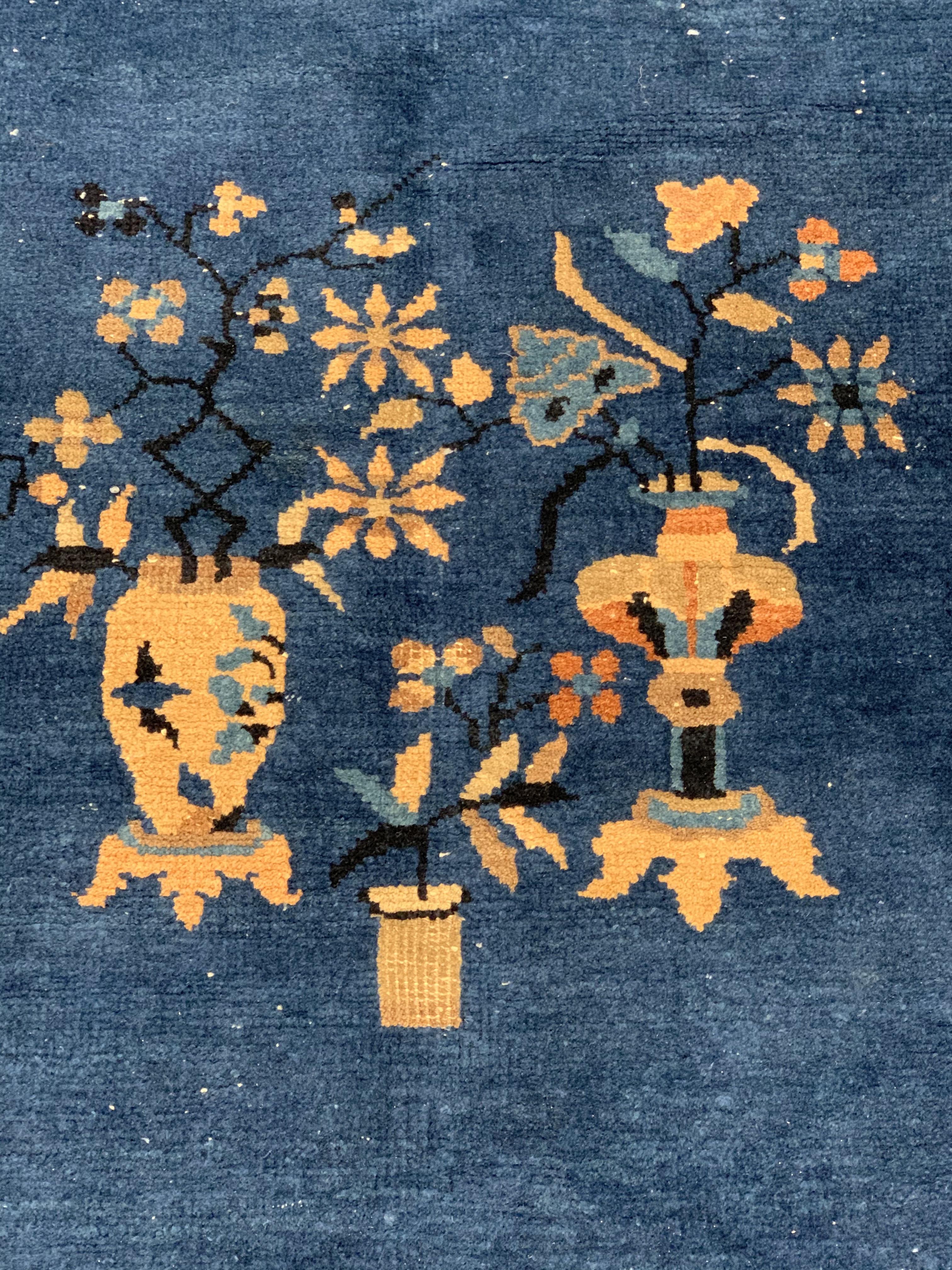 Antique Chinese Deco Rug, Origin: China, Circa: Early 20th Century – Here is an exciting and appealing antique Oriental carpet – an antique Art Deco rug that was designed and woven in China during the early years of the twentieth century. Heavily informed by the aesthetic inclinations of the Art Deco period, this unique carpet is a compelling and thought-provoking example. A scalloped Purple encloses a Light Green sand field on this exquisitely subtle and restrained antique Chinese Art Deco. At first the field appears empty or open, but it is actually covered by a tone-on-tone design of scrolls and cloud-bands emanating inward from the outer edges. In their sinuous rhythms they echo the scalloped forms of the border and continue its visual effects across the carpet in a more subdued manner. This carpet testifies to the masterful design sensibilities of Chinese weavers as they made the transition into the modern world. The Art Deco movement had an outside influence on the world of art and design, and some of the most important qualities and characteristics of that movement may be found in this fine rug.
