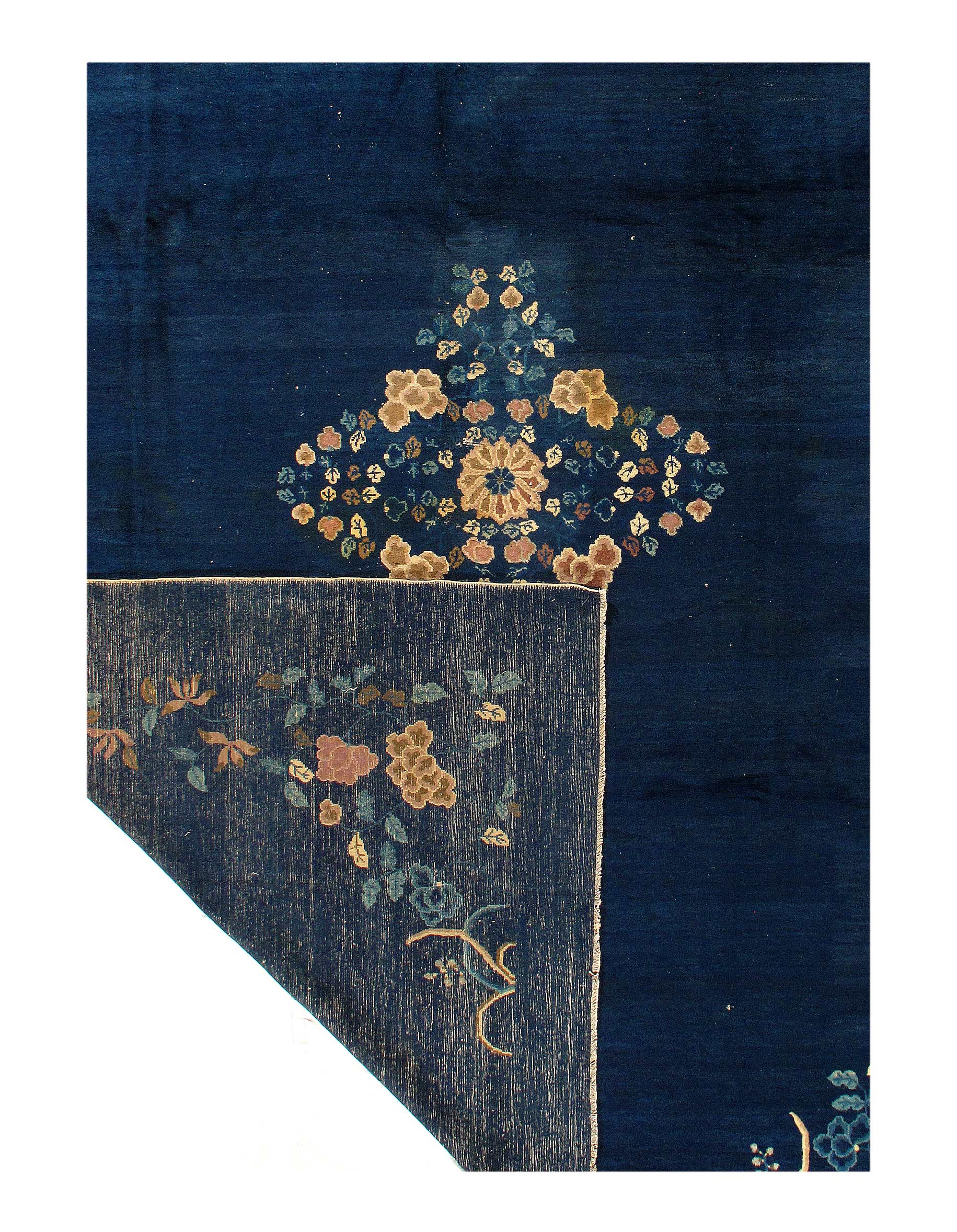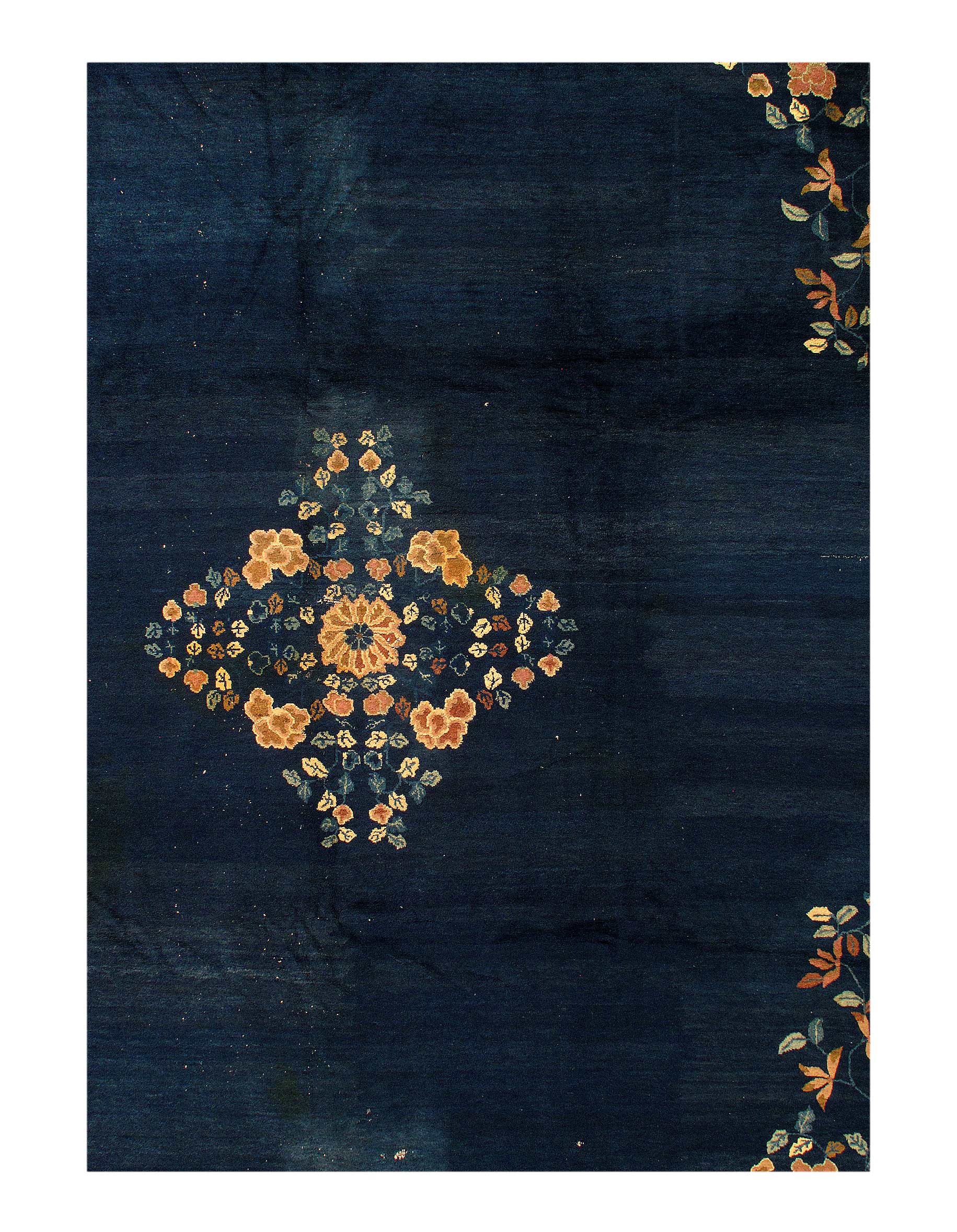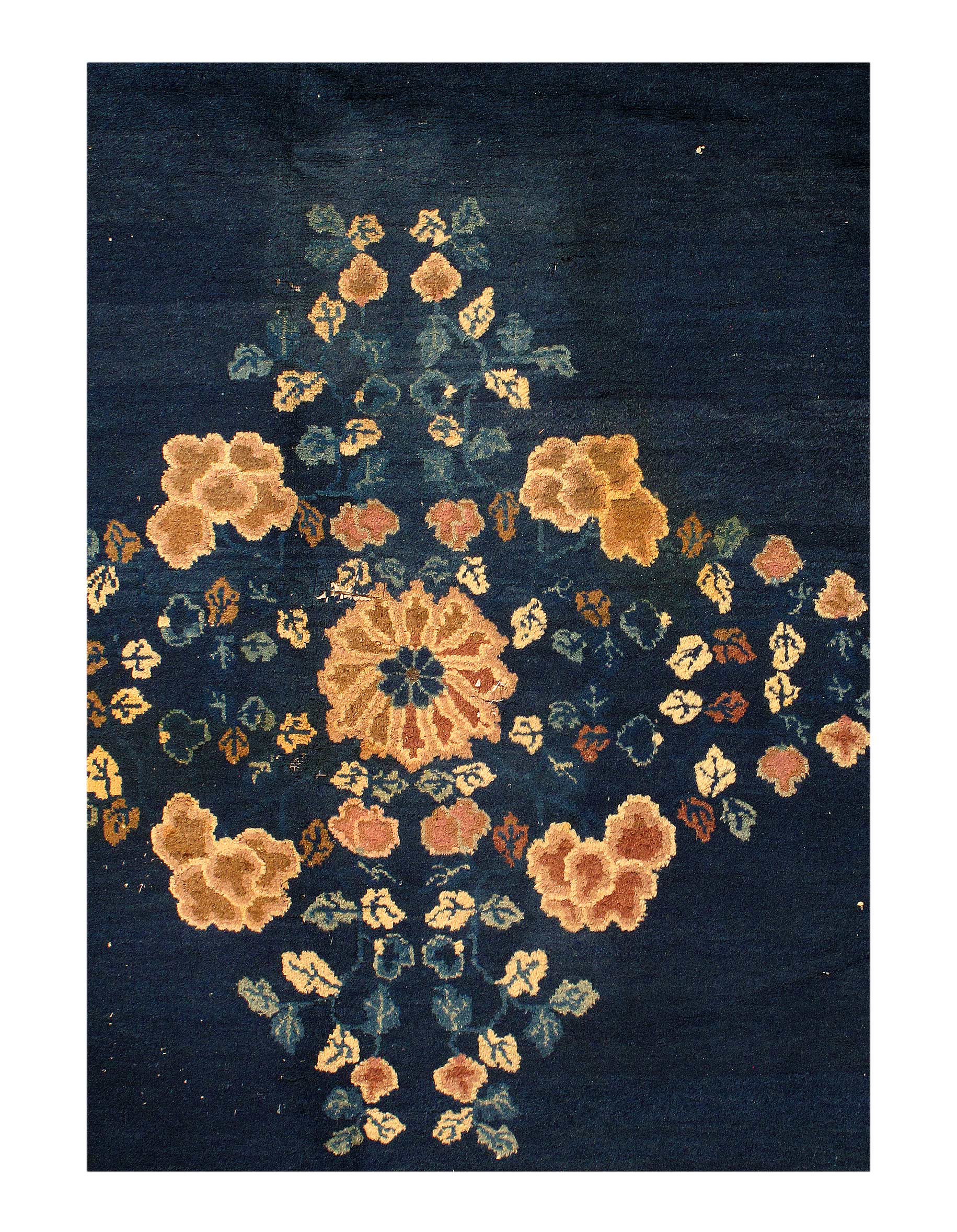 Antique Chinese Deco Rug, Origin: China, Circa: Early 20th Century β Here is an exciting and appealing antique Oriental carpet β an antique Art Deco rug that was designed and woven in China during the early years of the twentieth century. Heavily informed by the aesthetic inclinations of the Art Deco period, this unique carpet is a compelling and thought-provoking example. A scalloped Purple encloses a Light Green sand field on this exquisitely subtle and restrained antique Chinese Art Deco. At first the field appears empty or open, but it is actually covered by a tone-on-tone design of scrolls and cloud-bands emanating inward from the outer edges. In their sinuous rhythms they echo the scalloped forms of the border and continue its visual effects across the carpet in a more subdued manner. This carpet testifies to the masterful design sensibilities of Chinese weavers as they made the transition into the modern world. The Art Deco movement had an outside influence on the world of art and design, and some of the most important qualities and characteristics of that movement may be found in this fine rug.