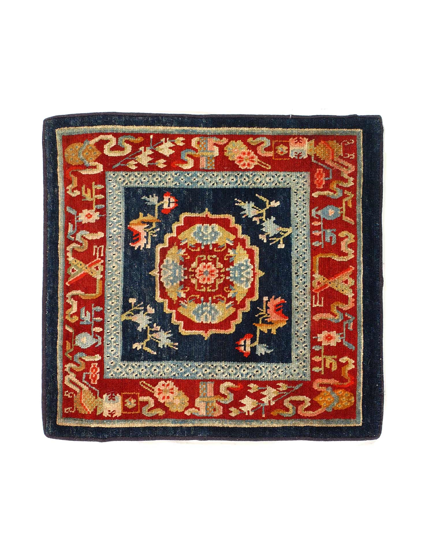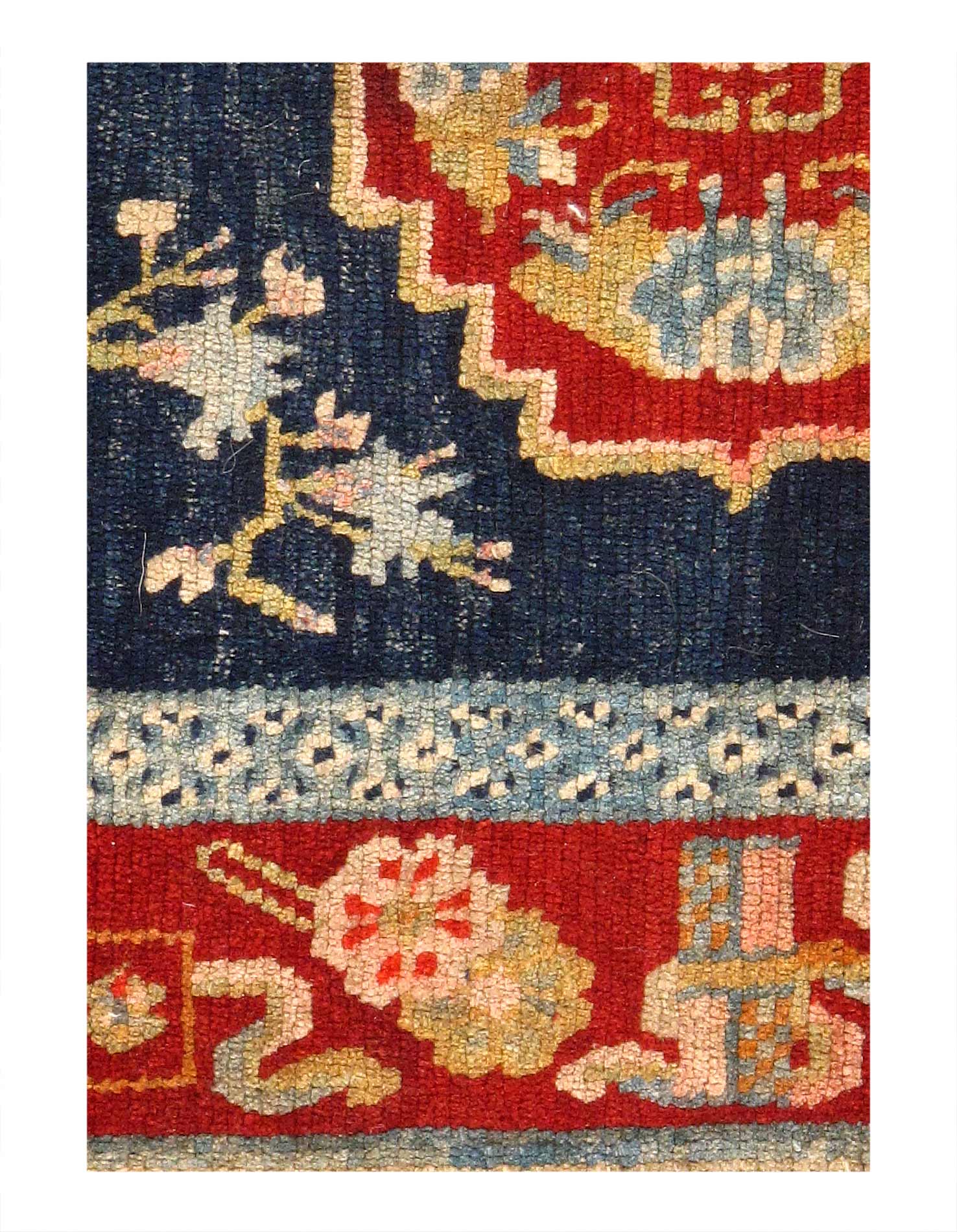 Antique Chinese Deco Rug, Origin: China, Circa: Early 20th Century – Here is an exciting and appealing antique Oriental carpet – an antique Art Deco rug that was designed and woven in China during the early years of the twentieth century. Heavily informed by the aesthetic inclinations of the Art Deco period, this unique carpet is a compelling and thought-provoking example. A scalloped Beige encloses a Navy Blue sand field on this exquisitely subtle and restrained antique Chinese Art Deco. At first the field appears empty or open, but it is actually covered by a tone-on-tone design of scrolls and cloud-bands emanating inward from the outer edges. In their sinuous rhythms they echo the scalloped forms of the border and continue its visual effects across the carpet in a more subdued manner. This carpet testifies to the masterful design sensibilities of Chinese weavers as they made the transition into the modern world. The Art Deco movement had an outside influence on the world of art and design, and some of the most important qualities and characteristics of that movement may be found in this fine small rug.