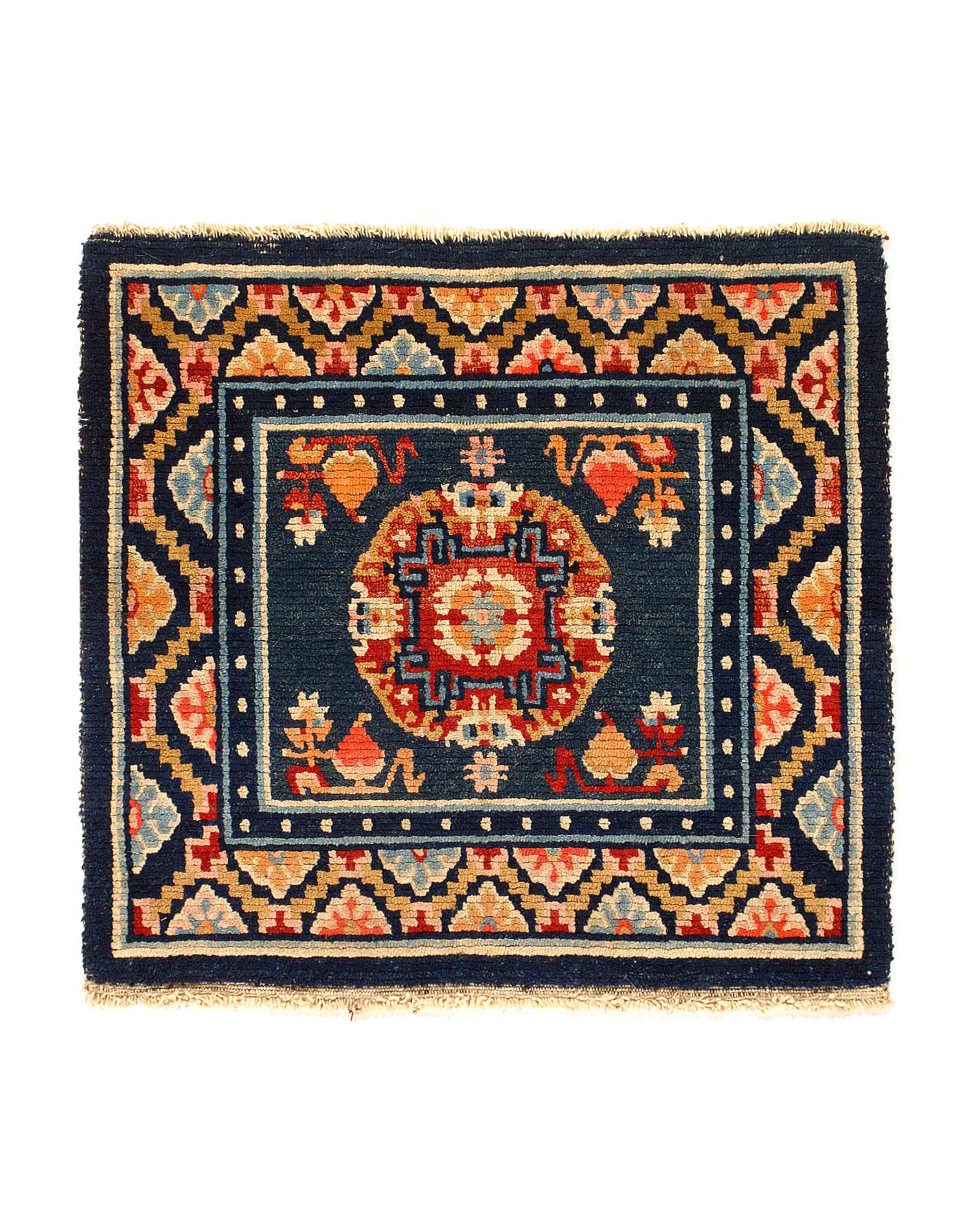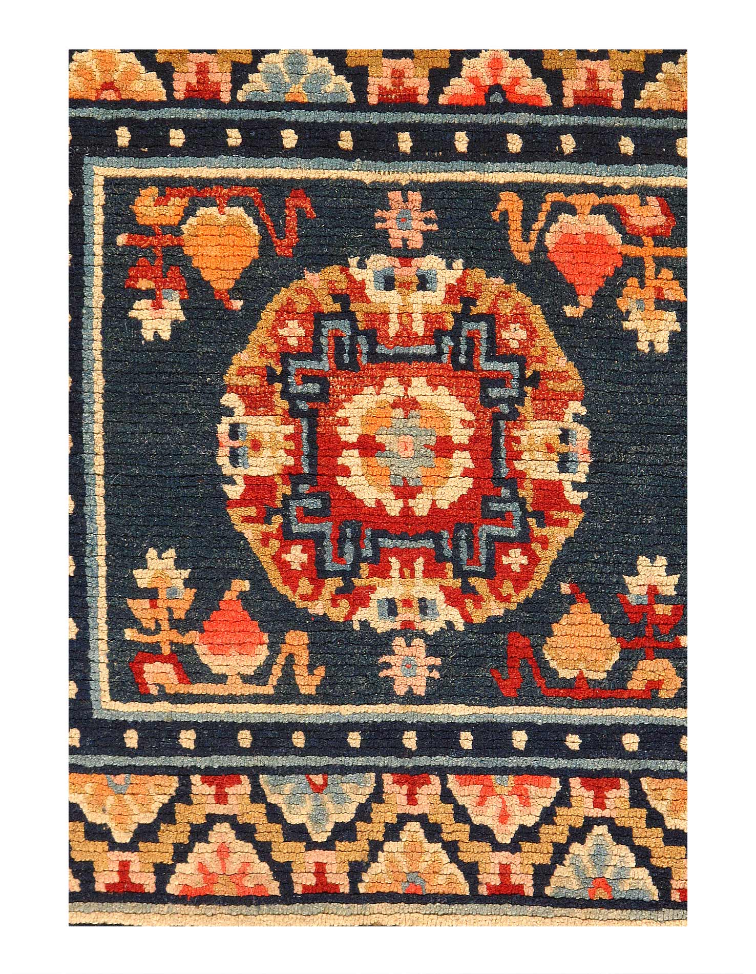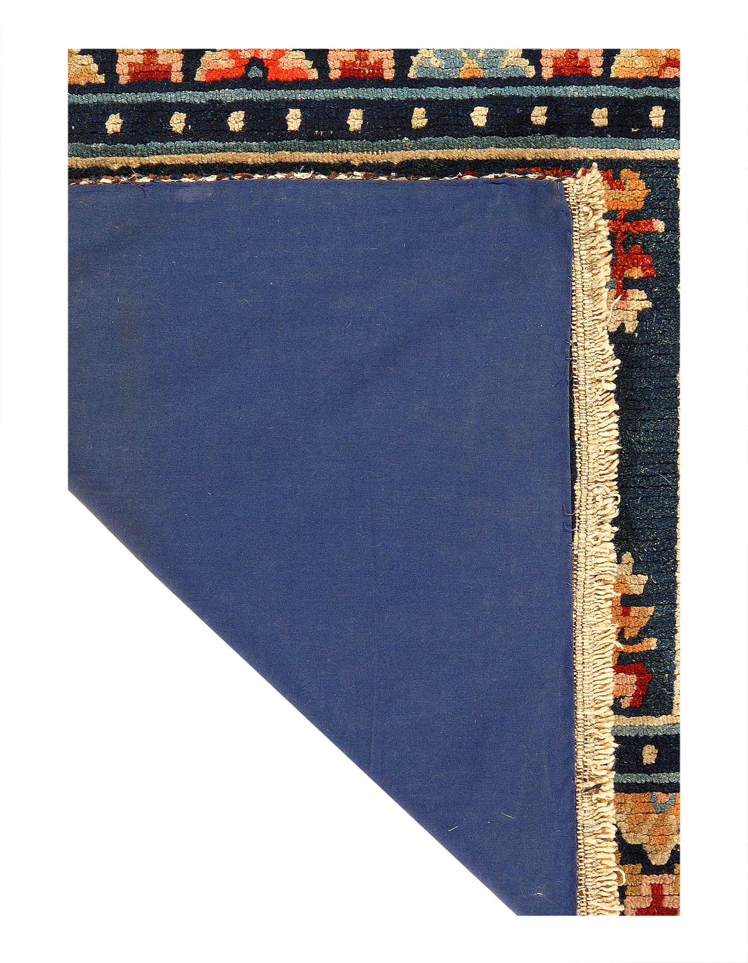 Antique Chinese Deco Rug, Origin: China, Circa: Early 20th Century β Here is an exciting and appealing antique Oriental carpet β an antique Art Deco rug that was designed and woven in China during the early years of the twentieth century. Heavily informed by the aesthetic inclinations of the Art Deco period, this unique carpet is a compelling and thought-provoking example. A scalloped Beige encloses a Navy Blue sand field on this exquisitely subtle and restrained antique Chinese Art Deco. At first the field appears empty or open, but it is actually covered by a tone-on-tone design of scrolls and cloud-bands emanating inward from the outer edges. In their sinuous rhythms they echo the scalloped forms of the border and continue its visual effects across the carpet in a more subdued manner. This carpet testifies to the masterful design sensibilities of Chinese weavers as they made the transition into the modern world. The Art Deco movement had an outside influence on the world of art and design, and some of the most important qualities and characteristics of that movement may be found in this fine small rug.