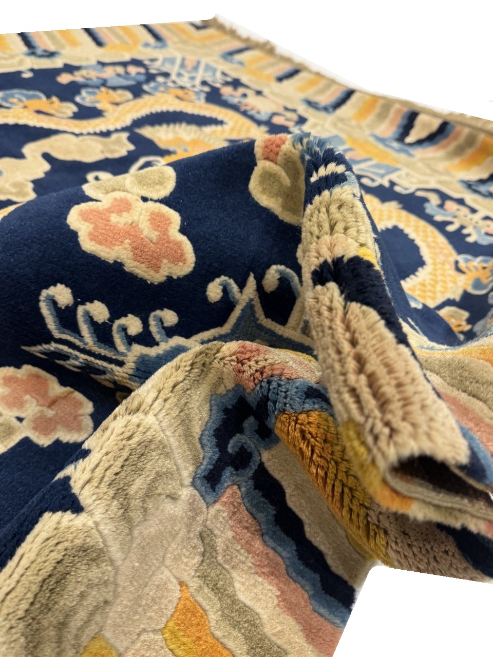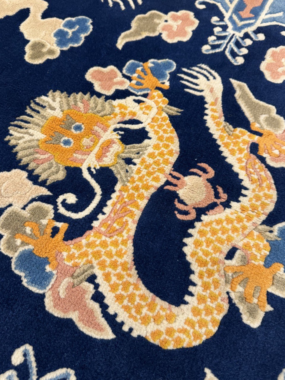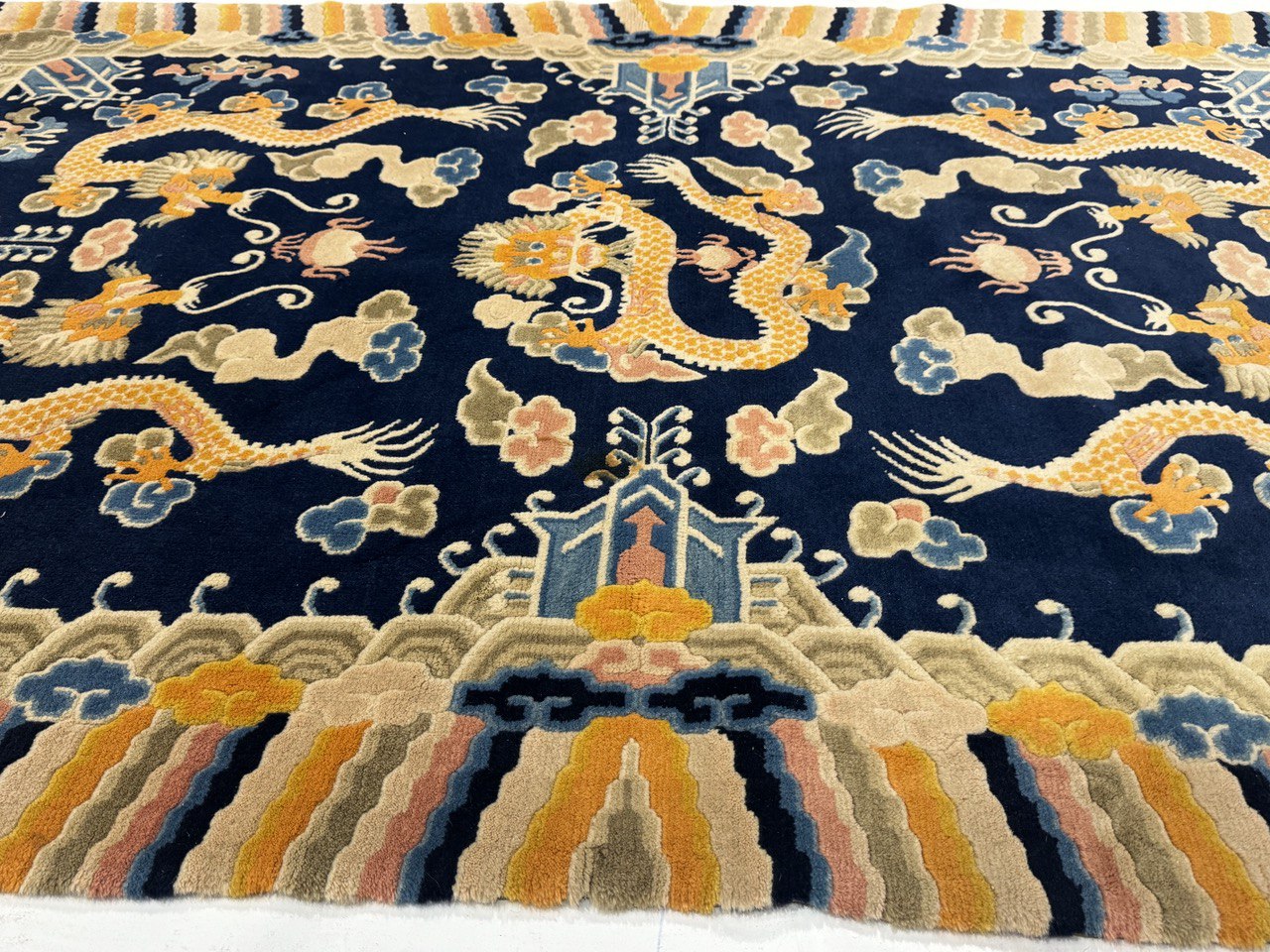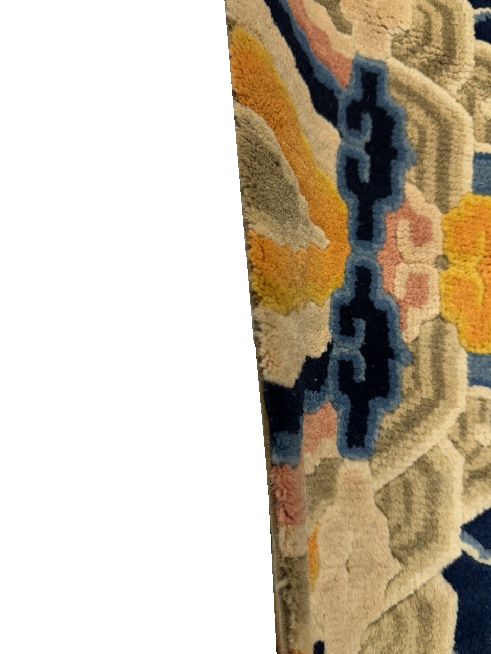 Gorgeous And Extremely Artistic Antique Chinese 5 Claw Dragon Design Shabby Elegance Rug, Circa Date: 1880 - A beautiful array of five clawed Chinese dragons are gracefully flying across the expanse of this breathtaking antique Chinese rug. This is a fascinating and highly artistic antique rug was woven in China around the 1880’