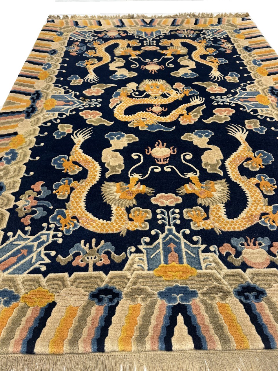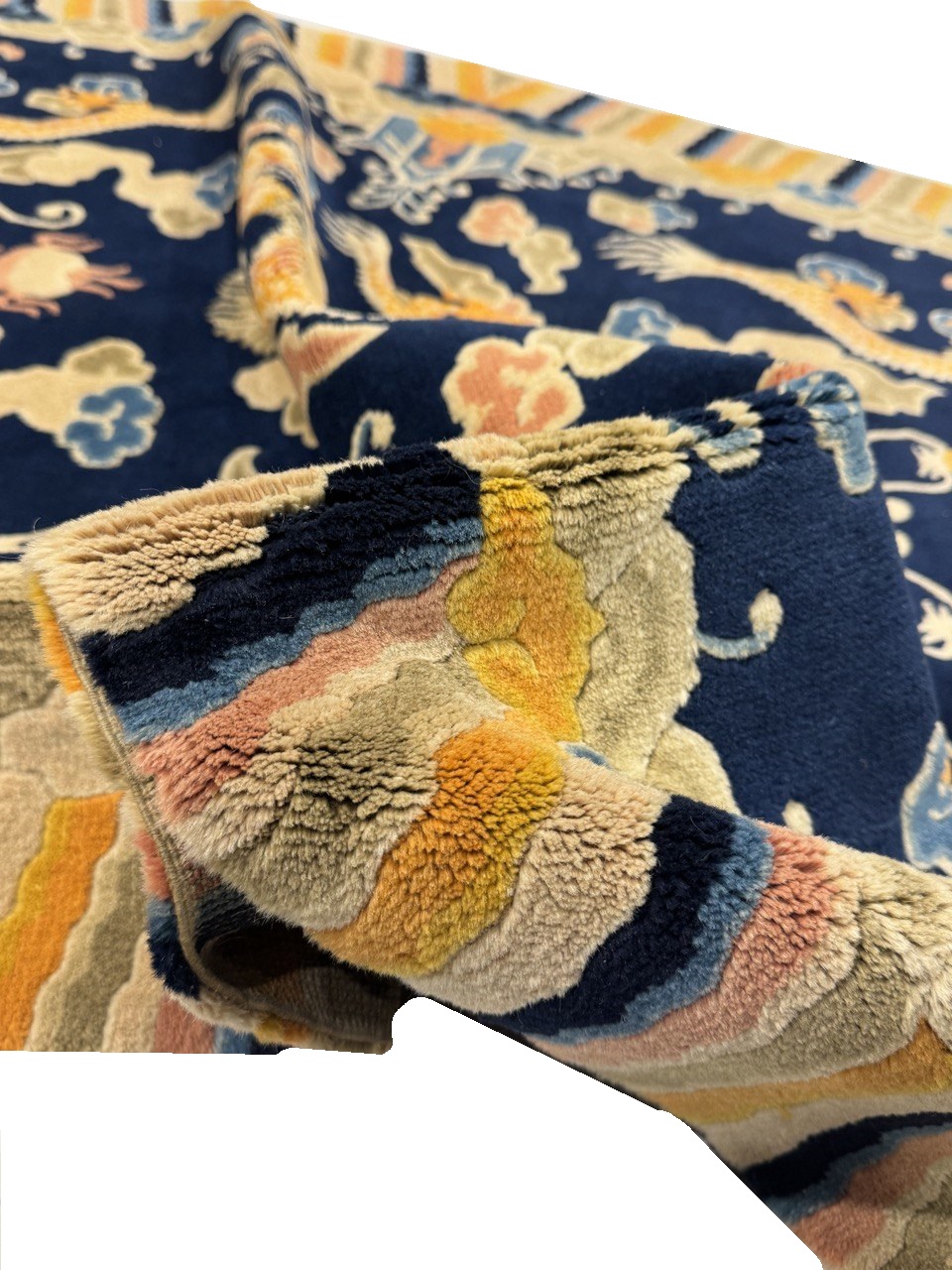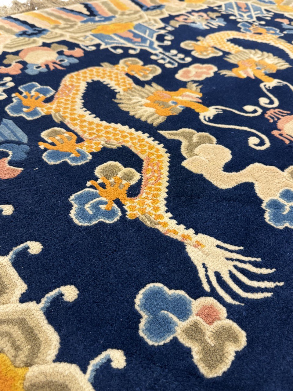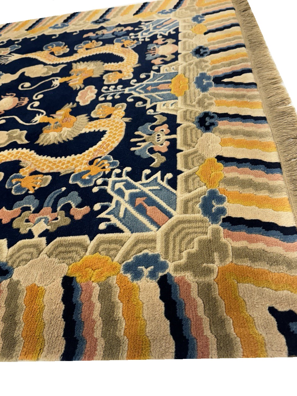 Gorgeous And Extremely Artistic Antique Chinese 5 Claw Dragon Design Shabby Elegance Rug, Circa Date: 1880 - A beautiful array of five clawed Chinese dragons are gracefully flying across the expanse of this breathtaking antique Chinese rug. This is a fascinating and highly artistic antique rug was woven in China around the 1880’