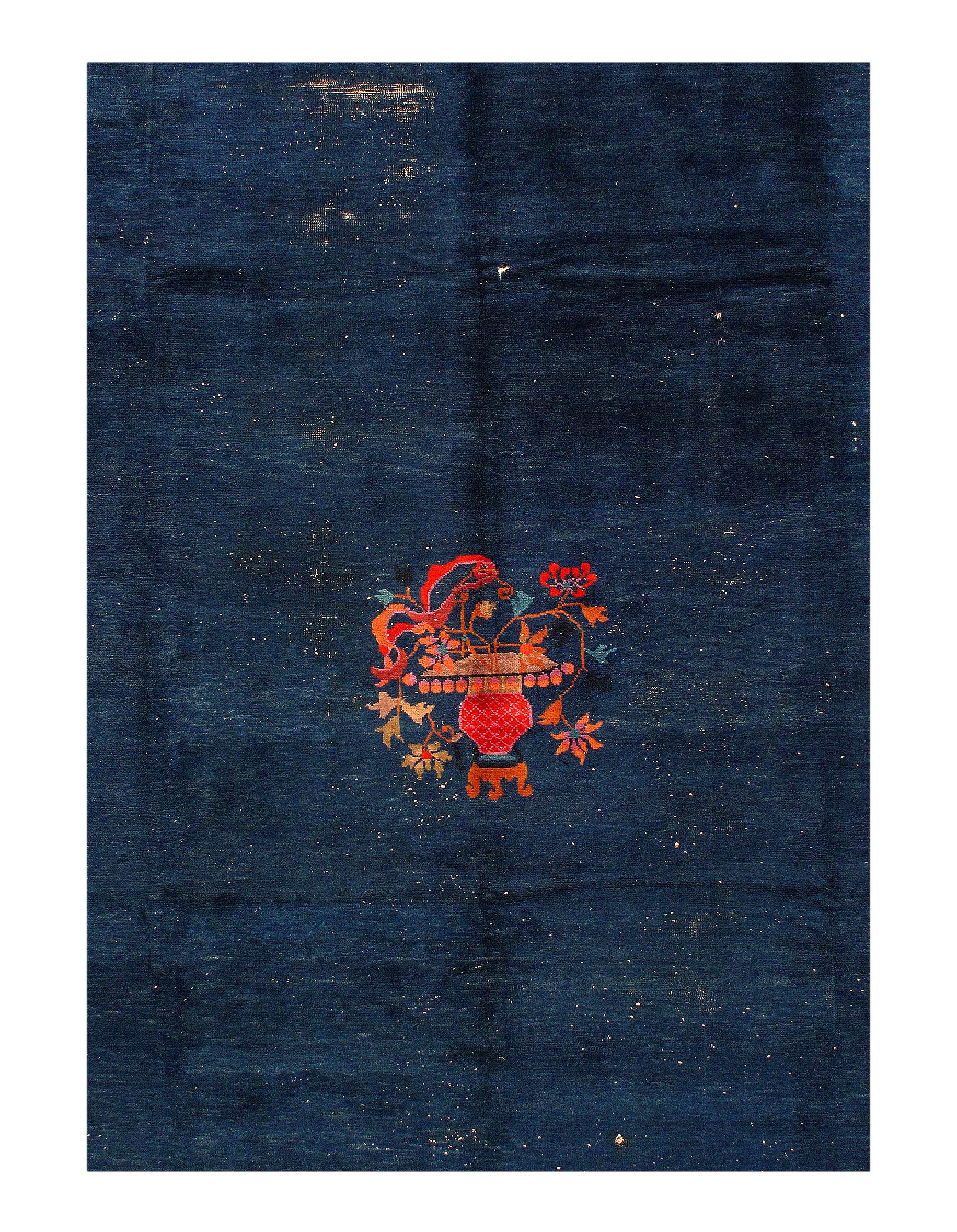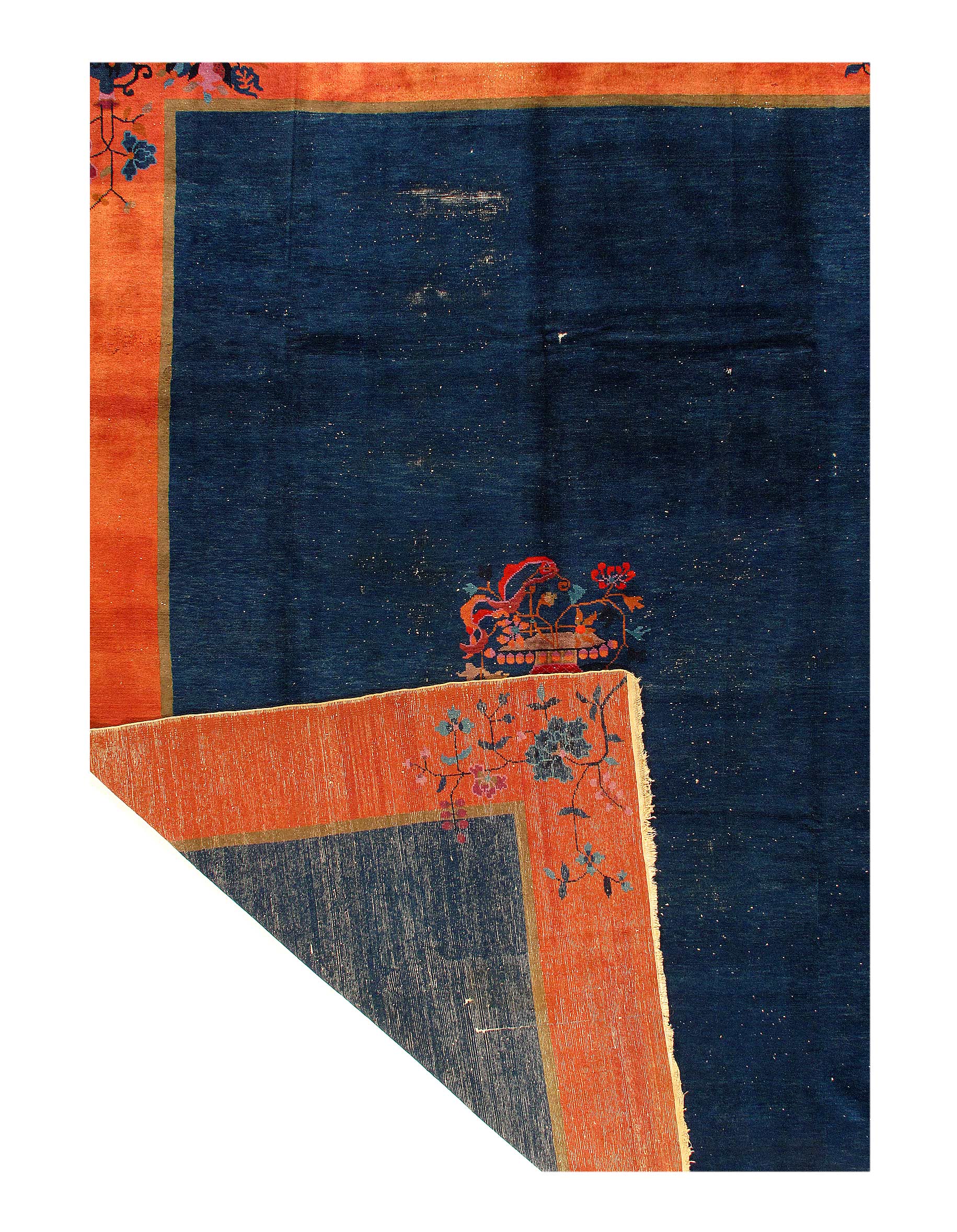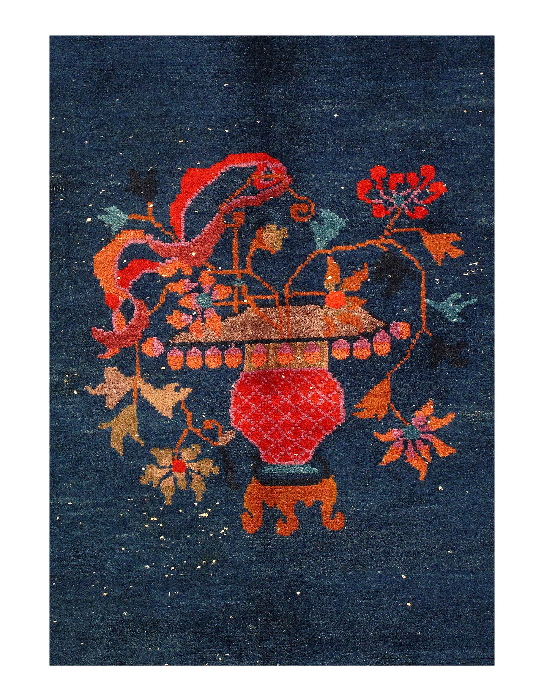 Antique Chinese Deco Rug, Origin: China, Circa: Early 20th Century β Here is an exciting and appealing antique Oriental carpet β an antique Art Deco rug that was designed and woven in China during the early years of the twentieth century. Heavily informed by the aesthetic inclinations of the Art Deco period, this unique carpet is a compelling and thought-provoking example. A scalloped Purple encloses a Light Green sand field on this exquisitely subtle and restrained antique Chinese Art Deco. At first the field appears empty or open, but it is actually covered by a tone-on-tone design of scrolls and cloud-bands emanating inward from the outer edges. In their sinuous rhythms they echo the scalloped forms of the border and continue its visual effects across the carpet in a more subdued manner. This carpet testifies to the masterful design sensibilities of Chinese weavers as they made the transition into the modern world. The Art Deco movement had an outside influence on the world of art and design, and some of the most important qualities and characteristics of that movement may be found in this fine rug.