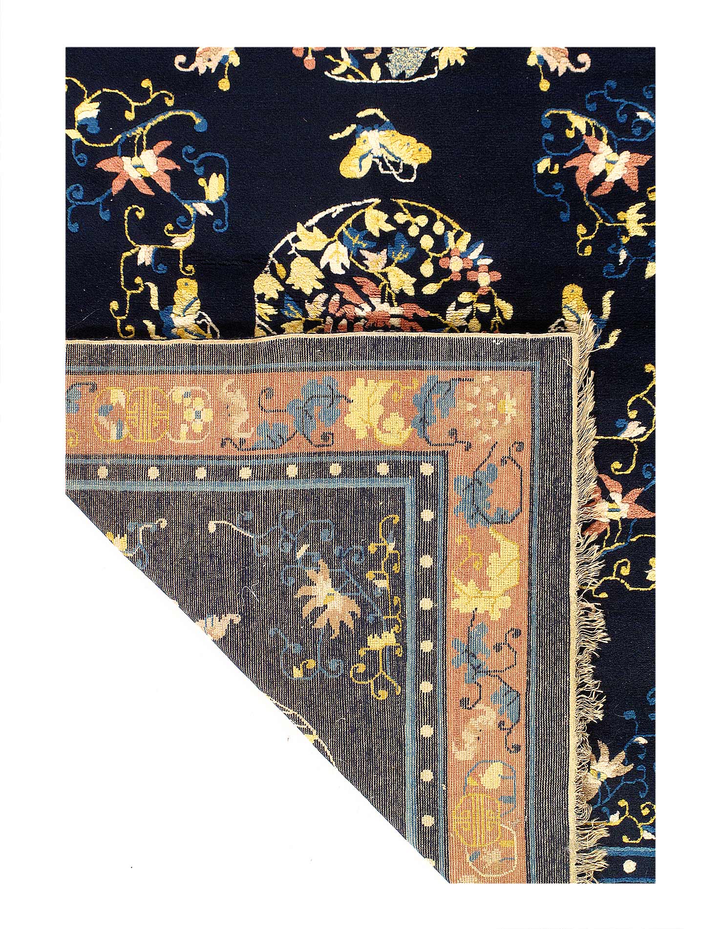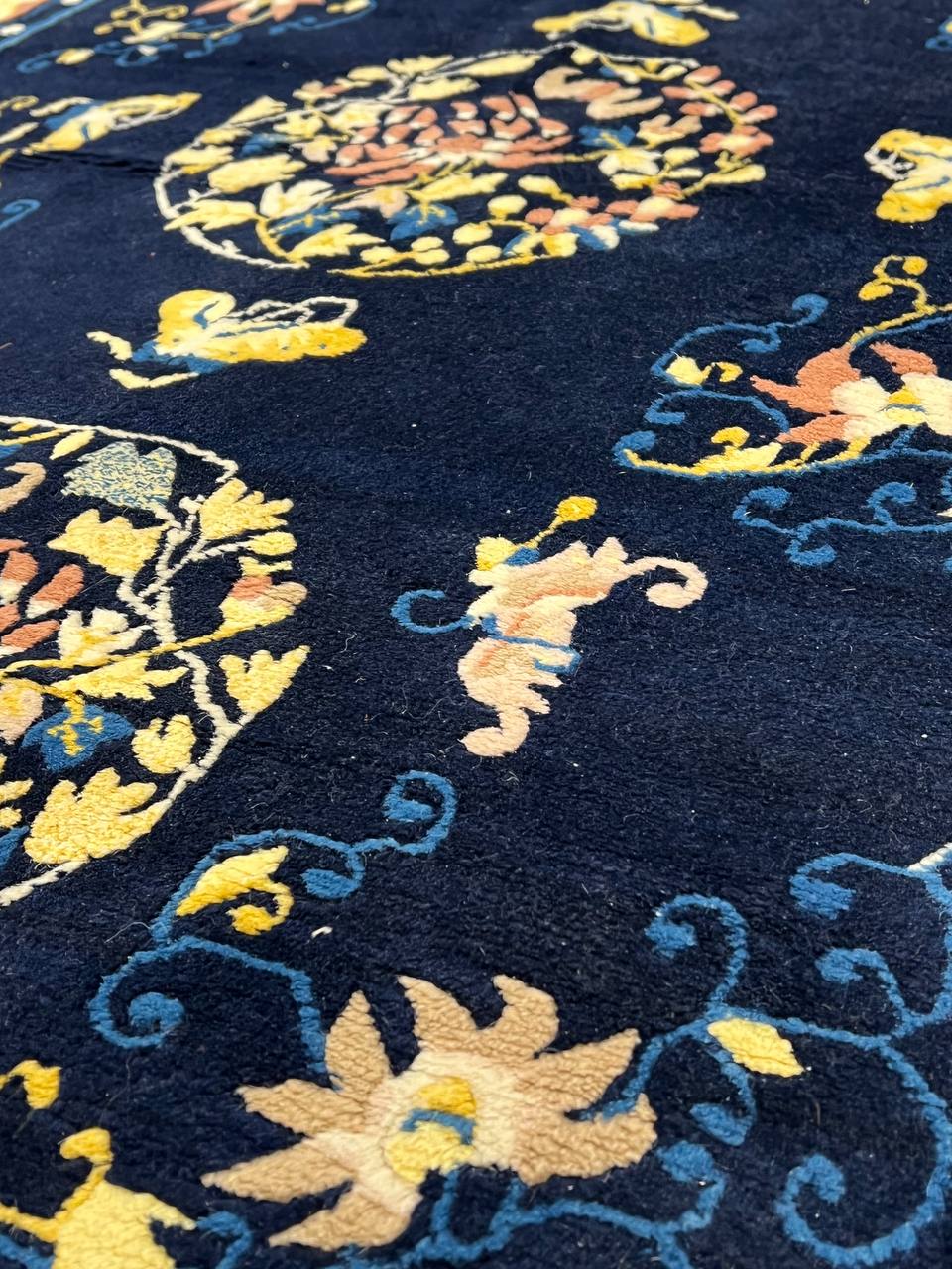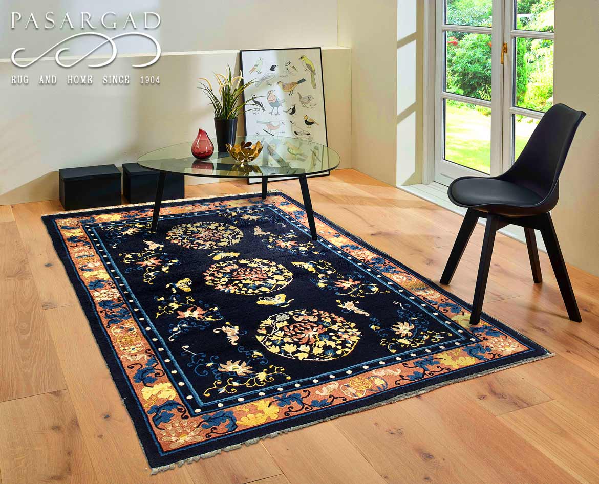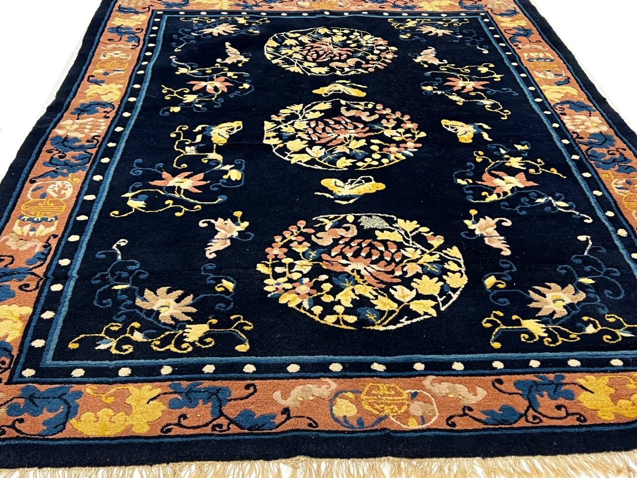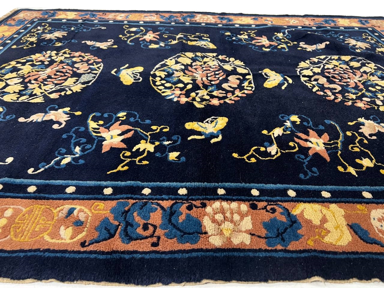 Very fine lamb's wool pile and cotton foundation. Hand-woven Peking rug. This rug has a dense, soft pile, and excellent quality, to ensure that you will enjoy the look and feel of your rug for years to come.