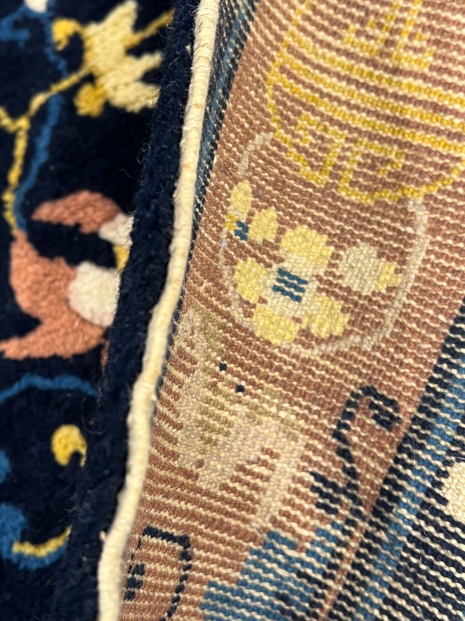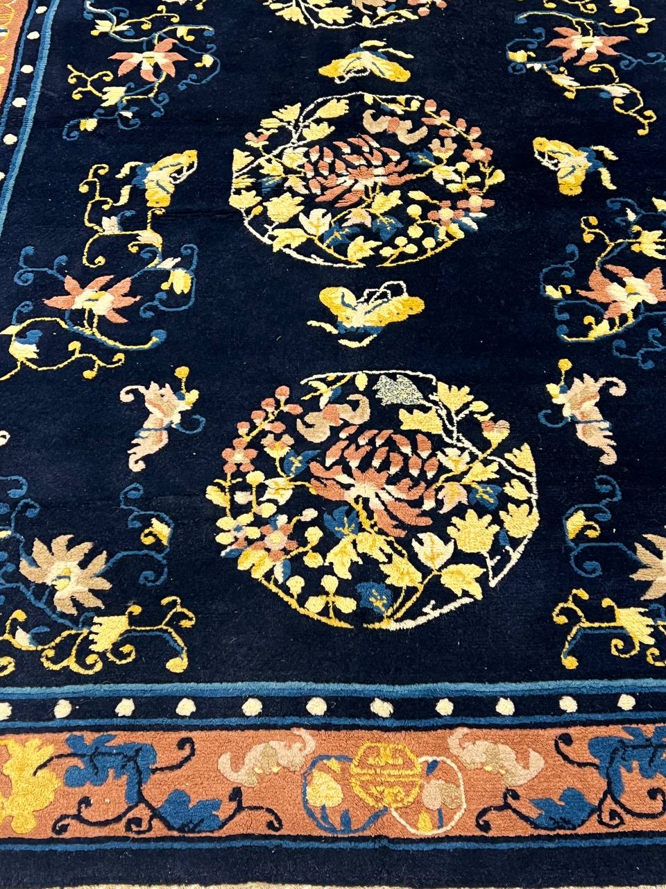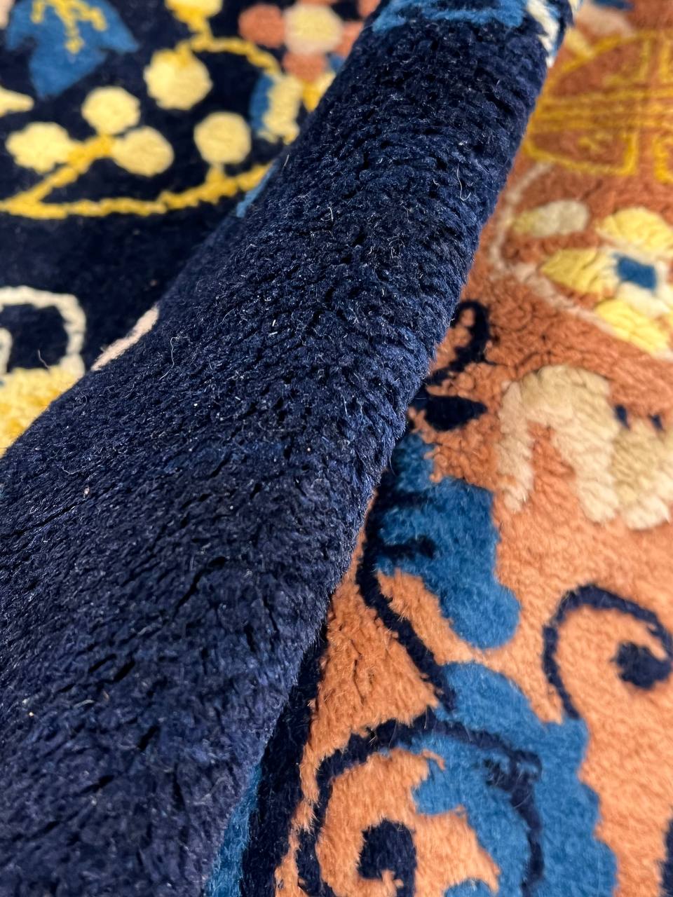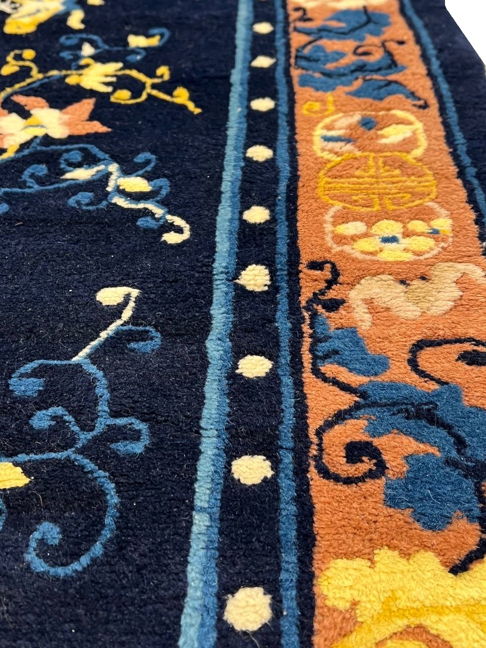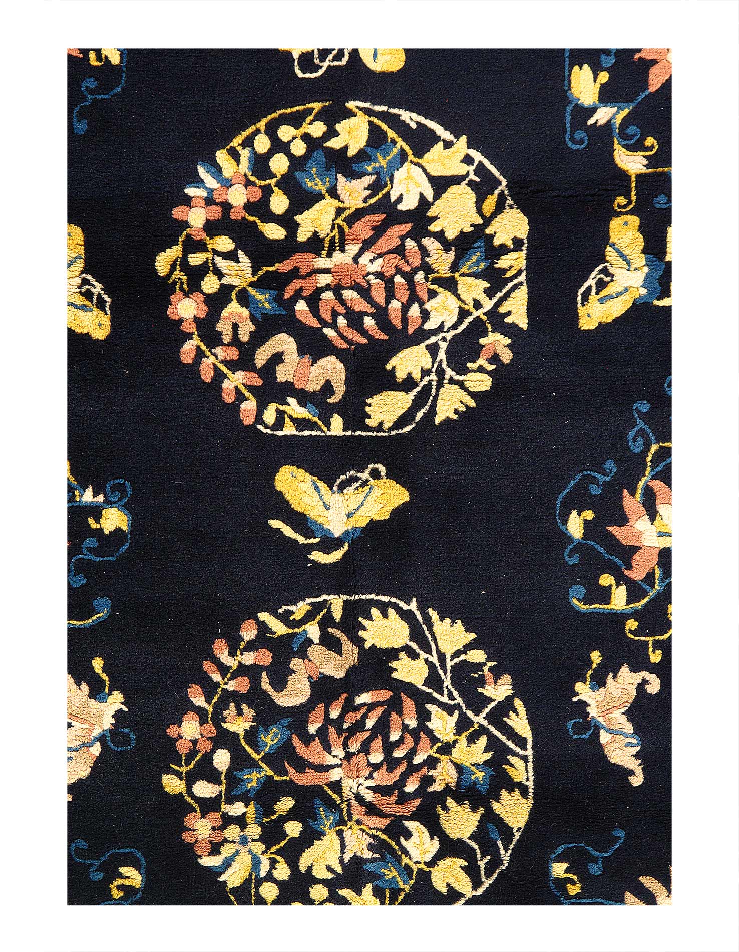 Very fine lamb's wool pile and cotton foundation. Hand-woven Peking rug. This rug has a dense, soft pile, and excellent quality, to ensure that you will enjoy the look and feel of your rug for years to come.