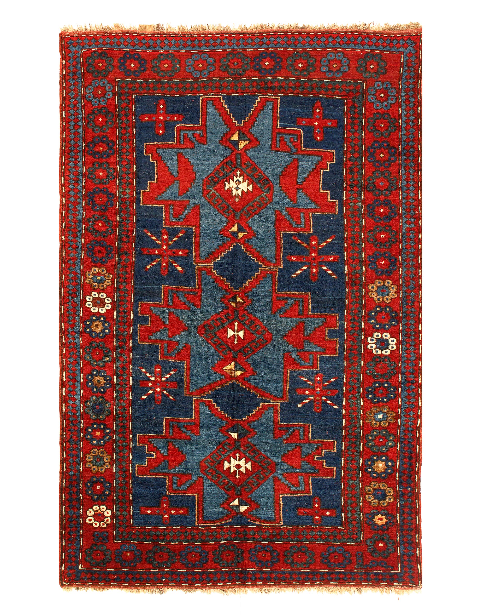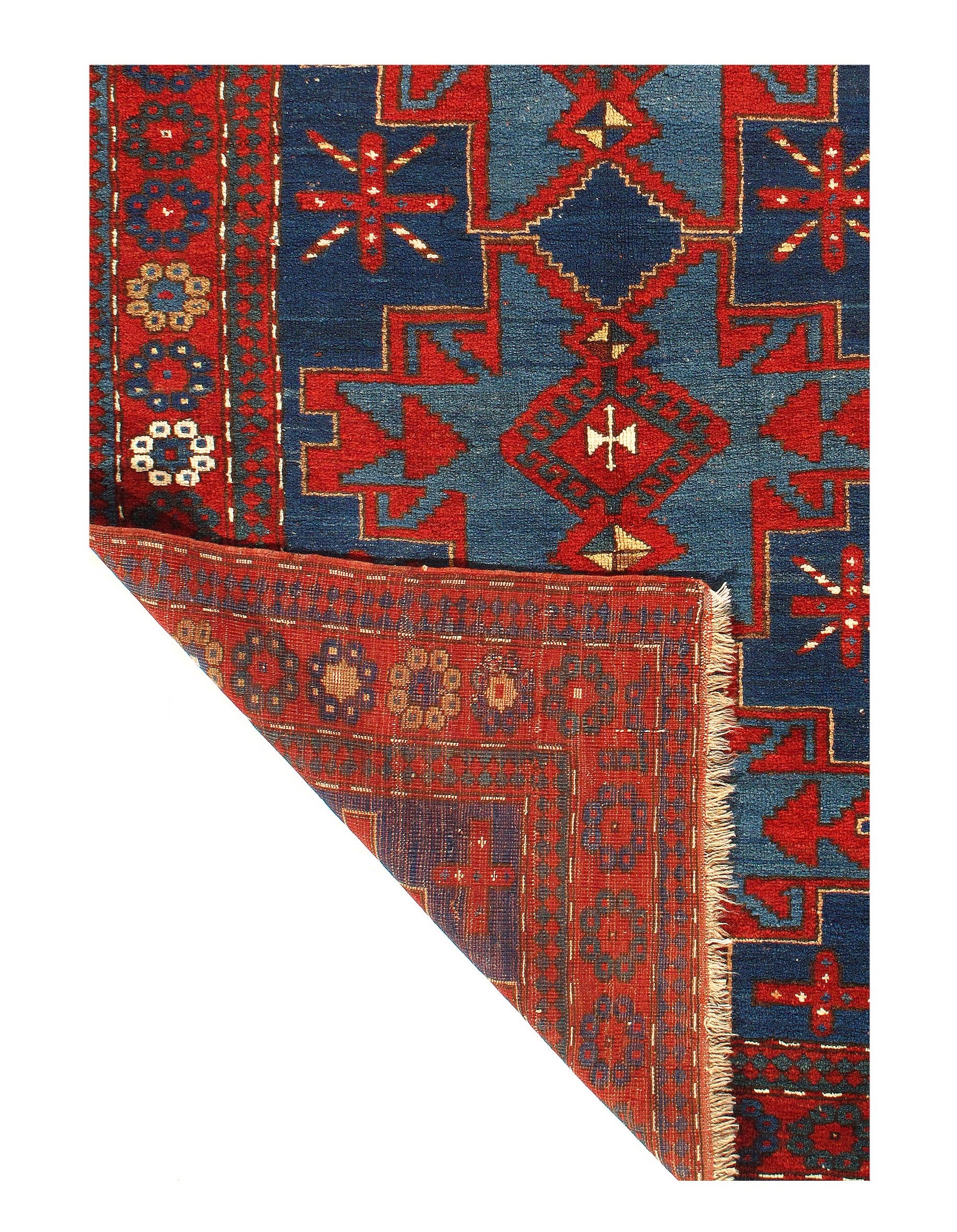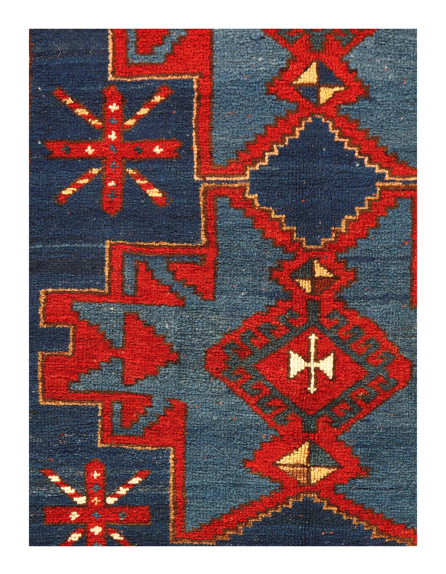 Kazak is a modern shape of old Caucasian rugs which strictly adheres to traditional design elements of the Caucasus. It has elements such as the stepped hooked polygons, geometrical medallions and rosettes, presented in more stylized manner and with a new dimension. Natural dyes produce soft luminous shades and abrashes causing a beautiful sheen. Handspun wool yarn is normally used in the variety of vibrant warm colors.