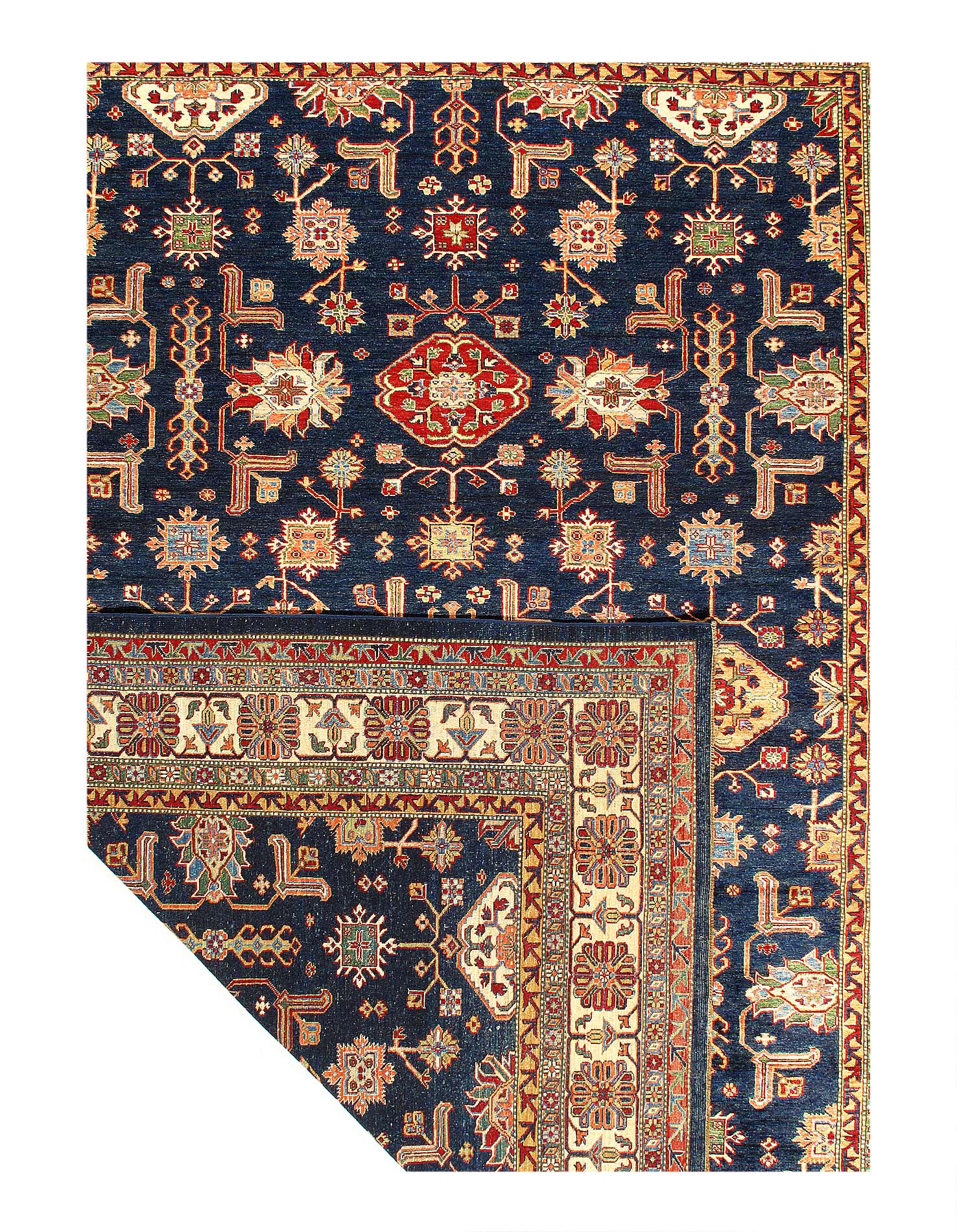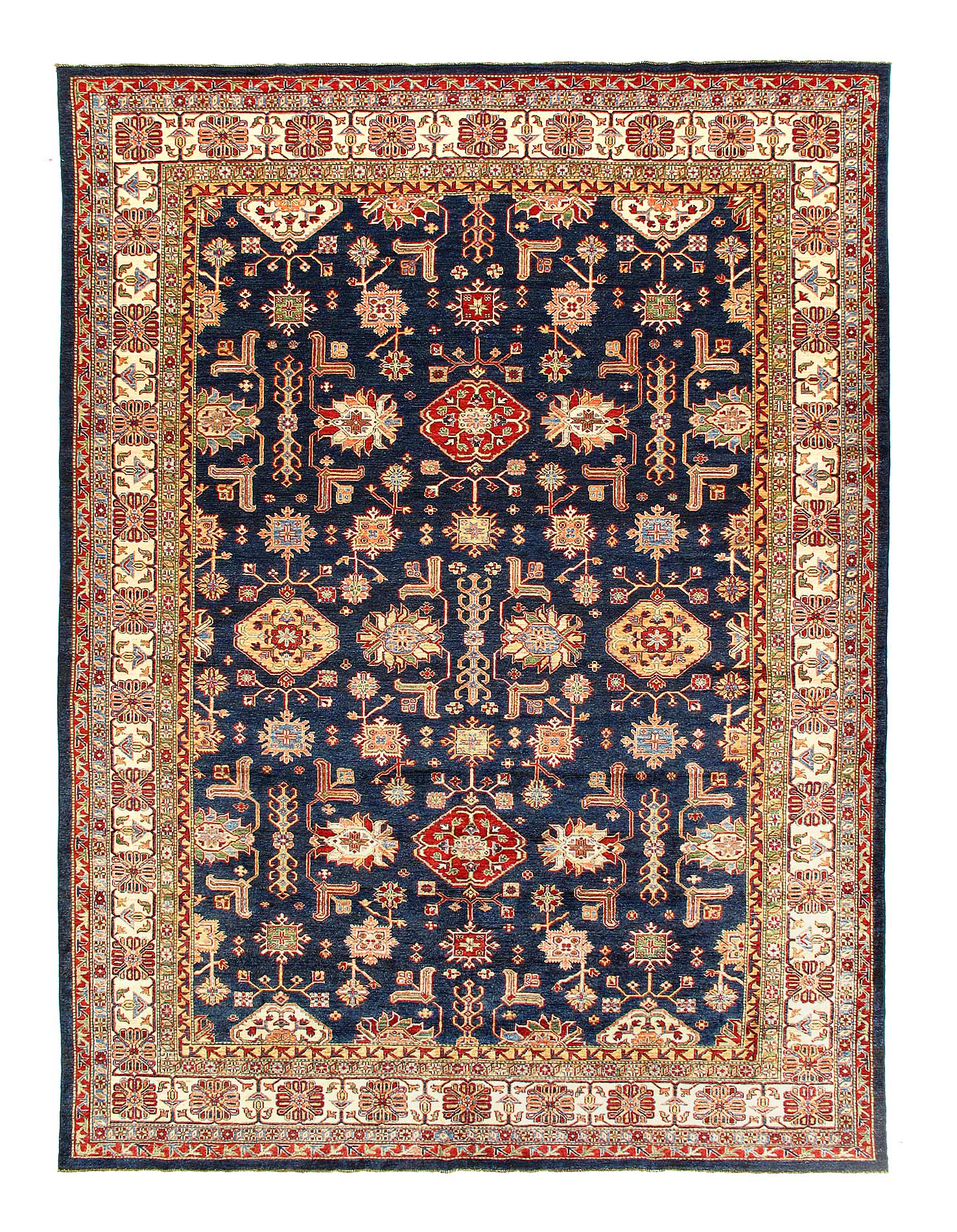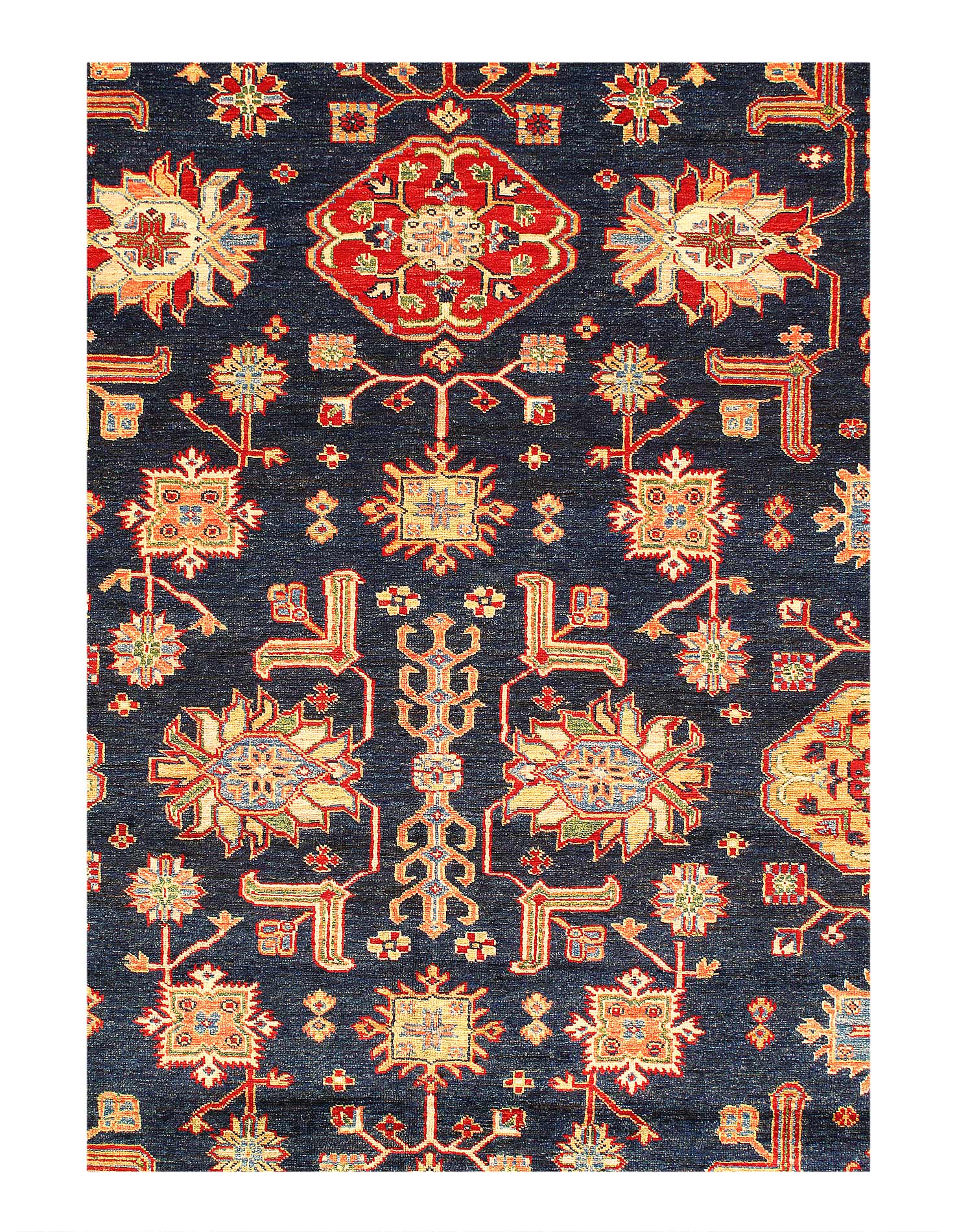 Kazak is a modern shape of old Caucasian rugs which strictly adheres to traditional design elements of the Caucasus. It has elements such as the stepped hooked polygons, geometrical medallions and rosettes, presented in more stylized manner and with a new dimension. Natural dyes produce soft luminous shades and abrashes causing a beautiful sheen. Handspun wool yarn is normally used in the variety of vibrant warm colors. Kazaks rugs in our collection are all fine quality pieces from Pakistan made with Ghazni handspun wool and natural dyes.