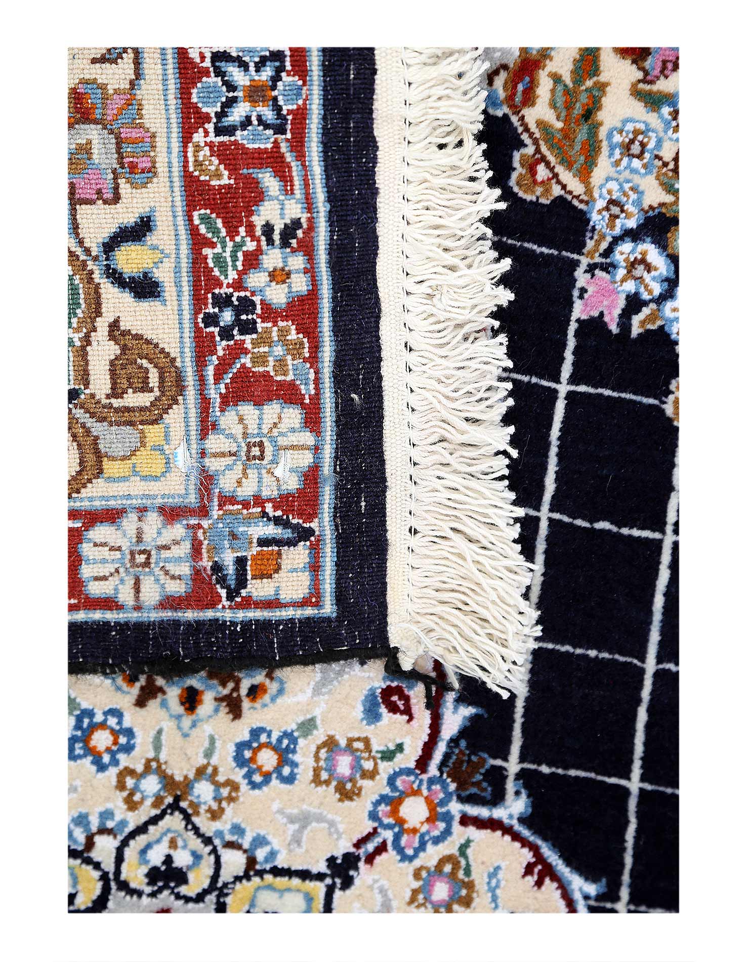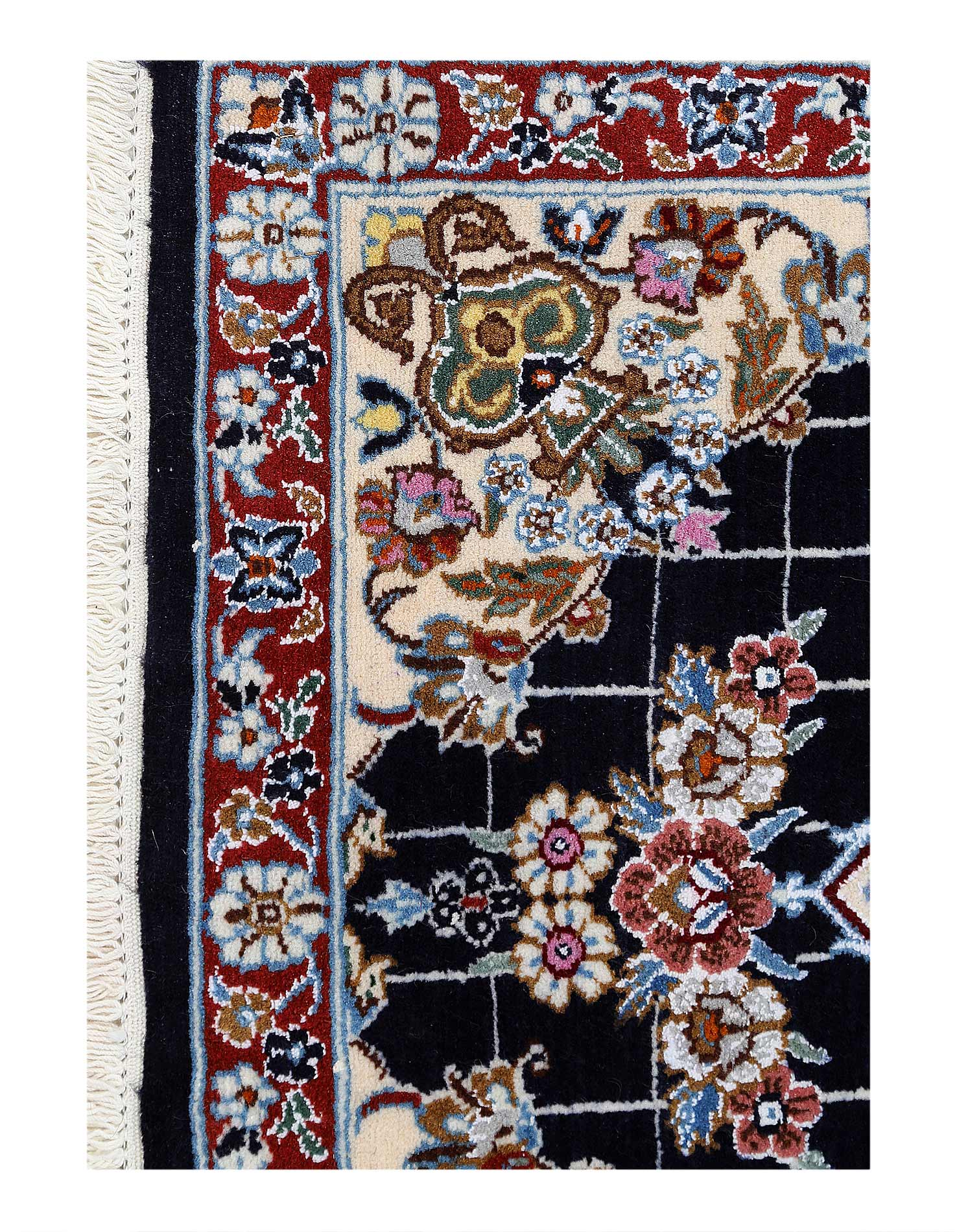 A hand-knotted, Nain rug that features gorgeous wool and silk and an ornate, tan and dark blue-ish/black field. This rug is from Persia.
