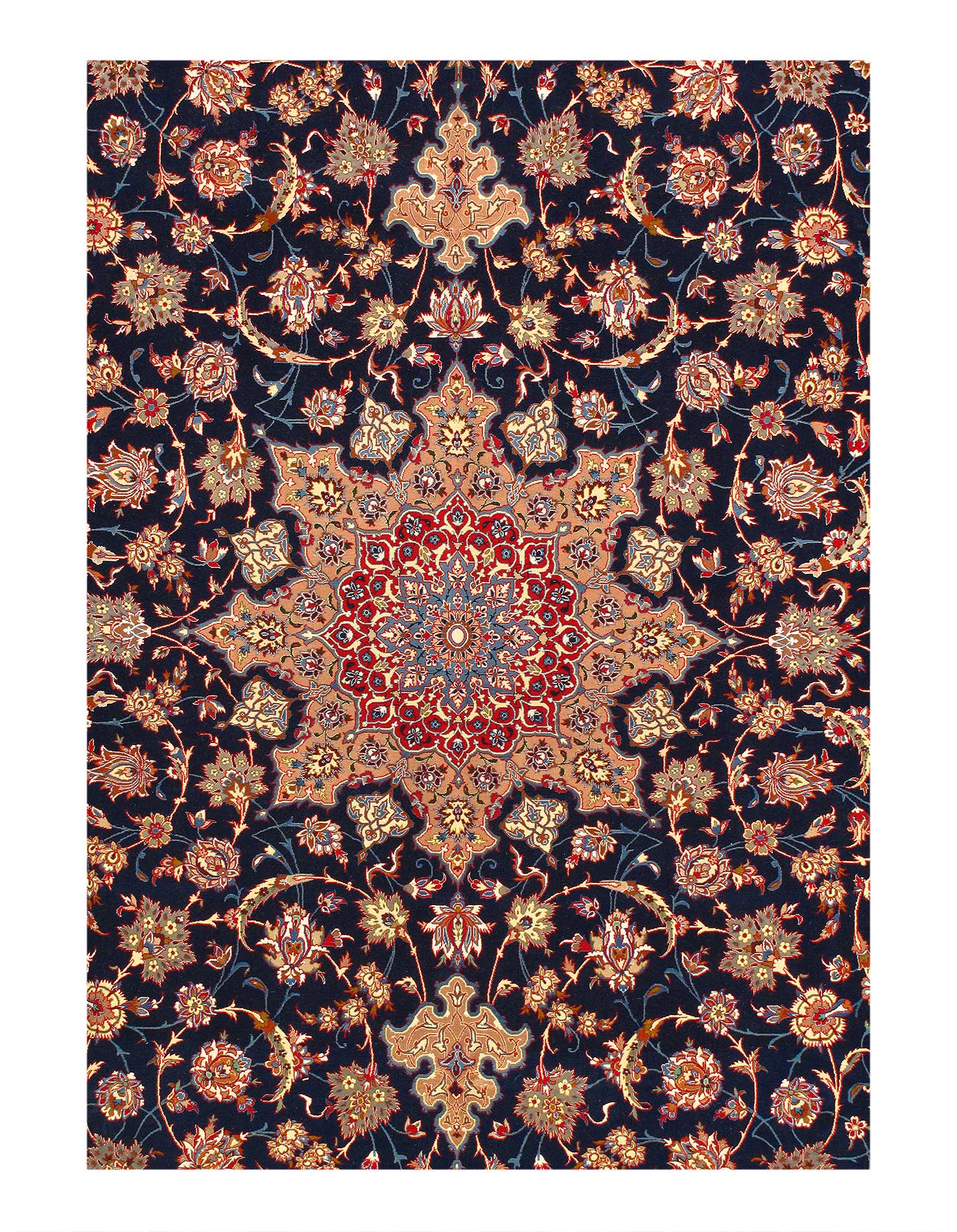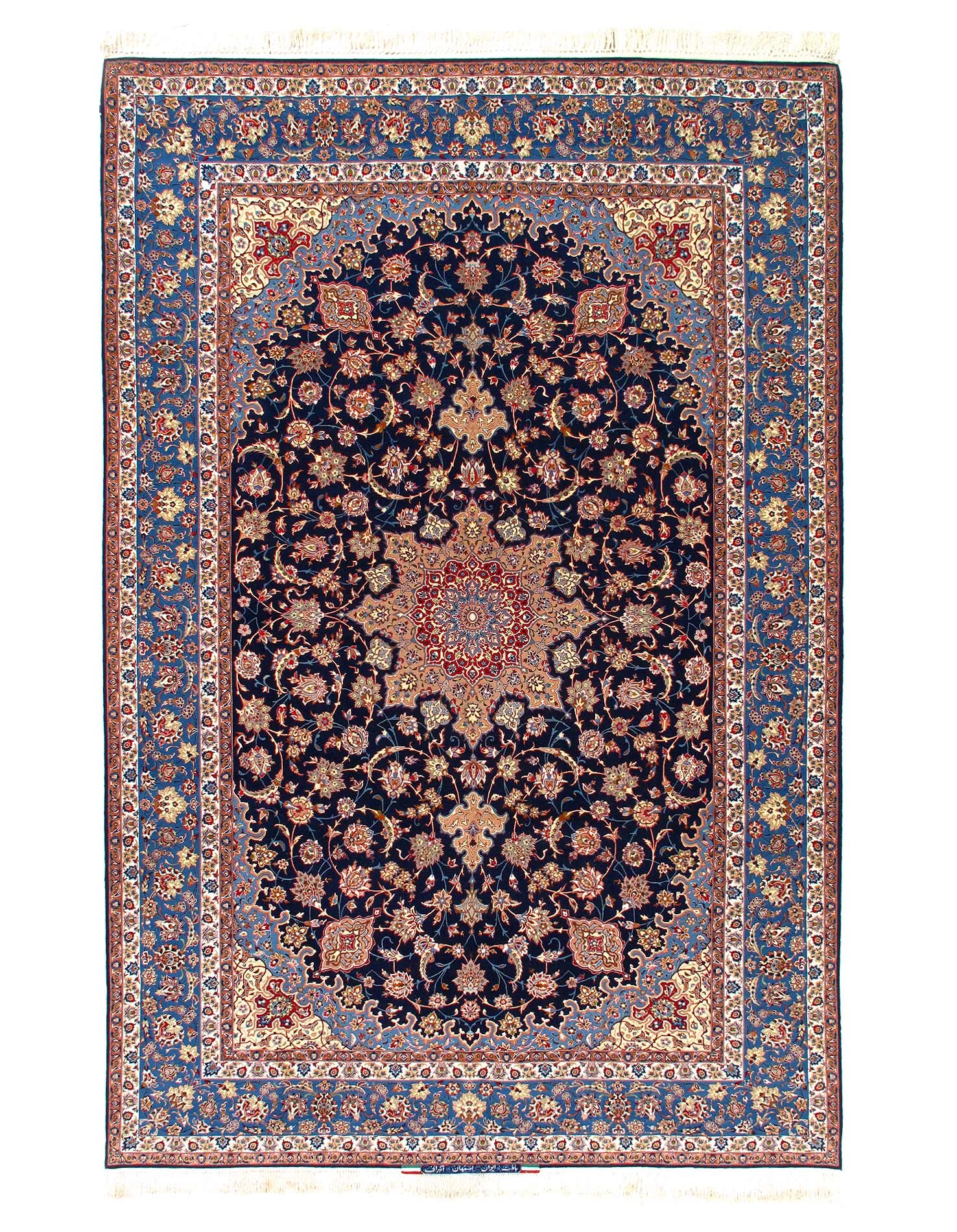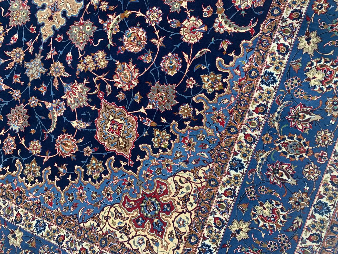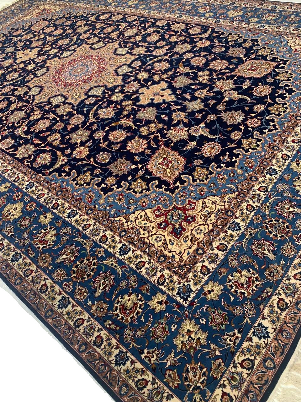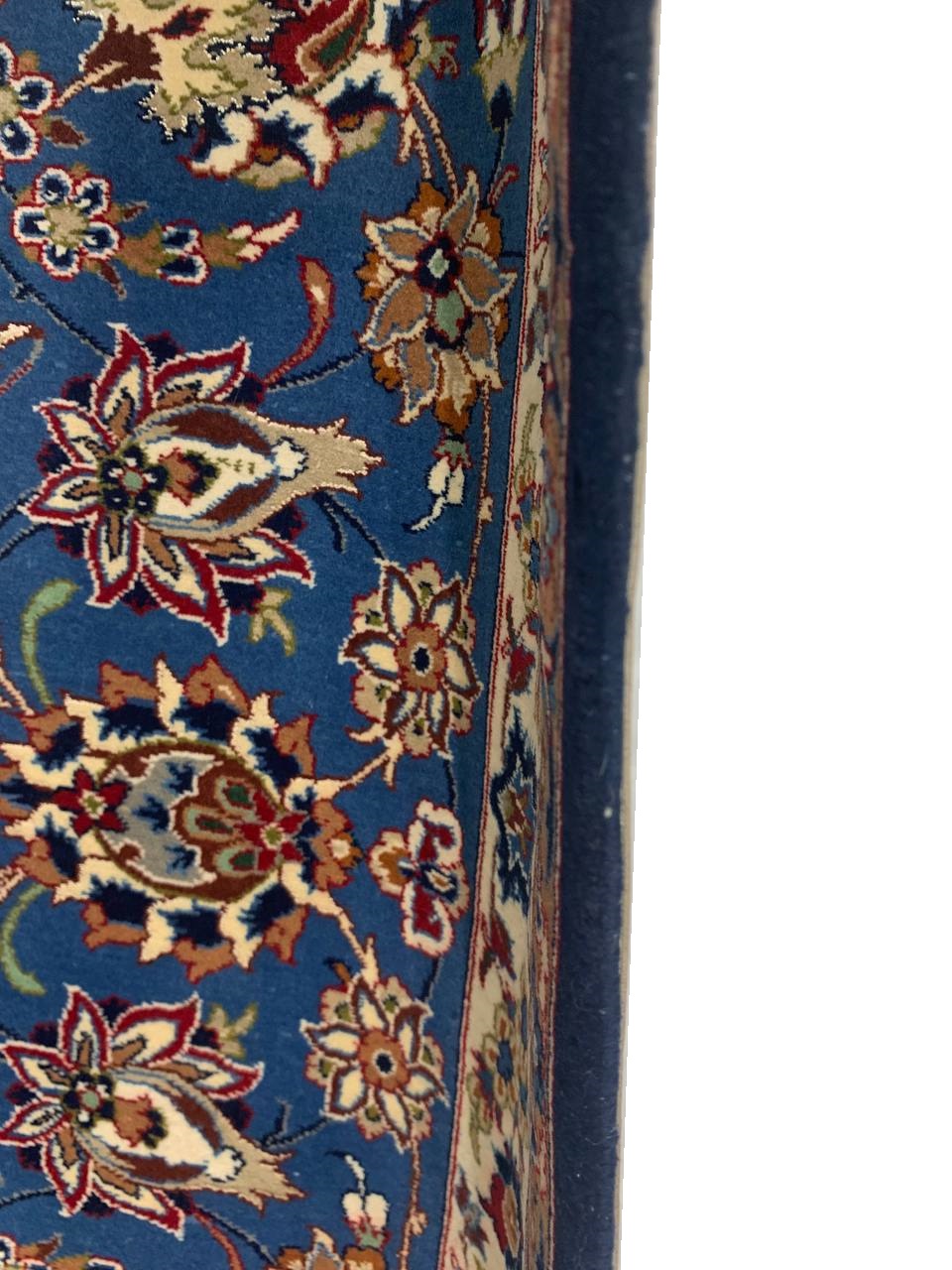 The Isfahan rugs are made with exceptionally good quality of wool & silk. They use traditional motifs inspired by architectural tiles that once decorated the historical buildings from which these rugs originated in. When it comes to high class designs the composition, patterns, and materials of Isfahan meets those expectations. The motifs usually consist of medallions with palmetts and also figural motifs. Isfahan rugs have an extremely high knot density and are woven with silk and golden threads, which give them their luxurious look.signed by Akbarani