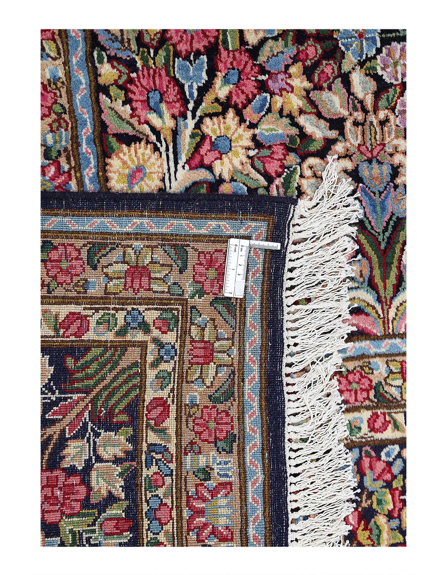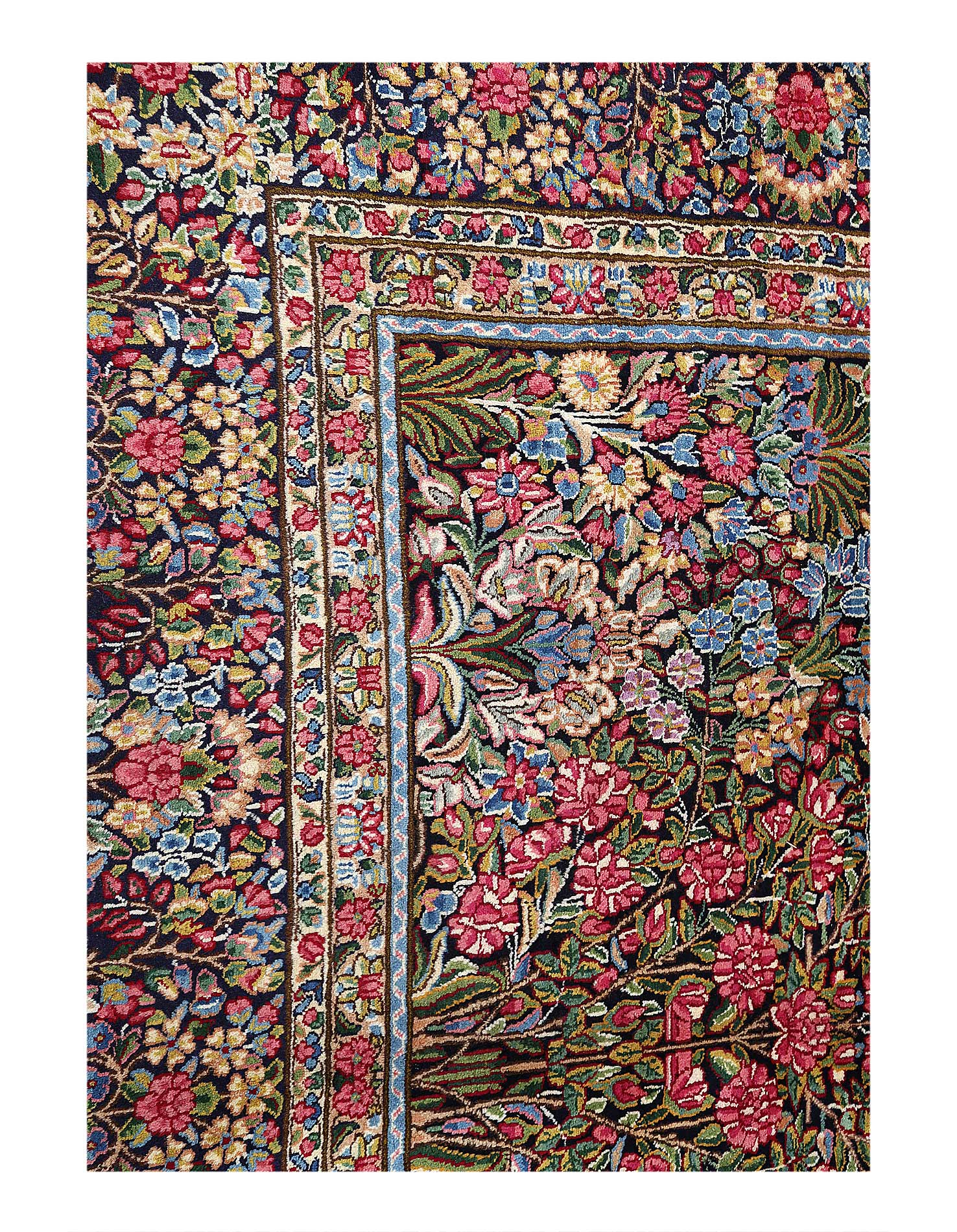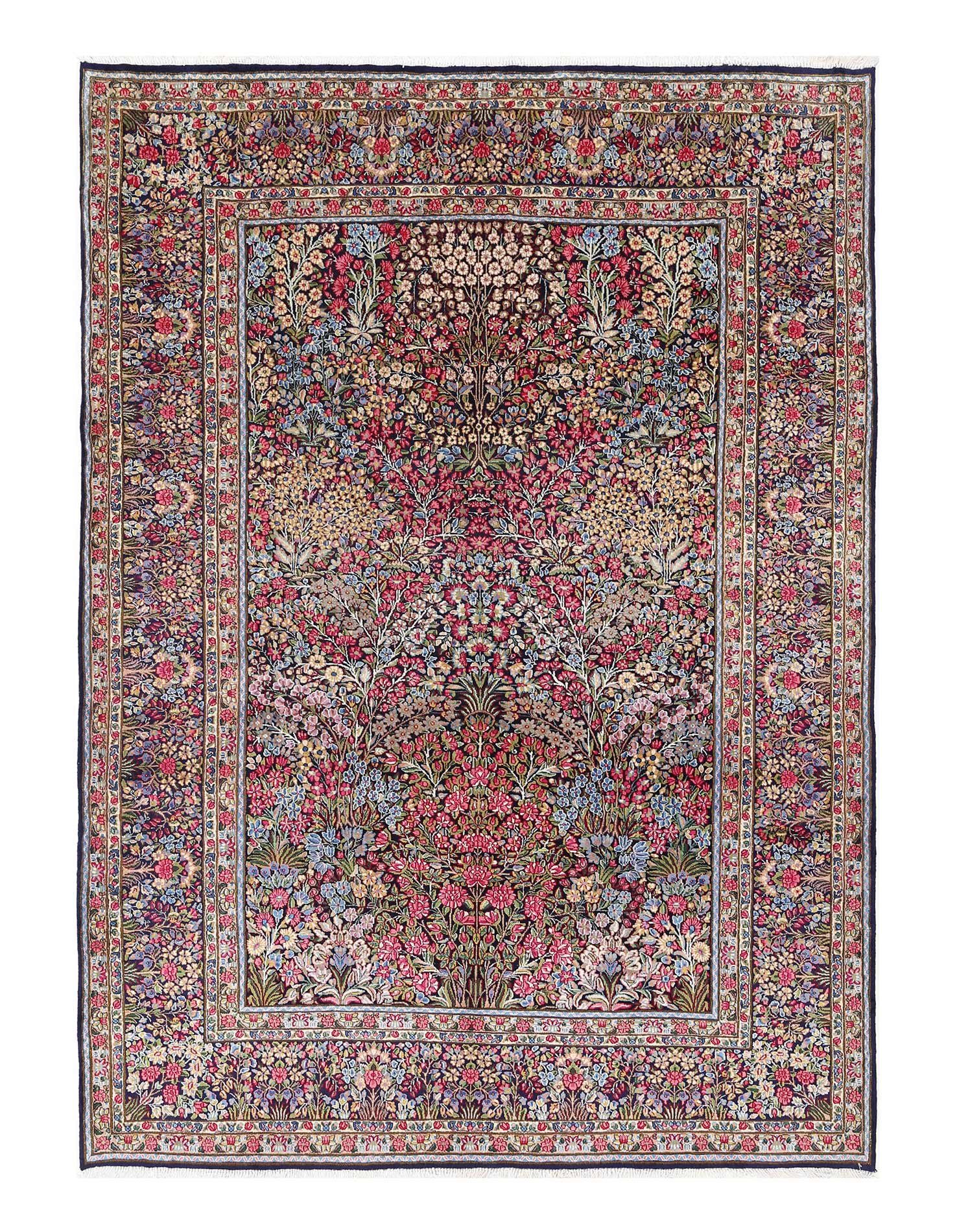 The carpet has a floral theme and is packed so densely with flowers that little of the background shows. The colors and designs have a delicate and earthy feel. The millefleur design of this rug is one of the most recognizable in Lavar Kerman rugs. Kerman was a traditional carpet-weaving city. In the early 19th century, the city was burned to the ground during a civil war. Many of the weavers relocated to the village of Lavar. These rugs are known as Lavar Kerman carpets. Rugs of this type were only produced until the 1920s when Kerman weavers underwent a change, and the patterns became simpler, making this rug a rare find.