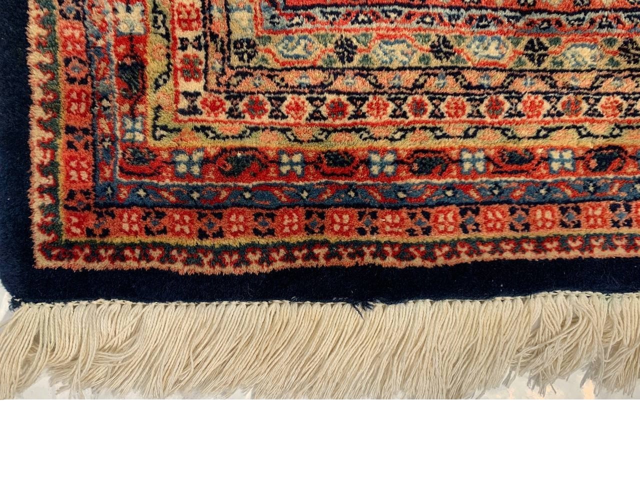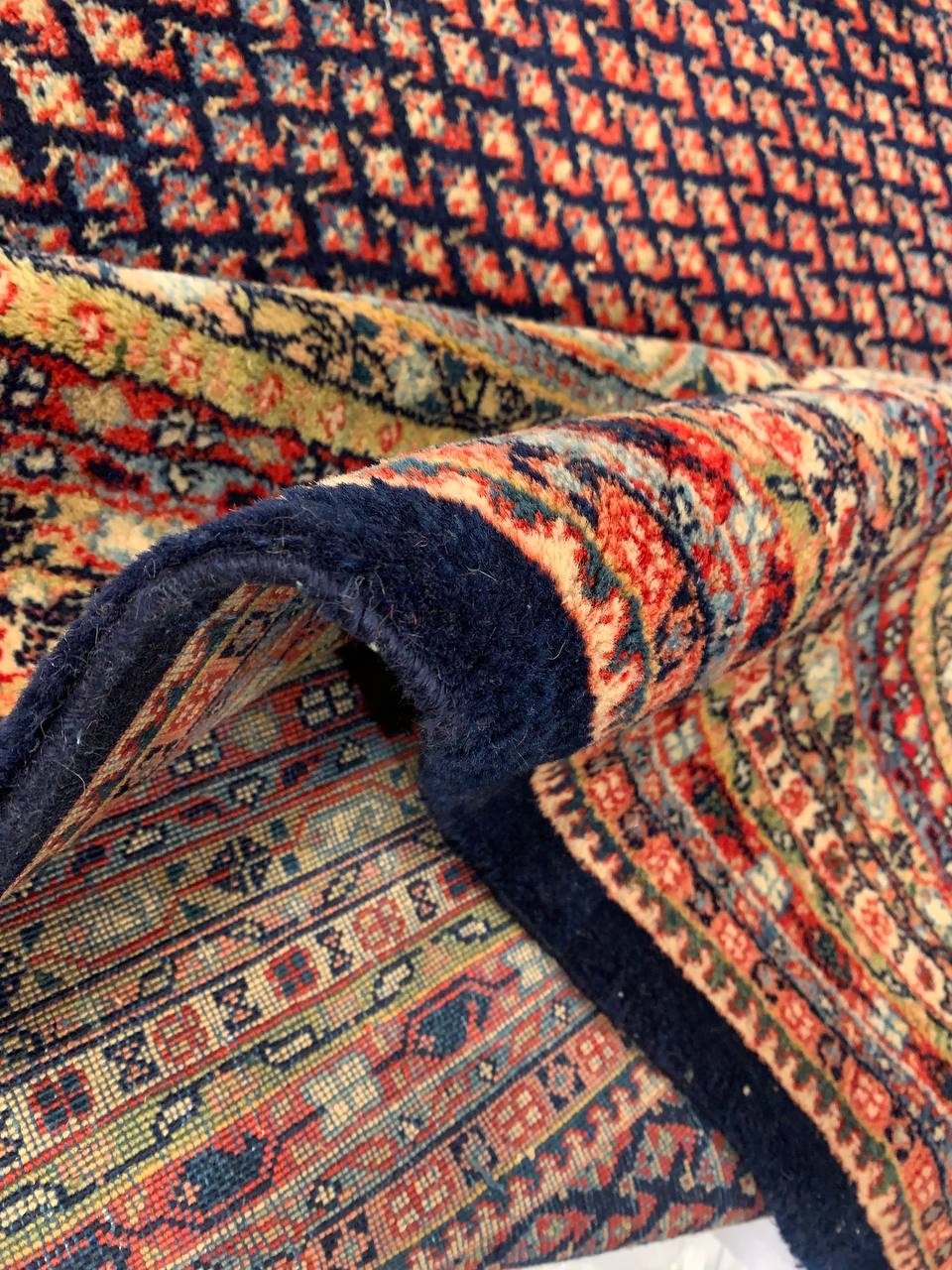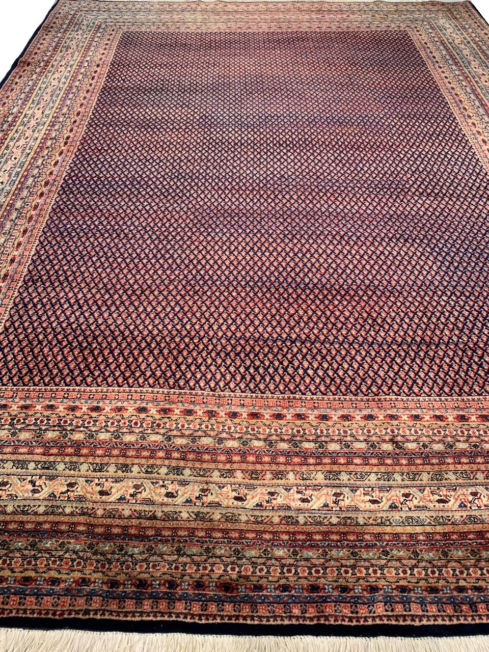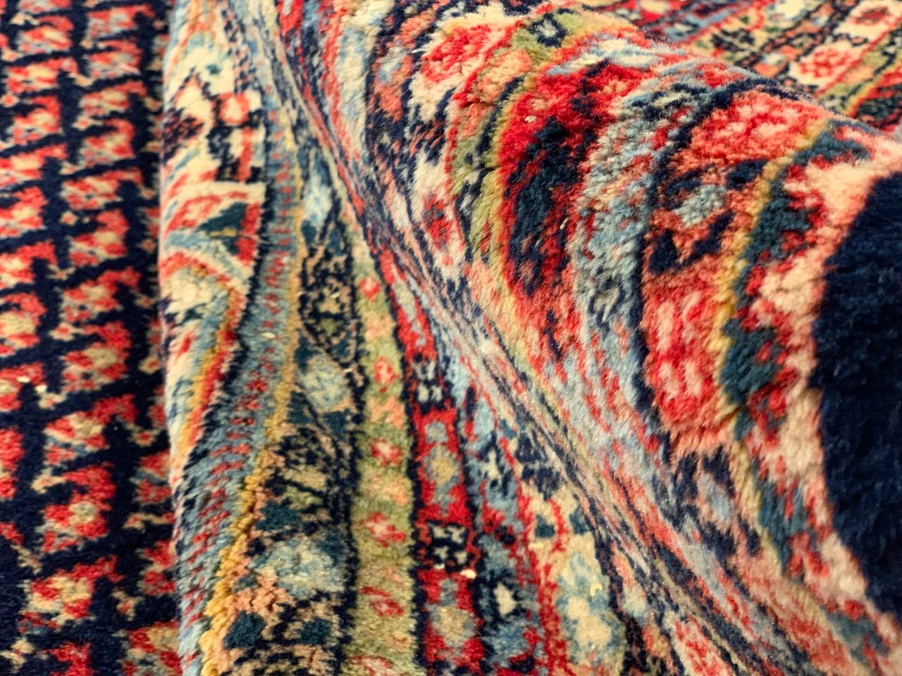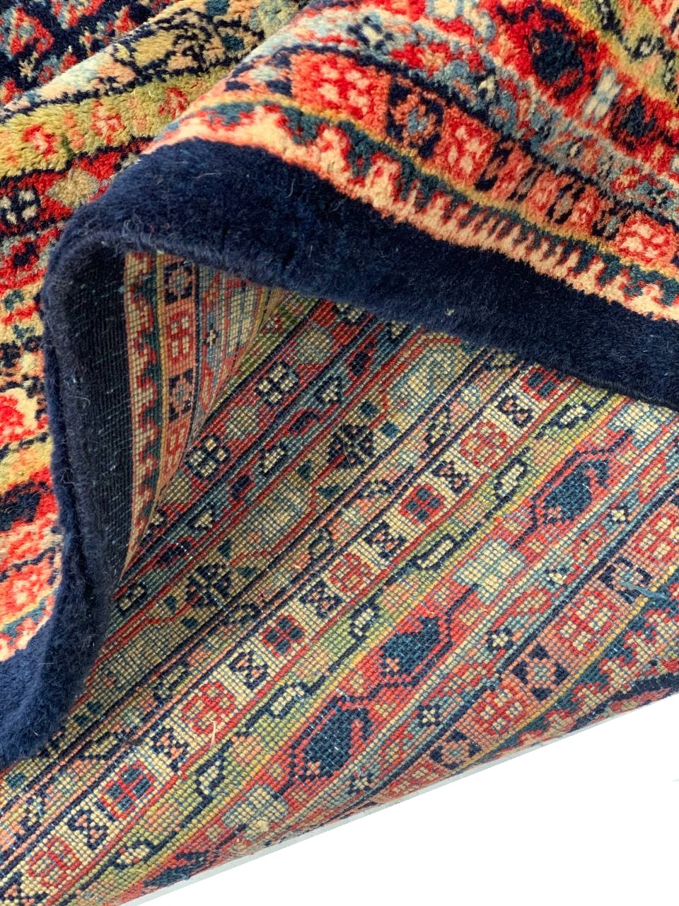 This elegant and tribal Persian Serab rug is a masterpiece of sophisticated splendor. Warm neutral tones of Navy blue, , beige and rose
